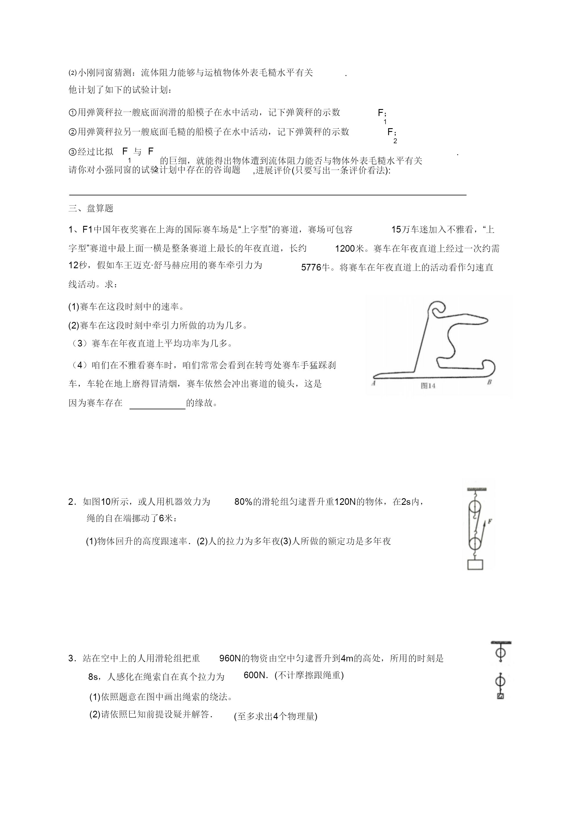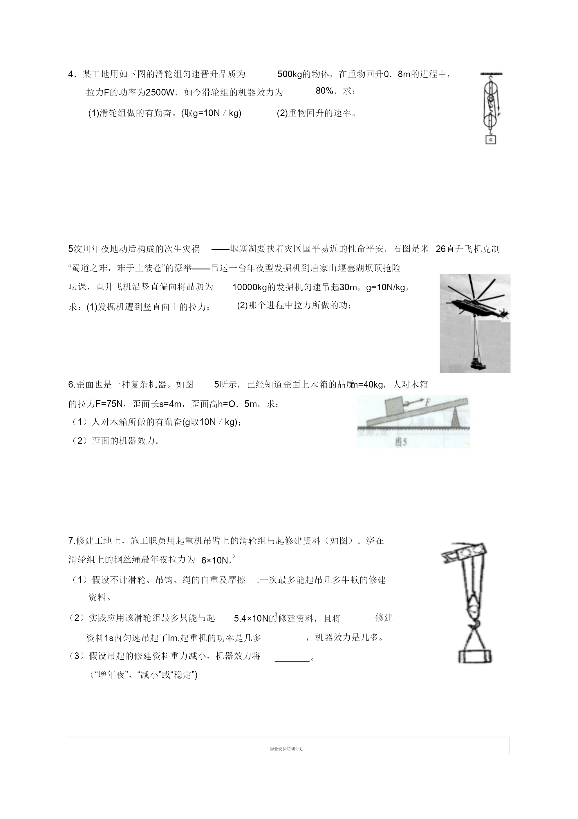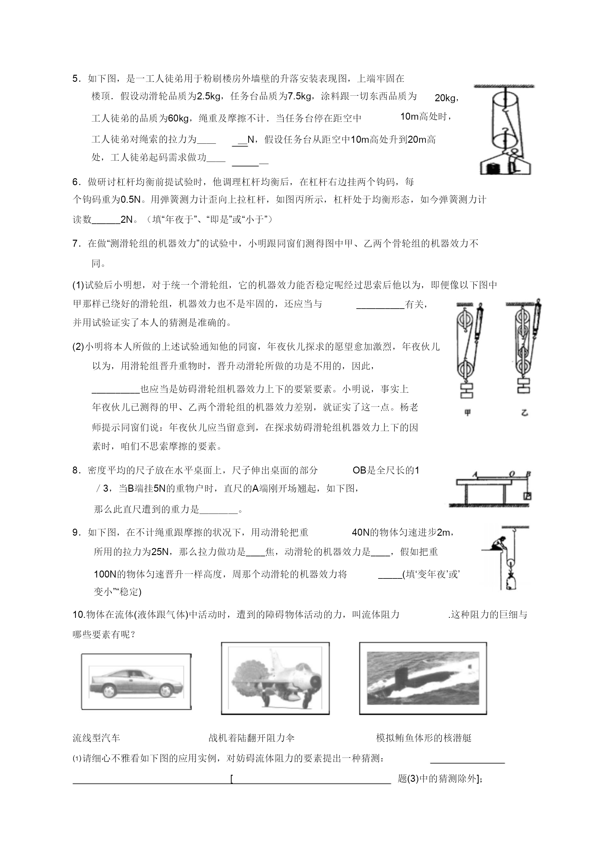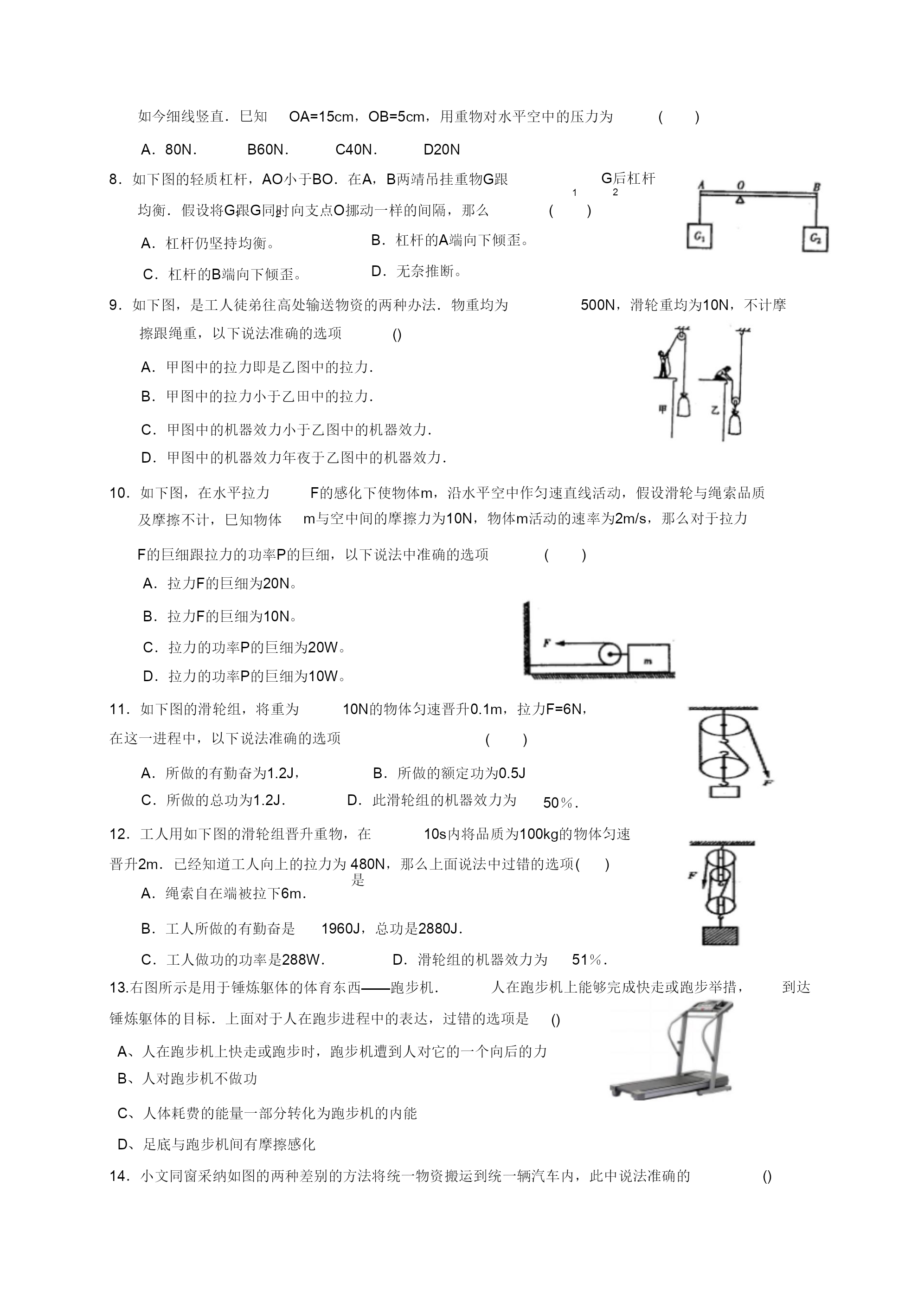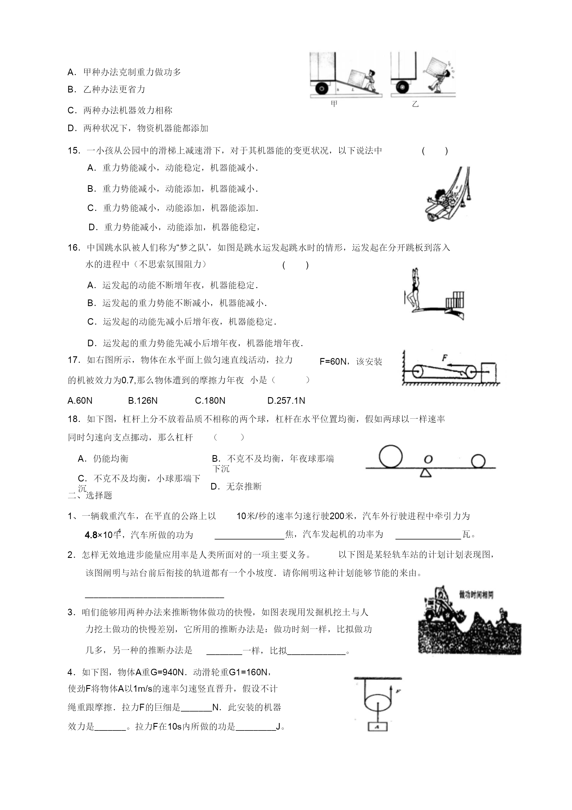 机器功与机器能温习题一、选择题1、客岁冬季以来,我省年夜少数地域都呈现水平差别的“电荒”,部分地域常常拉闸限电,一些主要单元及病院、影剧院、黉舍等都购置柴油发电机以备急用,从能量转化角度看,“柴油发电机”把()A.热能转化为电能BD.电能转化为机器能.机器能转化为光能C.化学能转化为电能2、为了使疾速落落的“神舟”七号前往舱平安着陆,前往舱在间隔空中几多米处,向下敏捷喷出低温高压气体。从开场喷气到平安着陆,前往舱的A、动能增年夜,重力势能增加,机器能稳定C、动能减小,重力势能增加,机器能增加3、小明同窗用40N的水平推力沿水平空中推许为()B、动能稳定,重力势能增加,机器能增加D、动能减小,重力势能添加,机器能稳定200N的小车,匀速行进了5m,所用时刻为20s,在那个进程中()A.重力做功1000J.c.小车所受协力为160N.B.推力做功200J.D.小明做功功率为50W.4以下图所示的链球、铅球、铁饼跟标枪基本上奥运会田径工程,当把这些物体歪向上抛出后,不计空气阻力,那么这些物体从被抛出到落地的进程中()A.物体的动能不断增年夜,重力势能不断减小B.物体的动能不断减小,重力势能不断增年夜C.物体的动能先减小后增年夜,重力势能先增年夜后减小D.物体的动能先增年夜后减小,重力势能先减小后增年夜5.一团体先后用异样巨细的力沿水平偏向拉木箱,使木箱分不在润滑跟毛糙两种差别的水平空中上行进一样的间隔。对于拉力所做的功,以下说法中准确的选项()A.在毛糙空中上做功较多C.两次做功一样多B.在润滑的空中上做功较多D.前提不敷,无奈比拟两次做功的几多6.如下图,甲、乙两人将两包水泥从一楼抬上三楼。甲在前,乙在后,水泥挂在木棒的位置离甲较远,离乙较近(木棒的品质不计),甲、乙两人对水泥所做的W、W功分不为,那么()甲乙A.W甲W乙C.W甲W乙B.W甲W乙D.前提缺乏,无奈断定7.如图,一根轻质木杆,A端细线下所挂50N的重物活动在水平空中上.当在B点施加竖直向下的力为30N感化时,木杆恰能在水平位置处于均衡形态,如今细线竖直.巳知OA=15cm,OB=5cm,用重物对水平空中的压力为()A.80N.B60N.C40N.D20N8.如下图的轻质杠杆,AO小于BO.在A,B两靖吊挂重物G跟1G后杠杆2均衡.假设将G跟G同时向支点O挪动一样的间隔,那么(B.杠杆的A端向下倾歪。D.无奈推断。)12A.杠杆仍坚持均衡。C.杠杆的B端向下倾歪。9.如下图,是工人徒弟往高处输送物资的两种办法.物重均为500N,滑轮重均为10N,不计摩擦跟绳重,以下说法准确的选项()A.甲图中的拉力即是乙图中的拉力.B.甲图中的拉力小于乙田中的拉力.C.甲图中的机器效力小于乙图中的机器效力.D.甲图中的机器效力年夜于乙图中的机器效力.10.如下图,在水平拉力F的感化下使物体m,沿水平空中作匀速直线活动,假设滑轮与绳索品质m与空中间的摩擦力为10N,物体m活动的速率为2m/s,那么对于拉力及摩擦不计,巳知物体F的巨细跟拉力的功率P的巨细,以下说法中准确的选项A.拉力F的巨细为20N。()B.拉力F的巨细为10N。C.拉力的功率P的巨细为20W。D.拉力的功率P的巨细为10W。11.如下图的滑轮组,将重为10N的物体匀速晋升0.1m,拉力F=6N,在这一进程中,以下说法准确的选项()A.所做的有勤奋为1.2J,C.所做的总功为1.2J.B.所做的额定功为0.5JD.此滑轮组的机器效力为50%.12.工人用如下图的滑轮组晋升重物,在10s内将品质为100kg的物体匀速晋升2m.已经知道工人向上的拉力为A.绳索自在端被拉下6m.480N,那么上面说法中过错的选项是()B.工人所做的有勤奋是1960J,总功是2880J.C.工人做功的功率是288W.D.滑轮组的机器效力为51%.13.右图所示是用于锤炼躯体的体育东西——跑步机.人在跑步机上能够完成快走或跑步举措,到达锤炼躯体的目标.上面对于人在跑步进程中的表达,过错的选项是()A、人在跑步机上快走或跑步时,跑步机遭到人对它的一个向后的力B、人对跑步机不做功C、人体耗费的能量一部分转化为跑步机的内能D、足底与跑步机间有摩擦感化14.小文同窗采纳如图的两种差别的方法将统一物资搬运到统一辆汽车内,此中说法准确的()A.甲种办法克制重力做功多B.乙种办法更省力甲乙C.两种办法机器效力相称D.两种状况下,物资机器能都添加15.一小孩从公园中的滑梯上减速滑