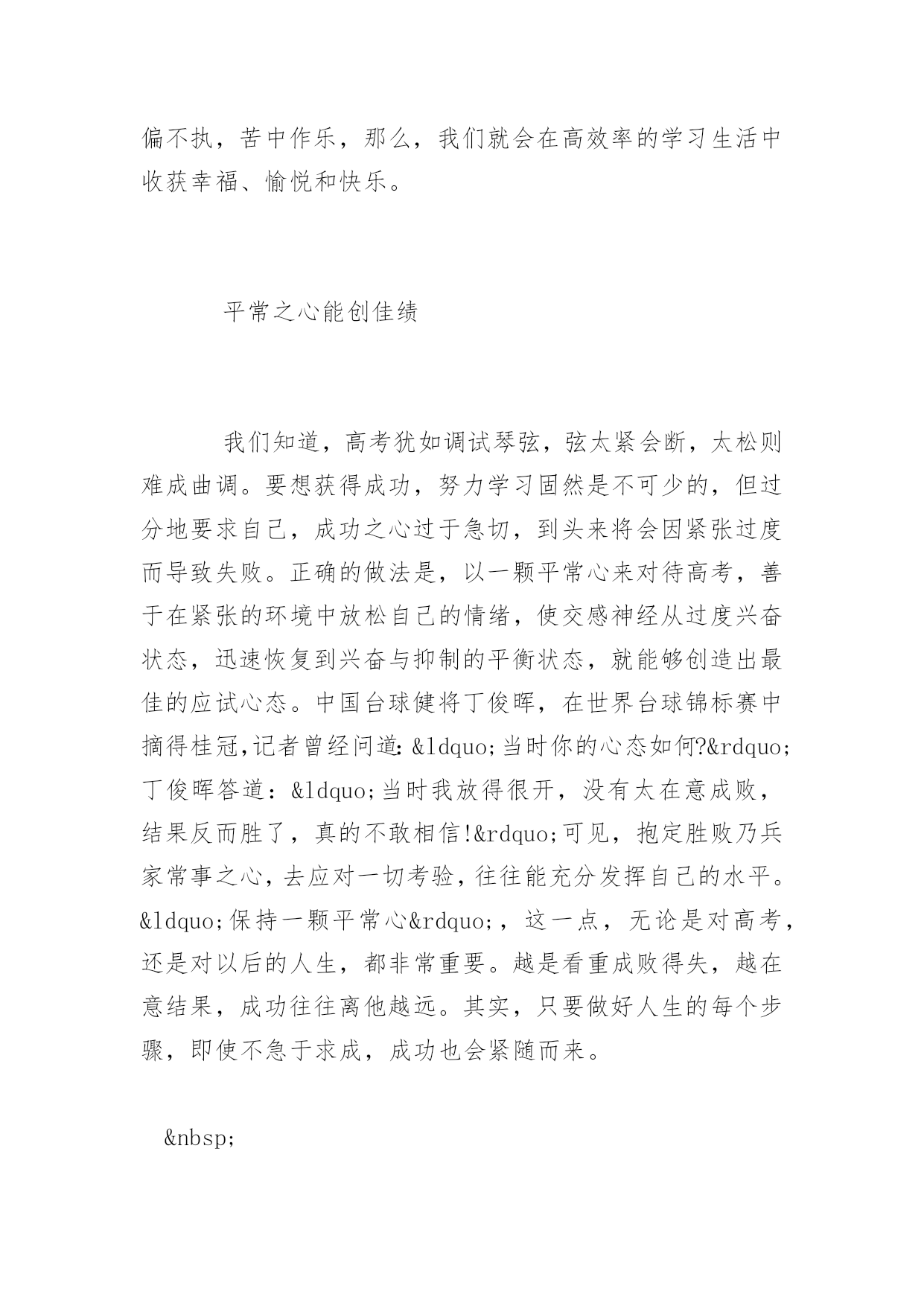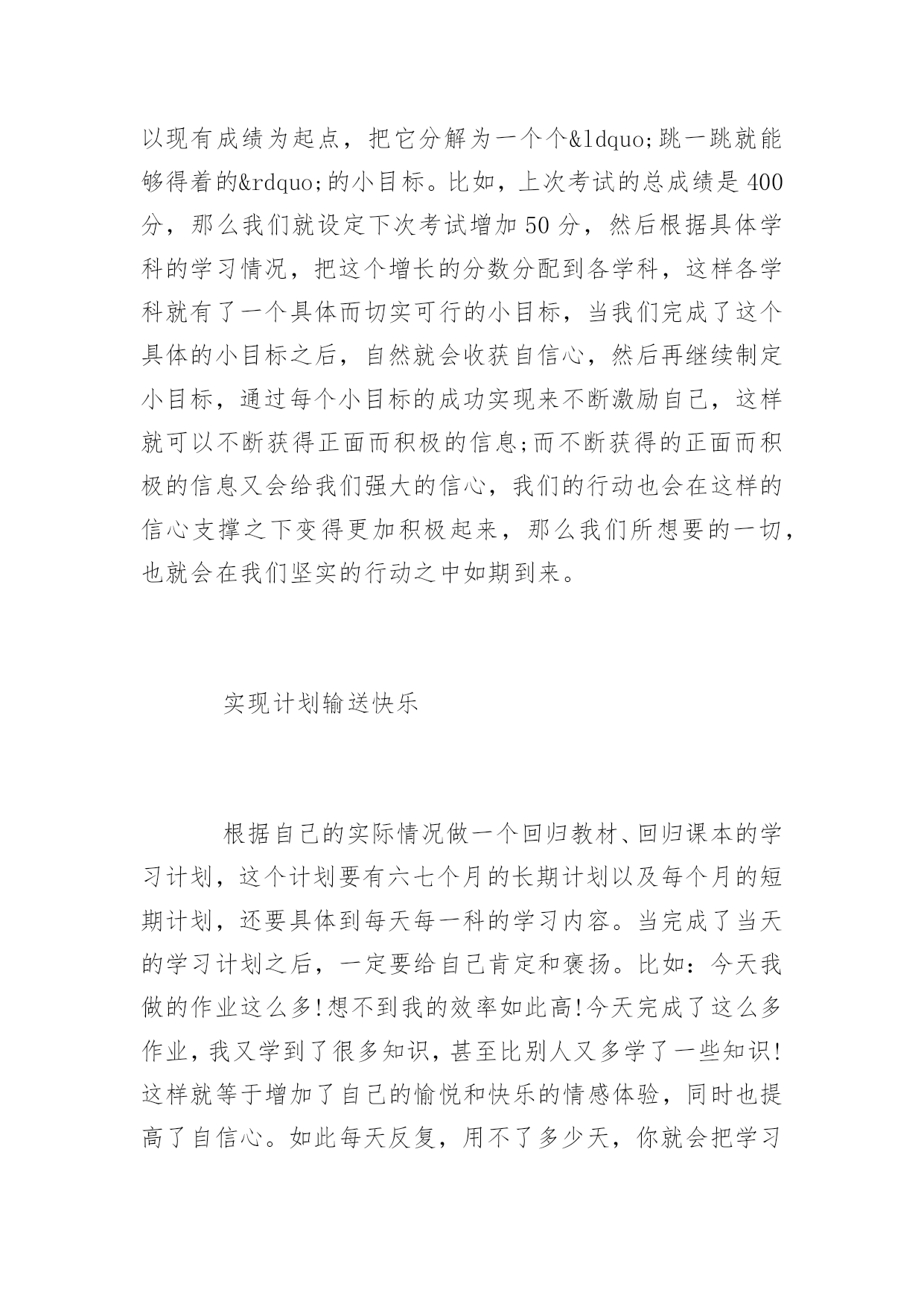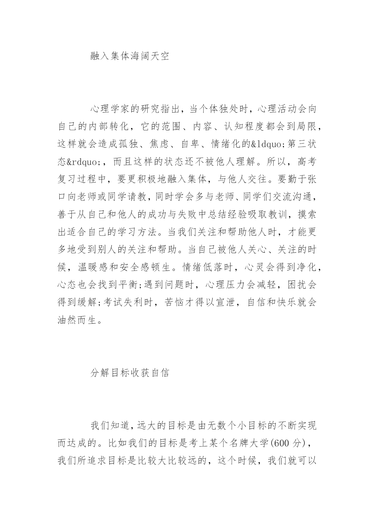 迎战高考的心态调整方法迎战高考的心态调整方法离高考越来越近了,广大考生准备好了吗?你的心态也准备好了吗?迎战高考的心态调整方法是小编为大家带来的,希望对大家有所帮助。积极暗示振奋精神生活中,失败者之所以失败,就是因为他们心态有问题。遇到困难,他们总是挑选后退之路。“我不行了,我还是退缩吧。”这种消极的暗示,往往会让我们陷入更加失败的深渊。成功者则不然,他们遇到困难,仍然保持积极的心态,用“我要!我能!”“一定有办法”等积极的意念鼓励自己,于是便能想尽办法,不断前进,直至成功。所以,面对困难的时候,我们要学会自己鼓励自己,对自己进行积极的心理暗示。任何时候我们都要对自己说“我行”、“我正期待着……”、“比上次情况好多了”“我有实力,我有能力,我一定会成功”,经过这样的自言自语式的心理暗示,我们的心情会更加积极乐观,思维、行动的效率自然也会提高。当然,面对别人无聊的负面评价时,更要相信自己,鼓励自己,只有这样我们才能积极想办法克服困难和障碍,不断前进直至成功。有了积极的心理暗示,还要同时学习让自己开心的方法。比如每天微笑,对着镜子里的自己,对着别人,对着世界。情绪低落时,昂首挺胸,加快走路步伐;握拳为自己加油,听昂扬向上的音乐,这些方法都可以让自己精神饱满,充满斗志;郁闷时,到旷野之中大喊几声,读书时,大声朗读,还可以让胸中积虑顿时随风而散。我们要好好地为今天而活,不要老是抱怨今天的辛苦,其实明天可能更辛苦。高三的学习固然辛苦,我们要善于发现其中的乐趣。当我们自信满满、踏实有效地完成了一天的学习任务时,快乐就会在每天晚上十二点以后登临梦府。融入集体海阔天空心理学家的研究指出,当个体独处时,心理活动会向自己的内部转化,它的范围、内容、认知程度都会到局限,这样就会造成孤独、焦虑、自卑、情绪化的“第三状态”,而且这样的状态还不被他人理解。所以,高考复习过程中,要更积极地融入集体,与他人交往。要勤于张口向老师或同学请教,同时学会多与老师、同学们交流沟通,善于从自己和他人的成功与失败中总结经验吸取教训,摸索出适合自己的学习方法。当我们关注和帮助他人时,才能更多地受到别人的关注和帮助。当自己被他人关心、关注的时候,温暖感和安全感顿生。情绪低落时,心灵会得到净化,心态也会找到平衡;遇到问题时,心理压力会减轻,困扰会得到缓解;考试失利时,苦恼才得以宣泄,自信和快乐就会油然而生。分解目标收获自信我们知道,远大的目标是由无数个小目标的不断实现而达成的。比如我们的目标是考上某个名牌大学(600分),我们所追求目标是比较大比较远的,这个时候,我们就可以以现有成绩为起点,把它分解为一个个“跳一跳就能够得着的”的小目标。比如,上次考试的总成绩是400分,那么我们就设定下次考试增加50分,然后根据具体学科的学习情况,把这个增长的分数分配到各学科,这样各学科就有了一个具体而切实可行的小目标,当我们完成了这个具体的小目标之后,自然就会收获自信心,然后再继续制定小目标,通过每个小目标的成功实现来不断激励自己,这样就可以不断获得正面而积极的信息;而不断获得的正面而积极的信息又会给我们强大的信心,我们的行动也会在这样的信心支撑之下变得更加积极起来,那么我们所想要的一切,也就会在我们坚实的行动之中如期到来。实现计划输送快乐根据自己的实际情况做一个回归教材、回归课本的学习计划,这个计划要有六七个月的长期计划以及每个月的短期计划,还要具体到每天每一科的学习内容。当完成了当天的学习计划之后,一定要给自己肯定和褒扬。比如:今天我做的作业这么多!想不到我的效率如此高!今天完成了这么多作业,我又学到了很多知识,甚至比别人又多学了一些知识!这样就等于增加了自己的愉悦和快乐的情感体验,同时也提高了自信心。如此每天反复,用不了多少天,你就会把学习真正接纳为一件快乐的事情,学习热情当然也就会高涨起来。立足长远科学用脑实现高考目标,最重要的是合理安排复习时间。我们知道,高三的每个同学都知道珍惜时间,常常加班加点、开夜车甚至取消体育锻炼。其实这样做,在短时间内的确可以把学习成绩搞上去,但是长此以往,大脑和身体就会起来反抗——无精打采,头昏脑胀,思绪纷乱,注意力无法集中等,学习效率反而会严重下降。所以,高考复习时间安排要立足长远,保证大脑机能和身体活动能力处于良好水平之上,真正做到高效率地学习和生活。复习过程中,应该做到以下几点。首先要合理地安排用脑时间。学习是生活的一部分,劳逸结合是十分必要的,必须