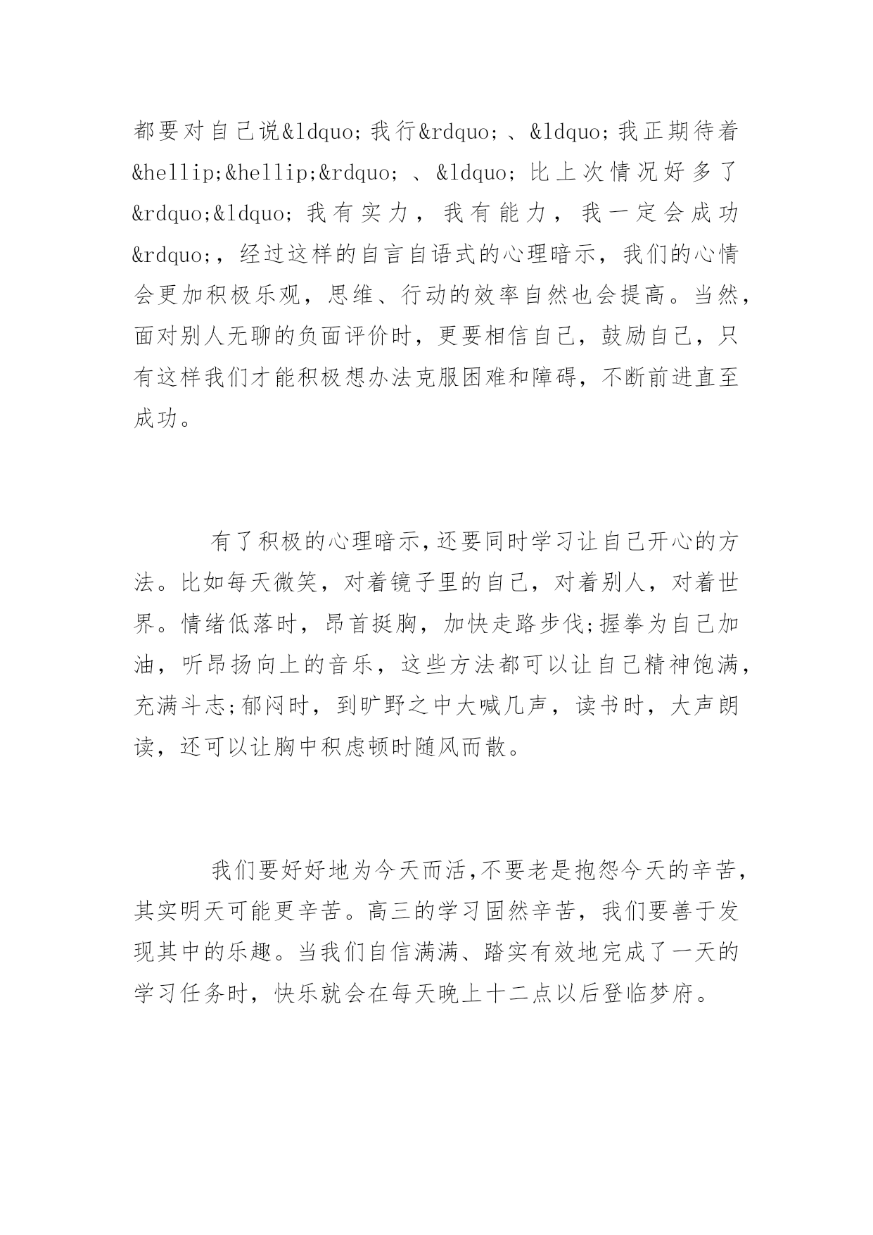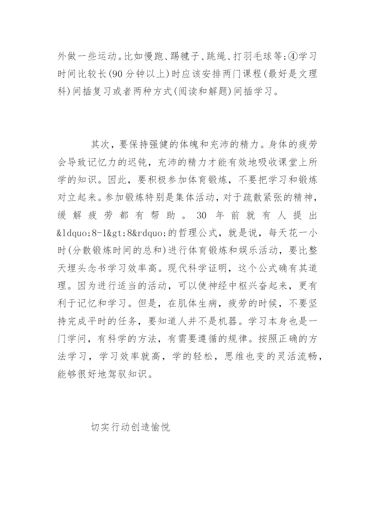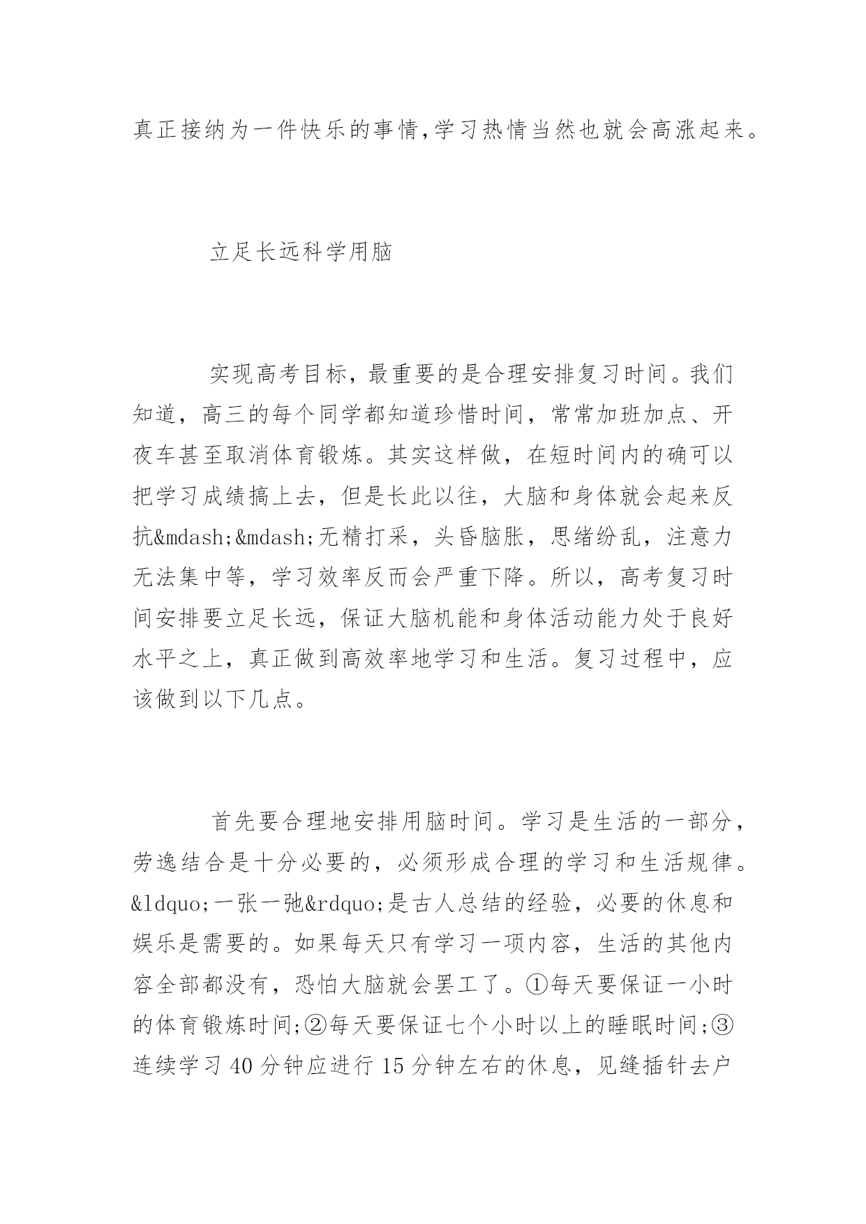 迎战高考的心态调整方法迎战高考的心态调整方法离高考越来越近了,广大考生准备好了吗?你的心态也准备好了吗?迎战高考的心态调整方法是小编为大家带来的,希望对大家有所帮助。积极暗示振奋精神生活中,失败者之所以失败,就是因为他们心态有问题。遇到困难,他们总是挑选后退之路。“我不行了,我还是退缩吧。”这种消极的暗示,往往会让我们陷入更加失败的深渊。成功者则不然,他们遇到困难,仍然保持积极的心态,用“我要!我能!”“一定有办法”等积极的意念鼓励自己,于是便能想尽办法,不断前进,直至成功。所以,面对困难的时候,我们要学会自己鼓励自己,对自己进行积极的心理暗示。任何时候我们都要对自己说“我行”、“我正期待着……”、“比上次情况好多了”“我有实力,我有能力,我一定会成功”,经过这样的自言自语式的心理暗示,我们的心情会更加积极乐观,思维、行动的效率自然也会提高。当然,面对别人无聊的负面评价时,更要相信自己,鼓励自己,只有这样我们才能积极想办法克服困难和障碍,不断前进直至成功。有了积极的心理暗示,还要同时学习让自己开心的方法。比如每天微笑,对着镜子里的自己,对着别人,对着世界。情绪低落时,昂首挺胸,加快走路步伐;握拳为自己加油,听昂扬向上的音乐,这些方法都可以让自己精神饱满,充满斗志;郁闷时,到旷野之中大喊几声,读书时,大声朗读,还可以让胸中积虑顿时随风而散。我们要好好地为今天而活,不要老是抱怨今天的辛苦,其实明天可能更辛苦。高三的学习固然辛苦,我们要善于发现其中的乐趣。当我们自信满满、踏实有效地完成了一天的学习任务时,快乐就会在每天晚上十二点以后登临梦府。融入集体海阔天空心理学家的研究指出,当个体独处时,心理活动会向自己的内部转化,它的范围、内容、认知程度都会到局限,这样就会造成孤独、焦虑、自卑、情绪化的“第三状态”,而且这样的状态还不被他人理解。所以,高考复习过程中,要更积极地融入集体,与他人交往。要勤于张口向老师或同学请教,同时学会多与老师、同学们交流沟通,善于从自己和他人的成功与失败中总结经验吸取教训,摸索出适合自己的学习方法。当我们关注和帮助他人时,才能更多地受到别人的关注和帮助。当自己被他人关心、关注的时候,温暖感和安全感顿生。情绪低落时,心灵会得到净化,心态也会找到平衡;遇到问题时,心理压力会减轻,困扰会得到缓解;考试失利时,苦恼才得以宣泄,自信和快乐就会油然而生。分解目标收获自信我们知道,远大的目标是由无数个小目标的不断实现而达成的。比如我们的目标是考上某个名牌大学(600分),我们所追求目标是比较大比较远的,这个时候,我们就可以以现有成绩为起点,把它分解为一个个“跳一跳就能够得着的”的小目标。比如,上次考试的总成绩是400分,那么我们就设定下次考试增加50分,然后根据具体学科的学习情况,把这个增长的分数分配到各学科,这样各学科就有了一个具体而切实可行的小目标,当我们完成了这个具体的小目标之后,自然就会收获自信心,然后再继续制定小目标,通过每个小目标的成功实现来不断激励自己,这样就可以不断获得正面而积极的信息;而不断获得的正面而积极的信息又会给我们强大的信心,我们的行动也会在这样的信心支撑之下变得更加积极起来,那么我们所想要的一切,也就会在我们坚实的行动之中如期到来。实现计划输送快乐根据自己的实际情况做一个回归教材、回归课本的学习计划,这个计划要有六七个月的长期计划以及每个月的短期计划,还要具体到每天每一科的学习内容。当完成了当天的学习计划之后,一定要给自己肯定和褒扬。比如:今天我做的作业这么多!想不到我的效率如此高!今天完成了这么多作业,我又学到了很多知识,甚至比别人又多学了一些知识!这样就等于增加了自己的愉悦和快乐的情感体验,同时也提高了自信心。如此每天反复,用不了多少天,你就会把学习真正接纳为一件快乐的事情,学习热情当然也就会高涨起来。立足长远科学用脑实现高考目标,最重要的是合理安排复习时间。我们知道,高三的每个同学都知道珍惜时间,常常加班加点、开夜车甚至取消体育锻炼。其实这样做,在短时间内的确可以把学习成绩搞上去,但是长此以往,大脑和身体就会起来反抗——无精打采,头昏脑胀,思绪纷乱,注意力无法集中等,学习效率反而会严重下降。所以,高考复习时间安排要立足长远,保证大脑机能和身体活动能力处于良好水平之上,真正做到高效率地学习和生活。复习过程中,应该做到以下几点。首先要合理地安排用脑时间。学习是生活的一部分,劳逸结合是十分必要的,必须