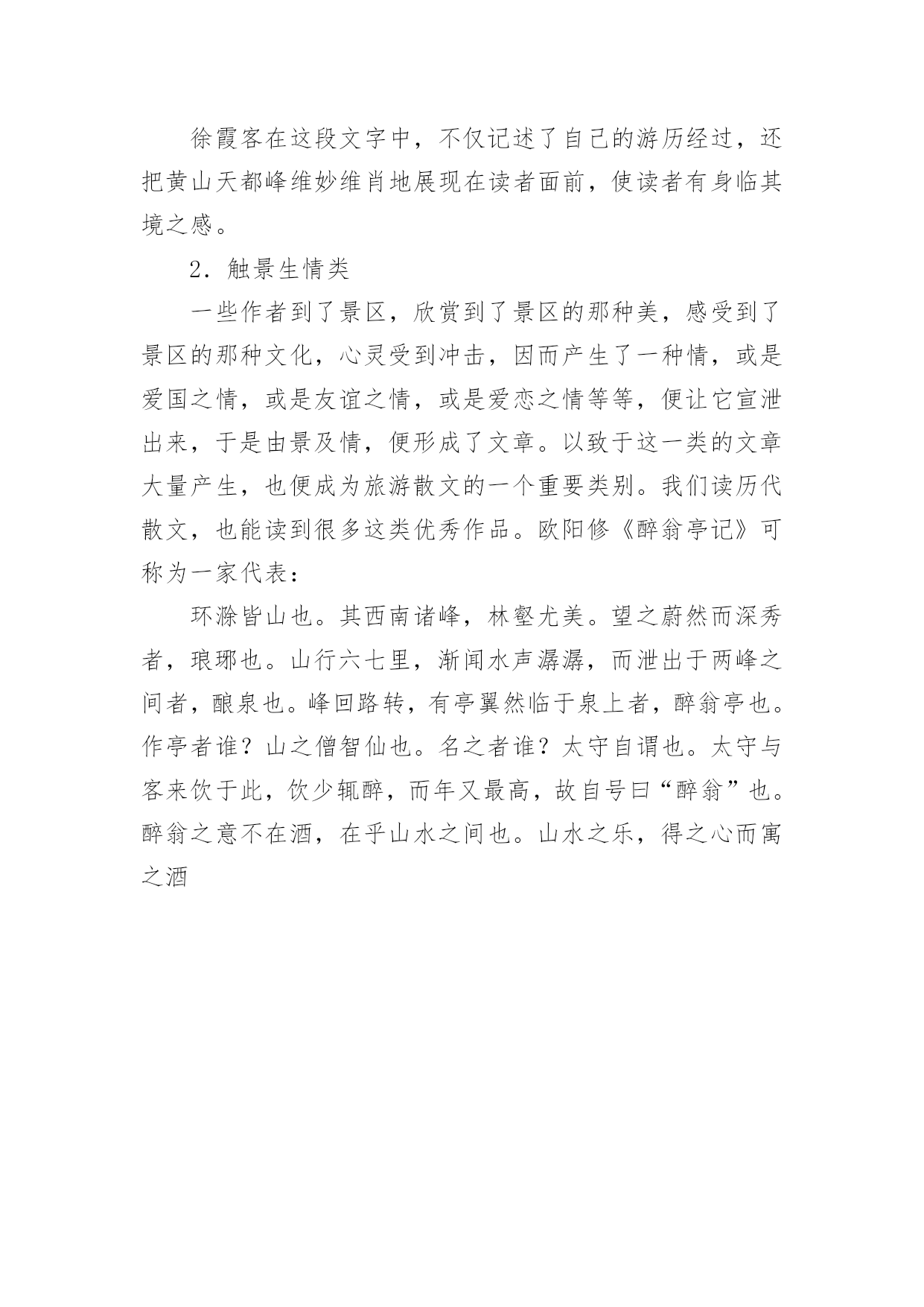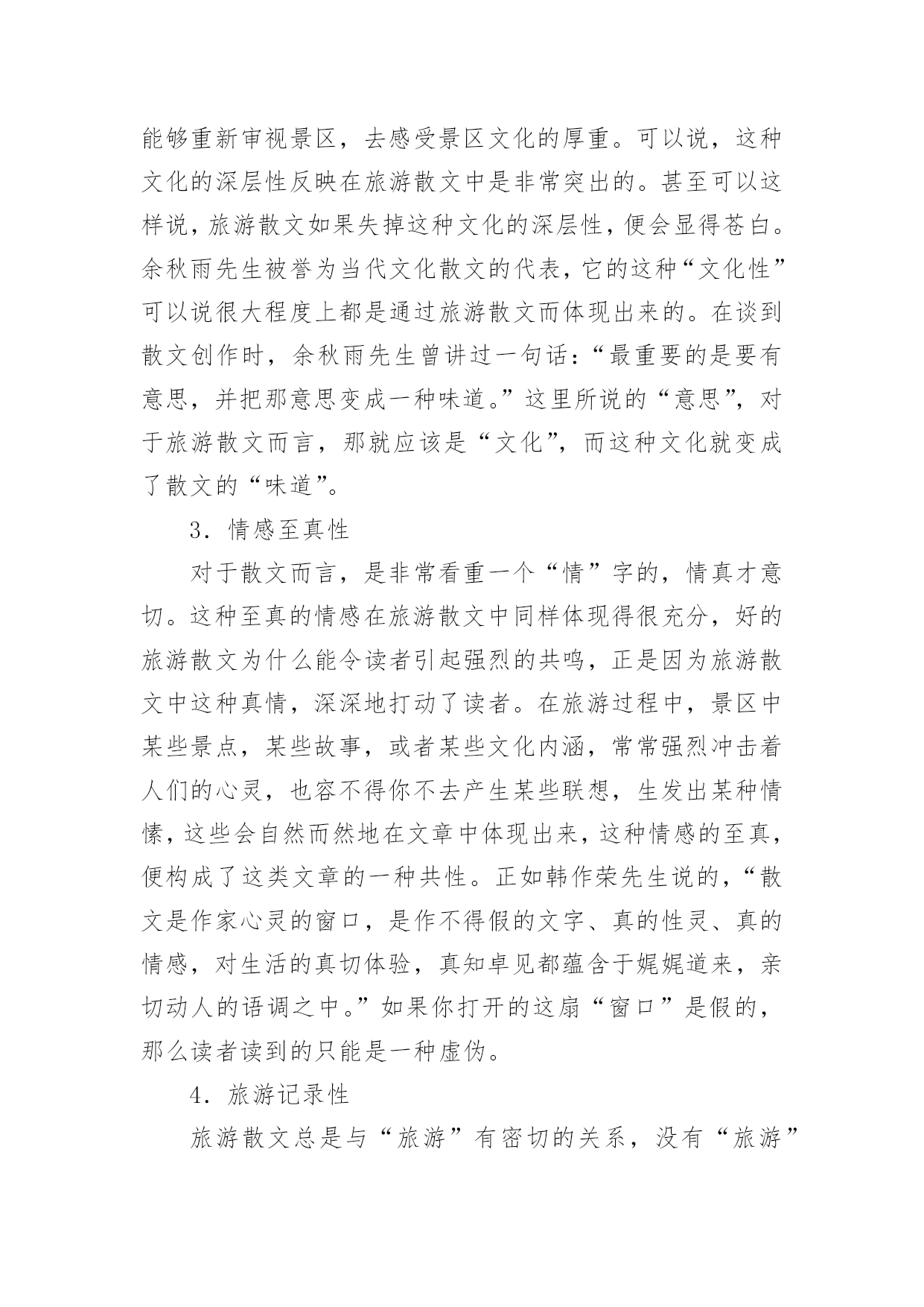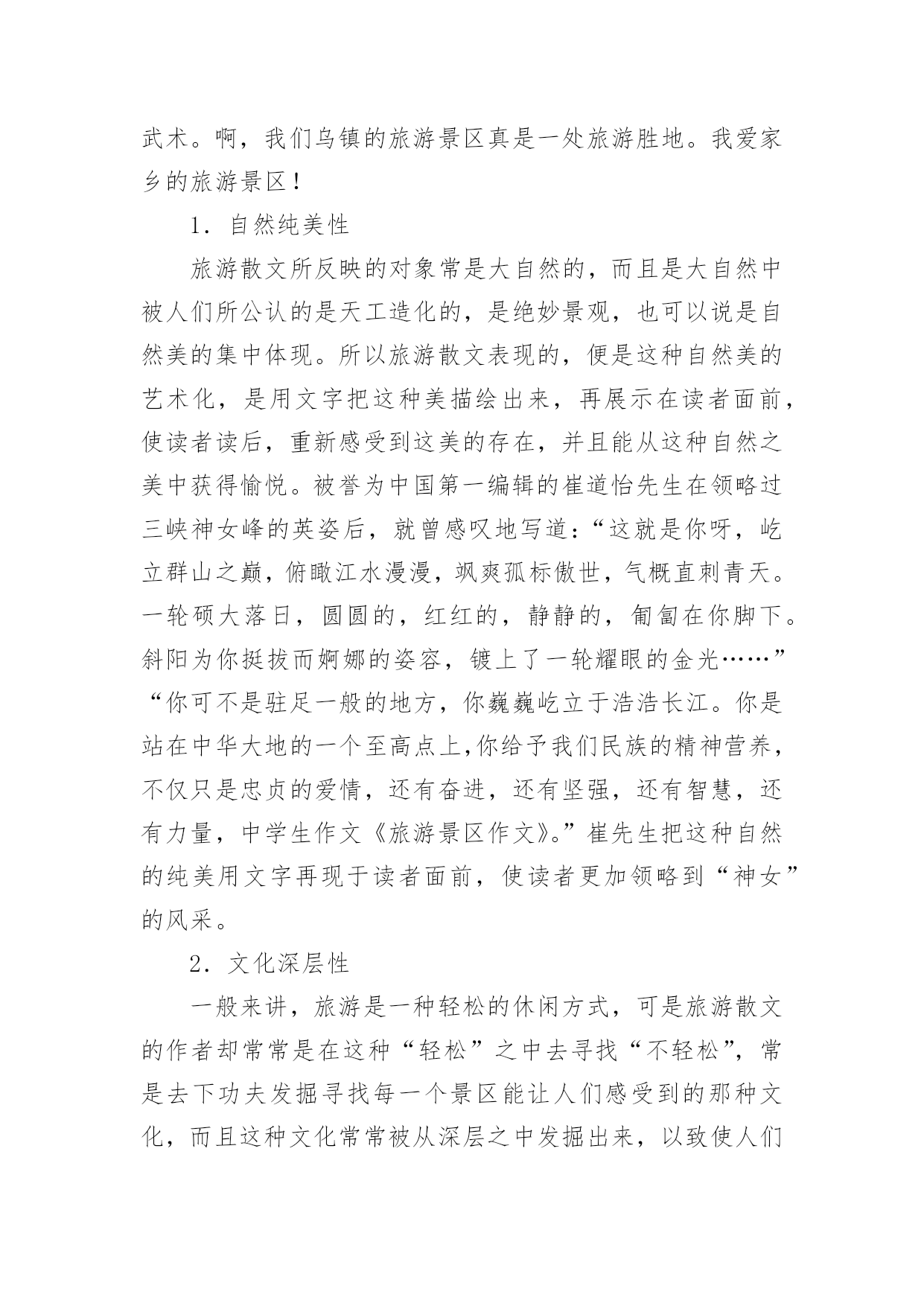 如何写好旅游散文腊子口位于甘肃省甘南藏族自治州迭部县,四面环山,地势险要,是四川通往甘肃的关口,旅游景区作文。走进腊子口,满山的花草树木缤纷艳丽,白色的羊群,黑色的牦牛,缀满山野,悠然地吃着青草。车行驶在蜿蜒崎岖的山路上,仿佛在一幅美丽的油画中穿行。微风吹过,树叶犹如无数只金光闪闪的蝴蝶在空中翩翩起舞。不时,天空中还会飘来一阵细雨,像牛毛、像细针,飘飘扬扬洒落着。雨过天晴,空气清新,透着清香,浓雾从山底升腾起来,慢慢飘移,四周的群山若隐若现,犹如梦幻一般,花儿上的小露珠晶莹剔透,就像满山洒满了珍珠。车在山中盘旋,朵朵白云从我们身边飘过,山朦胧,雾朦胧,啊!腊子口,太美了!我已完全陶醉在这美丽迷人的景色中。这时,几十辆写着“纪念红军长征胜利七十周年,人民警察重走长征路”的车队从我们身边缓缓而过,车身上鲜红的“长征精神万岁”几个大字映入了我的眼帘。我好奇地问爸爸:“红军长征是不是经过了这里?这里是不是我们书上提到的腊子口战役的发生地呢?”,爸爸表情凝重地点点头,紧接着动情地给我讲起了发生在腊子口战役中的故事:“1935年9月红军长征途经此地时,敌人重兵把守,企图阻挡红军北上抗日。有一名叫‘甘人’的小战士,参加红军前,曾是一个差一点被饿死的乞丐,是红军救了他。腊子口战役打响后,甘人奋不顾身,攀上悬崖,身上缠满了手榴弹,高喊着‘红军胜利万岁!’,纵身跳向敌人的碉堡,与敌人同归于尽,为红军夺取腊子口天堑献出了年轻的生命。为了缅怀这些像甘人一样英勇的红军战士,毛主席饱含热泪赋诗赞扬他们:红军不怕远征难,万水千山只等闲。五岭逶迤腾细浪,乌蒙磅礴走泥丸。金沙水拍云崖暖,大渡桥横铁索寒。更喜岷山千里雪,三军过后尽开颜。的家乡就是举世闻名的茅盾故乡乌镇。全国各地的游客纷纷前来我们家乡参观游览。现在还有许多外国人也经常来我们家乡旅游。我们家乡的旅游景区特别好。那里有一座寺院叫修真观。白天,常常有许多人站在台前观看台上的演出。晚上,许多人聚集在修真观前面的广场上唱歌跳舞,真是非常有趣!修真观的南面有一条清澈的小河,那就是东市河。它轻盈流畅,真像一条绿色的绸带。夏天的晚上,月牙儿倒映在透明的小河里,显得是那样的幽静动人。有一些小朋友来到这里,边跑边脱衣服。然后,他们一下子跳到河里跟月亮玩起了游戏。这是多么好的景色呀!小河两旁有许多明清时期的建筑。那里的居民全都住在这样的房子里面。那里还出卖许多好吃的东西,有姑嫂饼、一口粽、杭白菊……我最喜欢吃姑嫂饼了,景区里面的食品还有最有名的三白酒,保证你喝了一口还想再喝。景区里面还有许多名胜古迹,有财神湾,拳船,钱币馆……我非常喜欢拳船。因为那里有许多人在耍刀舞剑。这些人的功夫真好啊!我真想和他们一样会武术。啊,我们乌镇的旅游景区真是一处旅游胜地。我爱家乡的旅游景区!1.自然纯美性旅游散文所反映的对象常是大自然的,而且是大自然中被人们所公认的是天工造化的,是绝妙景观,也可以说是自然美的集中体现。所以旅游散文表现的,便是这种自然美的艺术化,是用文字把这种美描绘出来,再展示在读者面前,使读者读后,重新感受到这美的存在,并且能从这种自然之美中获得愉悦。被誉为中国第一编辑的崔道怡先生在领略过三峡神女峰的英姿后,就曾感叹地写道:“这就是你呀,屹立群山之巅,俯瞰江水漫漫,飒爽孤标傲世,气概直刺青天。一轮硕大落日,圆圆的,红红的,静静的,匍匐在你脚下。斜阳为你挺拔而婀娜的姿容,镀上了一轮耀眼的金光……”“你可不是驻足一般的地方,你巍巍屹立于浩浩长江。你是站在中华大地的一个至高点上,你给予我们民族的精神营养,不仅只是忠贞的爱情,还有奋进,还有坚强,还有智慧,还有力量,中学生作文《旅游景区作文》。”崔先生把这种自然的纯美用文字再现于读者面前,使读者更加领略到“神女”的风采。2.文化深层性一般来讲,旅游是一种轻松的休闲方式,可是旅游散文的作者却常常是在这种“轻松”之中去寻找“不轻松”,常是去下功夫发掘寻找每一个景区能让人们感受到的那种文化,而且这种文化常常被从深层之中发掘出来,以致使人们能够重新审视景区,去感受景区文化的厚重。可以说,这种文化的深层性反映在旅游散文中是非常突出的。甚至可以这样说,旅游散文如果失掉这种文化的深层性,便会显得苍白。余秋雨先生被誉为当代文化散文的代表,它的这种“文化性”可以说很大程度上都是通过旅游散文而体现出来的。在谈到散文创作时,余秋雨先生曾讲过一句话:“最重要的是要有意思,并把那意思变成一种味道。”这里所说的“意思”,对于旅游散文而言,那就应该是“文化”,而这种文化就变成了散文的“味道”。3.情感至真性对于散文而言,是非常看重一个“情”字的,情真才意切。这种至真的情感在旅游散文中同样体现得很充分,好的旅游散文为什么能令读者引起强烈的共鸣,正是因为旅游散文中这种真情,深深地打动了读者。在旅游过程中,景区