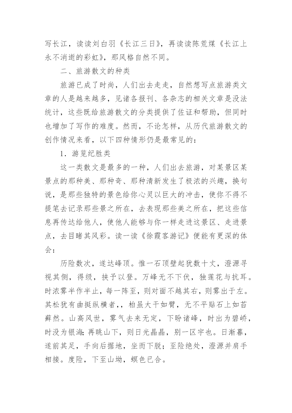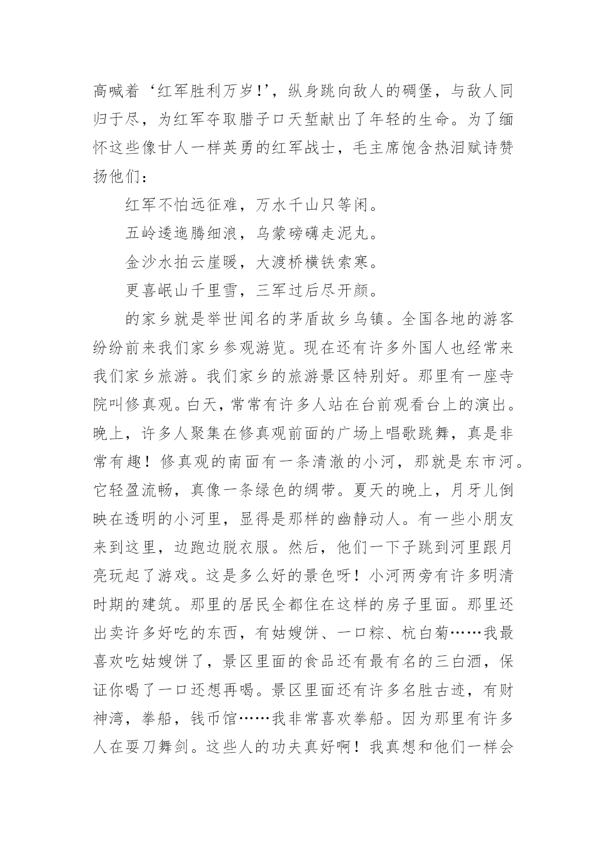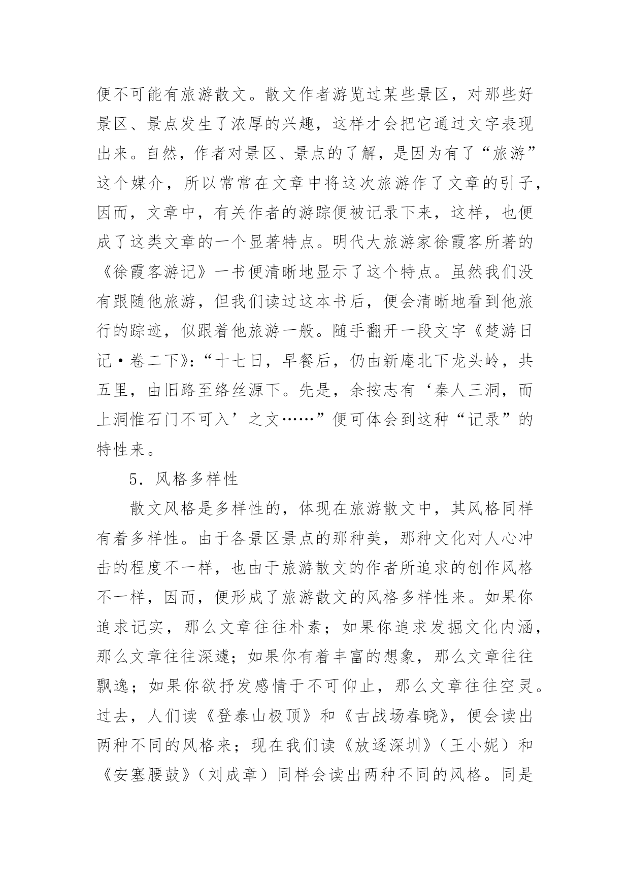 如何写好旅游散文腊子口位于甘肃省甘南藏族自治州迭部县,四面环山,地势险要,是四川通往甘肃的关口,旅游景区作文。走进腊子口,满山的花草树木缤纷艳丽,白色的羊群,黑色的牦牛,缀满山野,悠然地吃着青草。车行驶在蜿蜒崎岖的山路上,仿佛在一幅美丽的油画中穿行。微风吹过,树叶犹如无数只金光闪闪的蝴蝶在空中翩翩起舞。不时,天空中还会飘来一阵细雨,像牛毛、像细针,飘飘扬扬洒落着。雨过天晴,空气清新,透着清香,浓雾从山底升腾起来,慢慢飘移,四周的群山若隐若现,犹如梦幻一般,花儿上的小露珠晶莹剔透,就像满山洒满了珍珠。车在山中盘旋,朵朵白云从我们身边飘过,山朦胧,雾朦胧,啊!腊子口,太美了!我已完全陶醉在这美丽迷人的景色中。这时,几十辆写着“纪念红军长征胜利七十周年,人民警察重走长征路”的车队从我们身边缓缓而过,车身上鲜红的“长征精神万岁”几个大字映入了我的眼帘。我好奇地问爸爸:“红军长征是不是经过了这里?这里是不是我们书上提到的腊子口战役的发生地呢?”,爸爸表情凝重地点点头,紧接着动情地给我讲起了发生在腊子口战役中的故事:“1935年9月红军长征途经此地时,敌人重兵把守,企图阻挡红军北上抗日。有一名叫‘甘人’的小战士,参加红军前,曾是一个差一点被饿死的乞丐,是红军救了他。腊子口战役打响后,甘人奋不顾身,攀上悬崖,身上缠满了手榴弹,高喊着‘红军胜利万岁!’,纵身跳向敌人的碉堡,与敌人同归于尽,为红军夺取腊子口天堑献出了年轻的生命。为了缅怀这些像甘人一样英勇的红军战士,毛主席饱含热泪赋诗赞扬他们:红军不怕远征难,万水千山只等闲。五岭逶迤腾细浪,乌蒙磅礴走泥丸。金沙水拍云崖暖,大渡桥横铁索寒。更喜岷山千里雪,三军过后尽开颜。的家乡就是举世闻名的茅盾故乡乌镇。全国各地的游客纷纷前来我们家乡参观游览。现在还有许多外国人也经常来我们家乡旅游。我们家乡的旅游景区特别好。那里有一座寺院叫修真观。白天,常常有许多人站在台前观看台上的演出。晚上,许多人聚集在修真观前面的广场上唱歌跳舞,真是非常有趣!修真观的南面有一条清澈的小河,那就是东市河。它轻盈流畅,真像一条绿色的绸带。夏天的晚上,月牙儿倒映在透明的小河里,显得是那样的幽静动人。有一些小朋友来到这里,边跑边脱衣服。然后,他们一下子跳到河里跟月亮玩起了游戏。这是多么好的景色呀!小河两旁有许多明清时期的建筑。那里的居民全都住在这样的房子里面。那里还出卖许多好吃的东西,有姑嫂饼、一口粽、杭白菊……我最喜欢吃姑嫂饼了,景区里面的食品还有最有名的三白酒,保证你喝了一口还想再喝。景区里面还有许多名胜古迹,有财神湾,拳船,钱币馆……我非常喜欢拳船。因为那里有许多人在耍刀舞剑。这些人的功夫真好啊!我真想和他们一样会武术。啊,我们乌镇的旅游景区真是一处旅游胜地。我爱家乡的旅游景区!1.自然纯美性旅游散文所反映的对象常是大自然的,而且是大自然中被人们所公认的是天工造化的,是绝妙景观,也可以说是自然美的集中体现。所以旅游散文表现的,便是这种自然美的艺术化,是用文字把这种美描绘出来,再展示在读者面前,使读者读后,重新感受到这美的存在,并且能从这种自然之美中获得愉悦。被誉为中国第一编辑的崔道怡先生在领略过三峡神女峰的英姿后,就曾感叹地写道:“这就是你呀,屹立群山之巅,俯瞰江水漫漫,飒爽孤标傲世,气概直刺青天。一轮硕大落日,圆圆的,红红的,静静的,匍匐在你脚下。斜阳为你挺拔而婀娜的姿容,镀上了一轮耀眼的金光……”“你可不是驻足一般的地方,你巍巍屹立于浩浩长江。你是站在中华大地的一个至高点上,你给予我们民族的精神营养,不仅只是忠贞的爱情,还有奋进,还有坚强,还有智慧,还有力量,中学生作文《旅游景区作文》。”崔先生把这种自然的纯美用文字再现于读者面前,使读者更加领略到“神女”的风采。2.文化深层性一般来讲,旅游是一种轻松的休闲方式,可是旅游散文的作者却常常是在这种“轻松”之中去寻找“不轻松”,常是去下功夫发掘寻找每一个景区能让人们感受到的那种文化,而且这种文化常常被从深层之中发掘出来,以致使人们能够重新审视景区,去感受景区文化的厚重。可以说,这种文化的深层性反映在旅游散文中是非常突出的。甚至可以这样说,旅游散文如果失掉这种文化的深层性,便会显得苍白。余秋雨先生被誉为当代文化散文的代表,它的这种“文化性”可以说很大程度上都是通过旅游散文而体现出来的。在谈到散文创作时,余秋雨先生曾讲过一句话:“最重要的是要有意思,并把那意思变成一种味道。”这里所说的“意思”,对于旅游散文而言,那就应该是“文化”,而这种文化就变成了散文的“味道”。3.情感至真性对于散文而言,是非常看重一个“情”字的,情真才意切。这种至真的情感在旅游散文中同样体现得很充分,好的旅游散文为什么能令读者引起强烈的共鸣,正是因为旅游散文中这种真情,深深地打动了读者。在旅游过程中,景区