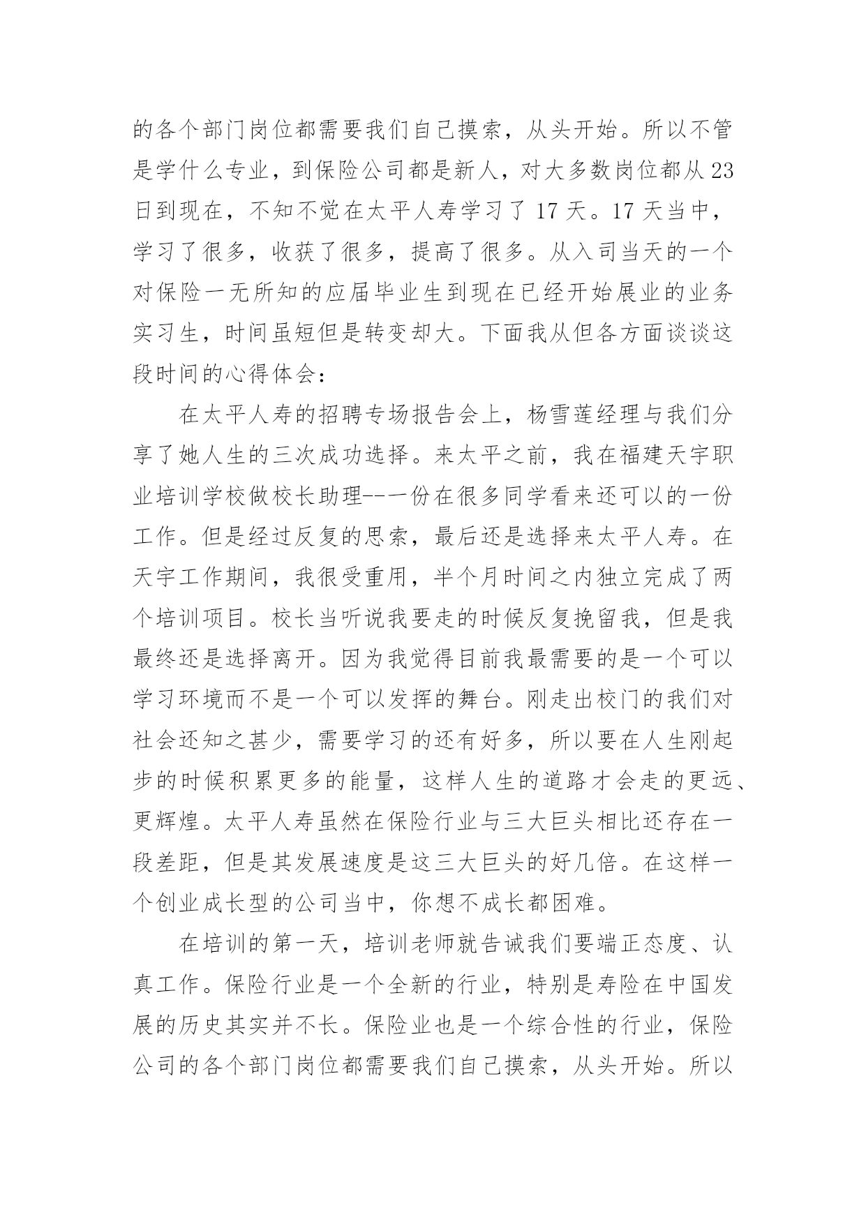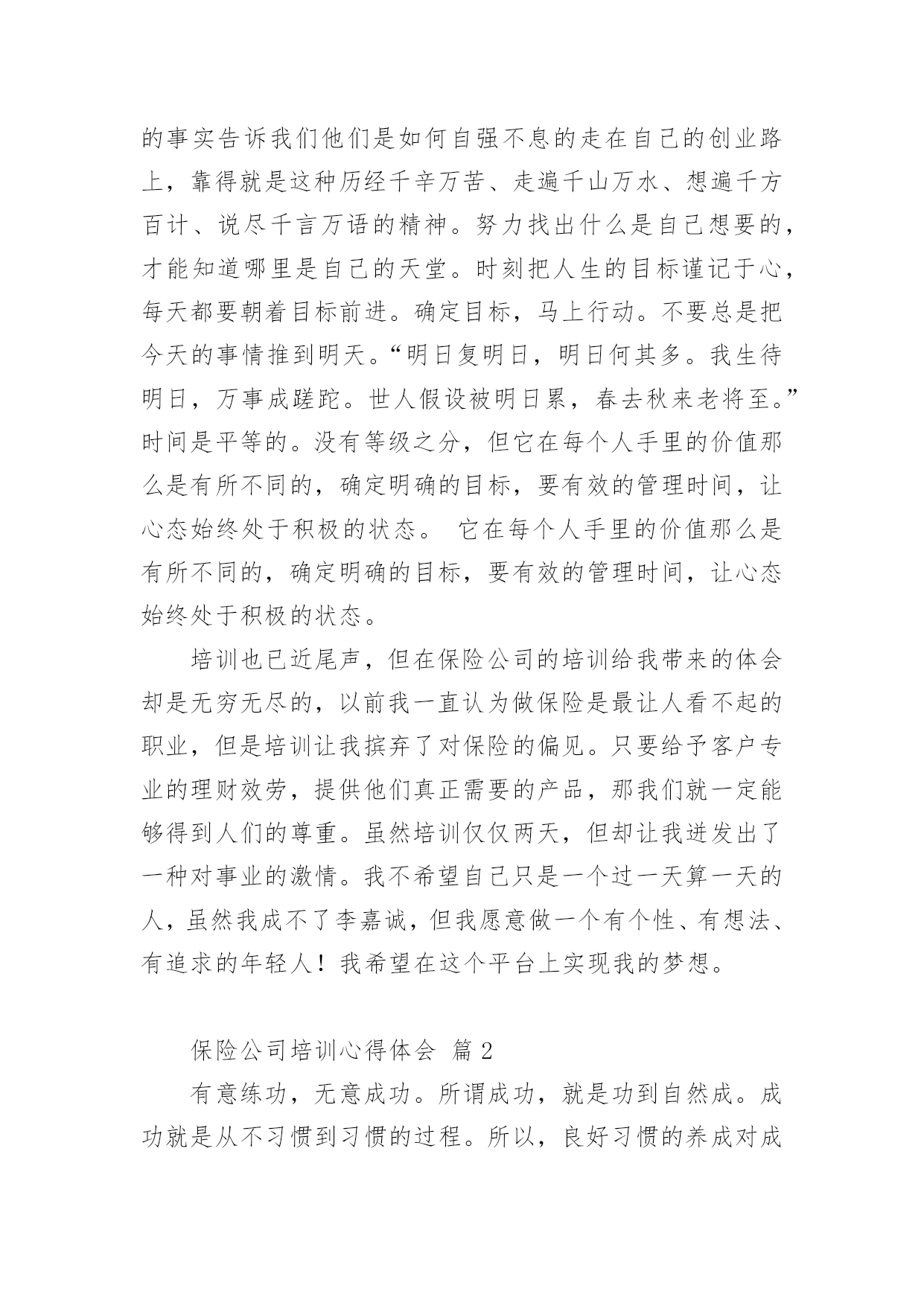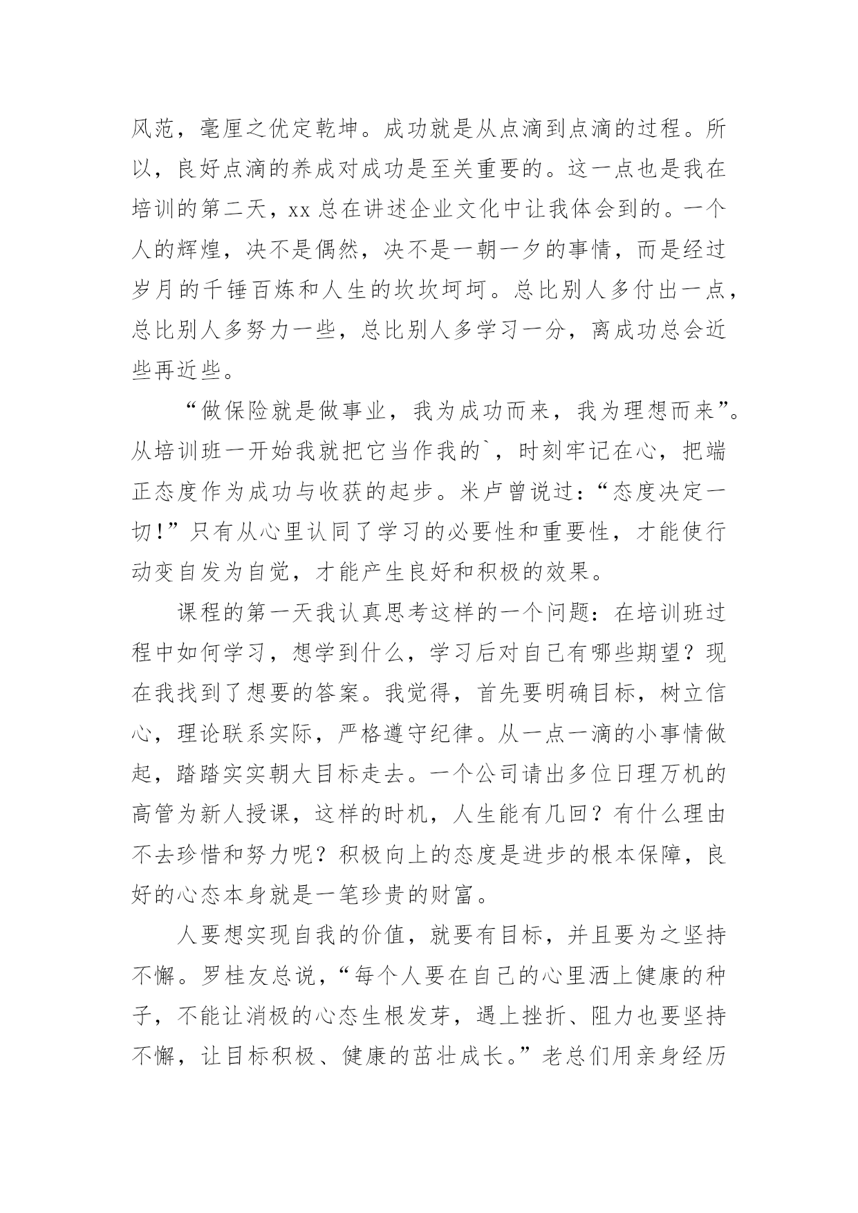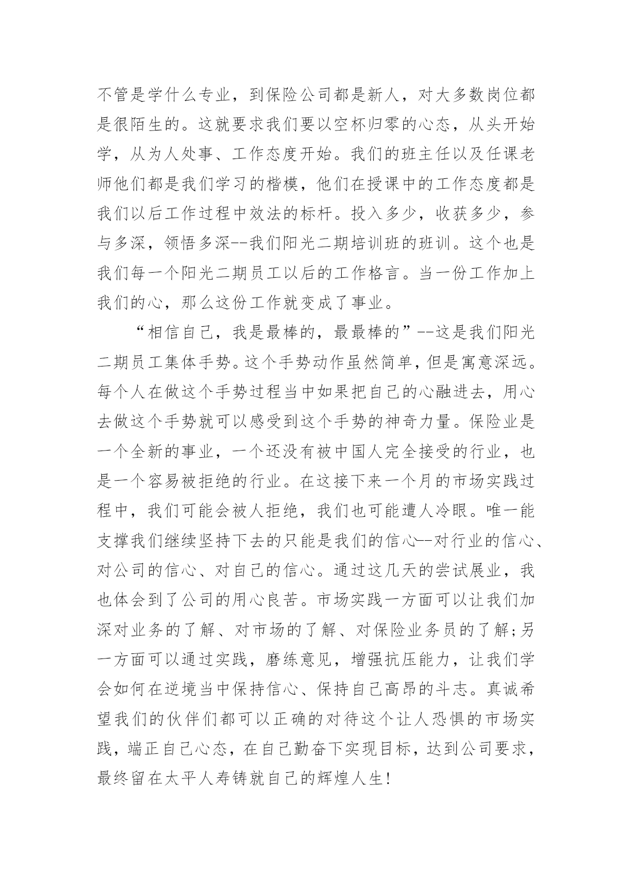 保险公司培训心得体会保险公司培训心得体会集锦13篇当我们经过反思,对生活有了新的看法时,应该马上记录下来,写一篇心得体会,这样能够让人头脑更加清醒,目标更加明确。怎样写好心得体会呢?下面是小编为大家整理的保险公司培训心得体会,欢迎阅读,希望大家能够喜欢。保险公司培训心得体会篇1怀着空杯的心态,20xx年4月16日,我有幸参加了xxxx保险股份为期两天的新人班岗前培训,回首培训过程中经历的点点滴滴,感慨颇多。第一天上午的培训,是银保的xx总和合规的xx总授课。授课中,xx总以他一贯的激情四射的风格紧紧吸引了大家。从他的讲述中,我对公司历史有了深入的了解:公司目前正处于高速开展阶段,是保险行业中第三兵团的佼佼者。他还谈到了他自己,在短短十余年时间里,怎样从一名不起眼的保险销售人员做到今天,成为生命人寿银保系统的领军人。他以自己的成长经历,鼓励在座的每一位学员。他的真诚、坦率、智慧、执着折服了现场的每一个人。激情四溢、精彩纷呈的课堂还在脑海里缭绕。转眼下午的培训又到了,xx总对目前保险行业的现状和开展趋势进行了深入的分析和讲解。从他的讲解中,我们认识到了现在保险行业的开展位置、未来的趋势以及保险销售的根本理念。正所谓:细微之处见风范,毫厘之优定乾坤。成功就是从点滴到点滴的过程。所以,良好点滴的养成对成功是至关重要的。这一点也是我在培训的第二天,xx总在讲述企业文化中让我体会到的。一个人的辉煌,决不是偶然,决不是一朝一夕的事情,而是经过岁月的千锤百炼和人生的坎坎坷坷。总比别人多付出一点,总比别人多努力一些,总比别人多学习一分,离成功总会近些再近些。“做保险就是做事业,我为成功而来,我为理想而来”。从培训班一开始我就把它当作我的`,时刻牢记在心,把端正态度作为成功与收获的起步。米卢曾说过:“态度决定一切!”只有从心里认同了学习的必要性和重要性,才能使行动变自发为自觉,才能产生良好和积极的效果。课程的第一天我认真思考这样的一个问题:在培训班过程中如何学习,想学到什么,学习后对自己有哪些期望?现在我找到了想要的答案。我觉得,首先要明确目标,树立信心,理论联系实际,严格遵守纪律。从一点一滴的小事情做起,踏踏实实朝大目标走去。一个公司请出多位日理万机的高管为新人授课,这样的时机,人生能有几回?有什么理由不去珍惜和努力呢?积极向上的态度是进步的根本保障,良好的心态本身就是一笔珍贵的财富。人要想实现自我的价值,就要有目标,并且要为之坚持不懈。罗桂友总说,“每个人要在自己的心里洒上健康的种子,不能让消极的心态生根发芽,遇上挫折、阻力也要坚持不懈,让目标积极、健康的茁壮成长。”老总们用亲身经历的事实告诉我们他们是如何自强不息的走在自己的创业路上,靠得就是这种历经千辛万苦、走遍千山万水、想遍千方百计、说尽千言万语的精神。努力找出什么是自己想要的,才能知道哪里是自己的天堂。时刻把人生的目标谨记于心,每天都要朝着目标前进。确定目标,马上行动。不要总是把今天的事情推到明天。“明日复明日,明日何其多。我生待明日,万事成蹉跎。世人假设被明日累,春去秋来老将至。”时间是平等的。没有等级之分,但它在每个人手里的价值那么是有所不同的,确定明确的目标,要有效的管理时间,让心态始终处于积极的状态。它在每个人手里的价值那么是有所不同的,确定明确的目标,要有效的管理时间,让心态始终处于积极的状态。培训也已近尾声,但在保险公司的培训给我带来的体会却是无穷无尽的,以前我一直认为做保险是最让人看不起的职业,但是培训让我摈弃了对保险的偏见。只要给予客户专业的理财效劳,提供他们真正需要的产品,那我们就一定能够得到人们的尊重。虽然培训仅仅两天,但却让我迸发出了一种对事业的激情。我不希望自己只是一个过一天算一天的人,虽然我成不了李嘉诚,但我愿意做一个有个性、有想法、有追求的年轻人!我希望在这个平台上实现我的梦想。保险公司培训心得体会篇2有意练功,无意成功。所谓成功,就是功到自然成。成功就是从不习惯到习惯的过程。所以,良好习惯的养成对成功是至关重要的一个人的辉煌,决不是偶然,决不是一朝一夕的事情,而是经过岁月的千锤百炼和人生的坎坎坷坷。专家统计,一个良好习惯的养成,至少要经过37次的反复练习才能形成,而即形成的好习惯,可以陪伴其一生,一流组训的风范,要从培养良好习惯开始。在培训班里有许多细节上的规定,比如椅子及时归位,上课手机不能携带,就餐不得喧哗,保持四周整洁卫生,着装整齐讲究,严格遵守作息时间,严格履行请假手续等,这些都充分体现了老师们的良苦用心。一支招之即来,来之能战,战之能胜的部队必然是一支习惯良好,纪律严明,作风过硬的部队。培训班全封闭的学习和训练是紧张而又愉快的,大家都以追求竞争。追求卓越。追求挑战的全新精神来投入,整合旧知识,学习新技能是目标,同时,我认为,良好习惯的培养也是