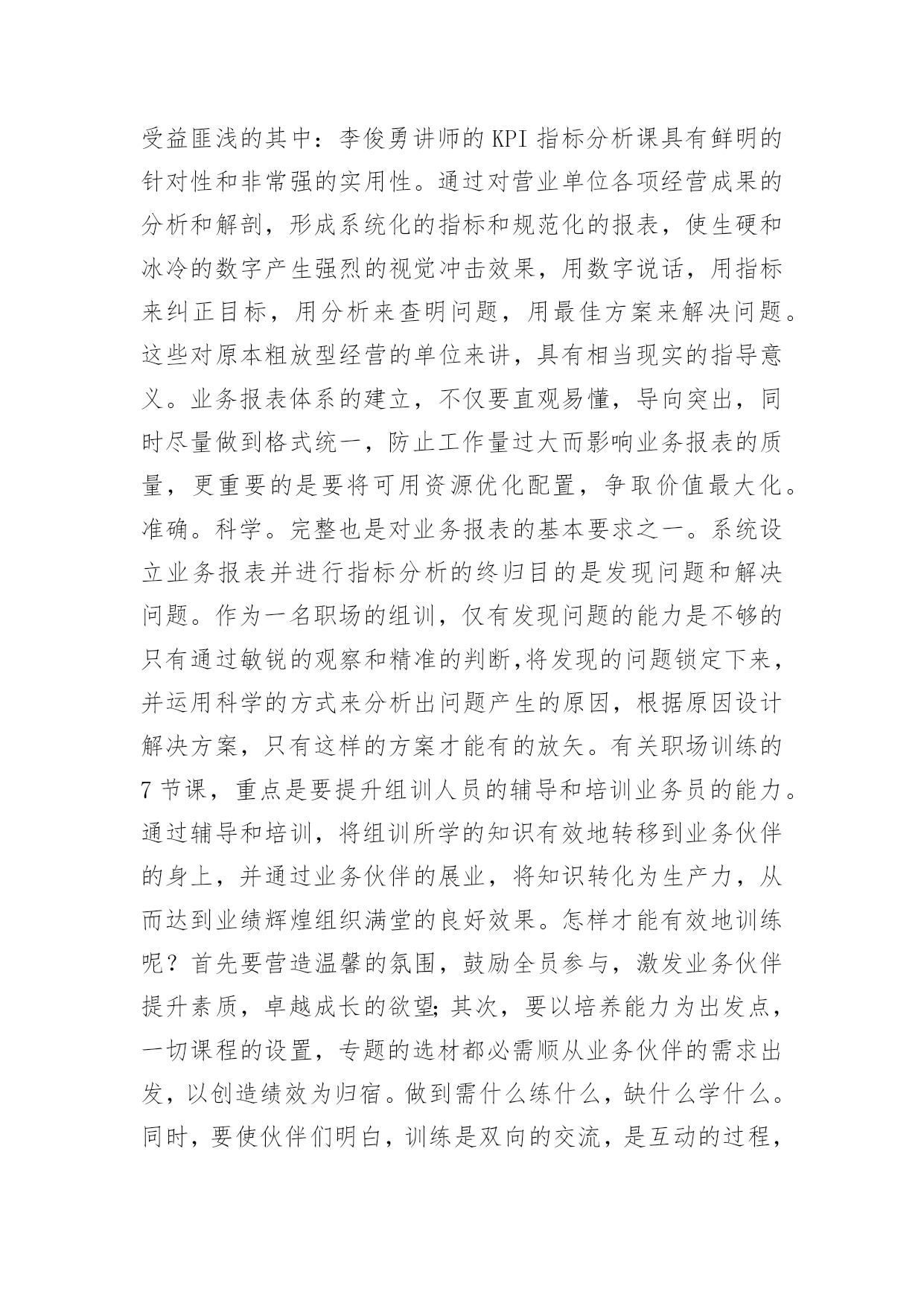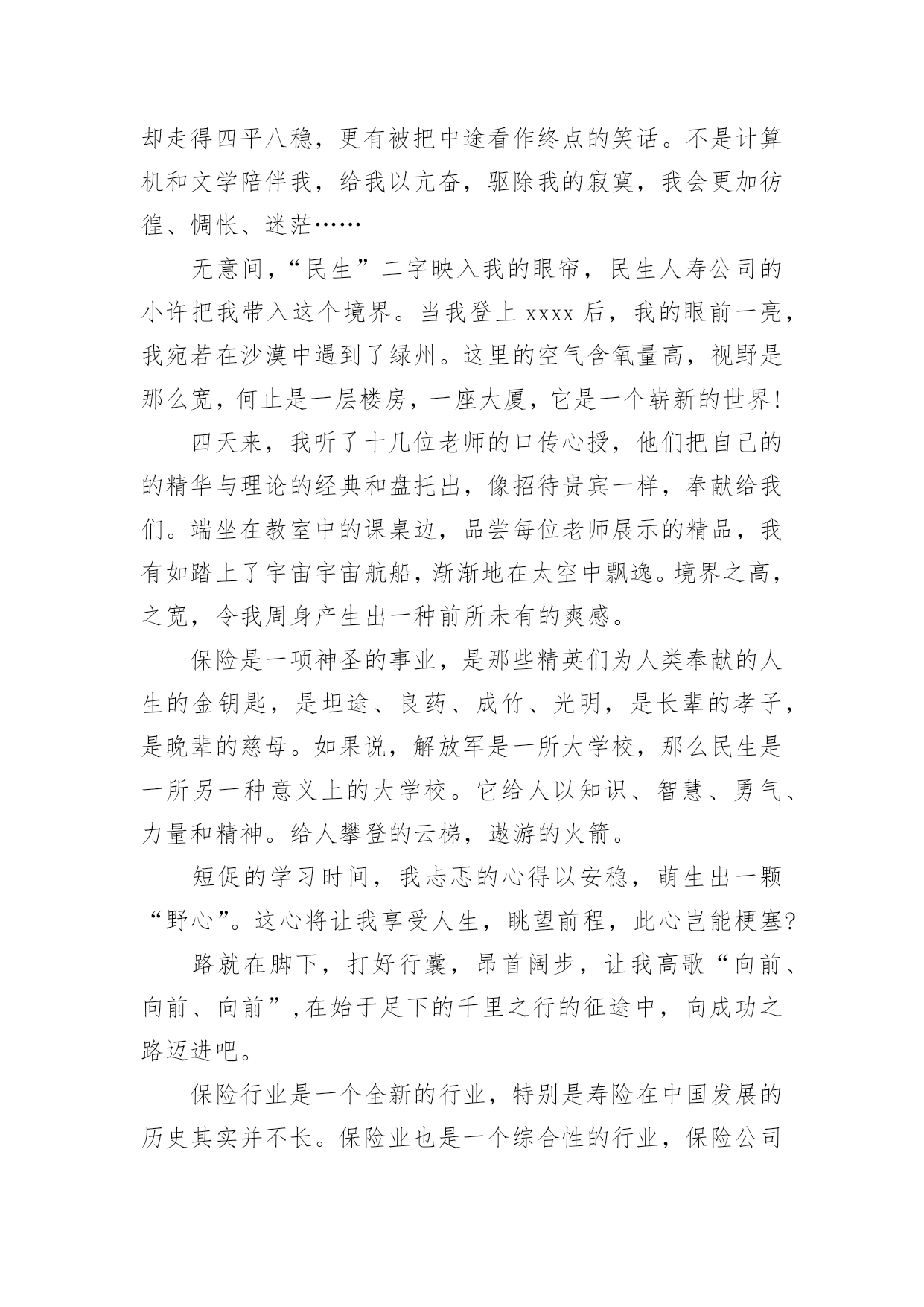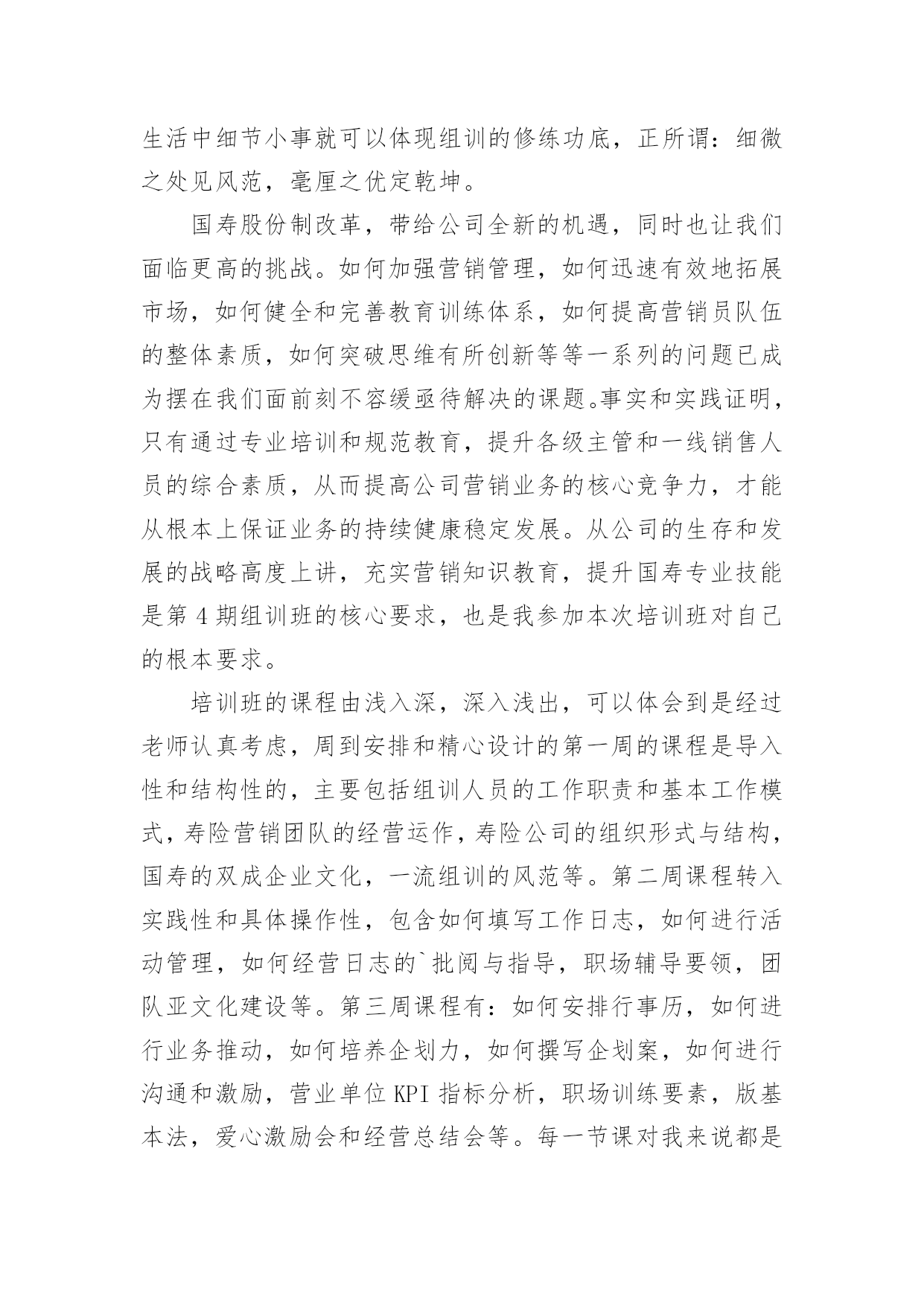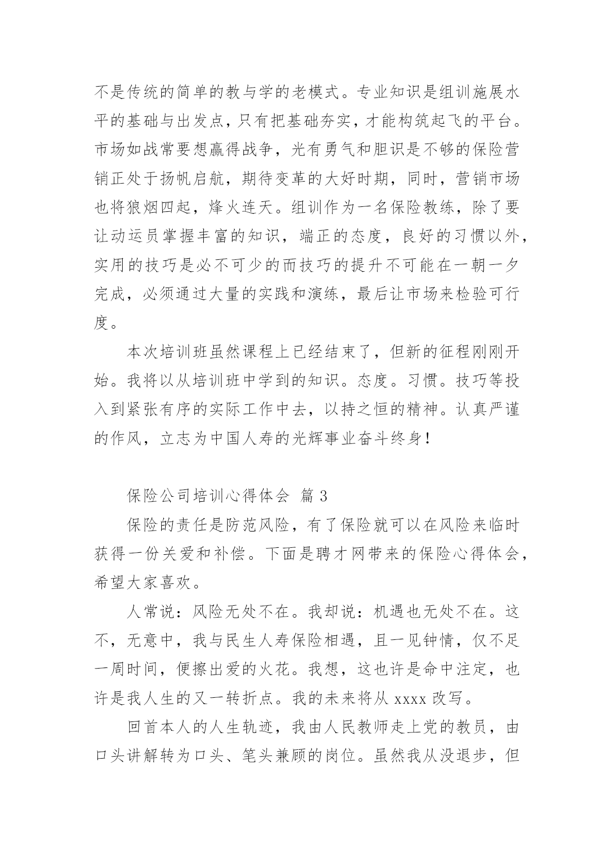 保险公司培训心得体会保险公司培训心得体会集锦13篇当我们经过反思,对生活有了新的看法时,应该马上记录下来,写一篇心得体会,这样能够让人头脑更加清醒,目标更加明确。怎样写好心得体会呢?下面是小编为大家整理的保险公司培训心得体会,欢迎阅读,希望大家能够喜欢。保险公司培训心得体会篇1怀着空杯的心态,20xx年4月16日,我有幸参加了xxxx保险股份为期两天的新人班岗前培训,回首培训过程中经历的点点滴滴,感慨颇多。第一天上午的培训,是银保的xx总和合规的xx总授课。授课中,xx总以他一贯的激情四射的风格紧紧吸引了大家。从他的讲述中,我对公司历史有了深入的了解:公司目前正处于高速开展阶段,是保险行业中第三兵团的佼佼者。他还谈到了他自己,在短短十余年时间里,怎样从一名不起眼的保险销售人员做到今天,成为生命人寿银保系统的领军人。他以自己的成长经历,鼓励在座的每一位学员。他的真诚、坦率、智慧、执着折服了现场的每一个人。激情四溢、精彩纷呈的课堂还在脑海里缭绕。转眼下午的培训又到了,xx总对目前保险行业的现状和开展趋势进行了深入的分析和讲解。从他的讲解中,我们认识到了现在保险行业的开展位置、未来的趋势以及保险销售的根本理念。正所谓:细微之处见风范,毫厘之优定乾坤。成功就是从点滴到点滴的过程。所以,良好点滴的养成对成功是至关重要的。这一点也是我在培训的第二天,xx总在讲述企业文化中让我体会到的。一个人的辉煌,决不是偶然,决不是一朝一夕的事情,而是经过岁月的千锤百炼和人生的坎坎坷坷。总比别人多付出一点,总比别人多努力一些,总比别人多学习一分,离成功总会近些再近些。“做保险就是做事业,我为成功而来,我为理想而来”。从培训班一开始我就把它当作我的`,时刻牢记在心,把端正态度作为成功与收获的起步。米卢曾说过:“态度决定一切!”只有从心里认同了学习的必要性和重要性,才能使行动变自发为自觉,才能产生良好和积极的效果。课程的第一天我认真思考这样的一个问题:在培训班过程中如何学习,想学到什么,学习后对自己有哪些期望?现在我找到了想要的答案。我觉得,首先要明确目标,树立信心,理论联系实际,严格遵守纪律。从一点一滴的小事情做起,踏踏实实朝大目标走去。一个公司请出多位日理万机的高管为新人授课,这样的时机,人生能有几回?有什么理由不去珍惜和努力呢?积极向上的态度是进步的根本保障,良好的心态本身就是一笔珍贵的财富。人要想实现自我的价值,就要有目标,并且要为之坚持不懈。罗桂友总说,“每个人要在自己的心里洒上健康的种子,不能让消极的心态生根发芽,遇上挫折、阻力也要坚持不懈,让目标积极、健康的茁壮成长。”老总们用亲身经历的事实告诉我们他们是如何自强不息的走在自己的创业路上,靠得就是这种历经千辛万苦、走遍千山万水、想遍千方百计、说尽千言万语的精神。努力找出什么是自己想要的,才能知道哪里是自己的天堂。时刻把人生的目标谨记于心,每天都要朝着目标前进。确定目标,马上行动。不要总是把今天的事情推到明天。“明日复明日,明日何其多。我生待明日,万事成蹉跎。世人假设被明日累,春去秋来老将至。”时间是平等的。没有等级之分,但它在每个人手里的价值那么是有所不同的,确定明确的目标,要有效的管理时间,让心态始终处于积极的状态。它在每个人手里的价值那么是有所不同的,确定明确的目标,要有效的管理时间,让心态始终处于积极的状态。培训也已近尾声,但在保险公司的培训给我带来的体会却是无穷无尽的,以前我一直认为做保险是最让人看不起的职业,但是培训让我摈弃了对保险的偏见。只要给予客户专业的理财效劳,提供他们真正需要的产品,那我们就一定能够得到人们的尊重。虽然培训仅仅两天,但却让我迸发出了一种对事业的激情。我不希望自己只是一个过一天算一天的人,虽然我成不了李嘉诚,但我愿意做一个有个性、有想法、有追求的年轻人!我希望在这个平台上实现我的梦想。保险公司培训心得体会篇2有意练功,无意成功。所谓成功,就是功到自然成。成功就是从不习惯到习惯的过程。所以,良好习惯的养成对成功是至关重要的一个人的辉煌,决不是偶然,决不是一朝一夕的事情,而是经过岁月的千锤百炼和人生的坎坎坷坷。专家统计,一个良好习惯的养成,至少要经过37次的反复练习才能形成,而即形成的好习惯,可以陪伴其一生,一流组训的风范,要从培养良好习惯开始。在培训班里有许多细节上的规定,比如椅子及时归位,上课手机不能携带,就餐不得喧哗,保持四周整洁卫生,着装整齐讲究,严格遵守作息时间,严格履行请假手续等,这些都充分体现了老师们的良苦用心。一支招之即来,来之能战,战之能胜的部队必然是一支习惯良好,纪律严明,作风过硬的部队。培训班全封闭的学习和训练是紧张而又愉快的,大家都以追求竞争。追求卓越。追求挑战的全新精神来投入,整合旧知识,学习新技能是目标,同时,我认为,良好习惯的培养也是