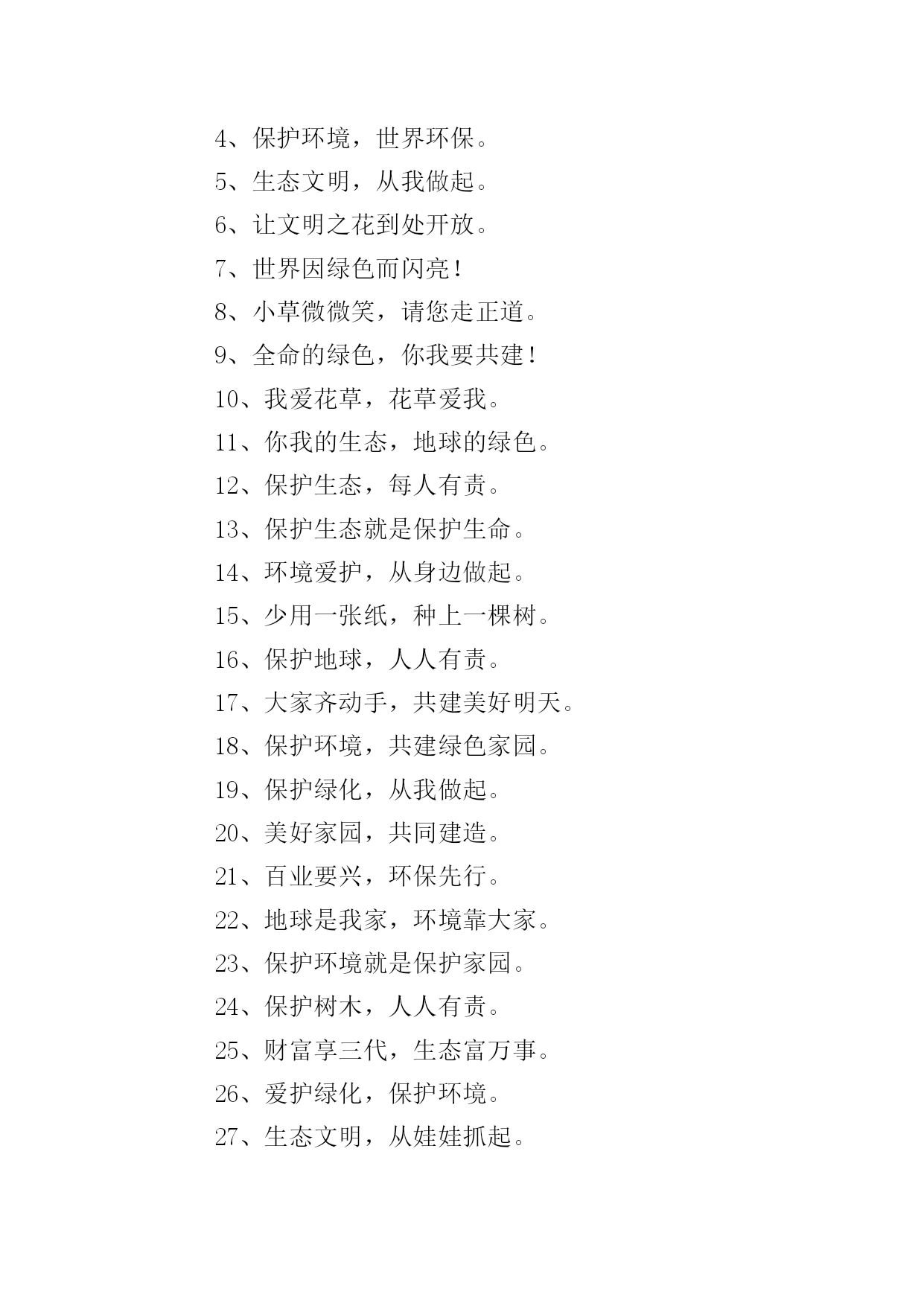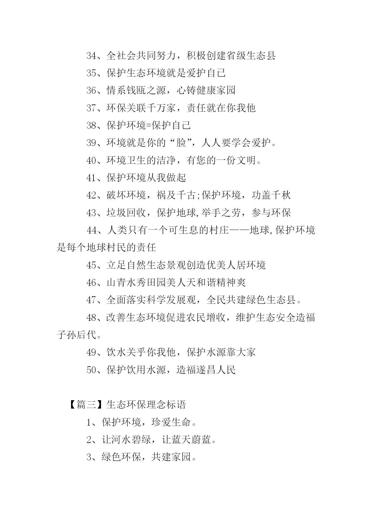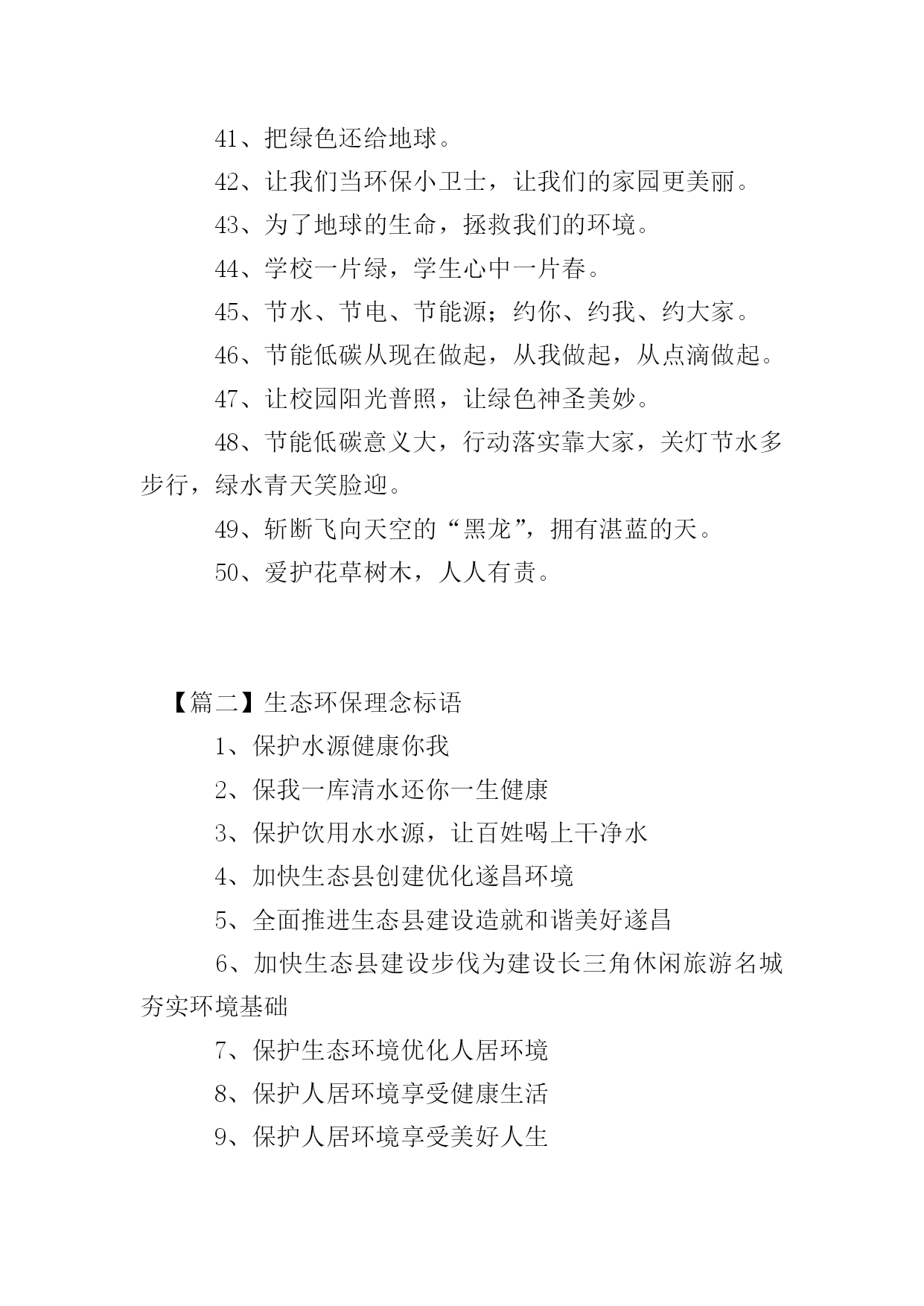 生态环保理念标语三篇【篇一】生态环保理念标语1、植树造林,功在千秋。2、小草青青,花香飘飘;青草鲜花,应当爱惜。3、人类只有好好地对待大自然,大自然才能无限地回报人类。4、赏花爱花花更美,观景惜景景更幽。5、捡起片片纸,传递深深情。6、当你不要我时,请把我送回家。7、多一声谢谢,多一个朋友,多一声抱歉,多一份宽容。8、我很怕羞,请别碰我!9、芳草依依,大家怜惜。10、追求绿色时尚,拥抱绿色生活。11、创造绿色时尚,拥抱绿色生活。12、绿色象征生命,珍惜生命,环保第一。13、人人都来爱护它,世界才会更美妙。14、编织爱心,保护环境。15、我爱花,我爱草,我爱青青小树苗。16、劝君多走几步路,莫把草坪当马路。17、明净之道,何忍污之18、不要让白色的面纱罩在我绿色的笑颜上。19、花木有情报春晖,同学爱护喜心扉。20、同花儿一起开放,和小树一起成长。21、手下留情花更艳,脚下留情草更翠。22、学校一片绿,学生心中一片春。23、小草青青,脚下留情。24、保护生态环境,就是爱护自己。25、人人参与环境保护,个个争当绿色天使。26、手上留情花自香,脚下留意草如茵。27、为了校园一片绿,珍惜脚下每棵草尽心才能干净,干净才能静心28、小草正睡觉,请你勿打扰。29、保护环境,保护自然就是保护人类自己。30、少一个脚印,多一个生命。31、踏破青毡可惜,多行数步无妨。32、创建绿色校园,从你我做起。33、今天节约一滴水,留给后人一滴血。34、保护环境,从我做起。35、节约能源,人人有责!36、大路随你走,别踩在我头。37、让花儿含笑,让草儿传情,让心儿绽放。38、绿色校园,绿色生活。39、环境好,生活就好。40、尊崇自然、敬畏生命。41、把绿色还给地球。42、让我们当环保小卫士,让我们的家园更美丽。43、为了地球的生命,拯救我们的环境。44、学校一片绿,学生心中一片春。45、节水、节电、节能源;约你、约我、约大家。46、节能低碳从现在做起,从我做起,从点滴做起。47、让校园阳光普照,让绿色神圣美妙。48、节能低碳意义大,行动落实靠大家,关灯节水多步行,绿水青天笑脸迎。49、斩断飞向天空的“黑龙”,拥有湛蓝的天。50、爱护花草树木,人人有责。【篇二】生态环保理念标语1、保护水源健康你我2、保我一库清水还你一生健康3、保护饮用水水源,让百姓喝上干净水4、加快生态县创建优化遂昌环境5、全面推进生态县建设造就和谐美好遂昌6、加快生态县建设步伐为建设长三角休闲旅游名城夯实环境基础7、保护生态环境优化人居环境8、保护人居环境享受健康生活9、保护人居环境享受美好人生10、保护生态环境共建美好遂昌11、绿色世界,你我共创;清新气息,大家共享。12、保护生态环境造就秀美山川13、争做环保使者共创生态文明14、人人参与环境保护个个争当绿色天使15、人类靠环境生存环境靠人类保护16、环境与生命共存环保与健康同在17、保护碧水蓝天营造绿色家园18、保护青山绿水蓝天共创和谐美好遂昌19、保护环境是责任爱护环境是美德20、环境关系你我他保护环境靠大家21、重视生态功在千秋保护环境造福万代22、让大气更清新让天空更蔚蓝让河山更碧绿23、创生态遂昌建美好家园24、共创生态遂昌同享碧水蓝天25、保护生态环境,发展生态经济,倡导生态文明。26、积极行动起来积极创建省级生态县27、创建省级生态县建设和谐好遂昌28、人与自然和谐相处,经济社会协调发展。29、增强环保意识,扮靓遂昌城乡30、手拉手保护环境,心连心关爱遂昌31、全心全意保护生态环境,同心同德创建清洁乡村32、环山环水环风景,保洁保绿保健康33、从我做起,保护环境,建设美好家园34、全社会共同努力,积极创建省级生态县35、保护生态环境就是爱护自已36、情系钱瓯之源,心铸健康家园37、环保关联千万家,责任就在你我他38、保护环境=保护自己39、环境就是你的“脸”,人人要学会爱护。40、环境卫生的洁净,有您的一份文明。41、保护环境从我做起42、破坏环境,祸及千古;保护环境,功盖千秋43、垃圾回收,保护地球,举手之劳,参与环保44、人类只有一个可生息的村庄——地球,保护环境是每个地球村民的责任45、立足自然生态景观创造优美人居环境46、山青水秀田园美人天和谐精神爽47、全面落实科学发展观,全民共建绿色生态县。48、改善生