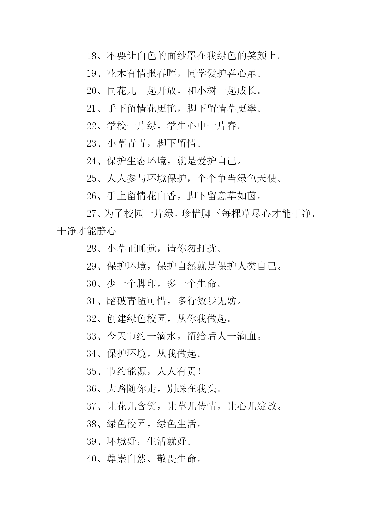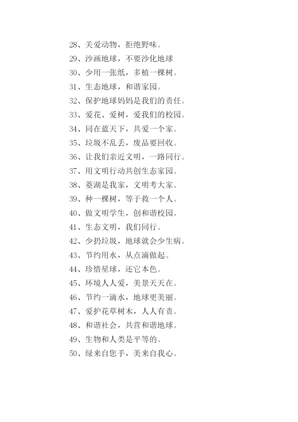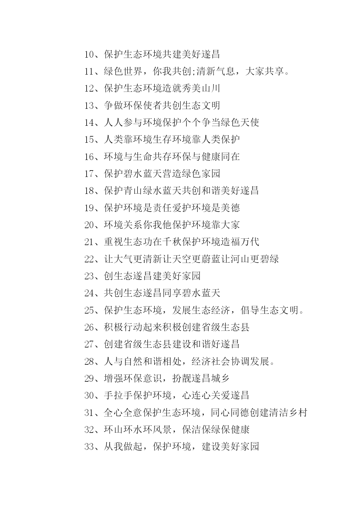 生态环保理念标语三篇【篇一】生态环保理念标语1、植树造林,功在千秋。2、小草青青,花香飘飘;青草鲜花,应当爱惜。3、人类只有好好地对待大自然,大自然才能无限地回报人类。4、赏花爱花花更美,观景惜景景更幽。5、捡起片片纸,传递深深情。6、当你不要我时,请把我送回家。7、多一声谢谢,多一个朋友,多一声抱歉,多一份宽容。8、我很怕羞,请别碰我!9、芳草依依,大家怜惜。10、追求绿色时尚,拥抱绿色生活。11、创造绿色时尚,拥抱绿色生活。12、绿色象征生命,珍惜生命,环保第一。13、人人都来爱护它,世界才会更美妙。14、编织爱心,保护环境。15、我爱花,我爱草,我爱青青小树苗。16、劝君多走几步路,莫把草坪当马路。17、明净之道,何忍污之18、不要让白色的面纱罩在我绿色的笑颜上。19、花木有情报春晖,同学爱护喜心扉。20、同花儿一起开放,和小树一起成长。21、手下留情花更艳,脚下留情草更翠。22、学校一片绿,学生心中一片春。23、小草青青,脚下留情。24、保护生态环境,就是爱护自己。25、人人参与环境保护,个个争当绿色天使。26、手上留情花自香,脚下留意草如茵。27、为了校园一片绿,珍惜脚下每棵草尽心才能干净,干净才能静心28、小草正睡觉,请你勿打扰。29、保护环境,保护自然就是保护人类自己。30、少一个脚印,多一个生命。31、踏破青毡可惜,多行数步无妨。32、创建绿色校园,从你我做起。33、今天节约一滴水,留给后人一滴血。34、保护环境,从我做起。35、节约能源,人人有责!36、大路随你走,别踩在我头。37、让花儿含笑,让草儿传情,让心儿绽放。38、绿色校园,绿色生活。39、环境好,生活就好。40、尊崇自然、敬畏生命。41、把绿色还给地球。42、让我们当环保小卫士,让我们的家园更美丽。43、为了地球的生命,拯救我们的环境。44、学校一片绿,学生心中一片春。45、节水、节电、节能源;约你、约我、约大家。46、节能低碳从现在做起,从我做起,从点滴做起。47、让校园阳光普照,让绿色神圣美妙。48、节能低碳意义大,行动落实靠大家,关灯节水多步行,绿水青天笑脸迎。49、斩断飞向天空的“黑龙”,拥有湛蓝的天。50、爱护花草树木,人人有责。【篇二】生态环保理念标语1、保护水源健康你我2、保我一库清水还你一生健康3、保护饮用水水源,让百姓喝上干净水4、加快生态县创建优化遂昌环境5、全面推进生态县建设造就和谐美好遂昌6、加快生态县建设步伐为建设长三角休闲旅游名城夯实环境基础7、保护生态环境优化人居环境8、保护人居环境享受健康生活9、保护人居环境享受美好人生10、保护生态环境共建美好遂昌11、绿色世界,你我共创;清新气息,大家共享。12、保护生态环境造就秀美山川13、争做环保使者共创生态文明14、人人参与环境保护个个争当绿色天使15、人类靠环境生存环境靠人类保护16、环境与生命共存环保与健康同在17、保护碧水蓝天营造绿色家园18、保护青山绿水蓝天共创和谐美好遂昌19、保护环境是责任爱护环境是美德20、环境关系你我他保护环境靠大家21、重视生态功在千秋保护环境造福万代22、让大气更清新让天空更蔚蓝让河山更碧绿23、创生态遂昌建美好家园24、共创生态遂昌同享碧水蓝天25、保护生态环境,发展生态经济,倡导生态文明。26、积极行动起来积极创建省级生态县27、创建省级生态县建设和谐好遂昌28、人与自然和谐相处,经济社会协调发展。29、增强环保意识,扮靓遂昌城乡30、手拉手保护环境,心连心关爱遂昌31、全心全意保护生态环境,同心同德创建清洁乡村32、环山环水环风景,保洁保绿保健康33、从我做起,保护环境,建设美好家园34、全社会共同努力,积极创建省级生态县35、保护生态环境就是爱护自已36、情系钱瓯之源,心铸健康家园37、环保关联千万家,责任就在你我他38、保护环境=保护自己39、环境就是你的“脸”,人人要学会爱护。40、环境卫生的洁净,有您的一份文明。41、保护环境从我做起42、破坏环境,祸及千古;保护环境,功盖千秋43、垃圾回收,保护地球,举手之劳,参与环保44、人类只有一个可生息的村庄——地球,保护环境是每个地球村民的责任45、立足自然生态景观创造优美人居环境46、山青水秀田园美人天和谐精神爽47、全面落实科学发展观,全民共建绿色生态县。48、改善生