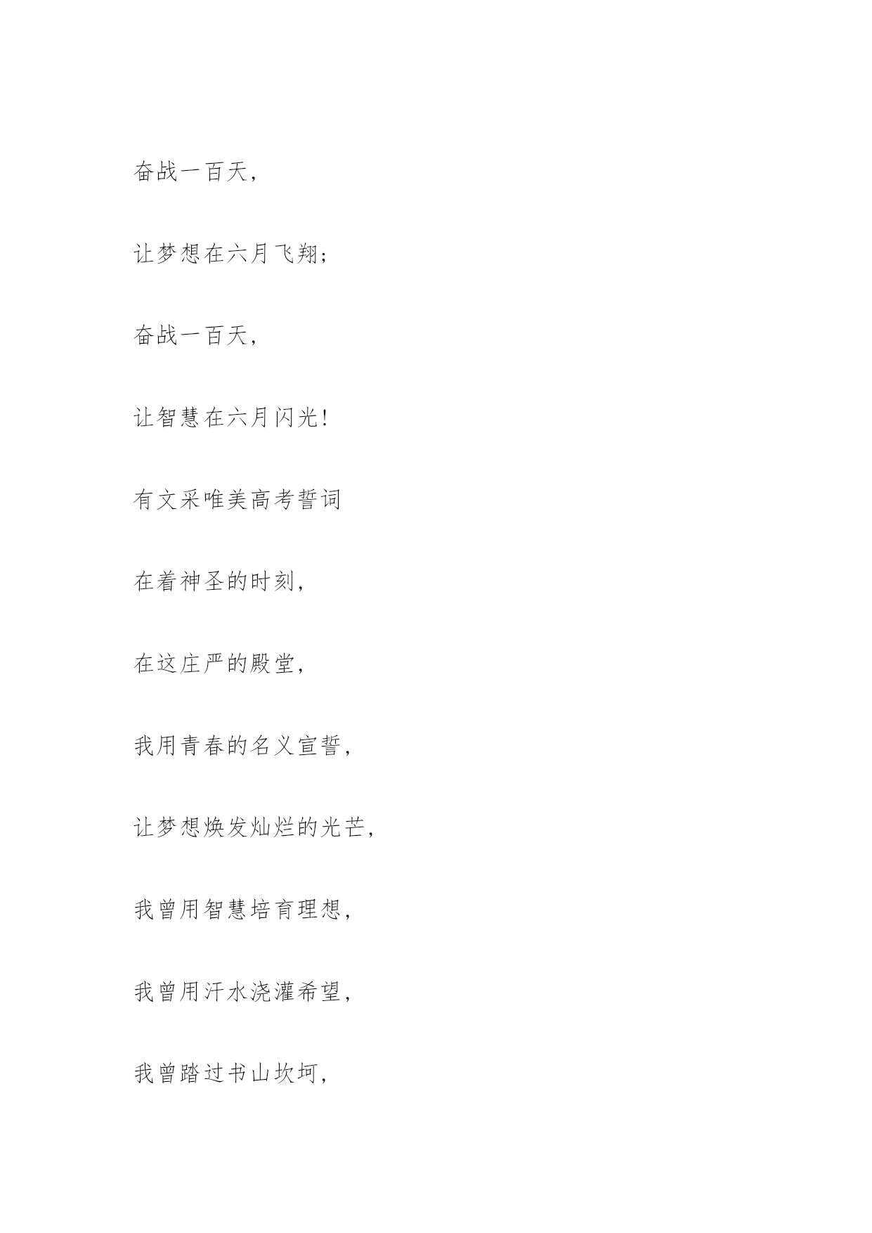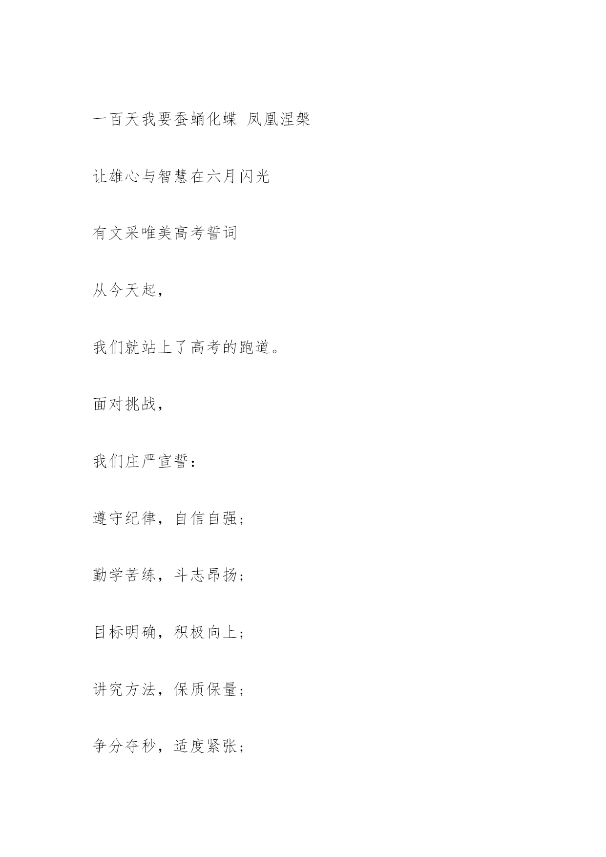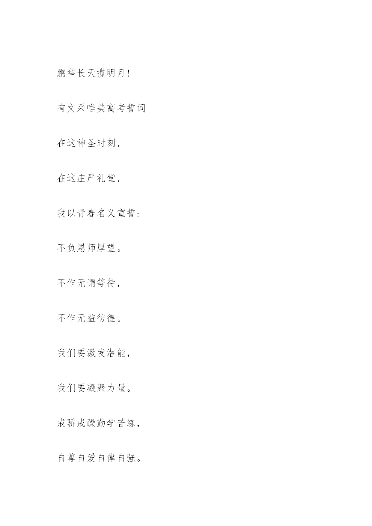 有文采唯美高考誓词有文采唯美高考誓词有文采唯美高考誓词挑战人生是我不懈的追求决胜高考是我坚定的选择拼搏百日是我今天的承诺决不退缩决不彷徨决不浮躁决不张狂踏过书山坎坷渡过学海茫茫一百天我将唱出青春无悔一百天我将笑吟十年梦想一百天我将改变人生方向一百天我要蚕蛹化蝶凤凰涅槃让雄心与智慧在六月闪光有文采唯美高考誓词从今天起,我们就站上了高考的跑道。面对挑战,我们庄严宣誓:遵守纪律,自信自强;勤学苦练,斗志昂扬;目标明确,积极向上;讲究方法,保质保量;争分夺秒,适度紧张;调节身心,全面成长。挑战人生,是我坚定的信念;决胜高考,是我现实的梦想。珍惜每一天,让雄心和智慧在六月里绽放光芒;拼搏每一天,让父母和恩师在六月里分享辉煌。让六月的鲜花为我们开放!备战高考“百日誓师大会”有文采唯美高考誓词十年磨砺,立志凌绝顶;百日竞渡,破浪展雄风。让我们决胜高考!我们有——坚韧强健的体魄,不屈不挠的意志,蟾宫折桂的`信念,拼搏进取的干劲。我们一定会——自尊自爱,自律自强;戒骄戒躁,勤学苦练。相信我们吧!我们一定能够——乘风破浪济沧海,鹏举长天揽明月!有文采唯美高考誓词在这神圣时刻,在这庄严礼堂,我以青春名义宣誓:不负恩师厚望。不作无谓等待,不作无益彷徨。我们要激发潜能,我们要凝聚力量。戒骄戒躁勤学苦练,自尊自爱自律自强。奋战一百天,让梦想在六月飞翔;奋战一百天,让智慧在六月闪光!有文采唯美高考誓词在着神圣的时刻,在这庄严的殿堂,我用青春的名义宣誓,让梦想焕发灿烂的光芒,我曾用智慧培育理想,我曾用汗水浇灌希望,我曾踏过书山坎坷,我曾渡过学海茫茫,我没有失败的理由,我走过的每一步,都是成功的保障,我发誓:不负父母的期盼,不负恩师的厚望,不负天赐的智慧,不负青春的理想,我承诺:不作懦弱的退缩,不作无谓的彷徨,我将带着从容的微笑,去赢得我志在必得的辉煌,十二年的拼搏一朝圆梦,捷报飞传.名题金榜.让飞翔的梦在六月展开翅膀,让雄心与智慧在六月闪光.
