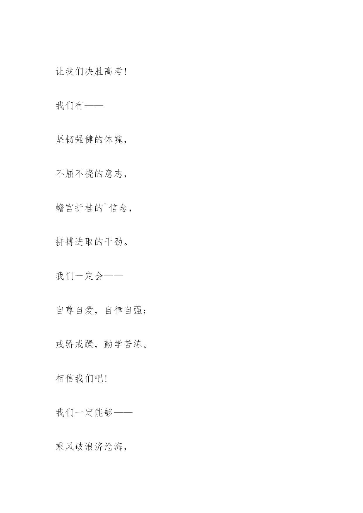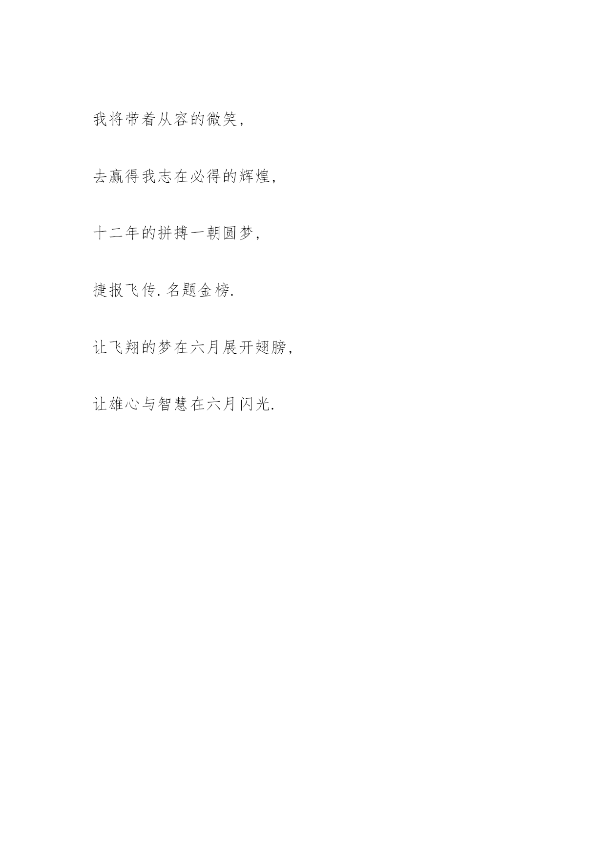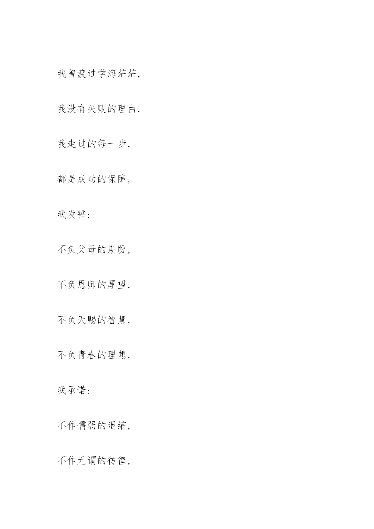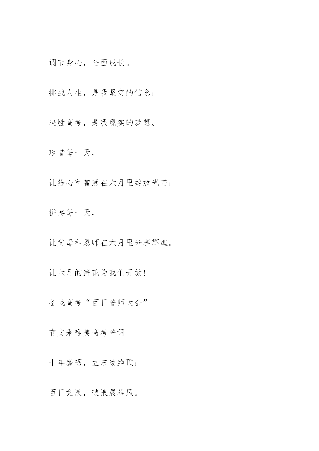 有文采唯美高考誓词有文采唯美高考誓词有文采唯美高考誓词挑战人生是我不懈的追求决胜高考是我坚定的选择拼搏百日是我今天的承诺决不退缩决不彷徨决不浮躁决不张狂踏过书山坎坷渡过学海茫茫一百天我将唱出青春无悔一百天我将笑吟十年梦想一百天我将改变人生方向一百天我要蚕蛹化蝶凤凰涅槃让雄心与智慧在六月闪光有文采唯美高考誓词从今天起,我们就站上了高考的跑道。面对挑战,我们庄严宣誓:遵守纪律,自信自强;勤学苦练,斗志昂扬;目标明确,积极向上;讲究方法,保质保量;争分夺秒,适度紧张;调节身心,全面成长。挑战人生,是我坚定的信念;决胜高考,是我现实的梦想。珍惜每一天,让雄心和智慧在六月里绽放光芒;拼搏每一天,让父母和恩师在六月里分享辉煌。让六月的鲜花为我们开放!备战高考“百日誓师大会”有文采唯美高考誓词十年磨砺,立志凌绝顶;百日竞渡,破浪展雄风。让我们决胜高考!我们有——坚韧强健的体魄,不屈不挠的意志,蟾宫折桂的`信念,拼搏进取的干劲。我们一定会——自尊自爱,自律自强;戒骄戒躁,勤学苦练。相信我们吧!我们一定能够——乘风破浪济沧海,鹏举长天揽明月!有文采唯美高考誓词在这神圣时刻,在这庄严礼堂,我以青春名义宣誓:不负恩师厚望。不作无谓等待,不作无益彷徨。我们要激发潜能,我们要凝聚力量。戒骄戒躁勤学苦练,自尊自爱自律自强。奋战一百天,让梦想在六月飞翔;奋战一百天,让智慧在六月闪光!有文采唯美高考誓词在着神圣的时刻,在这庄严的殿堂,我用青春的名义宣誓,让梦想焕发灿烂的光芒,我曾用智慧培育理想,我曾用汗水浇灌希望,我曾踏过书山坎坷,我曾渡过学海茫茫,我没有失败的理由,我走过的每一步,都是成功的保障,我发誓:不负父母的期盼,不负恩师的厚望,不负天赐的智慧,不负青春的理想,我承诺:不作懦弱的退缩,不作无谓的彷徨,我将带着从容的微笑,去赢得我志在必得的辉煌,十二年的拼搏一朝圆梦,捷报飞传.名题金榜.让飞翔的梦在六月展开翅膀,让雄心与智慧在六月闪光.