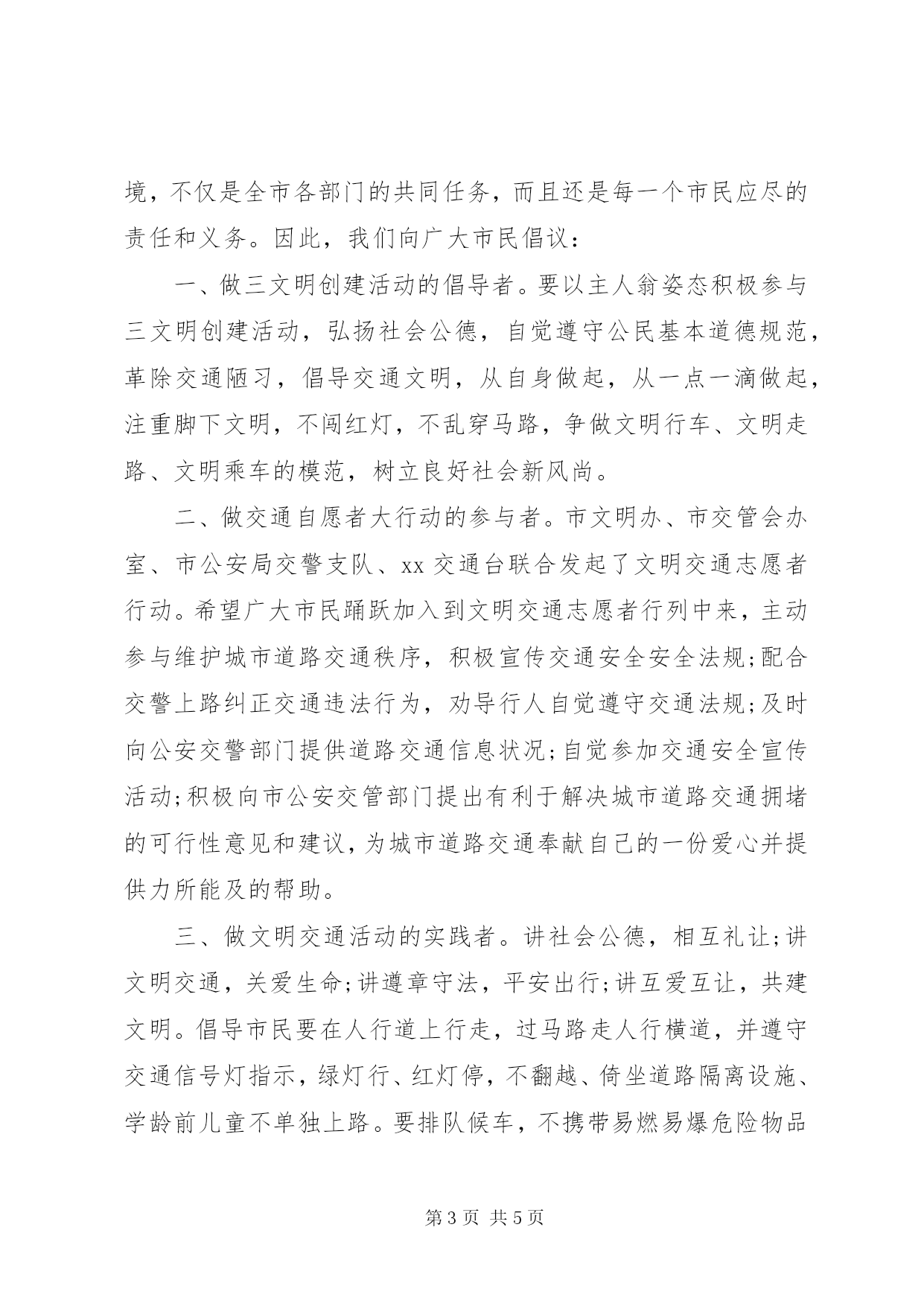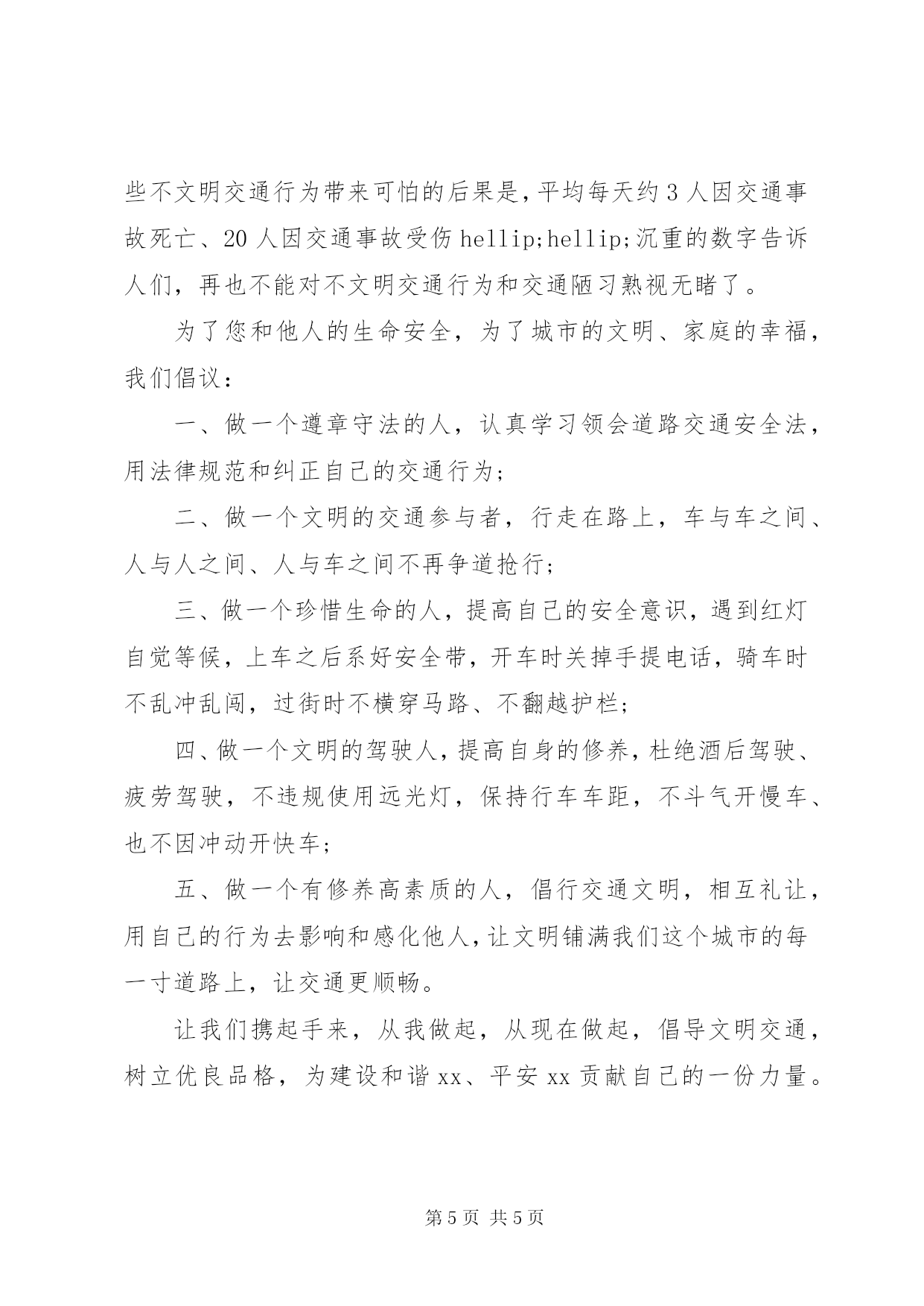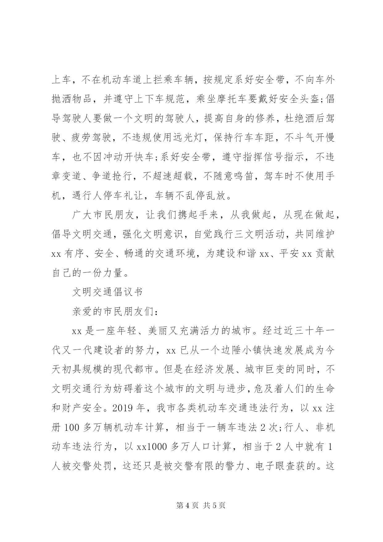 第PAGE\*Arabic\*MERGEFORMAT5页共NUMPAGES\*MERGEFORMAT5页文明出行绿色交通倡议书广大市民朋友们:城市交通与我们每个人息息相关,交通安全通畅需要你我共同参与。为解决主XX县区交通拥堵问题,减少机动车污染排放,扎实推进文明出行,绿色交通主题活动,进一步提升城市形象与市民生活品质,我们倡议:一、改变陋习,文明出行。自觉养成按灯停走、按道行驶、按线通行、按位停放、按章驾乘、按规处罚的交通习惯,改变中国式过马路的交通陋习,不在机动车道上候车,不在十字路口打的,不跨越隔离设施过街。二、倡导新风,绿色低碳。有车族树立能走不骑,能骑不坐,能坐不开的出行理念,每周少开一天车,积极参与交通lsquo;135rsquo;行动,即1公里内步行、3公里内骑自行车、5公里内乘坐公共交通。三、传播文明,示范引领。积极参与文明交通宣传劝导活动,提醒亲友远离闯红灯、酒驾、违停、超速、违法使用公交专用车道、路口违法穿插和行人过路口不走人行横道等不良违法行为,关爱自己和他人的生命,做文明交通的倡导者、实践者和守护者。文明是一种习惯,也是一种力量,从我做起,告别交通陋习,争做文明有礼市民。我们深信,治堵工作有了您的支持和参与,xx交通一定更畅通、更有序、更安全、更文明。交通文明倡议书广大市民朋友们:xx是一座美丽而充满活力的海滨城市,是世界驰名的浪漫之都,是全国首批文明城市。在今年全国15个副省级城市公共文明指数调查中,xx作为文明城市的各项指数又一次名列前茅,作为xx市民,我们应该感到骄傲和自豪。城市文明是一个公共的道德范畴,需要我们全体市民共同遵守和把持,需要每一个公民自觉履行从我做起。然而,我们可以清醒地看到,近年来,交通出行文明仍然存在着诸多不尽人意的地方,主要表现在:机动车不按线行驶,争道抢行,逆向行驶;闯红灯、双黄线调头;公共场所机动车随意停放,占用机动车道;接送学生上下学车辆长时间等候占用机动车道;轻微交通事故得不到自行解决长时间占用机动车道,造成交通堵塞;出租汽车争道抢行现象突出;大型货运车辆占用快车道行驶;行人不走人行横道和过街设施,横穿斜穿马路现象比较突出;机动车行驶人行横道不能减速慢行,礼让行人,造成过街行人恐慌等等。这些不文明现象成为造成城市道路交通拥堵的主观因素,与我们这座文明城市显得极不协调。交通是我们生活中不可缺少的一部分,交通文明是城市文明极为重要的组成部分,交通文明的程度不仅能反映出一个城市的文明程度,更能折射出广大市民的文明素质。共建文明的交通环境,不仅是全市各部门的共同任务,而且还是每一个市民应尽的责任和义务。因此,我们向广大市民倡议:一、做三文明创建活动的倡导者。要以主人翁姿态积极参与三文明创建活动,弘扬社会公德,自觉遵守公民基本道德规范,革除交通陋习,倡导交通文明,从自身做起,从一点一滴做起,注重脚下文明,不闯红灯,不乱穿马路,争做文明行车、文明走路、文明乘车的模范,树立良好社会新风尚。二、做交通自愿者大行动的参与者。市文明办、市交管会办室、市公安局交警支队、xx交通台联合发起了文明交通志愿者行动。希望广大市民踊跃加入到文明交通志愿者行列中来,主动参与维护城市道路交通秩序,积极宣传交通安全安全法规;配合交警上路纠正交通违法行为,劝导行人自觉遵守交通法规;及时向公安交警部门提供道路交通信息状况;自觉参加交通安全宣传活动;积极向市公安交管部门提出有利于解决城市道路交通拥堵的可行性意见和建议,为城市道路交通奉献自己的一份爱心并提供力所能及的帮助。三、做文明交通活动的实践者。讲社会公德,相互礼让;讲文明交通,关爱生命;讲遵章守法,平安出行;讲互爱互让,共建文明。倡导市民要在人行道上行走,过马路走人行横道,并遵守交通信号灯指示,绿灯行、红灯停,不翻越、倚坐道路隔离设施、学龄前儿童不单独上路。要排队候车,不携带易燃易爆危险物品上车,不在机动车道上拦乘车辆,按规定系好安全带,不向车外抛洒物品,并遵守上下车规范,乘坐摩托车要戴好安全头盔;倡导驾驶人要做一个文明的驾驶人,提高自身的修养,杜绝酒后驾驶、疲劳驾驶,不违规使用远光灯,保持行车车距,不斗气开慢车,也不因冲动开快车;系好安全带,遵守指挥信号指示,不违章变道、争道抢行,不超速超载,不随意鸣笛,驾车时不使用手机,遇行人停车礼让,车辆不乱停乱放。广大市民朋友,让我们携起手来,从我做起,从现在做起,倡导文明交通,强化文明意识,自觉践行三文明活动,共同维护xx有序、安全、畅通的交通环境,为建设和谐xx、平安xx贡献自己的一份力量。文明交通倡议书亲爱的市民朋友们:xx是一座年轻、美丽又充满活力的城市。经过近三十年一代又一代建设者的努力,xx已从一个边陲小镇快速发展成为今天初具规模的现代都市。但是在经济发展、城市巨变的同时,不文