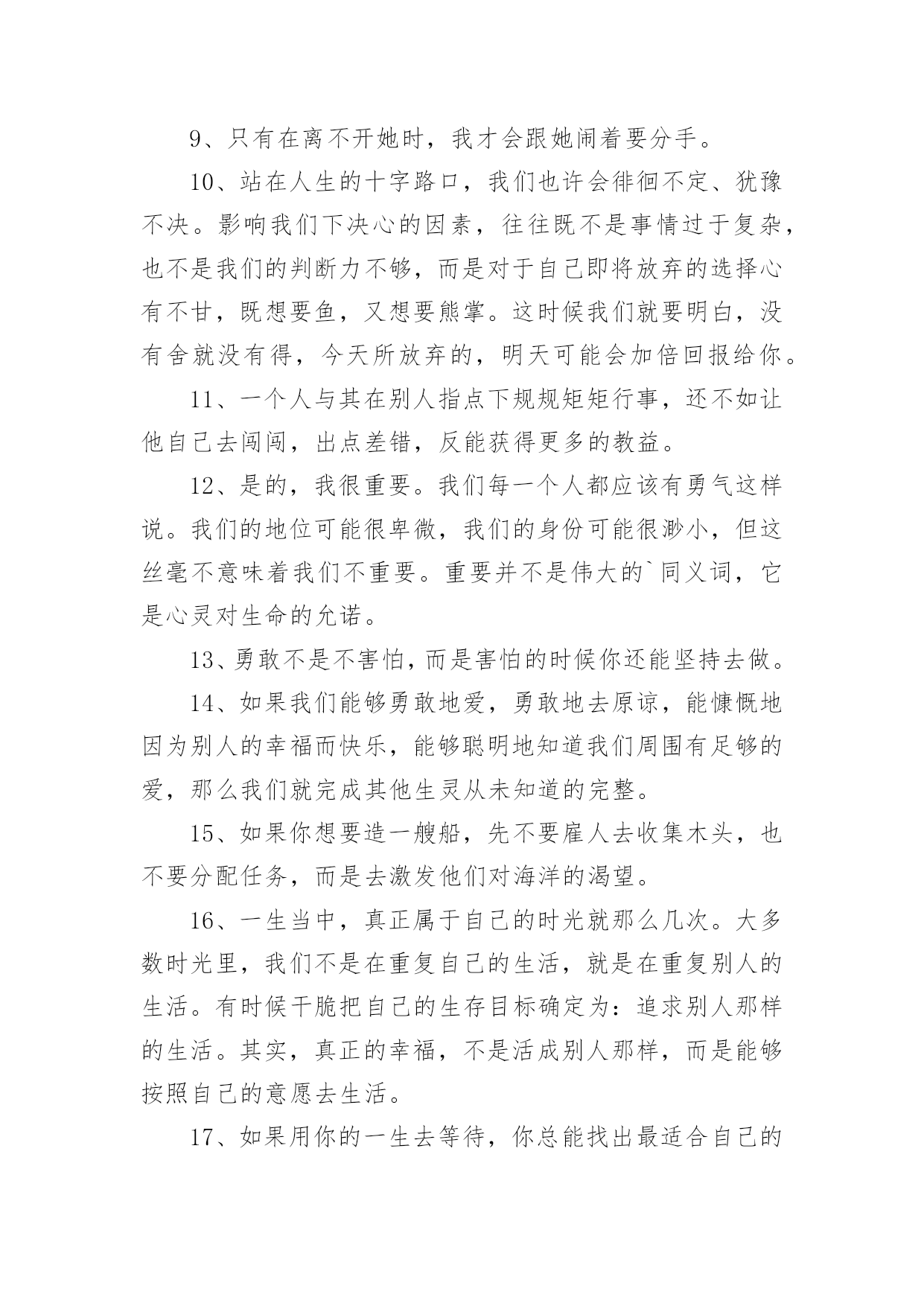 感悟生活的经典句子摘抄感悟生活的经典句子摘抄1、运气就是,机会碰巧撞到了你的努力。2、幸福就是只要牵对了手,就算失去了方向感,也不会害怕。3、在有生的瞬间能遇到你,竟花光所有力气。在这日才发现,曾呼吸过空气。4、含笑饮毒酒,也得为一个值得的人。他值得的话,那壶酒虽然很烈很苦,喝下去却也是甜的。5、当你仍想继续,永远不要说再见;当你还能承受,永远不要说放弃;当你舍不得一个人,永远永远不要说你不再爱他。6、有些爱,由心动开始。有些爱,由冲动开始。偌大的都市里,那些分不清心动还是冲动的情事,夜夜都在寂寞中发酵。如果那一夜,是情,不妨把爱留下。如果那一夜,只是欲,那请顺便把回忆也带走。7、找不到对的人,其实很可能是,改不掉错的自己。8、一生中,总有一个人,老是跟你过不去,说你不够勤快,比不上别人温柔,批评你乱花钱,嫌你不会打扮,你简直一无是处。可就是这个人,用他的勤劳滋养着你的惰性,用他的坚强呵护着你的浪漫,用他的所有填补着你的欲望,用他的忠贞护卫着你的美丽。于是,你慢慢不在意他说什么,而是坚定地跟他过下去。9、只有在离不开她时,我才会跟她闹着要分手。10、站在人生的十字路口,我们也许会徘徊不定、犹豫不决。影响我们下决心的因素,往往既不是事情过于复杂,也不是我们的判断力不够,而是对于自己即将放弃的选择心有不甘,既想要鱼,又想要熊掌。这时候我们就要明白,没有舍就没有得,今天所放弃的,明天可能会加倍回报给你。11、一个人与其在别人指点下规规矩矩行事,还不如让他自己去闯闯,出点差错,反能获得更多的教益。12、是的,我很重要。我们每一个人都应该有勇气这样说。我们的地位可能很卑微,我们的身份可能很渺小,但这丝毫不意味着我们不重要。重要并不是伟大的`同义词,它是心灵对生命的允诺。13、勇敢不是不害怕,而是害怕的时候你还能坚持去做。14、如果我们能够勇敢地爱,勇敢地去原谅,能慷慨地因为别人的幸福而快乐,能够聪明地知道我们周围有足够的爱,那么我们就完成其他生灵从未知道的完整。15、如果你想要造一艘船,先不要雇人去收集木头,也不要分配任务,而是去激发他们对海洋的渴望。16、一生当中,真正属于自己的时光就那么几次。大多数时光里,我们不是在重复自己的生活,就是在重复别人的生活。有时候干脆把自己的生存目标确定为:追求别人那样的生活。其实,真正的幸福,不是活成别人那样,而是能够按照自己的意愿去生活。17、如果用你的一生去等待,你总能找出最适合自己的那个人。但是你能用一生去等待吗?既然不能,就珍惜手里的麦穗吧。18、约翰·列侬:老师问我长大想做什么,我说“快乐的人”。老师说我不懂问题。我告诉老师,是他不懂人生。19、郑钧《溺爱》:只有你的未来,才能挥霍我的现在;只有我的最爱,给我最致命的伤害。20、谁,执我之手,消我半世孤独;谁,扶我之肩,驱我一世沉寂。