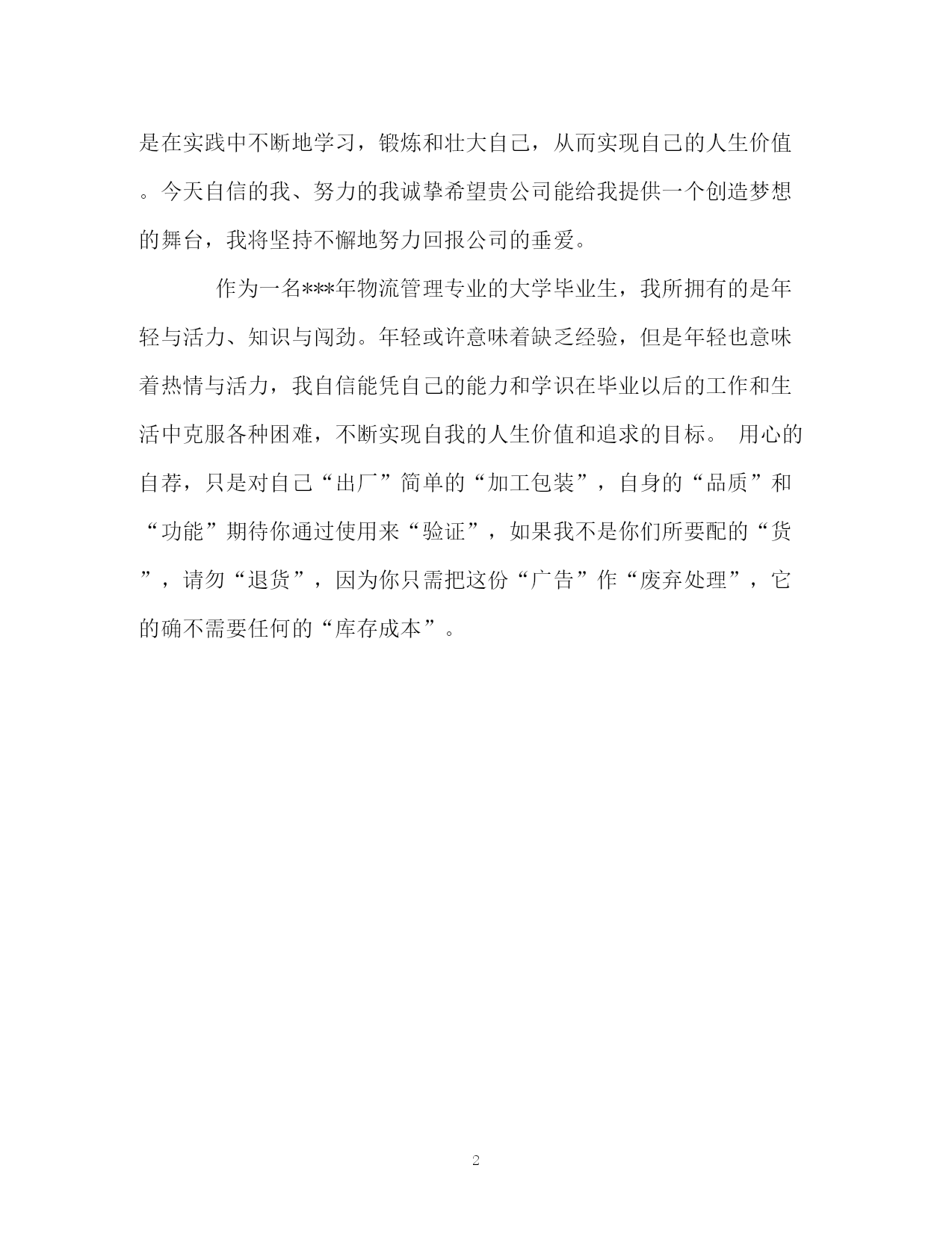 此资料由网络收集而来,如有侵权请告知上传者立即删除。资料共分享,我们负责传递知识。PAGEPAGE2物流管理专业应届生的自我介绍物流管理专业应届生的自我介绍给大家整理一份关于物流管理专业的应届生的自我介绍范文,欢迎广大毕业生浏览一下。我叫***是**技术师范学院物流管理专业应届毕业生,我乐观开朗、积极向上、交际和语言表达能力较强。三年的大学期间,我在不断的学习和实践中提高了自己的综合素质,已把自己塑造成为一个专业功底扎实、知识结构完善、适应能力强、富于协作精神的时代青年。在校期间于**年通过专业培训和国家正规机关考核后获得中国劳动和社会保障部颁发的助理物流师职业资格从业证书。毕业之际,我迫切希望能找到一份适合自己的’工作。把在校学到的理论知识和自己潜隐的创造力赋之于实践,最重要的是在实践中不断地学习,锻炼和壮大自己,从而实现自己的人生价值。今天自信的我、努力的我诚挚希望贵公司能给我提供一个创造梦想的舞台,我将坚持不懈地努力回报公司的垂爱。作为一名***年物流管理专业的大学毕业生,我所拥有的是年轻与活力、知识与闯劲。年轻或许意味着缺乏经验,但是年轻也意味着热情与活力,我自信能凭自己的能力和学识在毕业以后的工作和生活中克服各种困难,不断实现自我的人生价值和追求的目标。用心的自荐,只是对自己“出厂”简单的“加工包装”,自身的“品质”和“功能”期待你通过使用来“验证”,如果我不是你们所要配的“货”,请勿“退货”,因为你只需把这份“广告”作“废弃处理”,它的确不需要任何的“库存成本”。