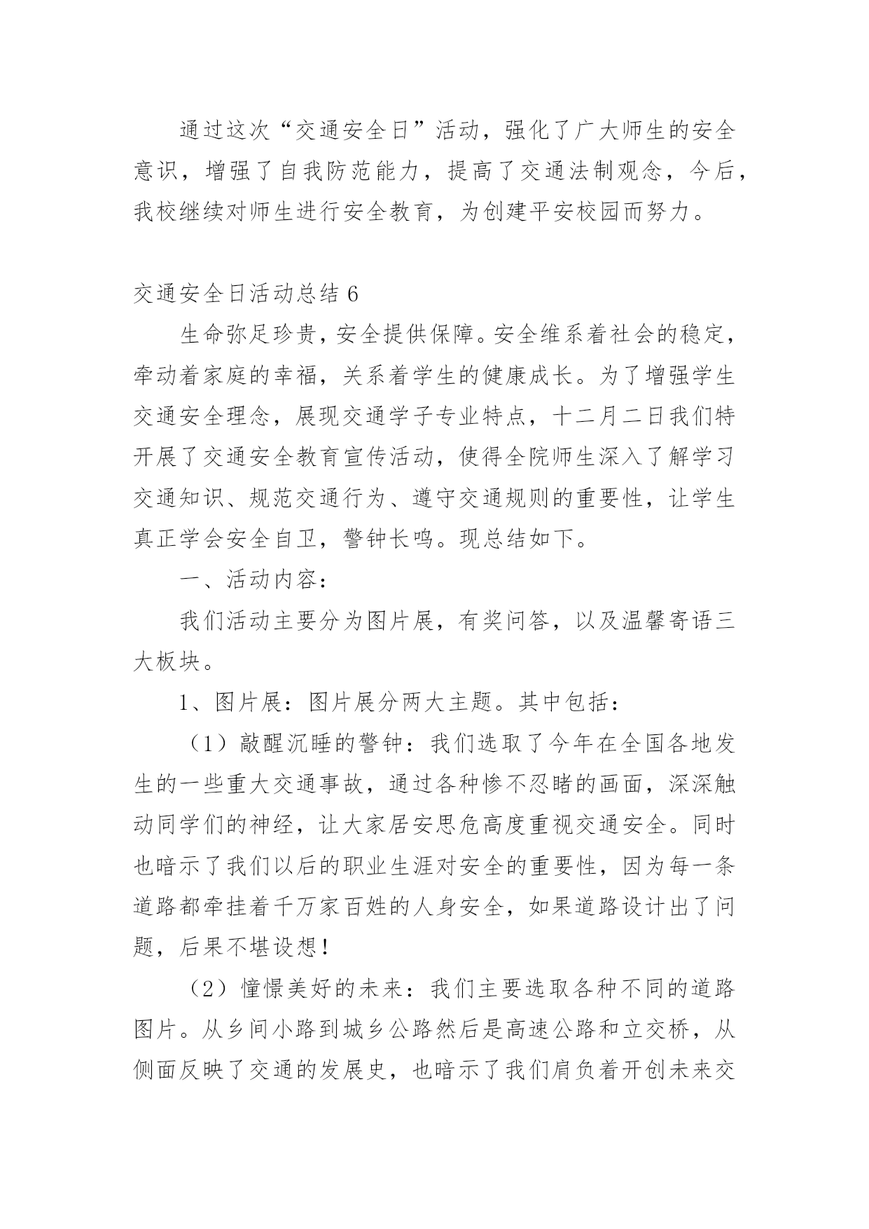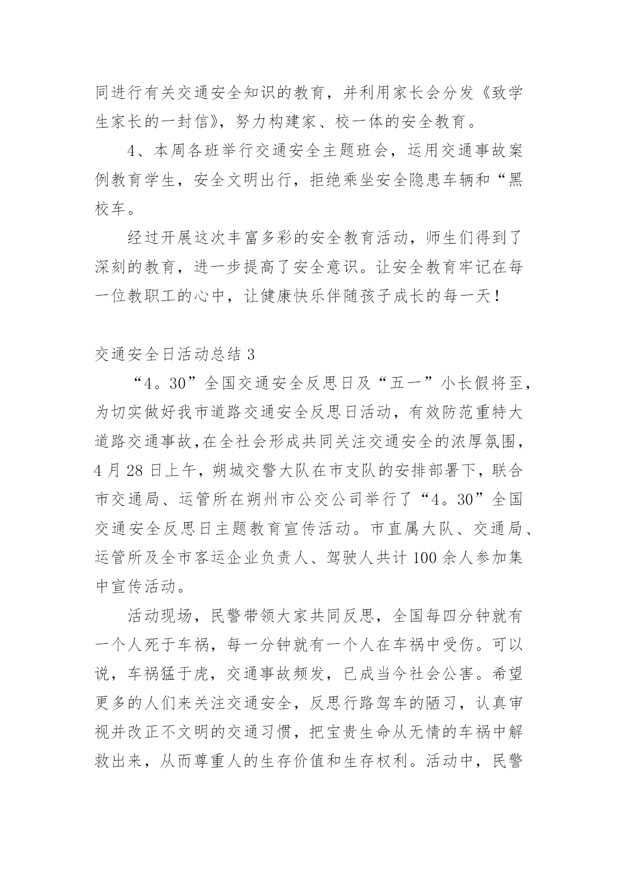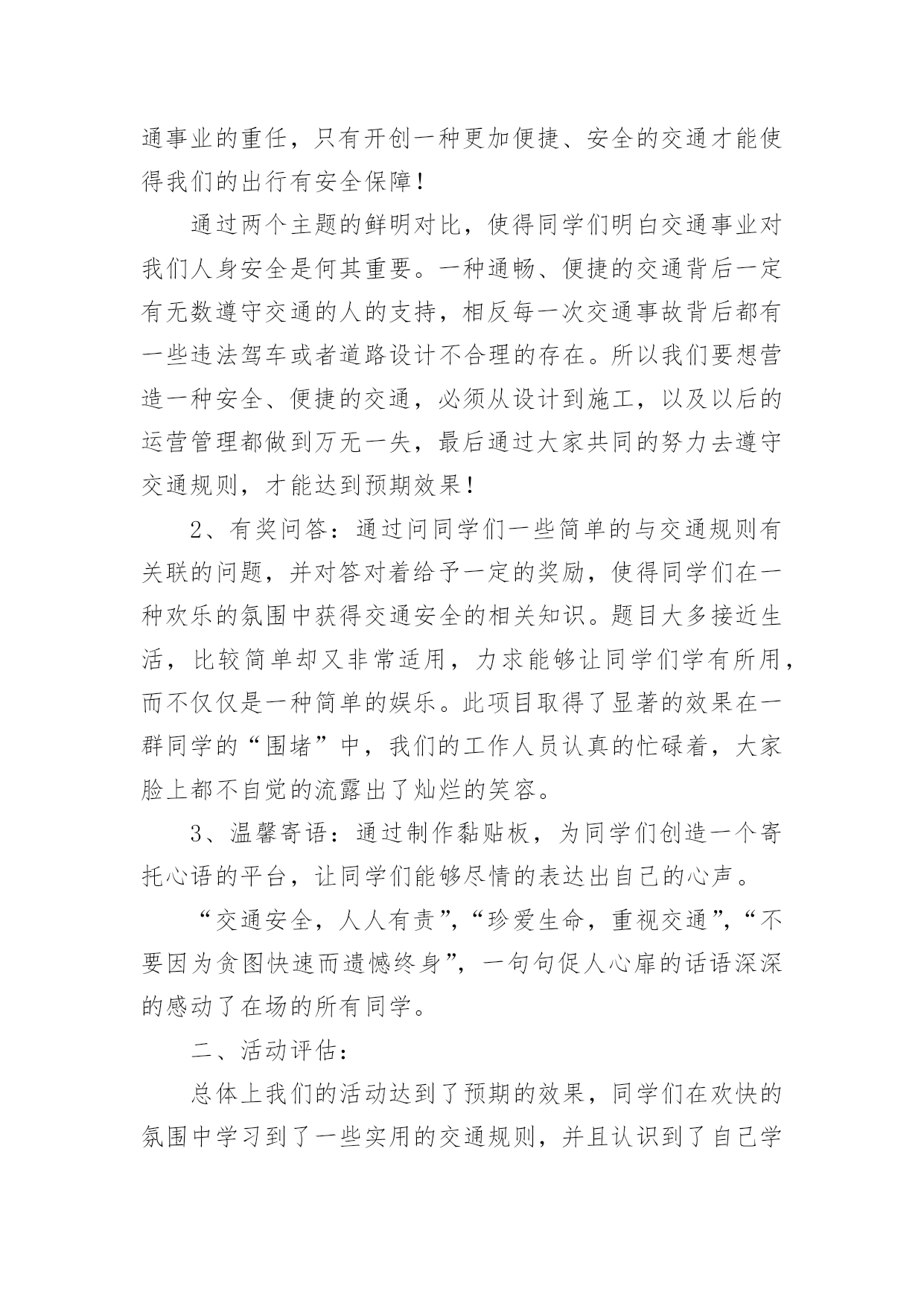 交通安全日活动总结交通安全日活动总结15篇总结在一个时期、一个年度、一个阶段对学习和工作生活等情况加以回顾和分析的一种书面材料,它能够给人努力工作的动力,不妨坐下来好好写写总结吧。那么你知道总结如何写吗?以下是小编收集整理的交通安全日活动总结,希望能够帮助到大家。交通安全日活动总结1为进一步提高我校交通安全意识,提高自我防范能力,减少意外伤害事故发生。我校交通安全宣传教育活动,使师生能自觉提高交通法规意识、安全意识和文明意识,共同打造和谐、安全、畅通的道路交通环境。现将本次活动有关情况总结如下:一、加强领导,组织机构健全。学校成立了以校长为组长的交通安全宣传工作领导小组,小组成员分工职责明确,既分工又合作。召开教师会,对交通安全展进行了广泛的宣传发动和详细部署布置,同时,以班级为单位,各班主任学校把交通安全工作列入一切工作的首位来抓,形成全体教师共同参与,齐抓共管的局面。二、形式多样,活动内容丰富多彩。1、利用例会对教职员工进行了一次交通安全教育,严禁教师无证驾驶机动车,酒后驾车等违法行为,做好教师自驾车进入校门口停车区域的安全管理,避开学生入校离校时间段进出校门,确保校园交通安全。2、充分利用周一升国旗时间,举行以了一次以“遵守交通规则安全文明出行”为主题的国旗下讲话,对全校师生进行交通安全知识教育,积极营造浓厚的交通安全知识宣传教育氛围。3、制作了一期交通安全知识宣传专心栏,加强交通安全知识宣传,积极倡导关爱生命,自觉遵守交通规则,做一个安全文明的小公民,收到了良好的效果。4、各班召开一次以“珍爱生命,安全出行”为主题的主题班会。让学生讲述我们日常生活中存在的易发生交通安全事故的危险地带,发动学生自己来分析应如何避免交通安全事故的发生,以丰富多彩的活动加强安全教育。教师紧扣交通安全活动主题,将安全教育融入到学生的一日生活中。让不学生明白遵守交通规则的重要性,并以此敲响安全警钟,让学生牢记安全守则,听从尊重交警,做一个遵守交通规则的好学生。做到了班班有安全教育,人人懂得安全,时时注意安全。5、在LED播放一条以“学生出入车辆缓行”为主题的交通安全宣传警示。大力营造宣传氛围,及时向师生和家长传递遵守交通安全的重要性。要求家长配合学校对学生进行必要的走路和乘车安全提醒,严格遵守交通法规。这样,不仅提高我校的交通安全意识,而且能辐射家长,规范家长的交通行为。6、学校充分利用校园广播站、网站、校讯通、黑板报、手抄报等形式,向全校学生进行交通安全知识宣传教育,提高交通安全教育实效性和普及率。各班级出一期交通安全教育黑板报。大队部通过宣传板块展示安全常识,以图文并茂、喜闻乐见的形式让全校师生都来了解、学习有关安全方面的知识。7、进行一次学校门口交通安全专项整治,做好校门口减速带、标志牌等交通安全设施的排查、设置与维护。8、印发以交通安全为主题“致学生家长关注交通安全的一封信”由各班主任发送到每一位学生家长(监护人),切实加强家校联系。要求家长要结合一封信的内容,做好子女的交通安全教育,确保孩子的安全,切实履行家长的监护职责。9、利用每天上、下午放学前最后一节课,开展“每天三分钟”安全教育,并经常通过电子显示屏、板报等,教育孩子珍爱生命、注意安全,小学生必须有家长或其他专门保护人员陪护才能学骑自行车,不得私自骑车上路。10、观看一场安全教育片:学校要求各班主任利用多媒体组织学生观看安全教育片,通过影片让学生心中想安全、学安全、懂安全。交通安全日活动总结2健康、安全、成长是每一个家庭和社会对学生关注的三大重点问题,而安全又是幼儿健康成长的重要保证。我校在长期坚持不懈地抓好安全教育工作的基础上,将今年全国交通安全日主题“遵守交通信号安全文明出行”与《关于在全市中小学校深入开展“文明交通进校园”活动的通知》文件精神相结合,我校广泛开展“遵守交通信号安全文明出行”交通安全宣传活动。一、成立交通安全教育活动领导小组,详细部署了活动的具体内容,将本次活动的主题、内容贯彻到各个班级中,由各班级进一步落实到各个幼儿当中。要求大家“事事讲安全,人人懂安全,健康快乐每一天”。二、开展丰富多彩的安全教育活动。1、结合一日教学活动、游戏活动进行开展。活动有观看安全教育动画片、互动提问、现场模仿等,活动中,老师们用通俗易懂的语言为小朋友讲解了道路交通安全知识,并通过安全小故事、交通事故案例、认识交通标志等进行了讲解和提问互动。小朋友也在愉悦的动画片中学习了各种交通安全知识,进一步增强了交通安全意识,提高了自我保护能力。2、我校根据这次的安全教育活动的主题,设计了以“交通安全”为主的宣传栏,布置有关“交通安全知识”以及“交通安全儿歌”的版块,各班级利用户外活动时间带领学生观看和学习。3、利用学校各种宣传途径,如电子屏幕、学园网站、安全宣传专栏等。发动联合家长广泛