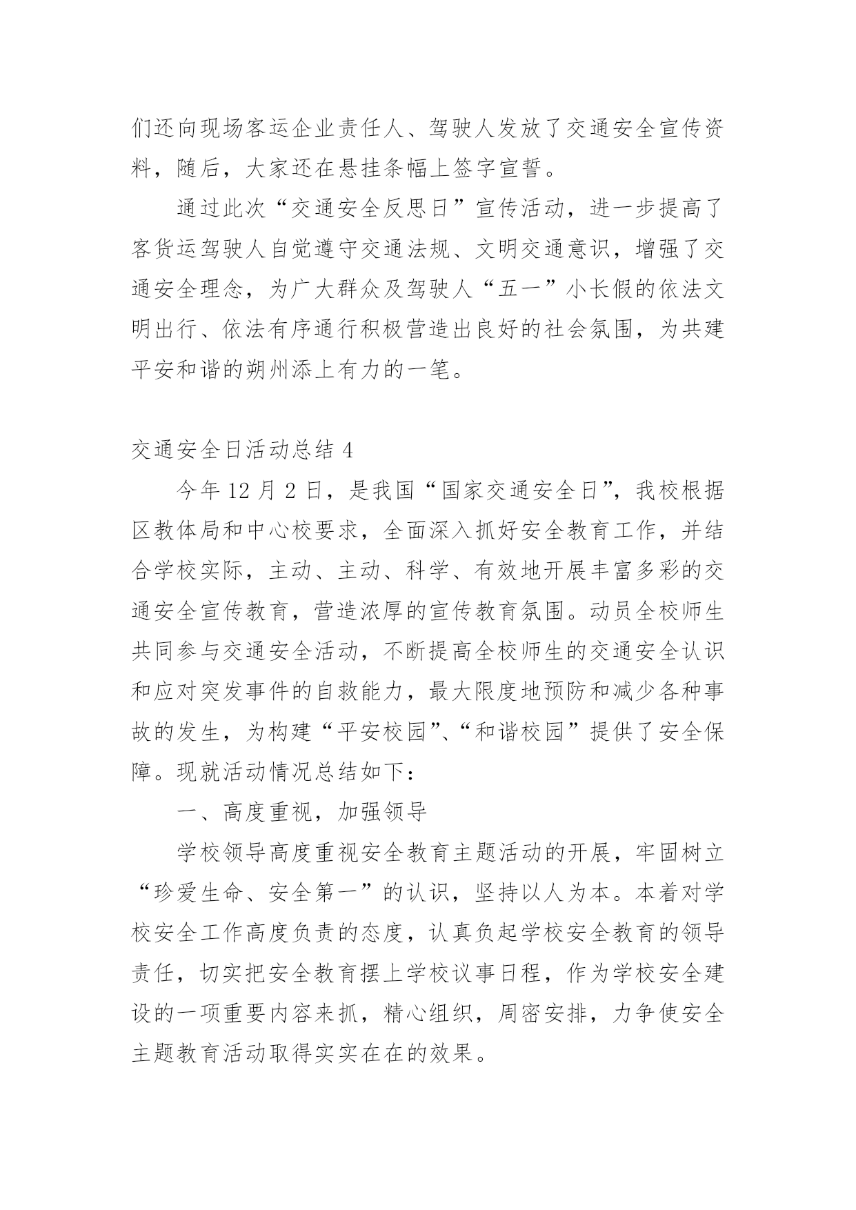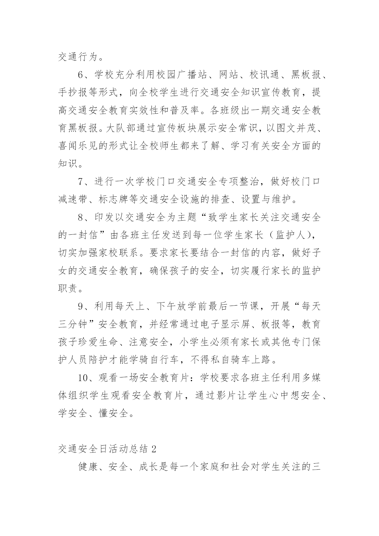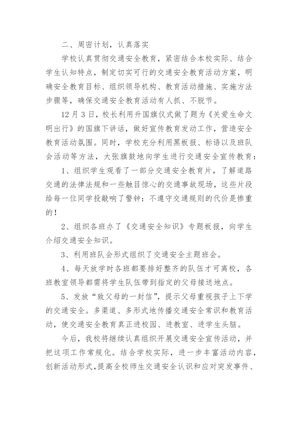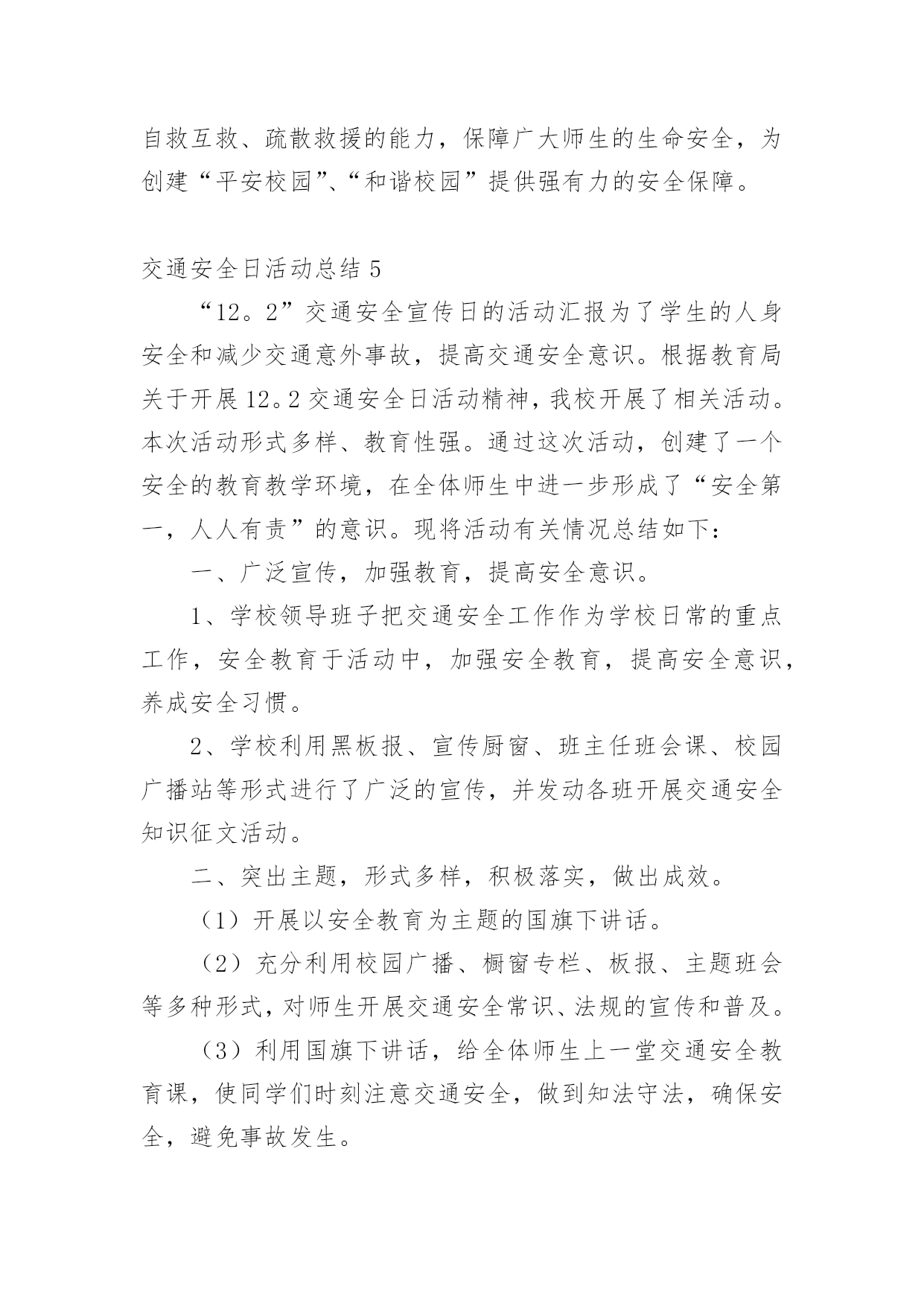 交通安全日活动总结交通安全日活动总结15篇总结在一个时期、一个年度、一个阶段对学习和工作生活等情况加以回顾和分析的一种书面材料,它能够给人努力工作的动力,不妨坐下来好好写写总结吧。那么你知道总结如何写吗?以下是小编收集整理的交通安全日活动总结,希望能够帮助到大家。交通安全日活动总结1为进一步提高我校交通安全意识,提高自我防范能力,减少意外伤害事故发生。我校交通安全宣传教育活动,使师生能自觉提高交通法规意识、安全意识和文明意识,共同打造和谐、安全、畅通的道路交通环境。现将本次活动有关情况总结如下:一、加强领导,组织机构健全。学校成立了以校长为组长的交通安全宣传工作领导小组,小组成员分工职责明确,既分工又合作。召开教师会,对交通安全展进行了广泛的宣传发动和详细部署布置,同时,以班级为单位,各班主任学校把交通安全工作列入一切工作的首位来抓,形成全体教师共同参与,齐抓共管的局面。二、形式多样,活动内容丰富多彩。1、利用例会对教职员工进行了一次交通安全教育,严禁教师无证驾驶机动车,酒后驾车等违法行为,做好教师自驾车进入校门口停车区域的安全管理,避开学生入校离校时间段进出校门,确保校园交通安全。2、充分利用周一升国旗时间,举行以了一次以“遵守交通规则安全文明出行”为主题的国旗下讲话,对全校师生进行交通安全知识教育,积极营造浓厚的交通安全知识宣传教育氛围。3、制作了一期交通安全知识宣传专心栏,加强交通安全知识宣传,积极倡导关爱生命,自觉遵守交通规则,做一个安全文明的小公民,收到了良好的效果。4、各班召开一次以“珍爱生命,安全出行”为主题的主题班会。让学生讲述我们日常生活中存在的易发生交通安全事故的危险地带,发动学生自己来分析应如何避免交通安全事故的发生,以丰富多彩的活动加强安全教育。教师紧扣交通安全活动主题,将安全教育融入到学生的一日生活中。让不学生明白遵守交通规则的重要性,并以此敲响安全警钟,让学生牢记安全守则,听从尊重交警,做一个遵守交通规则的好学生。做到了班班有安全教育,人人懂得安全,时时注意安全。5、在LED播放一条以“学生出入车辆缓行”为主题的交通安全宣传警示。大力营造宣传氛围,及时向师生和家长传递遵守交通安全的重要性。要求家长配合学校对学生进行必要的走路和乘车安全提醒,严格遵守交通法规。这样,不仅提高我校的交通安全意识,而且能辐射家长,规范家长的交通行为。6、学校充分利用校园广播站、网站、校讯通、黑板报、手抄报等形式,向全校学生进行交通安全知识宣传教育,提高交通安全教育实效性和普及率。各班级出一期交通安全教育黑板报。大队部通过宣传板块展示安全常识,以图文并茂、喜闻乐见的形式让全校师生都来了解、学习有关安全方面的知识。7、进行一次学校门口交通安全专项整治,做好校门口减速带、标志牌等交通安全设施的排查、设置与维护。8、印发以交通安全为主题“致学生家长关注交通安全的一封信”由各班主任发送到每一位学生家长(监护人),切实加强家校联系。要求家长要结合一封信的内容,做好子女的交通安全教育,确保孩子的安全,切实履行家长的监护职责。9、利用每天上、下午放学前最后一节课,开展“每天三分钟”安全教育,并经常通过电子显示屏、板报等,教育孩子珍爱生命、注意安全,小学生必须有家长或其他专门保护人员陪护才能学骑自行车,不得私自骑车上路。10、观看一场安全教育片:学校要求各班主任利用多媒体组织学生观看安全教育片,通过影片让学生心中想安全、学安全、懂安全。交通安全日活动总结2健康、安全、成长是每一个家庭和社会对学生关注的三大重点问题,而安全又是幼儿健康成长的重要保证。我校在长期坚持不懈地抓好安全教育工作的基础上,将今年全国交通安全日主题“遵守交通信号安全文明出行”与《关于在全市中小学校深入开展“文明交通进校园”活动的通知》文件精神相结合,我校广泛开展“遵守交通信号安全文明出行”交通安全宣传活动。一、成立交通安全教育活动领导小组,详细部署了活动的具体内容,将本次活动的主题、内容贯彻到各个班级中,由各班级进一步落实到各个幼儿当中。要求大家“事事讲安全,人人懂安全,健康快乐每一天”。二、开展丰富多彩的安全教育活动。1、结合一日教学活动、游戏活动进行开展。活动有观看安全教育动画片、互动提问、现场模仿等,活动中,老师们用通俗易懂的语言为小朋友讲解了道路交通安全知识,并通过安全小故事、交通事故案例、认识交通标志等进行了讲解和提问互动。小朋友也在愉悦的动画片中学习了各种交通安全知识,进一步增强了交通安全意识,提高了自我保护能力。2、我校根据这次的安全教育活动的主题,设计了以“交通安全”为主的宣传栏,布置有关“交通安全知识”以及“交通安全儿歌”的版块,各班级利用户外活动时间带领学生观看和学习。3、利用学校各种宣传途径,如电子屏幕、学园网站、安全宣传专栏等。发动联合家长广泛