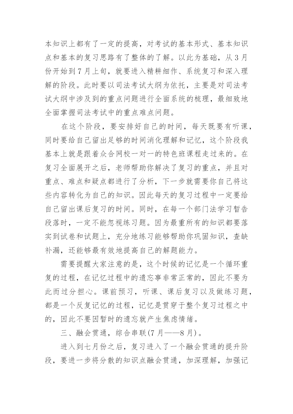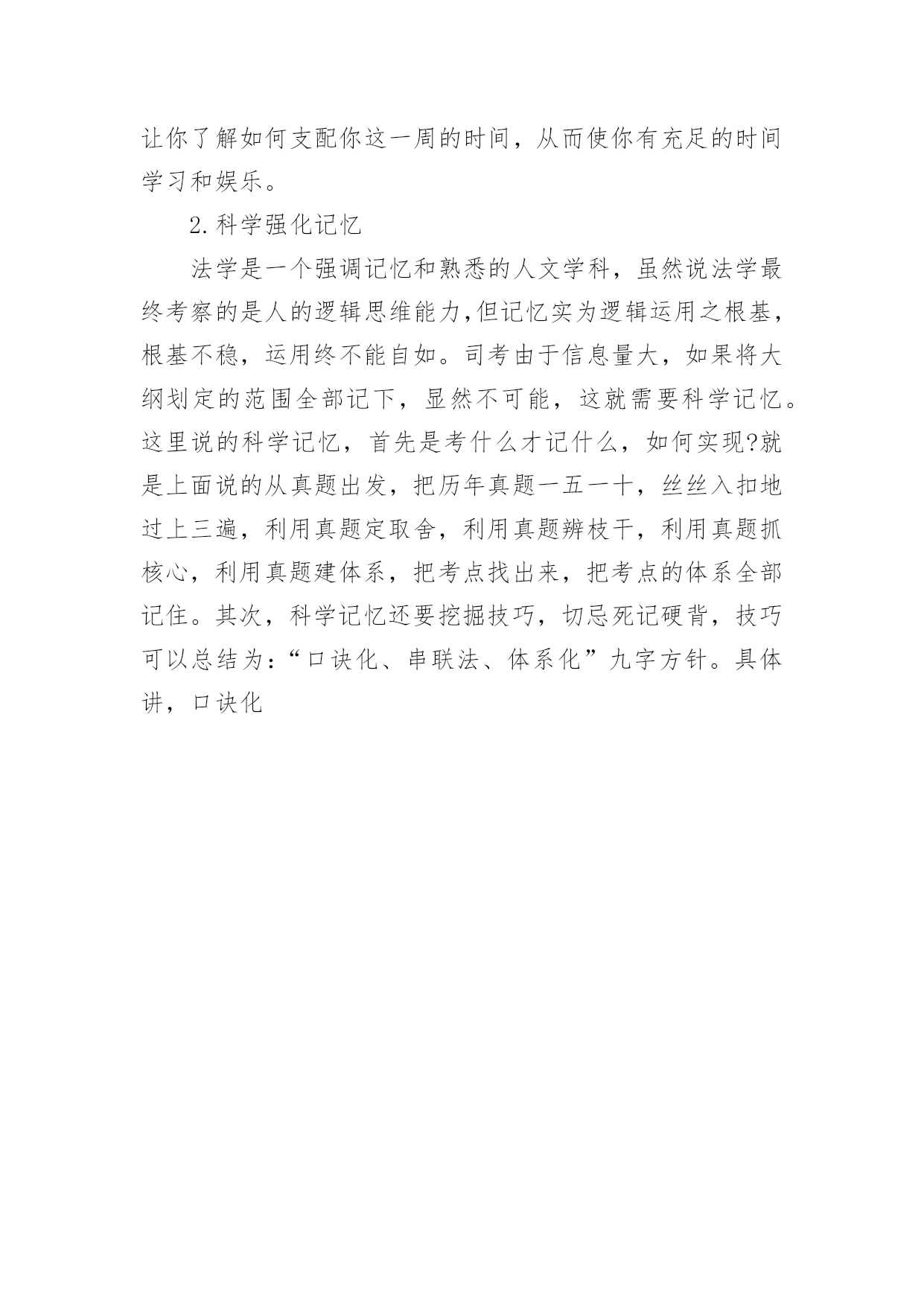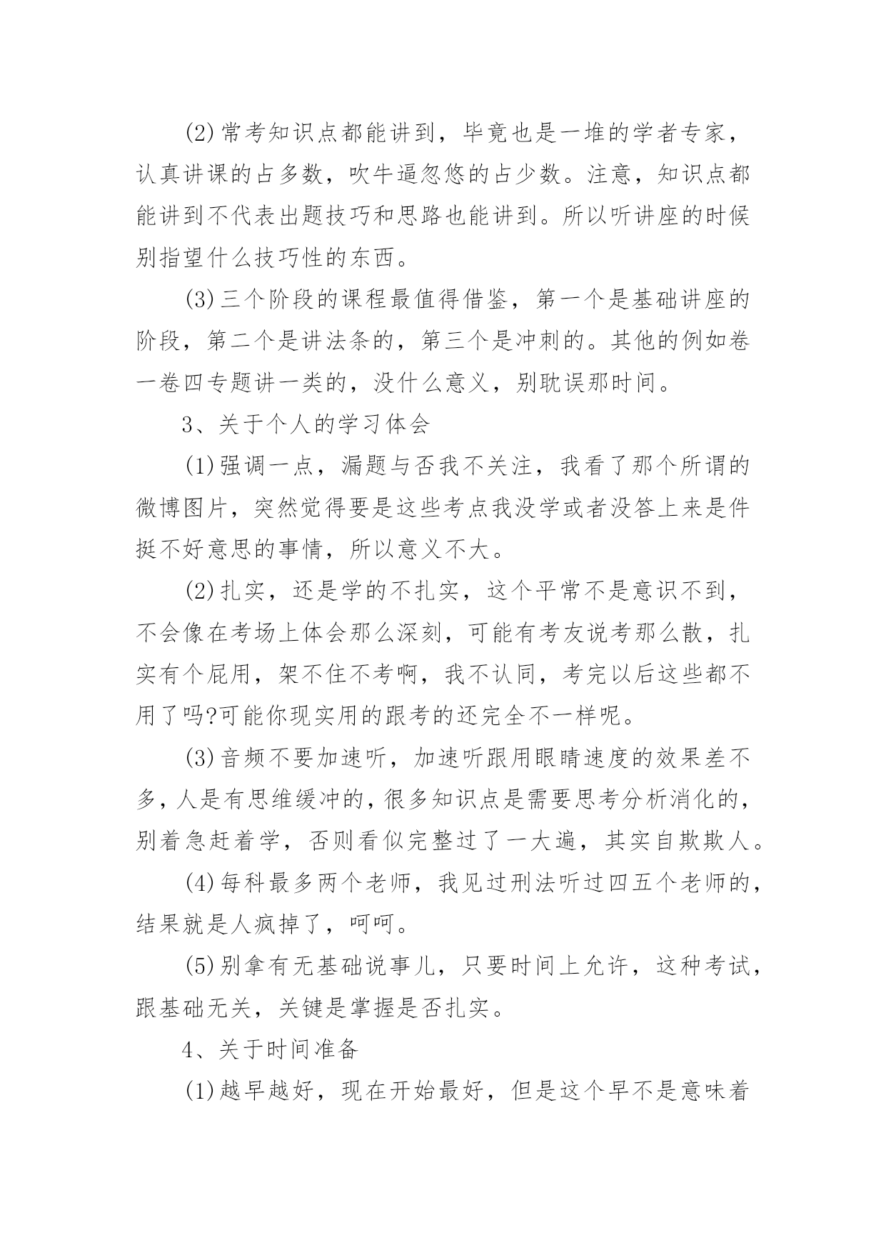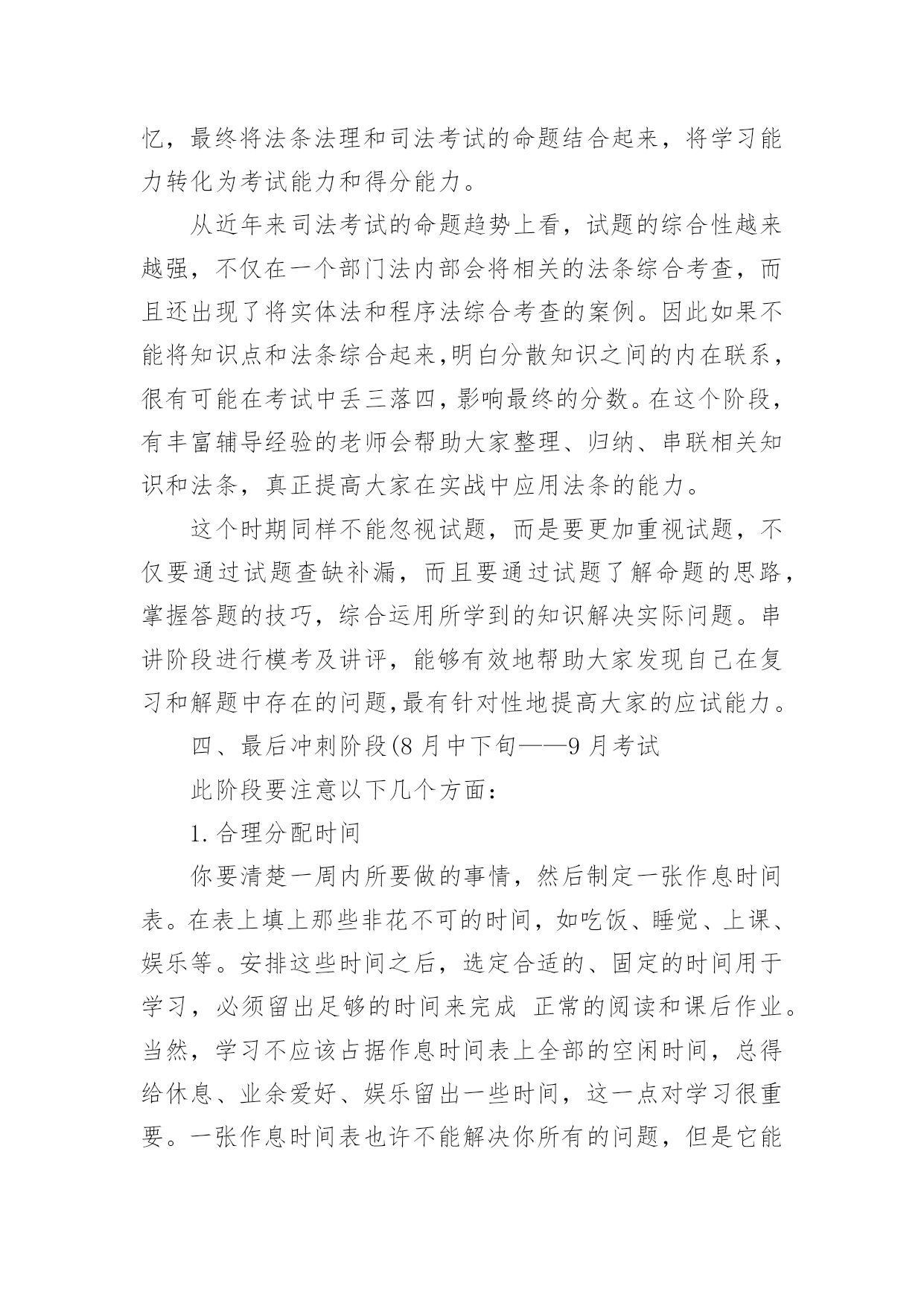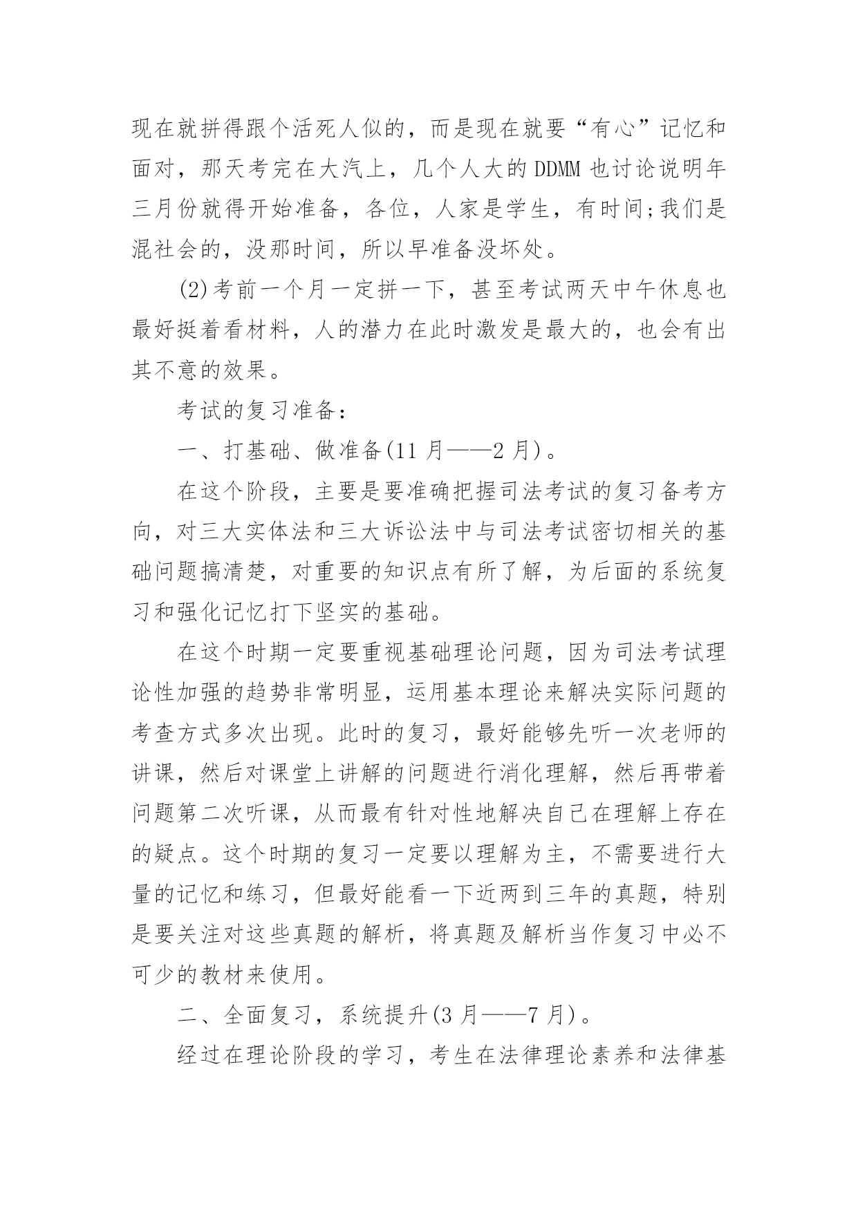 司法考试需要提前做好的几项准备2023司法考试需要提前做好的几项准备导语:考试之前我们都需要做一些准备,下面是百分网小编为大家带来的2023司法考试需要提前做好的准备工作,欢迎阅读!司法考试需要提前做好的几项准备:1、关于辅导教材(1)三大本就今年看,还是备一套吧,这东西都说做参考书和字典,考后逆推就发现,出的题目都在教材里。(2)各个机构的专题讲座就别浪费那钱了,没意义,有了三大本,下载点讲义,足够了。(3)法条要买一本,后期复习的时候,会发现很多知识需要对照法条去理解,光看教材和讲义,可能会写不到,这个教材是辅导机构出的那些教材。(4)真题汇编,我今年买了本司法部组织编的,当时记得大家还讨论了很久,就今年出题的模式和架势,以往的出题逻辑基本作废,明年对我唯一的用处也许就是自测用了,至少答案是官方认可的,其他的作用不大。2、关于各辅导机构(1)所谓的押题,扯淡忽悠人的多,押中的知识点大概占20%左右吧,来年谁打算报个什么包过、绝密一类的班的时候,要慎重!尤其是辛苦大半年复习的人,对于那些临考前才复习的人来说,帮助过一遍知识点的用途而已。(2)常考知识点都能讲到,毕竟也是一堆的学者专家,认真讲课的占多数,吹牛逼忽悠的占少数。注意,知识点都能讲到不代表出题技巧和思路也能讲到。所以听讲座的时候别指望什么技巧性的东西。(3)三个阶段的课程最值得借鉴,第一个是基础讲座的阶段,第二个是讲法条的,第三个是冲刺的。其他的例如卷一卷四专题讲一类的,没什么意义,别耽误那时间。3、关于个人的学习体会(1)强调一点,漏题与否我不关注,我看了那个所谓的微博图片,突然觉得要是这些考点我没学或者没答上来是件挺不好意思的事情,所以意义不大。(2)扎实,还是学的不扎实,这个平常不是意识不到,不会像在考场上体会那么深刻,可能有考友说考那么散,扎实有个屁用,架不住不考啊,我不认同,考完以后这些都不用了吗?可能你现实用的跟考的还完全不一样呢。(3)音频不要加速听,加速听跟用眼睛速度的效果差不多,人是有思维缓冲的,很多知识点是需要思考分析消化的,别着急赶着学,否则看似完整过了一大遍,其实自欺欺人。(4)每科最多两个老师,我见过刑法听过四五个老师的,结果就是人疯掉了,呵呵。(5)别拿有无基础说事儿,只要时间上允许,这种考试,跟基础无关,关键是掌握是否扎实。4、关于时间准备(1)越早越好,现在开始最好,但是这个早不是意味着现在就拼得跟个活死人似的,而是现在就要“有心”记忆和面对,那天考完在大汽上,几个人大的DDMM也讨论说明年三月份就得开始准备,各位,人家是学生,有时间;我们是混社会的,没那时间,所以早准备没坏处。(2)考前一个月一定拼一下,甚至考试两天中午休息也最好挺着看材料,人的潜力在此时激发是最大的,也会有出其不意的效果。考试的复习准备:一、打基础、做准备(11月——2月)。在这个阶段,主要是要准确把握司法考试的复习备考方向,对三大实体法和三大诉讼法中与司法考试密切相关的基础问题搞清楚,对重要的知识点有所了解,为后面的系统复习和强化记忆打下坚实的基础。在这个时期一定要重视基础理论问题,因为司法考试理论性加强的趋势非常明显,运用基本理论来解决实际问题的考查方式多次出现。此时的复习,最好能够先听一次老师的讲课,然后对课堂上讲解的问题进行消化理解,然后再带着问题第二次听课,从而最有针对性地解决自己在理解上存在的疑点。这个时期的复习一定要以理解为主,不需要进行大量的记忆和练习,但最好能看一下近两到三年的真题,特别是要关注对这些真题的解析,将真题及解析当作复习中必不可少的教材来使用。二、全面复习,系统提升(3月——7月)。经过在理论阶段的学习,考生在法律理论素养和法律基本知识上都有了一定的提高,对考试的基本形式、基本知识点和基本的复习思路有了整体的了解。以此为基础,从3月份开始到7月上旬,就要进入精耕细作、系统复习和深入理解的阶段。此时要以司法考试大纲为依托,主要是对司法考试大纲中涉及到的重点问题进行全面系统的梳理,最细致地全面掌握司法考试中的重点难点问题。在这个阶段,要安排好自己的时间,每天既要有听课,同时要给自己留出足够的时间消化理解和记忆,这个阶段我基本上就是跟着众合网校一对一的特色班课程走过来的。在复习全面展开之后,老师帮助你解决了复习的重点,并且对重点、难点和疑点都进行了分析,下一步就需要你自己将这些内容转化为自己的知识。因此每天的复习过程中一定要给自己留出课后复习的时间。同时,在每一个部门法学习暂告段落时,一定不能忽视练习题。因为最重所有的知识都要落实到试卷和试题上,充分地练习能够帮助你巩固知识,查缺补漏,还能够最有效地提高自己的解题能力。需要提醒大家注意的是,这个时候的记忆是一个循环重复的过程,在记忆过程中的遗忘事非常正常的,因此不要为此而过分担心。课前预