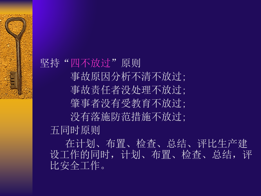 安全基础教育培训大纲:一、安全生产基础概念危险源:可能导致伤害或疾病、财产损失、工作环境破坏或这些情况组合的根源的状态。事故隐患是指作业场所、设备及设施的不安全状态,人的不安全行为和管理上的缺陷,是引发安全事故的直接原因。风险:指某一特定危险情况发生的可能性和后果的组合。危险源辨识:识别危险的存在并确定其特性的过程.安全生产责任制:根据安全生产法律法规和企业生产实际,将各级领导、职能部门、工程技术人员、岗位操作人员在安全生产方面应该做的事及应负的责任加以明确规定的一种制度。风险评价:评估风险大小以及确定风险是否容许的全过程。2.公司安全管理模式(“1234”安全管理模式)公司在安全生产管理方面的工作总体上可以用“1234”四个数字来概括。即:坚持“一个中心”、狠抓“两个落实”、抓好“三条生产线”和强化“四个方面”的管理。坚持“一个中心”:即坚持以“预防事故”为中心,所有工作都要做到防范在先,预防在先。狠抓“两个落实”:落实责任,就是抓各级、各部门、各岗位的经济责任和行政责任;落实制度,就是抓技术制度和管理制度的落实。抓好“三条生产线”:即重点抓好矿山生产线、交通运输线、硫酸生产线。二、安全生产基本原则国家安全生产方针安全生产方针是对安全生产工作的总要求,它是安全生产工作的方向。我国的安全生产方针是“安全第一,预防为主、综合治理”。“安全第一”是指安全生产是全国一切经济部门和生产企业的头等大事。当生产任务与安全发生矛盾时,应先解决安全问题。使生产在确保安全的前提下顺利进行。“预防为主”是指在实现“安全第一”的许多工作中,做好预防工作是最主要的。三、员工安全生产基本的权利和义务2.基本安全生产权利(1)遵章守规,服从管理的义务(2)正确佩戴和使用劳动防护用品的义务(3)接受安全培训,掌握安全生产技能的义务(4)发现事故隐患或者其他不安全因素及时报告的义务3.员工安全生产职责的主要内容自觉遵守安全生产规章制度和劳动纪律,不违章作业,并随时制止他人违章作业;遵守有关设备维修保养制度的规定;爱护和正确使用机器设备、工具,正确佩戴防护用品;关心安全生产情况,向有关领导或部门提出合理化建议;发现事故隐患和不安全因素要及时向组长或有关部门汇报;员工安全生产职责的主要内容发生工伤事故,要及时抢救伤员、保护现场,报告领导,并协助调查工作;努力学习和掌握安全知识和技能、熟练掌握本工种操作程序和安全操作规程;积极参加各种安全活动,牢固树立“安全第一”思想和自我保护意识;有权拒绝违章指挥和强令冒险作业,对个人安全生产负责。四、安全生产基本知识2.对比色对比色有黑白两种颜色,黄色安全色的对比色为黑色。红、蓝、绿安全色的对比色均为白色。而黑、白两色互为对比色。黑色用于安全标志的文字、图形符号,警告标志的几何图形和公共信息标志。禁止标志的含义是禁止人们不安全行为的图形标志。其基本型式为带斜杠的圆形框。圆环和斜杠为红色,图形符号为黑色,衬底为白色。警告标志的含义是提醒人们对周围环境引起注意,以避免可能发生危险的图形标志。其基本型式是正三角形边框。三角形边框及图形为黑色,衬底为黄色。指令标志的含义是强制人们必须做出某种动作或采用防范措施的图形标志。其基本型式是圆形边框。图形符号为白色,衬底为蓝色。提示标志的含义是向人们提供某种信息的图形标志。其基本型式是正方形边框。图形符号为白色,衬底为绿色。4.正确使用和佩戴各种安全防护用品(1)安全帽安全帽的防护作用防止物体打击伤害防止高处坠落伤害头部防止机械性损伤防止污染毛发伤害安全帽使用注意事项要有下颏带和后帽箍并拴系牢固,以防帽子滑落与碰掉;安全帽使用超过规定限值,或者受过较严重的冲击后,虽然肉眼看不到损伤痕迹,也应予以更换。一般塑料安全帽使用期限为两年半;佩戴安全帽前,应检查各配件有无损坏,装配是否牢固,帽衬调节部分是否卡紧,绳带是否系紧等,确信各部件完好后方可使用。防护眼镜和防护面罩的作用防护眼镜和防护面罩的使用注意事项防护手套的作用防护手套的使用注意事项防护鞋的作用防护鞋的作用安全带的作用:预防作业人员从高处坠落五、安全系统管理(一)人的不安全行为冰山理论----控制危险源头冰山理论----控制危险源头冰山理论----控制危险源头研究数据----控制人为因素研究数据----控制人为因素研究数据----控制人为因素多米诺骨牌效应---控制风险管理多米诺骨牌效应---控制风险管理(二)物的不安全状态(工艺、设备安全技术管理)管理方面的对策六、职业卫生毒物进入人体的三个途径毒物进入人体的三个途径毒物进入人体的三个途径职业病危害防护七、企业安全文化建设共同努力安全“十零”目标谢谢大家!