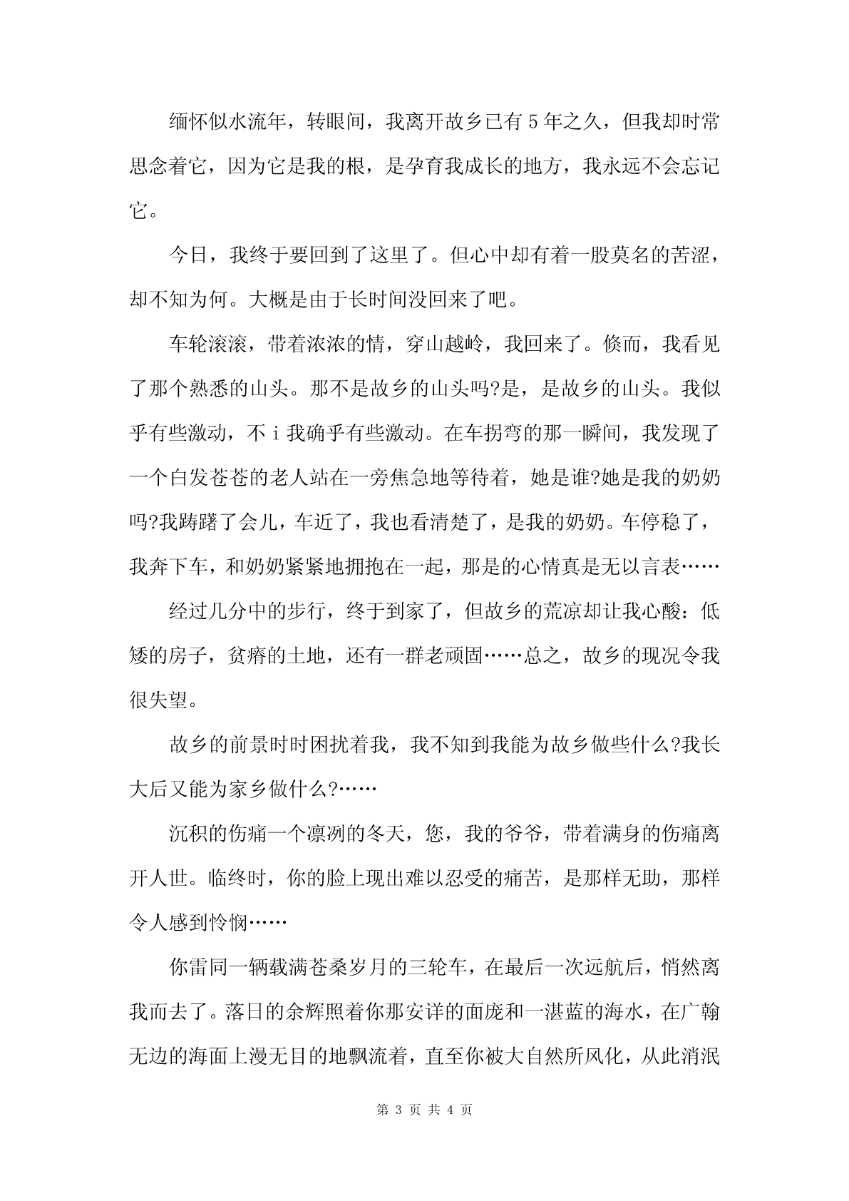 2021深圳中考作文(实用版)编制人:__________________审核人:__________________审批人:__________________编制单位:__________________编制时间:____年____月____日序言下载提示:该文档是本店铺精心编制而成的,希望大家下载后,能够帮助大家解决实际问题。文档下载后可定制修改,请根据实际需要进行调整和使用,谢谢!并且,本店铺为大家提供各种类型的实用资料,如教育随笔、日记赏析、句子摘抄、古诗大全、经典美文、话题作文、工作总结、词语解析、文案摘录、其他资料等等,想了解不同资料格式和写法,敬请关注!Downloadtips:Thisdocumentiscarefullycompiledbythiseditor.Ihopethatafteryoudownloadit,itcanhelpyousolvepracticalproblems.Thedocumentcanbecustomizedandmodifiedafterdownloading,pleaseadjustanduseitaccordingtoactualneeds,thankyou!Inaddition,thisshopprovidesyouwithvarioustypesofpracticalmaterials,suchaseducationalessays,diaryappreciation,sentenceexcerpts,ancientpoems,classicarticles,topiccomposition,worksummary,wordparsing,copyexcerpts,othermaterialsandsoon,wanttoknowdifferentdataformatsandwritingmethods,pleasepayattention!2021深圳中考作文导读:2021深圳中考作文:《回家》范文参考相关考试作文范文分享给各位同学学习。2021深圳中考作文:《回家》范文参考解析这个作文题目,我们主要从四个方面出发:一、立意正能量这一题目要求我们在立意上要体现出初中生应有的积极进取和人文关怀,切记为求创新而改变立意。“回家“就意味着思念故人和还念故土,曾经发生的事和曾经亲切的友人,这些都可以成为我们写作的出发点和立意点。二、结构清晰考场老师阅卷快,所以结构设置上,多是“总—分—总”结构。记叙文的结尾要注意抒情和总结哲理,当然也可以灵活采用夹叙夹议的手法。但是注意,记叙文忘记说事却议论过多。要把思念之情融入思念之事中,这样文章才显得合情合理。三、选材新颖选择具有时代气息、生活气息的材料,使文章独具一格,可以让读者耳目一新。可以结合自身经历或现在流行的事件来谈“家乡“。切忌空谈思念之情,要多谈具体的时间。四、语言优美可适当增加修辞,使语言更有美感和气势,避免平铺直叙。解析来自于智康语文名师陆晓磊老师范文参考回家缅怀似水流年,转眼间,我离开故乡已有5年之久,但我却时常思念着它,因为它是我的根,是孕育我成长的地方,我永远不会忘记它。今日,我终于要回到了这里了。但心中却有着一股莫名的苦涩,却不知为何。大概是由于长时间没回来了吧。车轮滚滚,带着浓浓的情,穿山越岭,我回来了。倏而,我看见了那个熟悉的山头。那不是故乡的山头吗?是,是故乡的山头。我似乎有些激动,不i我确乎有些激动。在车拐弯的那一瞬间,我发现了一个白发苍苍的老人站在一旁焦急地等待着,她是谁?她是我的奶奶吗?我踌躇了会儿,车近了,我也看清楚了,是我的奶奶。车停稳了,我奔下车,和奶奶紧紧地拥抱在一起,那是的心情真是无以言表……经过几分中的步行,终于到家了,但故乡的荒凉却让我心酸:低矮的房子,贫瘠的土地,还有一群老顽固……总之,故乡的现况令我很失望。故乡的前景时时困扰着我,我不知到我能为故乡做些什么?我长大后又能为家乡做什么?……沉积的伤痛一个凛冽的冬天,您,我的爷爷,带着满身的伤痛离开人世。临终时,你的脸上现出难以忍受的痛苦,是那样无助,那样令人感到怜悯……你雷同一辆载满苍桑岁月的三轮车,在最后一次远航后,悄然离我而去了。落日的余辉照着你那安详的面庞和一湛蓝的海水,在广翰无边的海面上漫无目的地飘流着,直至你被大自然所风化,从此消泯殆尽。曾几何时,你在那狭小的院落里教会了我1+1等于2的时候,你是多么开怀,多么欣慰啊,当我小心翼翼地点燃你那大烟时,你又多