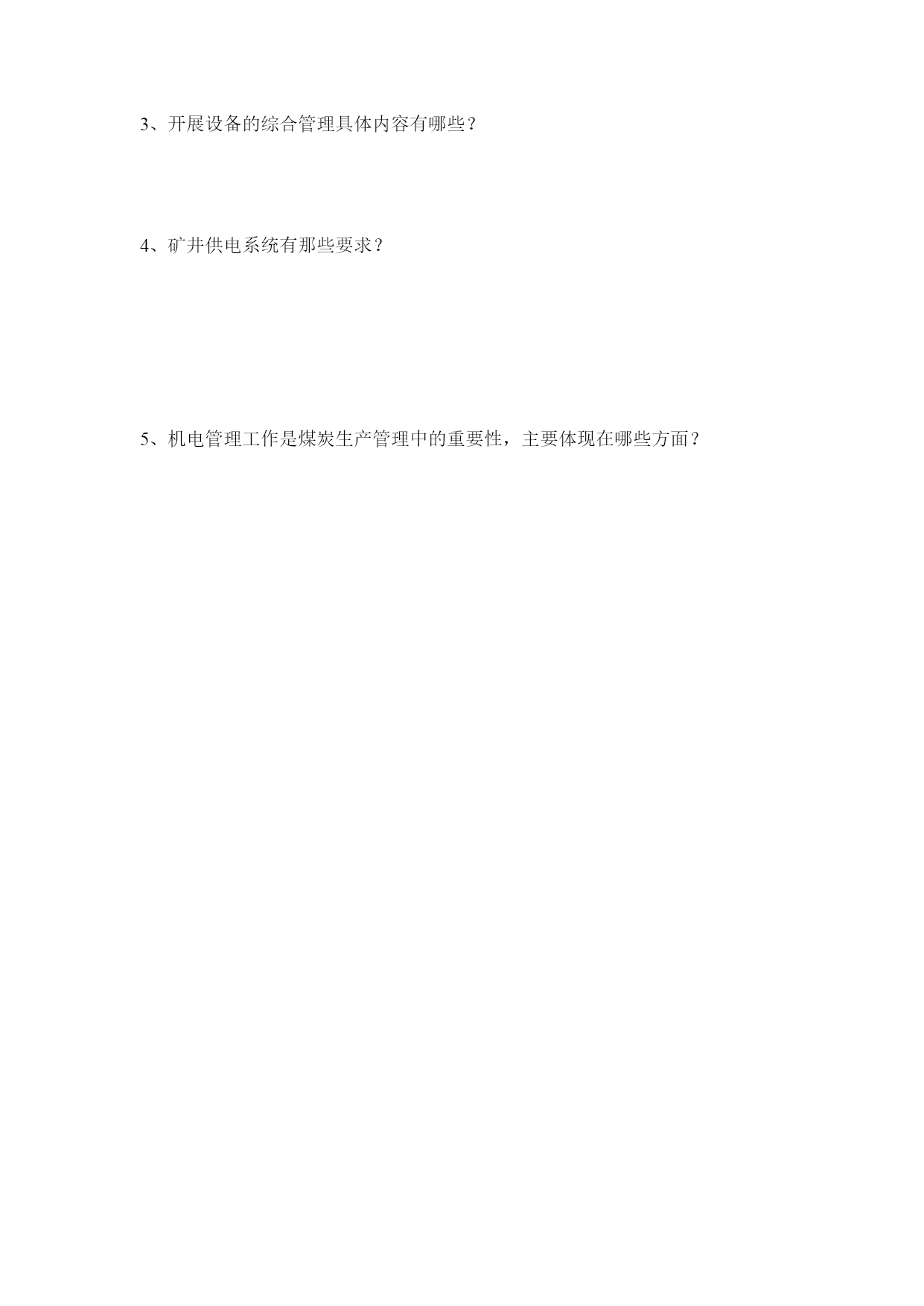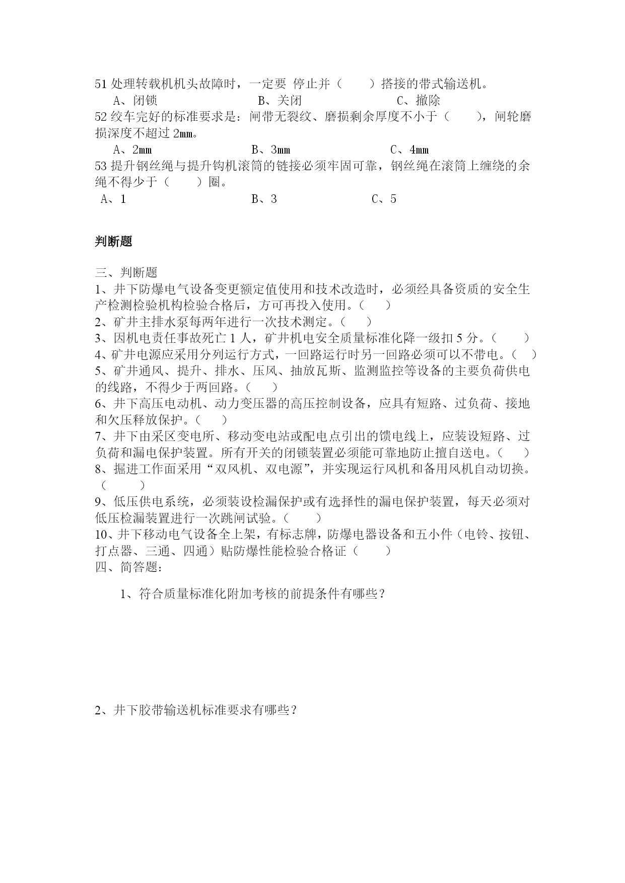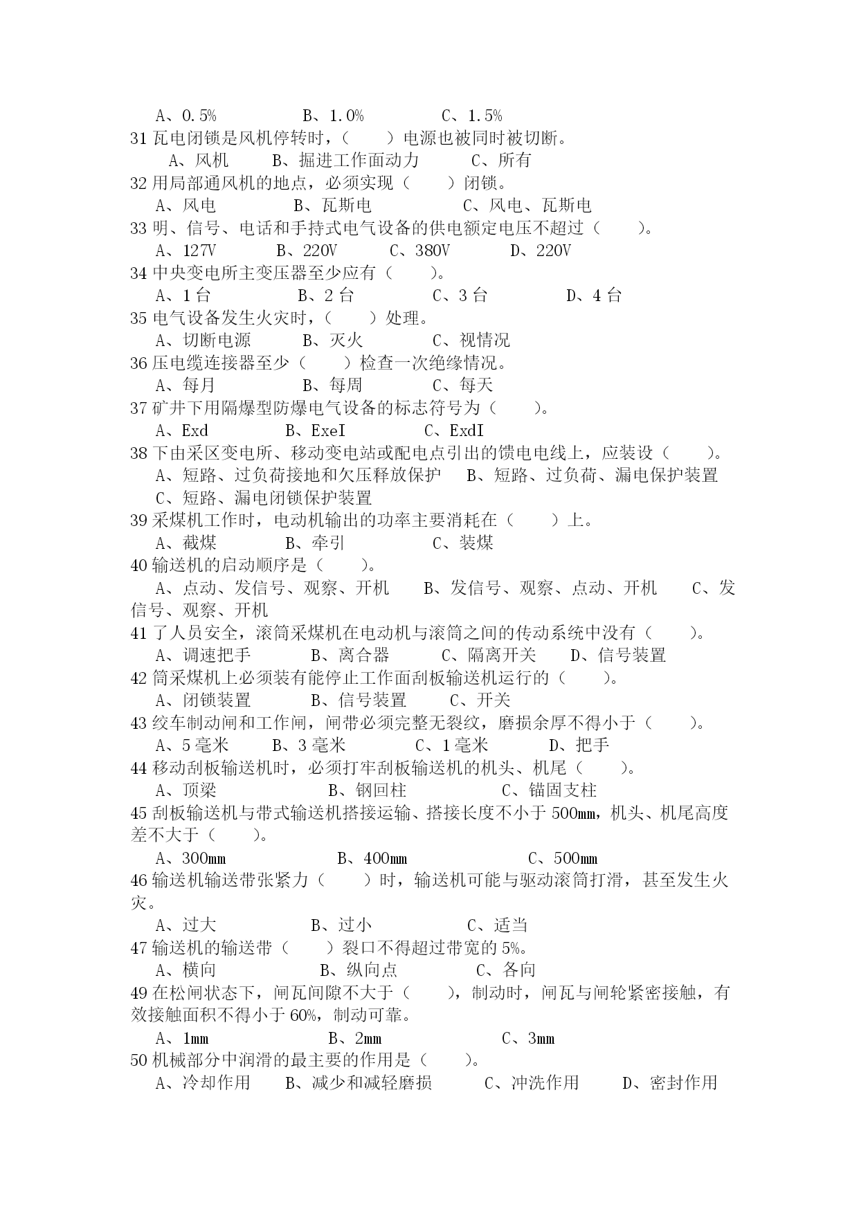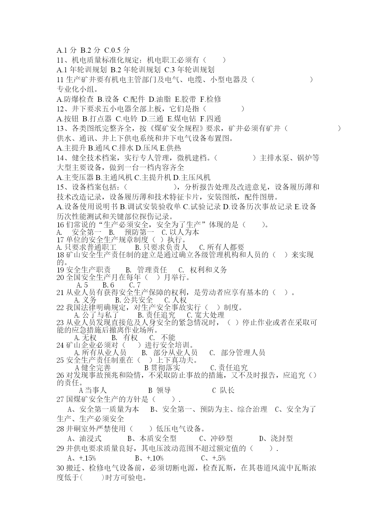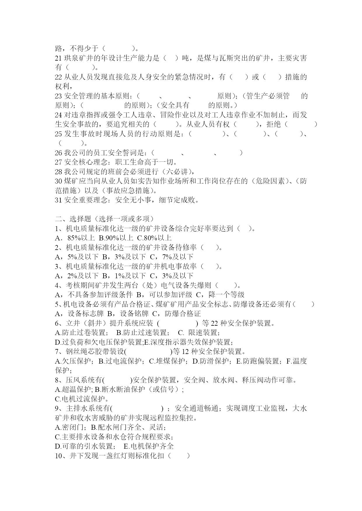 机电管理人员考试题单位:姓名:成绩:一、填空题(每题1.5分,共30分)1、机电设备必须有()、煤矿矿用产品()、防爆设备还必须有()。2、全矿机电设备综合完好率();防爆电气设备及小型电器防爆率(%);小型电器合格率(%);电缆吊挂合格率(%);按规定使用双光源矿灯,完好率(%),井下在用矿灯无();设备待修率(%);机电事故率(%)。3、机电安全保护装置()、可靠,合格率(%)。4、低压电机装设()、()、()、()保护及远程控制装置。5、40kW及以上电机应使用()控制,并使用电动机()。6、掘进工作面采用“双风机、双电源”,并实现()和()自动切换。7、局部通风机和掘进工作面中的电气设备,必须装有()装置,煤巷掘进工作面必须装设()装置、()装置。8、四小线和动力电缆使用()电缆。9、中央变电所的高压馈电线上,必须装设有选择性的()保护装置。10、供移动变电站的高压馈电线上,必须装设有选择性的动作于跳闸的()保护装置。11、低压供电系统,必须装设()保护或()的漏电保护装置,()必须对低压检漏装置进行一次跳闸试验。12、井下变(配)电所、主排水泵房和下山开采的采区排水泵房供电的线路,不得()两回路。13、有合格的供电系统设计及保护整定校验,()必须对供电系统继电保护进行一次()、()和整定,并进行()预防性试验。14、采煤机上有急停刮板输送机的闭锁装置,综采工作面使用()和()控制装置。15、综采工作面机巷,综掘工作面后续运输巷必须实现()运输,综采工作面风巷必须安设轨道,综采、综掘工作面的所有轨道轨型不得低于(),不准使用()。16、扒装机应有()、制动闸、保护栏杆、照明灯。掘进机蜂鸣器、照明、()完整齐全。17、采掘运设备液压系统零部件齐全,管路、阀组不串、漏液,泵站()符合要求。18、主提升机技术测试,检测检验工作必须由具备资质的安全生产检测检验机构承担,严格按照国家有关规定进行。新安装和大修后进行一次测定。以后每()进行一次测定。19、移动变电站、乳化液泵站的安装地点,必须留有足够的(),各种安全距离不得小于()。20、矿井电源应采用分列运行方式,一回路运行时另一回路必须()备用。矿井通风、提升、排水、压风、抽放瓦斯、监测监控等设备的主要负荷供电的线路,不得少于()。21珙泉矿井的年设计生产能力是()吨,是煤与瓦斯突出的矿井,主要灾害有()。22从业人员发现直接危及人身安全的紧急情况时,有()或()措施的权利,23安全管理的基本原则:(、、原则);(管生产必须管的原则);(的原则);(安全具有的原则。)24对违章指挥或强令工人违章、冒险作业以及对工人违章作业不加制止,而发生安全事故的,要追究相关的()。从业人员有权(),拒绝()25发生事故时现场人员的行动原则是:()、()、()、()。26我公司的员工安全誓词是:(、、)27安全核心理念:职工生命高于一切。28我公司规定的班前会必须进行(六必讲),30煤矿应当向从业人员如实告知作业场所和工作岗位存在的(危险因素)、(防范措施)以及(事故应急措施)。31安全重要理念:安全无小事,细节定成败。选择题(选择一项或多项)1、机电质量标准化达一级的矿井设备综合完好率要达到()。A.85%以上B.90%以上C.80%以上2、机电质量标准化达一级的矿井设备待修率()。A,5%及以下B,3%及以下C,7%及以下3、机电质量标准化达一级的矿井机电事故率()。A,2%及以下B,1%及以下C,3%及以下4、考核期间矿井发生两台(处)电气设备失爆则()。A,不具备参加评级条件B,可以参加评级C,降一个等级5、机电设备必须有产品合格证、煤矿矿用产品安全标志、防爆设备还必须有()A,设备标志牌B,设备铭牌C,防爆合格证6、立井(斜井)提升系统应装()等22种安全保护装置。A.防止过卷装置;B.防止过速装置;C.限速装置;D.过负荷和欠电压保护装置;E.深度指示器失效保护装置;7、钢丝绳芯胶带装设()等12种安全保护装置。A.欠压保护;B.过电流保护;C.堆煤保护;D.防滑保护;E.防跑偏装置;F.温度保护;8、压风系统有()安全保护装置,安全阀、放水阀、释压阀动作可靠。A.超温保护;B.断水断油保护(或信号);C.电机过流保护。9、主排水系统有();安全通道畅通;实现调度工业监视,大水矿井和收水害威胁的矿井实现远程监控集控。A.密闭门;B.配水闸门齐全、灵活;C.主要排水设备和水仓符合规程要求;D.可靠的引水装置;E.电机保护齐全10、井下发现一盏红灯则标准化扣()A.1分B.2分C.0.5分11、机电质量标准化规定:机电职工必须有()A.1年轮训规划B.2年轮训规划C