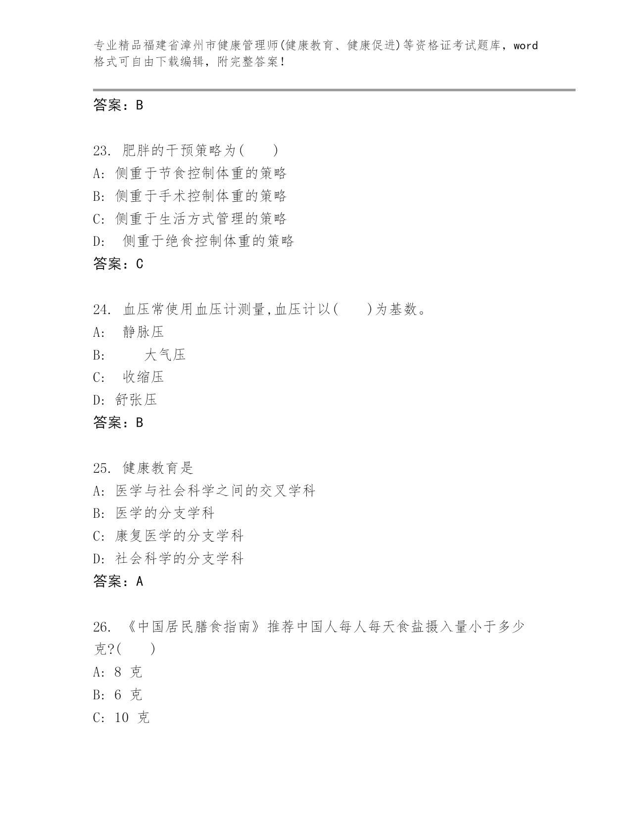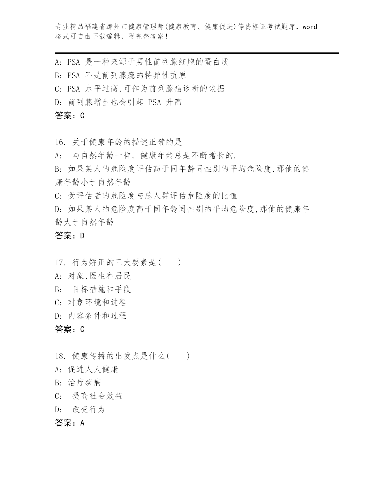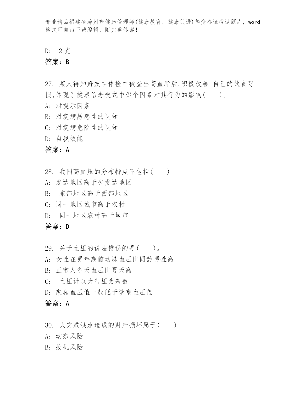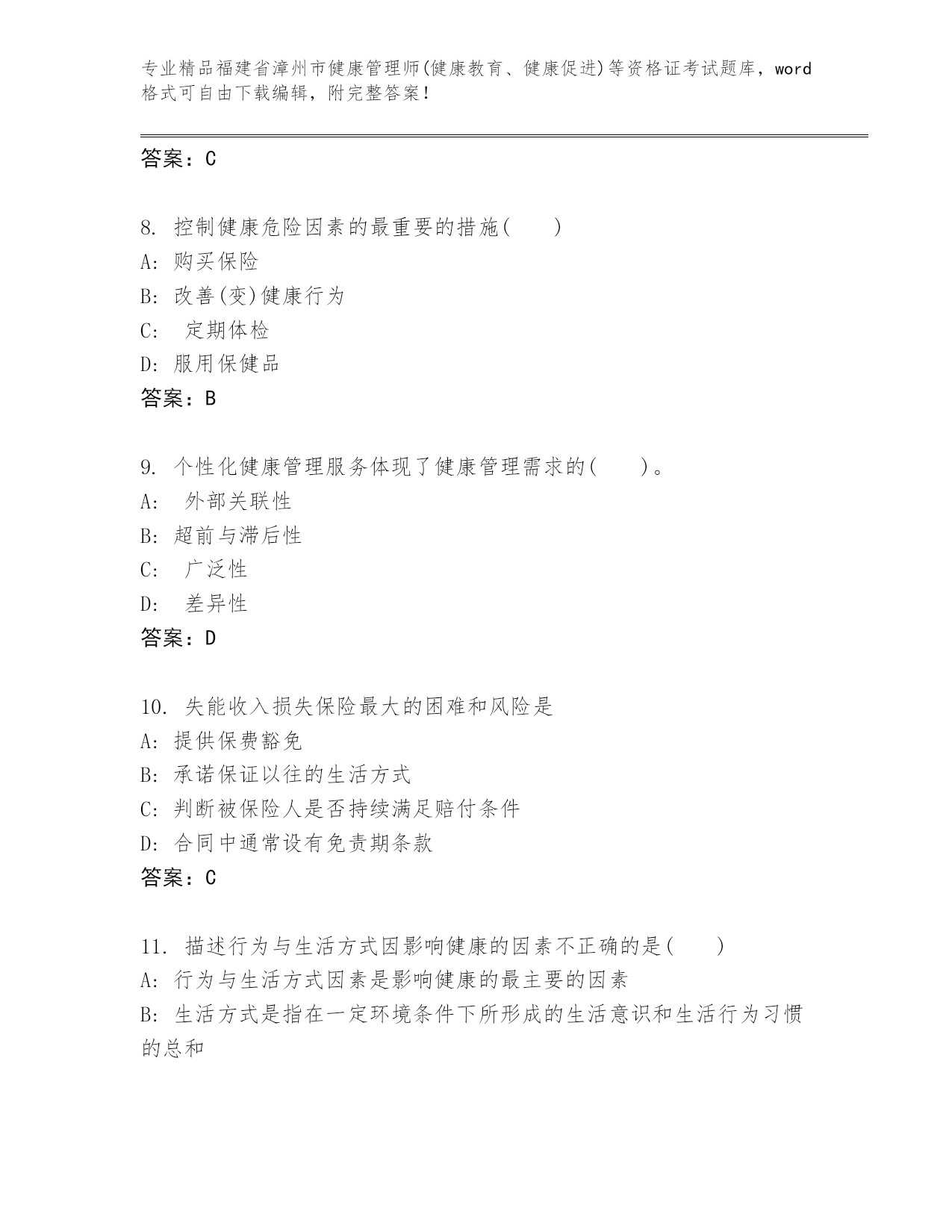 优选福建省漳州市健康管理师(健康教育、健康促进)等资格证考试通用题库及答案【网校专用】
