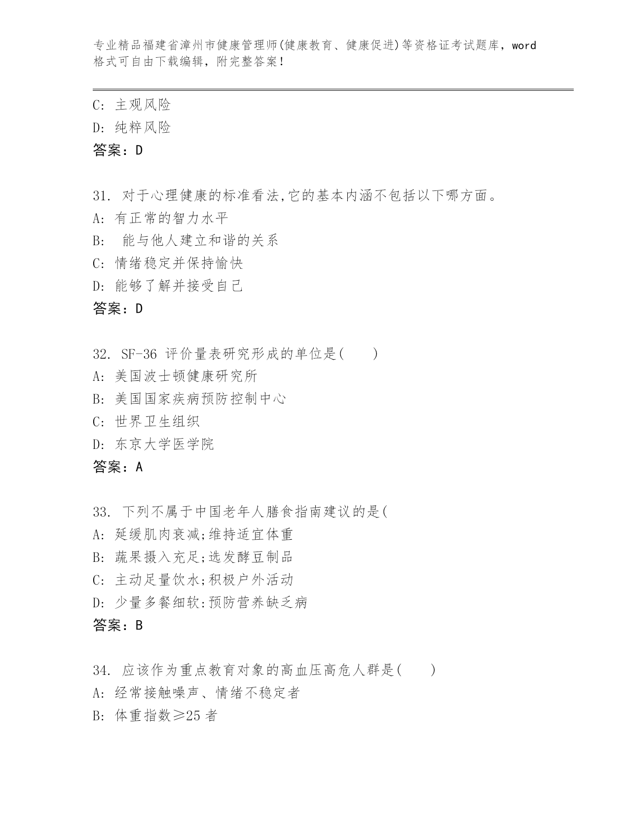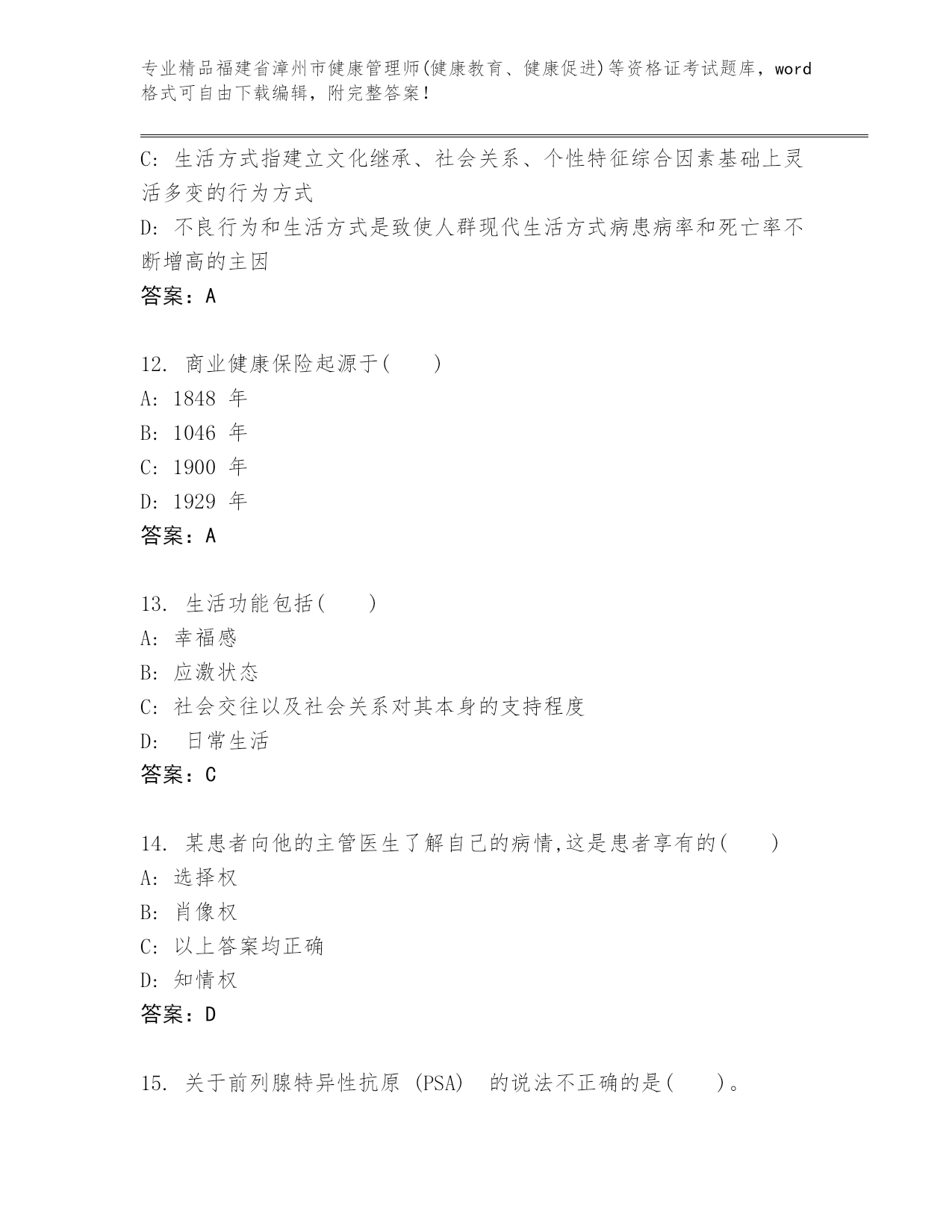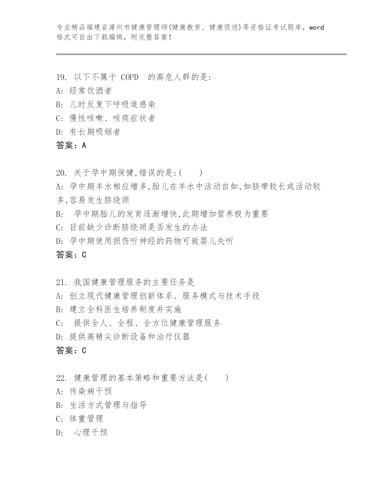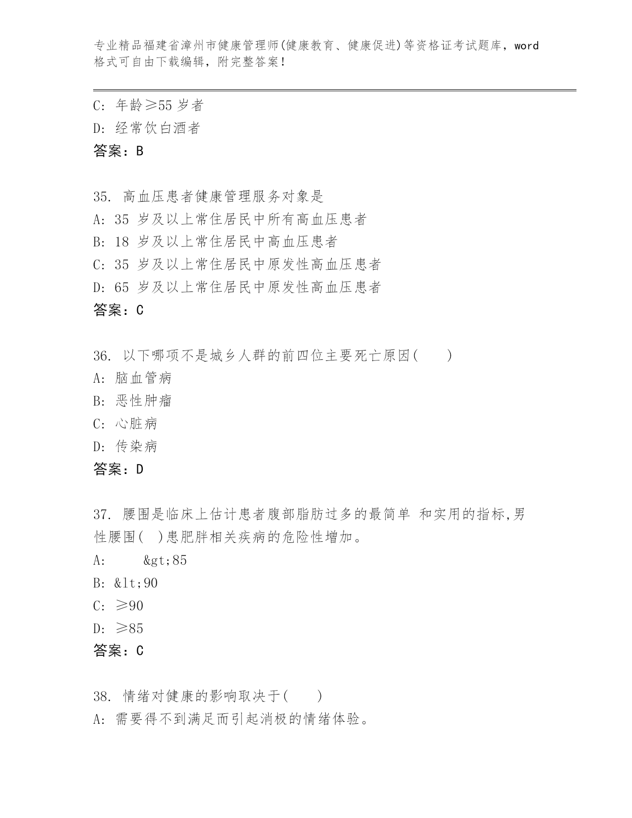 优选福建省漳州市健康管理师(健康教育、健康促进)等资格证考试通用题库及答案【网校专用】