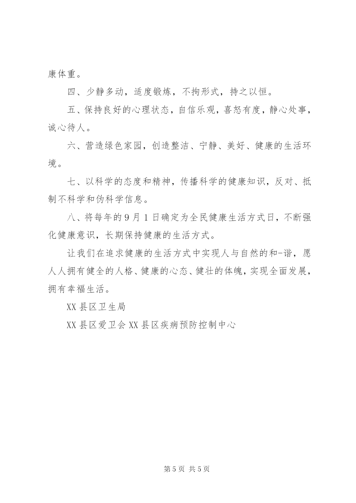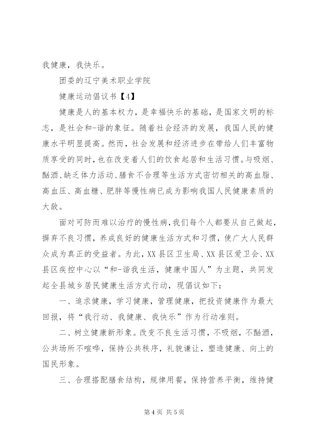 第PAGE\*Arabic\*MERGEFORMAT5页共NUMPAGES\*MERGEFORMAT5页健康运动倡议书健康运动倡议书【1】尊敬的老师、亲爱的同学们大家早上好为了使我们的生命焕发出热情和激-情,为了我们能有一个强壮的身体,更好地学习、工作和生活,希望全体师生都能在工作学习之余,积极参加体育活动。为此,我向全校师生发出倡议:一、树立“健康第一”的理念,提高对体育运动的认识。二、积极参加户外活动,养成良好的锻炼习惯。生命源于运动,运动更是让生活充满阳光。我们要积极行动起来,革除不良的习惯,走向户外,拥抱阳光,活跃于操场、球场,活跃于校园,亲近自然,释放自我。三、强化团结协作精神,大力弘扬奥林匹克精神。让我们在奥运精神的延续下,快乐运动起来,让健身成为增进健康、娱乐身心、发展友谊、完善自我的主要渠道。老师们,同学们,为了我们的学习、生活和事业,为了我们的家庭、学校和祖国,行动起来吧,让我们共同唱响“阳光、健康、和-谐”的旋律,坚持每天锻炼一小时,达到“每天锻炼一小时,幸福生活一辈子”的目标。让体育健身成为我们成长过程的美好经历,成为我们全面发展的不懈追求。老师们,同学们,让我们一起走向操场、走进大自然、走到阳光下,去感受体育的魅力,享受运动的快乐谢谢大家健康运动倡议书【2】老师们、同学们:中国奥林匹克运动的先驱者张伯岑先生说。“教育里没有了体育,教育就不完全”。的确如此,体育不仅能够强身健体,而且处处体现着德育的功能。体育能够调节我们的心理,锤炼我们的意志,提升我们的自信心;体育能够培养我们团结、合作、坚强和友爱的品质;体育能够陶冶我们的情操,启迪我们的智慧,壮美我们的人生;体育更能弘扬我们民族的精神。时至深秋,教育部、国家体育总局、共青团中央决定:从10月27日起开展以“阳光体育与祖国同行”为主题的长跑活动。同学们,“阳光体育”冬季长跑的发令枪已打响,让我们拥抱冬季清晨的阳光,用健康的体魄和饱满的精神迎接生命中的每一天。我们的目标是:每天锻炼一小时,健康工作50年,幸福生活一辈子。古希腊山岩上刻着一句格言:“如果你想变得睿智,跑步吧;如果你想保持健康,跑步吧;如果你想保持健美,跑步吧。”老师们、同学们,让我们一起跑起来,让我们一起动起来吧。让我们坚信:我阳光,我运动、我健康、我快乐。共青团辽宁美术职业学院委员会二0xx年十月二十八日健康运动倡议书【3】老师们、同学们:中国zhangbo奥林匹克运动的先驱对先生说:“教育没有体育、教育是不完全”。事实上,运动不但可以强身健体,并体现在德育的功能。运动能调整我们的心理,培养我们的意志,提升我们的自信心;体育可以培养我们的团结、合作、冬季长跑活动倡议书:“我运动、我健康”坚强、爱质量;体育可以培养我们的感情,我们的智慧的灵感的盛况与我们的生活;体育能弘扬我们越来越多的民族精神。即使在晚秋,教育部、国家体育总局、共青团中央的决定:从10月27日实施“阳光体育和国家同行”为主题的长跑活动。同学们,“阳光体育”冬季长跑的枪已经开始,让我们拥抱冬天的早晨,阳光,有健康的身体和饱满的精神迎接生命中的每一天。我们的目标是:每天锻炼一小时,健康工作五十年,幸福的生活。古希腊的岩石雕刻了一个引用的话:冬季长跑活动倡议书:“我运动、我健康”“如果你想成为有智慧的、运行,如果你想保持健康,运行,如果你想保持健康,健康,运行它。“老师,学生,让我们跑起来,我们走吧。让我们坚信:太阳,我运动,我健康,我快乐。团委的辽宁美术职业学院健康运动倡议书【4】健康是人的基本权力,是幸福快乐的基础,是国家文明的标志,是社会和-谐的象征。随着社会经济的发展,我国人民的健康水平明显提高。然而,社会发展和经济进步在带给人们丰富物质享受的同时,也在改变着人们的饮食起居和生活习惯。与吸烟、酗酒、缺乏体力活动、膳食不合理等生活方式密切相关的高血脂、高血压、高血糖、肥胖等慢性病已成为影响我国人民健康素质的大敌。面对可防而难以治疗的慢性病,我们每个人都要从自己做起,摒弃不良习惯,养成良好的健康生活方式和习惯,使广大人民群众成为真正的受益者。为此,XX县区卫生局、XX县区爱卫会、XX县区疾控中心以“和-谐我生活,健康中国人”为主题,共同发起全县城乡居民健康生活方式行动,现倡议如下:一、追求健康,学习健康,管理健康,把投资健康作为最大回报,将“我行动、我健康、我快乐”作为行动准则。二、树立健康新形象。改变不良生活习惯,不吸烟,不酗酒,公共场所不喧哗,保持公共秩序,礼貌谦让,塑造健康、向上的国民形象。三、合理搭配膳食结构,规律用餐,保持营养平衡,维持健康体重。四、少静多动,适度锻炼,不拘形式,持之以恒。五、保持良好的心理状态,自信乐观,喜怒有度,静心处事,诚心待人。六、营造绿色家园,创造整洁、宁静、美好、