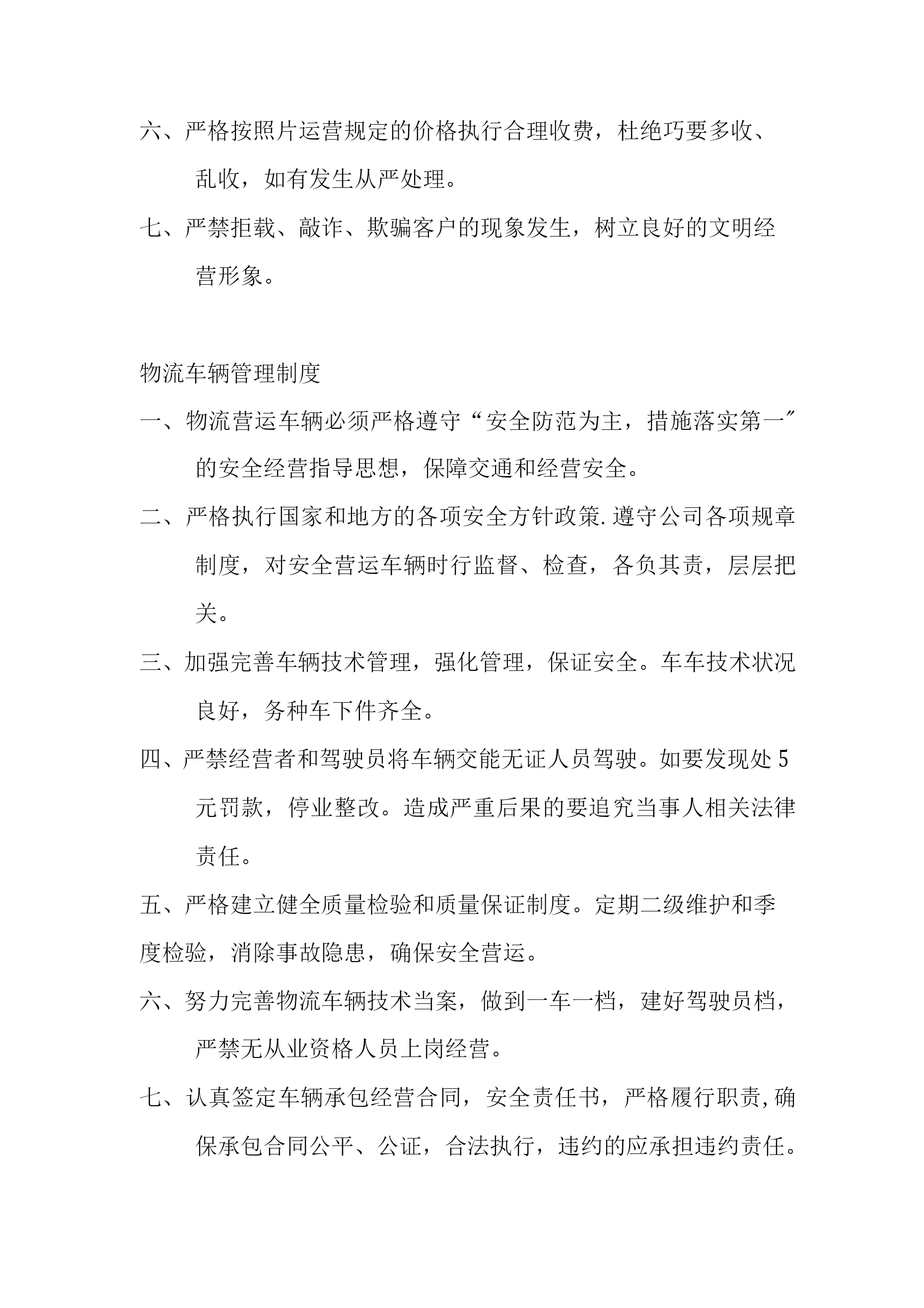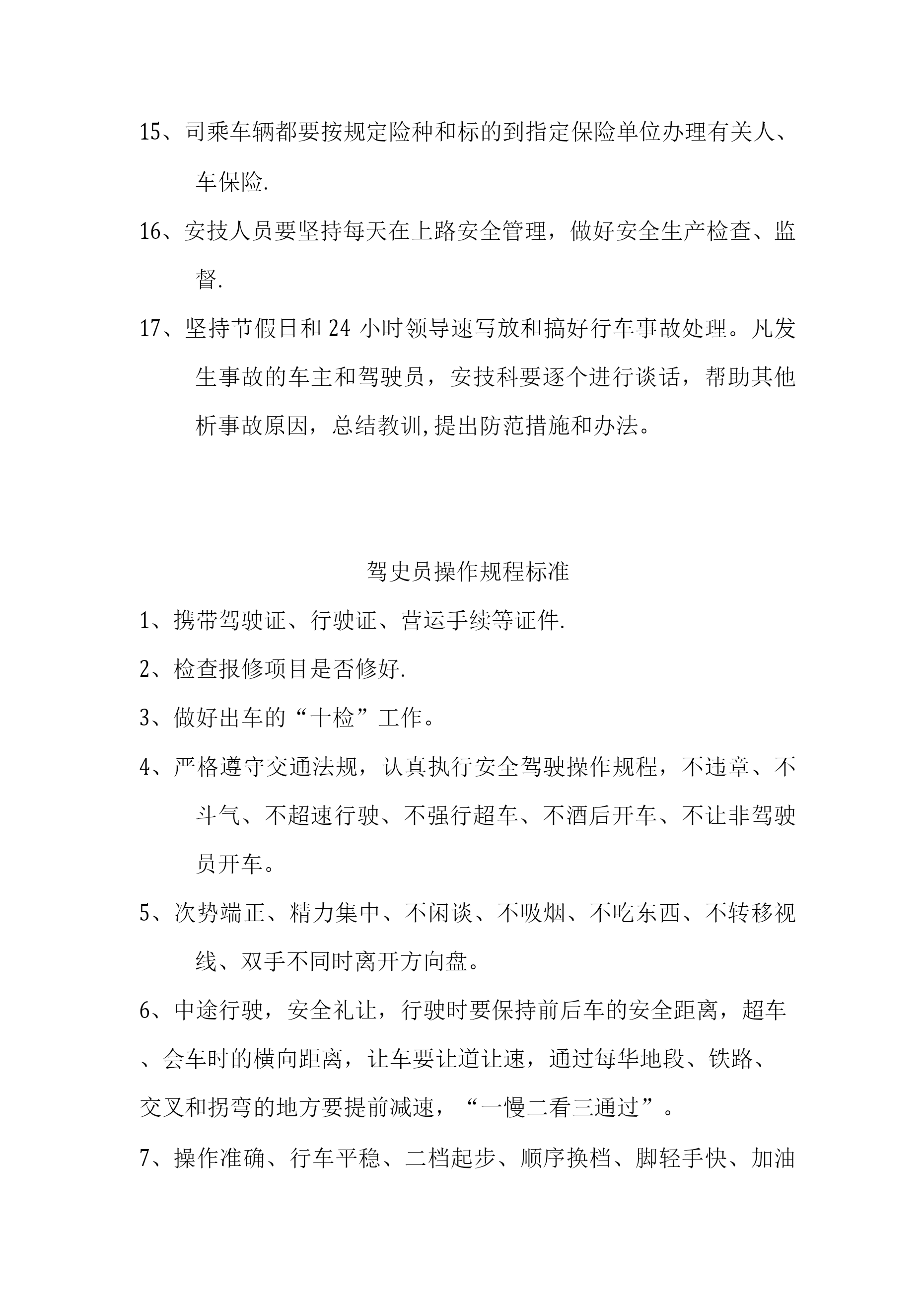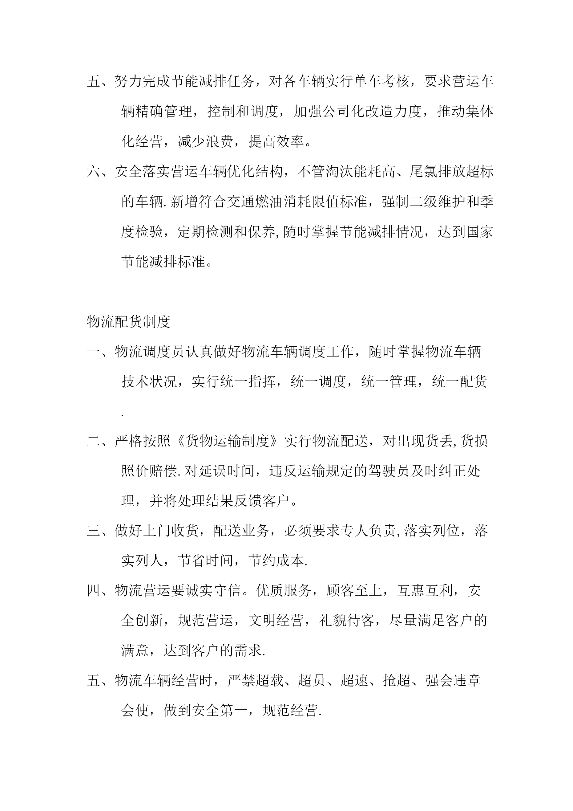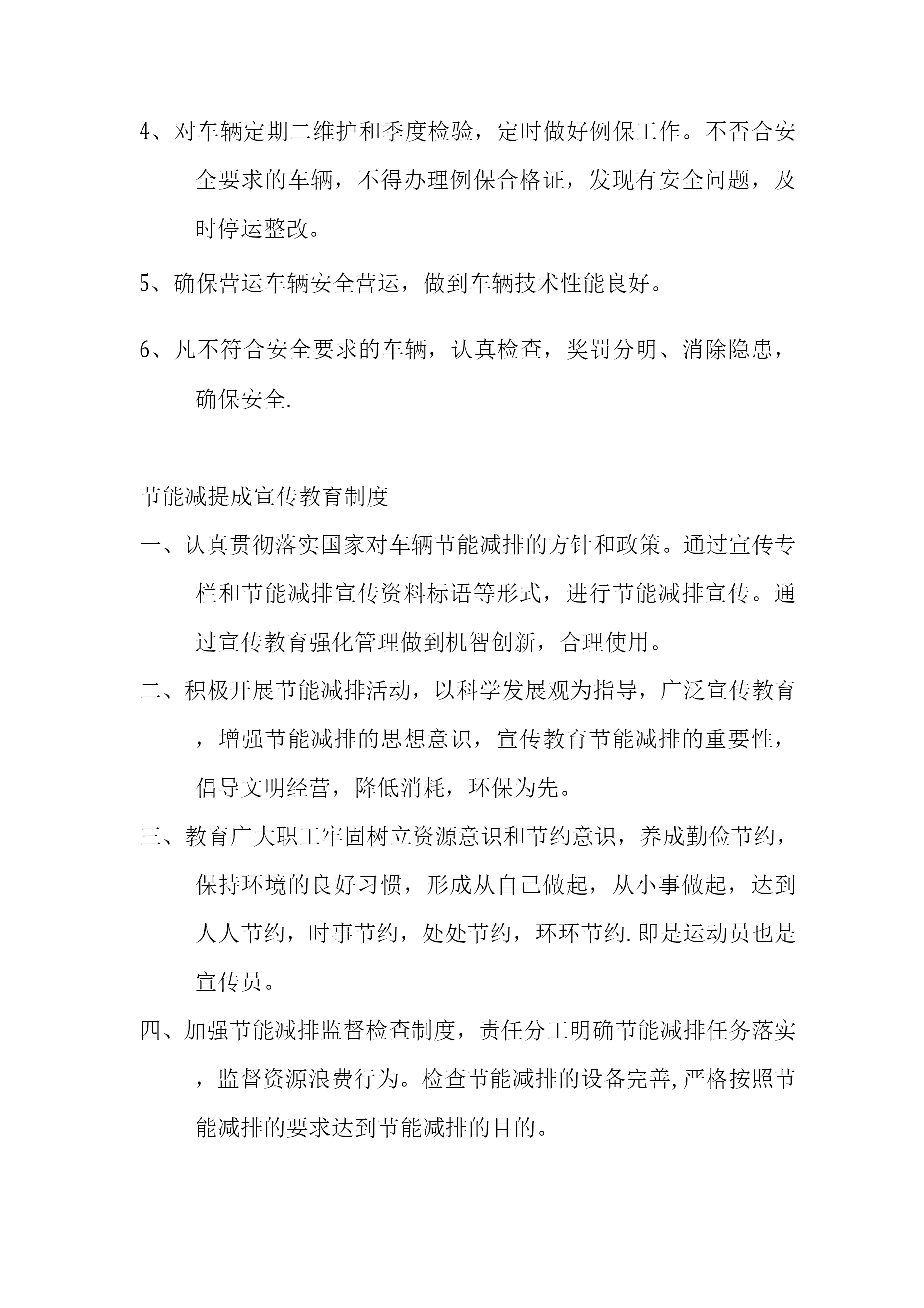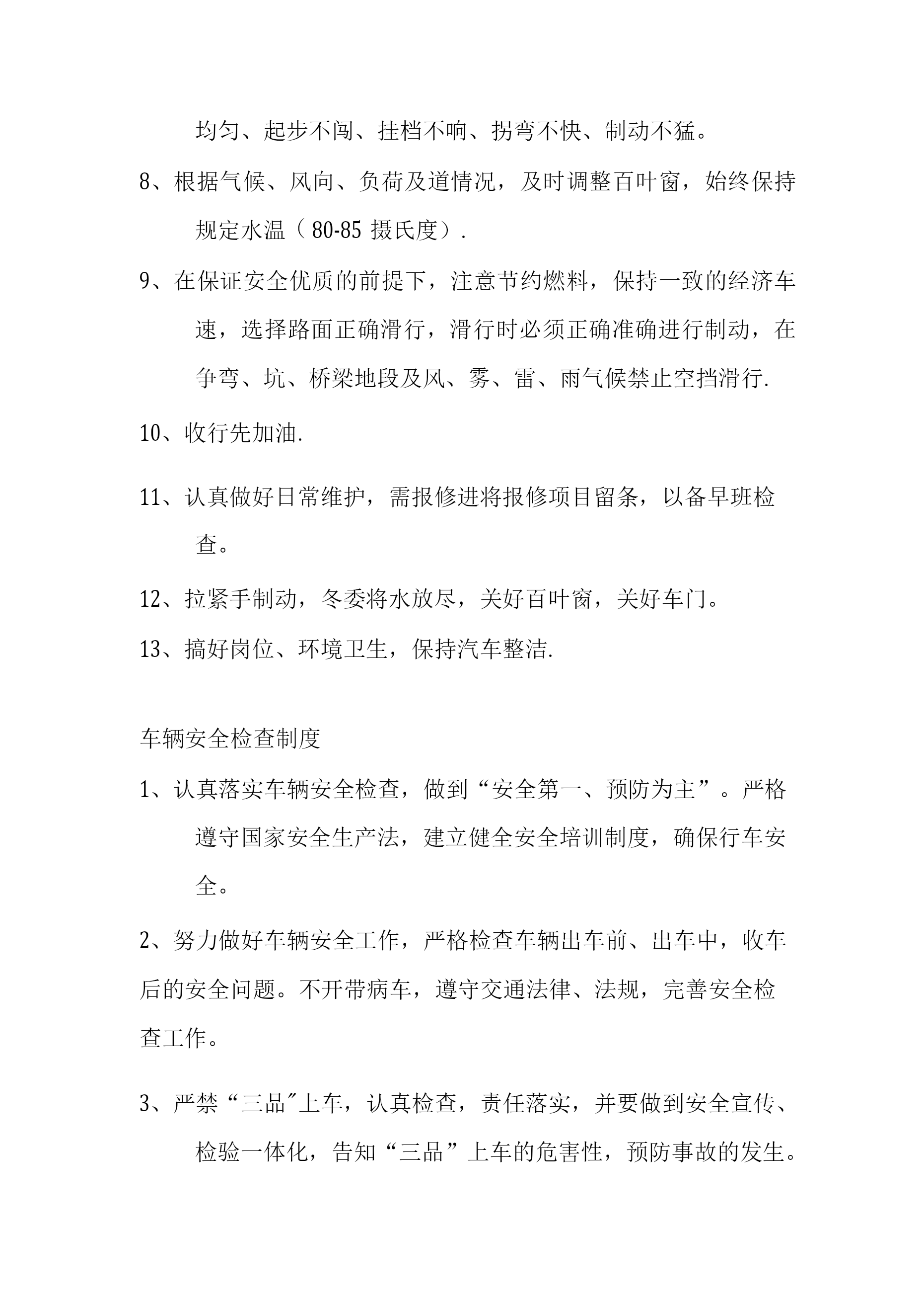 交通事故预防措施1、坚持“安全第一,预防为主”的方针,开展全员安全培训,增强搞好安全生责任感,提高安全意识。2、搞了安全宣传,经常进行事故和典型案例剖析,教育司乘人员克服麻痹和侥幸心理,做到安全警钟常鸣.3、严格驾驶员的选聘关。坚持选用三年以上驾龄、5万公里安全资历和持有客运营运资格证的驾驶员,坚持公司对被聘用驾驶员驾驶技能的实践考核。4、坚持周五安全活动日制度.5、坚持开展好驾驶员对车辆例行保养检查,按例保检验单报班和强制二级维护保持车辆经常于完好状况。6、不准将车交给无证人或暂扣、吊销驾驶证的人驾驶.7、不得酒后开车,更不能醉酒后驾车.8、坚持中速行驶,坚持“礼让三先”,严禁强超抢会,车辆行驶在陡坡、弯道、涵洞等危险地段,要提高警惕,谨慎驾驶。9、行车中不得饮食、闲谈和打手机,集中精力,谨慎行驶.10、保持行车间距,防止发生追尾事故.11、配合车站做好安全防范,杜绝“三危”物品上车。12、春夏季节注意提醒驾驶员劳逸结合,保持足够的睡眠和休息时间,保持充沛的精力。13、定期检查车上配备的灭火器,经常保持其使用性能良好。14、冬季随车携带防滑链等器材。15、司乘车辆都要按规定险种和标的到指定保险单位办理有关人、车保险.16、安技人员要坚持每天在上路安全管理,做好安全生产检查、监督.17、坚持节假日和24小时领导速写放和搞好行车事故处理。凡发生事故的车主和驾驶员,安技科要逐个进行谈话,帮助其他析事故原因,总结教训,提出防范措施和办法。驾史员操作规程标准1、携带驾驶证、行驶证、营运手续等证件.2、检查报修项目是否修好.3、做好出车的“十检”工作。4、严格遵守交通法规,认真执行安全驾驶操作规程,不违章、不斗气、不超速行驶、不强行超车、不酒后开车、不让非驾驶员开车。5、次势端正、精力集中、不闲谈、不吸烟、不吃东西、不转移视线、双手不同时离开方向盘。6、中途行驶,安全礼让,行驶时要保持前后车的安全距离,超车、会车时的横向距离,让车要让道让速,通过每华地段、铁路、交叉和拐弯的地方要提前减速,“一慢二看三通过”。7、操作准确、行车平稳、二档起步、顺序换档、脚轻手快、加油均匀、起步不闯、挂档不响、拐弯不快、制动不猛。8、根据气候、风向、负荷及道情况,及时调整百叶窗,始终保持规定水温(80-85摄氏度).9、在保证安全优质的前提下,注意节约燃料,保持一致的经济车速,选择路面正确滑行,滑行时必须正确准确进行制动,在争弯、坑、桥梁地段及风、雾、雷、雨气候禁止空挡滑行.10、收行先加油.11、认真做好日常维护,需报修进将报修项目留条,以备早班检查。12、拉紧手制动,冬委将水放尽,关好百叶窗,关好车门。13、搞好岗位、环境卫生,保持汽车整洁.车辆安全检查制度1、认真落实车辆安全检查,做到“安全第一、预防为主”。严格遵守国家安全生产法,建立健全安全培训制度,确保行车安全。2、努力做好车辆安全工作,严格检查车辆出车前、出车中,收车后的安全问题。不开带病车,遵守交通法律、法规,完善安全检查工作。3、严禁“三品"上车,认真检查,责任落实,并要做到安全宣传、检验一体化,告知“三品”上车的危害性,预防事故的发生。4、对车辆定期二维护和季度检验,定时做好例保工作。不否合安全要求的车辆,不得办理例保合格证,发现有安全问题,及时停运整改。5、确保营运车辆安全营运,做到车辆技术性能良好。6、凡不符合安全要求的车辆,认真检查,奖罚分明、消除隐患,确保安全.节能减提成宣传教育制度一、认真贯彻落实国家对车辆节能减排的方针和政策。通过宣传专栏和节能减排宣传资料标语等形式,进行节能减排宣传。通过宣传教育强化管理做到机智创新,合理使用。二、积极开展节能减排活动,以科学发展观为指导,广泛宣传教育,增强节能减排的思想意识,宣传教育节能减排的重要性,倡导文明经营,降低消耗,环保为先。三、教育广大职工牢固树立资源意识和节约意识,养成勤俭节约,保持环境的良好习惯,形成从自己做起,从小事做起,达到人人节约,时事节约,处处节约,环环节约.即是运动员也是宣传员。四、加强节能减排监督检查制度,责任分工明确节能减排任务落实,监督资源浪费行为。检查节能减排的设备完善,严格按照节能减排的要求达到节能减排的目的。五、努力完成节能减排任务,对各车辆实行单车考核,要求营运车辆精确管理,控制和调度,加强公司化改造力度,推动集体化经营,减少浪费,提高效率。六、安全落实营运车辆优化结构,不管淘汰能耗高、尾氯排放超标的车辆.新增符合交通燃油消耗限值标准,强制二级维护和季度检验,定期检测和保养,随时掌握节能减排情况,达到国家节能减排标准。物流配货制度一、物流调度员认真做好物流车辆调度工作,随时掌握物流车辆技术状况,实行统一指挥,统