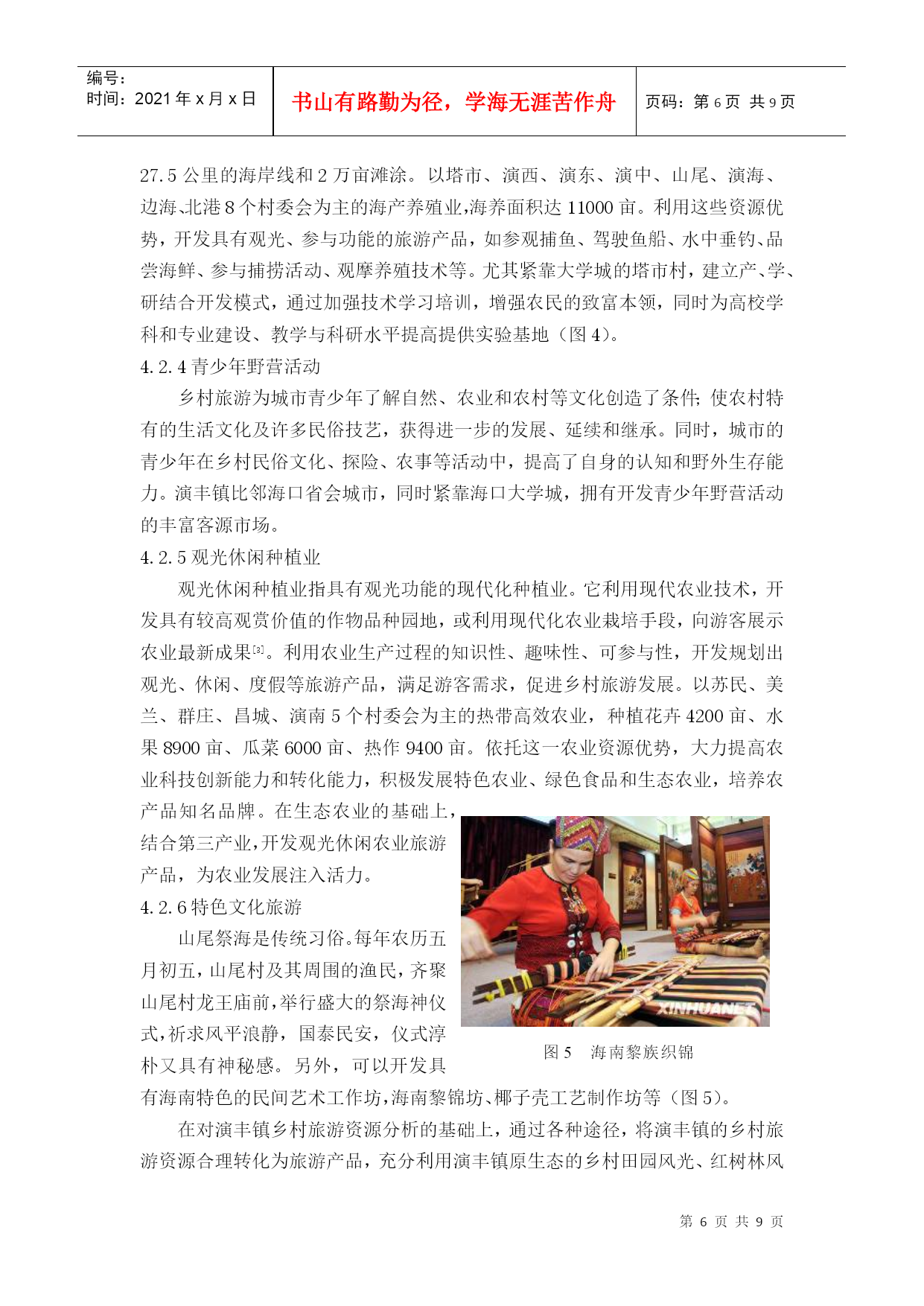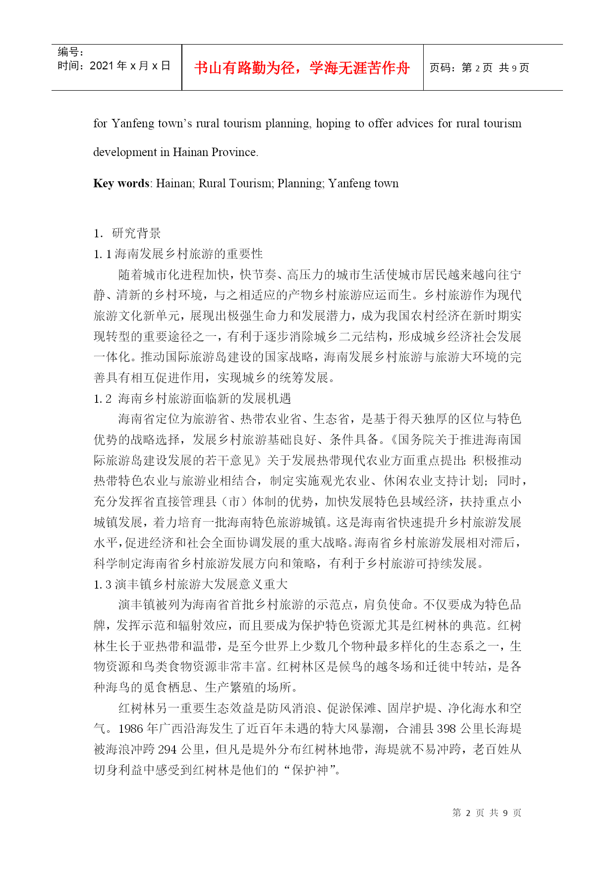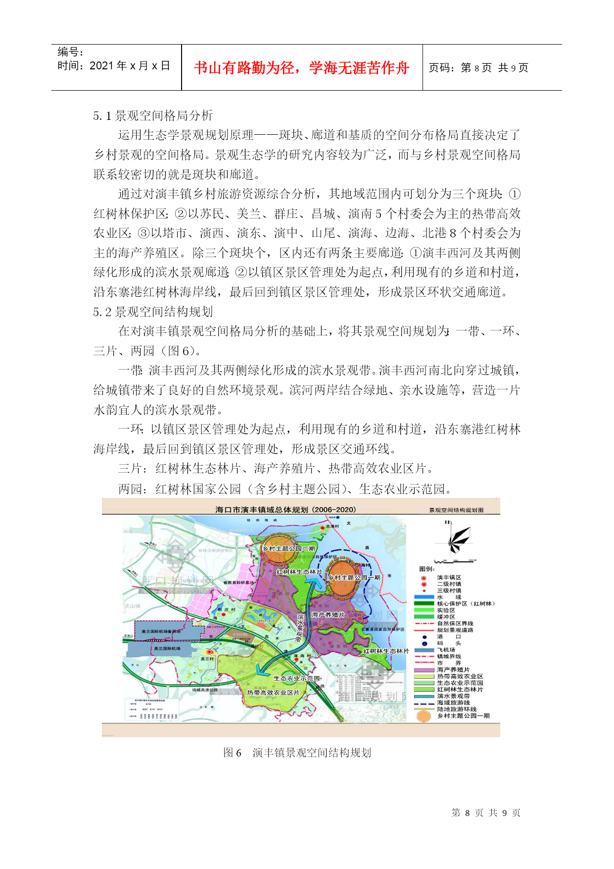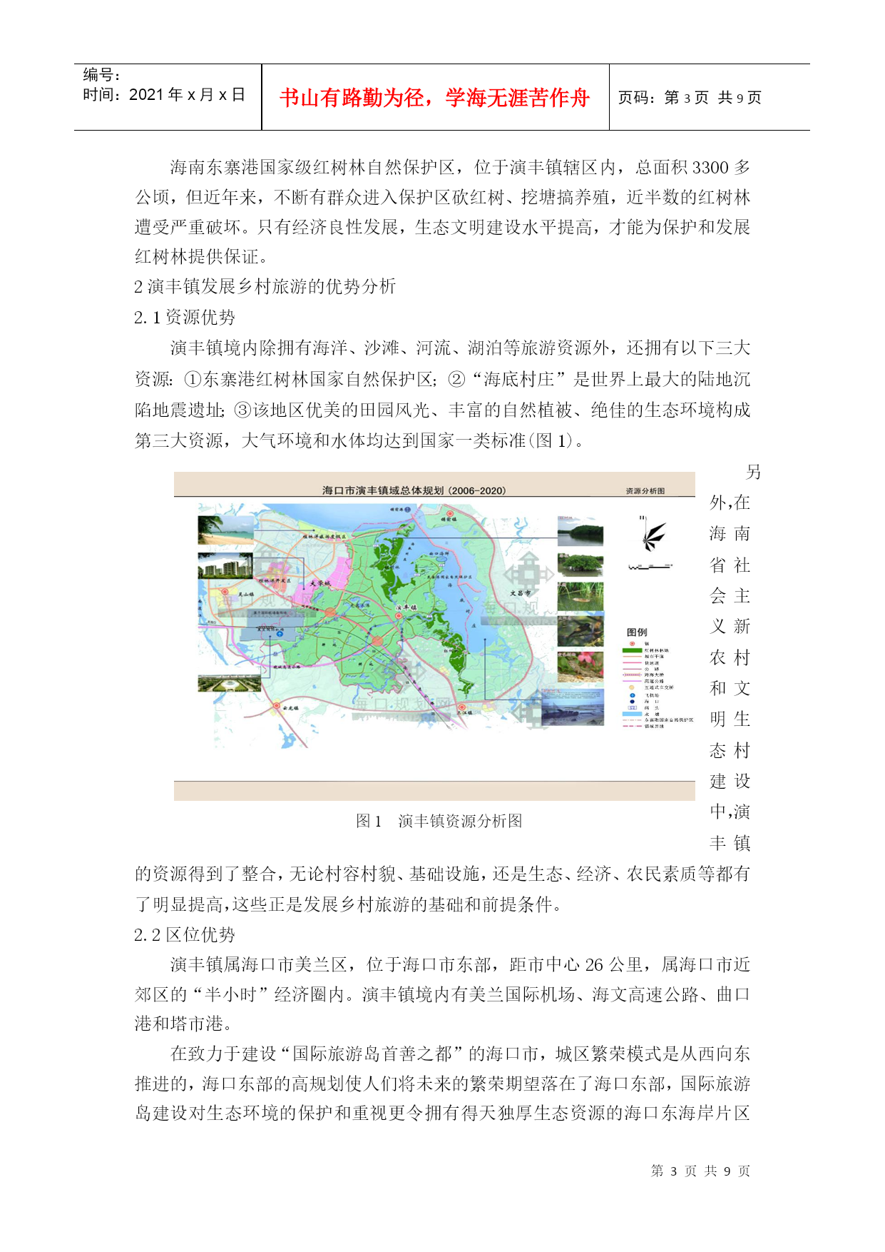 编号:时间:2021年x月x日书山有路勤为径,学海无涯苦作舟页码:第PAGE9页共NUMPAGES9页第PAGE\*MERGEFORMAT9页共NUMPAGES\*MERGEFORMAT9页HYPERLINK""海南乡村旅游规划实践——以海口市美兰区演丰镇为例PracticeofHainanRuralTourismPlanning——CasestudyofYanfengtown,MeilanDistrict,HaikouCity摘要:《国务院关于推进海南国际旅游岛建设发展的若干意见》提出要制定实施观光农业、休闲农业支持计划,着力培育一批海南特色旅游城镇。如何抓住战略机遇,打造海南乡村旅游特色品牌,辐射带动海南乡村旅游全面快速发展,被列为海南省首批乡村旅游示范点之一的演丰镇肩负着重要使命。本文在乡村旅游规划理论体系的基础上,结合海南省乡村旅游发展,深入分析演丰镇旅游资源条件,提出了演丰镇乡村旅游规划思路,希望能为海南省乡村旅游发展提供参考。关键词:海南乡村旅游规划演丰镇Abstract:"TheProposalsofPromotingtheConstructionandDevelopmentofHainanInternationalTourismIsland,StateCouncil"putsforwardtomakesupportsintheimplementationoftourismagriculture,leisureagricultureandtostrivetofosteranumberoftouristtownsinHainan.YanfengtownislistedasoneofthefirstdemonstrationsofruraltourisminHainanProvince.HowtoseizethestrategicopportunitiestocreateHainanruraltourismbrandandradiantlydriverapidandcomprehensivedevelopment?Yanfengtowntakestheimportantmission.Basedonthetheoryofruraltourismplanning,thispaperconsideringthedevelopmentofruraltourismmakesdeepanalysisofYanfengtown’stourismresourcesandproposesideasforYanfengtown’sruraltourismplanning,hopingtoofferadvicesforruraltourismdevelopmentinHainanProvince.Keywords:Hainan;RuralTourism;Planning;Yanfengtown1.研究背景1.1海南发展乡村旅游的重要性随着城市化进程加快,快节奏、高压力的城市生活使城市居民越来越向往宁静、清新的乡村环境,与之相适应的产物乡村旅游应运而生。乡村旅游作为现代旅游文化新单元,展现出极强生命力和发展潜力,成为我国农村经济在新时期实现转型的重要途径之一,有利于逐步消除城乡二元结构,形成城乡经济社会发展一体化。推动国际旅游岛建设的国家战略,海南发展乡村旅游与旅游大环境的完善具有相互促进作用,实现城乡的统筹发展。1.2海南乡村旅游面临新的发展机遇海南省定位为旅游省、热带农业省、生态省,是基于得天独厚的区位与特色优势的战略选择,发展乡村旅游基础良好、条件具备。《国务院关于推进海南国际旅游岛建设发展的若干意见》关于发展热带现代农业方面重点提出:积极推动热带特色农业与旅游业相结合,制定实施观光农业、休闲农业支持计划;同时,充分发挥省直接管理县(市)体制的优势,加快发展特色县域经济,扶持重点小城镇发展,着力培育一批海南特色旅游城镇。这是海南省快速提升乡村旅游发展水平,促进经济和社会全面协调发展的重大战略。海南省乡村旅游发展相对滞后,科学制定海南省乡村旅游发展方向和策略,有利于乡村旅游可持续发展。1.3演丰镇乡村旅游大发展意义重大演丰镇被列为海南省首批乡村旅游的示范点,肩负使命。不仅要成为特色品牌,发挥示范和辐射效应,而且要成为保护特色资源尤其是红树林的典范。红树林生长于亚热带和温带,是至今世界上少数几个物种最多样化的生态系之一,生物资源和鸟类食物资源非常丰富。红树林区是候鸟的越冬场和迁徙中转站,是各种海鸟的觅食栖息、生产繁殖的场所。红树林另一重要生态效益是防风消浪、促淤保滩、固岸护堤、净化海水和空气。1986年广西沿海发生了近百年未遇的特大风暴潮,合浦县398公里长