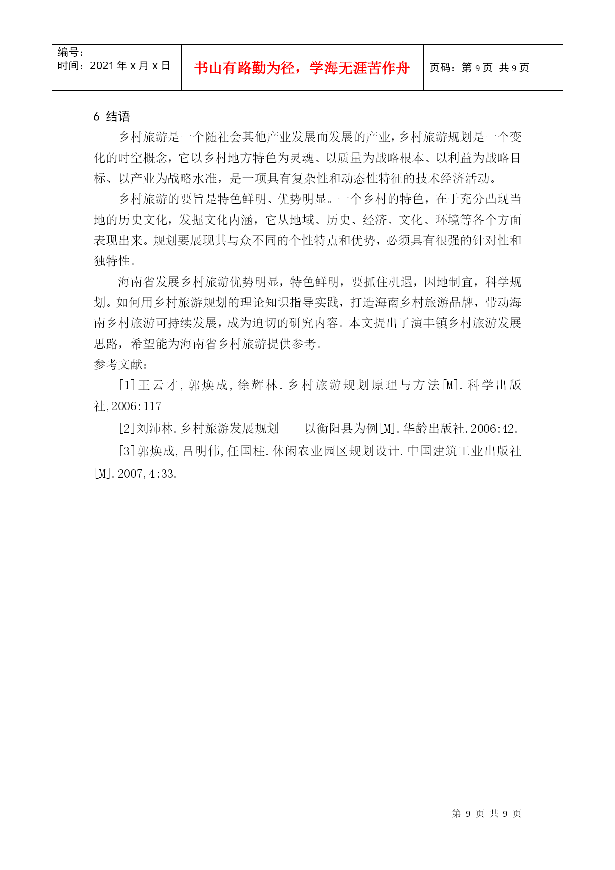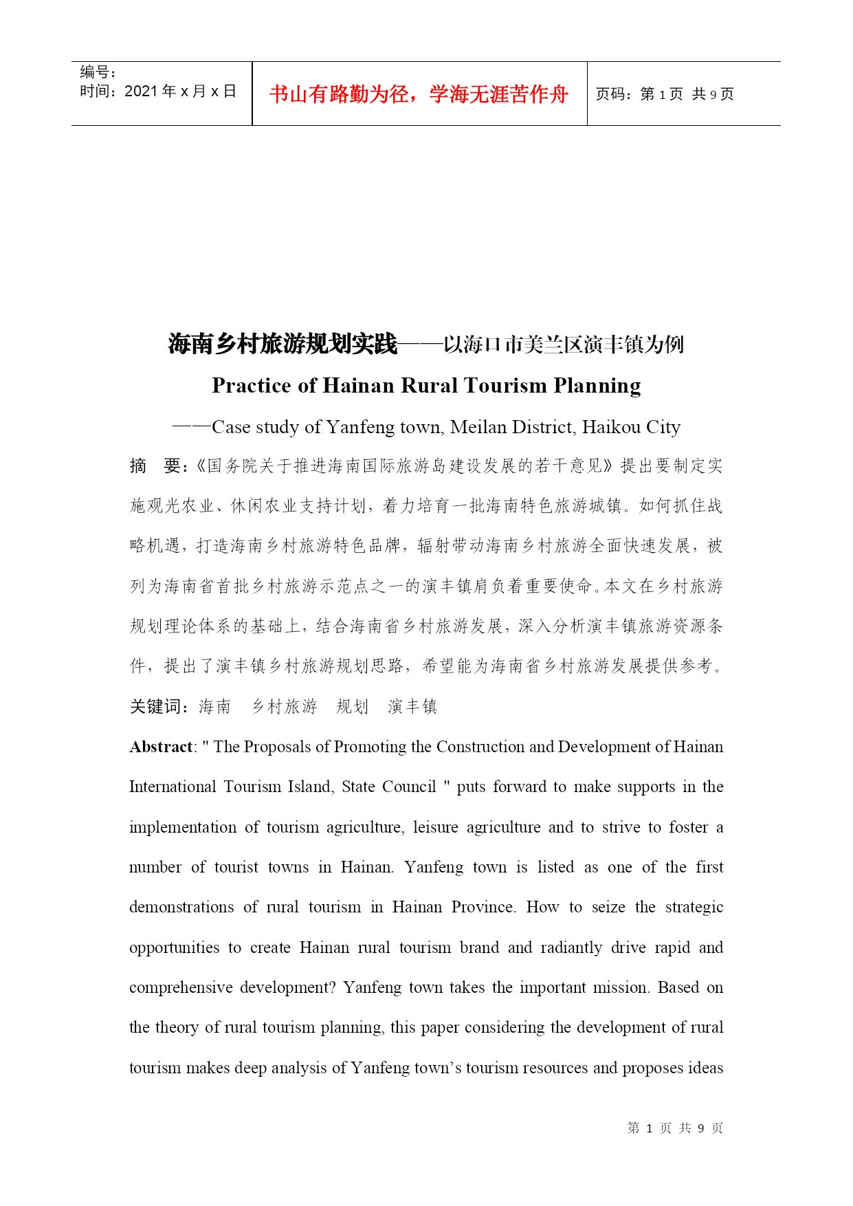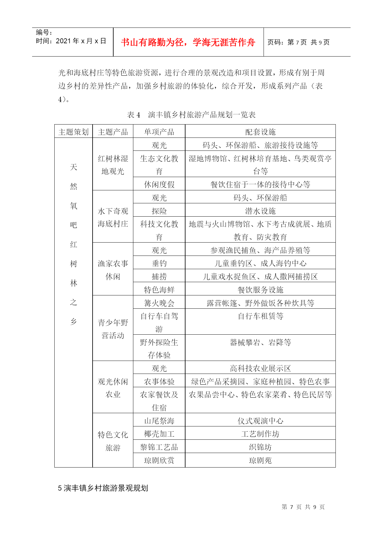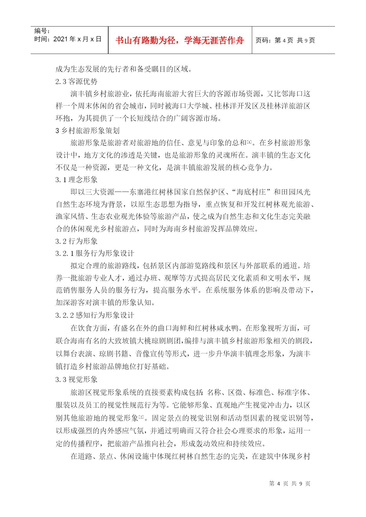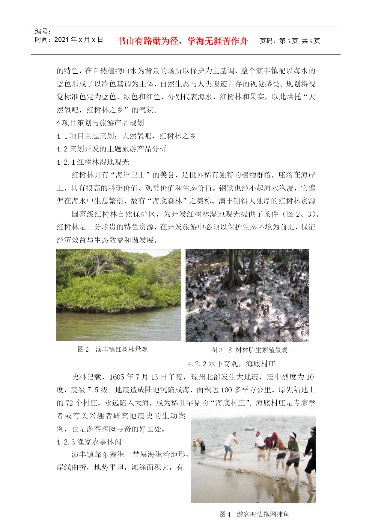 编号:时间:2021年x月x日书山有路勤为径,学海无涯苦作舟页码:第PAGE9页共NUMPAGES9页第PAGE\*MERGEFORMAT9页共NUMPAGES\*MERGEFORMAT9页HYPERLINK""海南乡村旅游规划实践——以海口市美兰区演丰镇为例PracticeofHainanRuralTourismPlanning——CasestudyofYanfengtown,MeilanDistrict,HaikouCity摘要:《国务院关于推进海南国际旅游岛建设发展的若干意见》提出要制定实施观光农业、休闲农业支持计划,着力培育一批海南特色旅游城镇。如何抓住战略机遇,打造海南乡村旅游特色品牌,辐射带动海南乡村旅游全面快速发展,被列为海南省首批乡村旅游示范点之一的演丰镇肩负着重要使命。本文在乡村旅游规划理论体系的基础上,结合海南省乡村旅游发展,深入分析演丰镇旅游资源条件,提出了演丰镇乡村旅游规划思路,希望能为海南省乡村旅游发展提供参考。关键词:海南乡村旅游规划演丰镇Abstract:"TheProposalsofPromotingtheConstructionandDevelopmentofHainanInternationalTourismIsland,StateCouncil"putsforwardtomakesupportsintheimplementationoftourismagriculture,leisureagricultureandtostrivetofosteranumberoftouristtownsinHainan.YanfengtownislistedasoneofthefirstdemonstrationsofruraltourisminHainanProvince.HowtoseizethestrategicopportunitiestocreateHainanruraltourismbrandandradiantlydriverapidandcomprehensivedevelopment?Yanfengtowntakestheimportantmission.Basedonthetheoryofruraltourismplanning,thispaperconsideringthedevelopmentofruraltourismmakesdeepanalysisofYanfengtown’stourismresourcesandproposesideasforYanfengtown’sruraltourismplanning,hopingtoofferadvicesforruraltourismdevelopmentinHainanProvince.Keywords:Hainan;RuralTourism;Planning;Yanfengtown1.研究背景1.1海南发展乡村旅游的重要性随着城市化进程加快,快节奏、高压力的城市生活使城市居民越来越向往宁静、清新的乡村环境,与之相适应的产物乡村旅游应运而生。乡村旅游作为现代旅游文化新单元,展现出极强生命力和发展潜力,成为我国农村经济在新时期实现转型的重要途径之一,有利于逐步消除城乡二元结构,形成城乡经济社会发展一体化。推动国际旅游岛建设的国家战略,海南发展乡村旅游与旅游大环境的完善具有相互促进作用,实现城乡的统筹发展。1.2海南乡村旅游面临新的发展机遇海南省定位为旅游省、热带农业省、生态省,是基于得天独厚的区位与特色优势的战略选择,发展乡村旅游基础良好、条件具备。《国务院关于推进海南国际旅游岛建设发展的若干意见》关于发展热带现代农业方面重点提出:积极推动热带特色农业与旅游业相结合,制定实施观光农业、休闲农业支持计划;同时,充分发挥省直接管理县(市)体制的优势,加快发展特色县域经济,扶持重点小城镇发展,着力培育一批海南特色旅游城镇。这是海南省快速提升乡村旅游发展水平,促进经济和社会全面协调发展的重大战略。海南省乡村旅游发展相对滞后,科学制定海南省乡村旅游发展方向和策略,有利于乡村旅游可持续发展。1.3演丰镇乡村旅游大发展意义重大演丰镇被列为海南省首批乡村旅游的示范点,肩负使命。不仅要成为特色品牌,发挥示范和辐射效应,而且要成为保护特色资源尤其是红树林的典范。红树林生长于亚热带和温带,是至今世界上少数几个物种最多样化的生态系之一,生物资源和鸟类食物资源非常丰富。红树林区是候鸟的越冬场和迁徙中转站,是各种海鸟的觅食栖息、生产繁殖的场所。红树林另一重要生态效益是防风消浪、促淤保滩、固岸护堤、净化海水和空气。1986年广西沿海发生了近百年未遇的特大风暴潮,合浦县398公里长