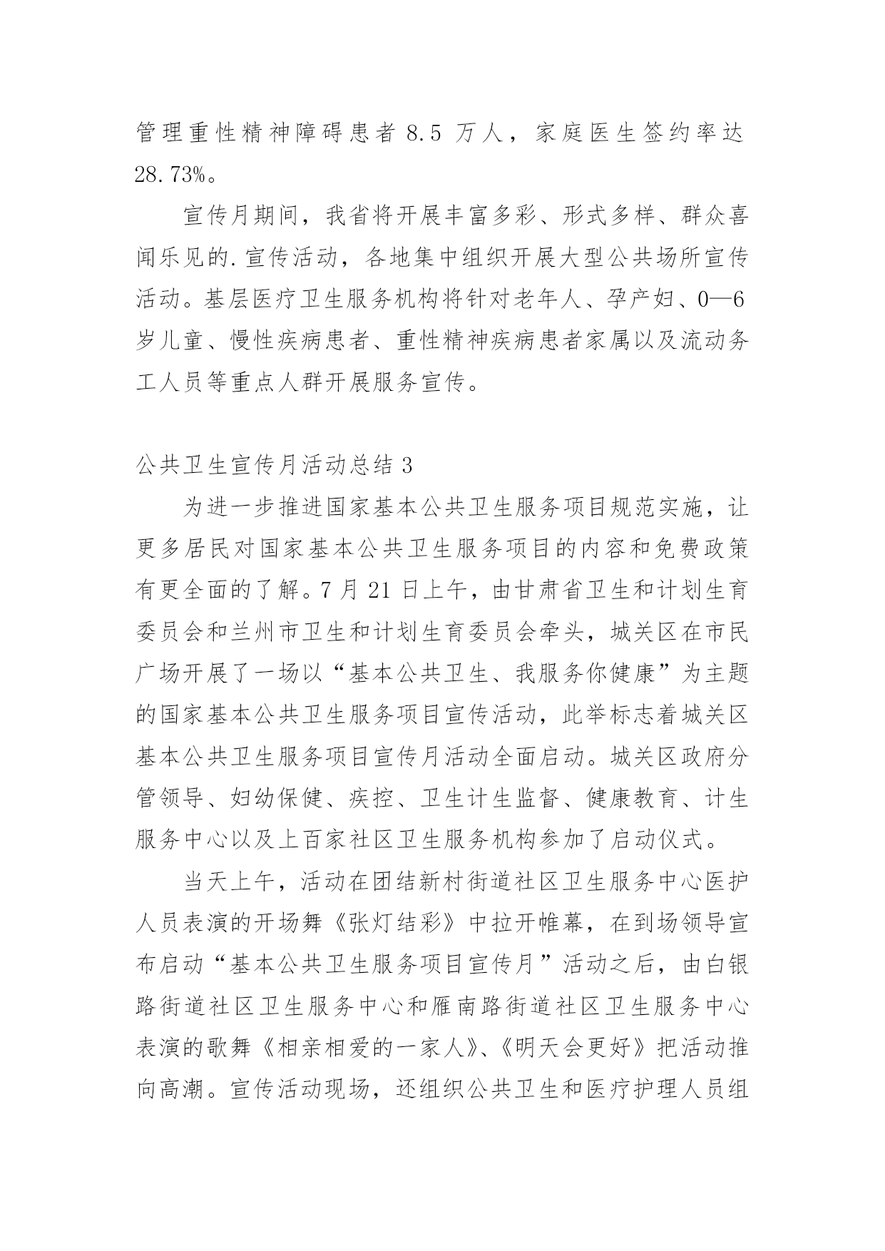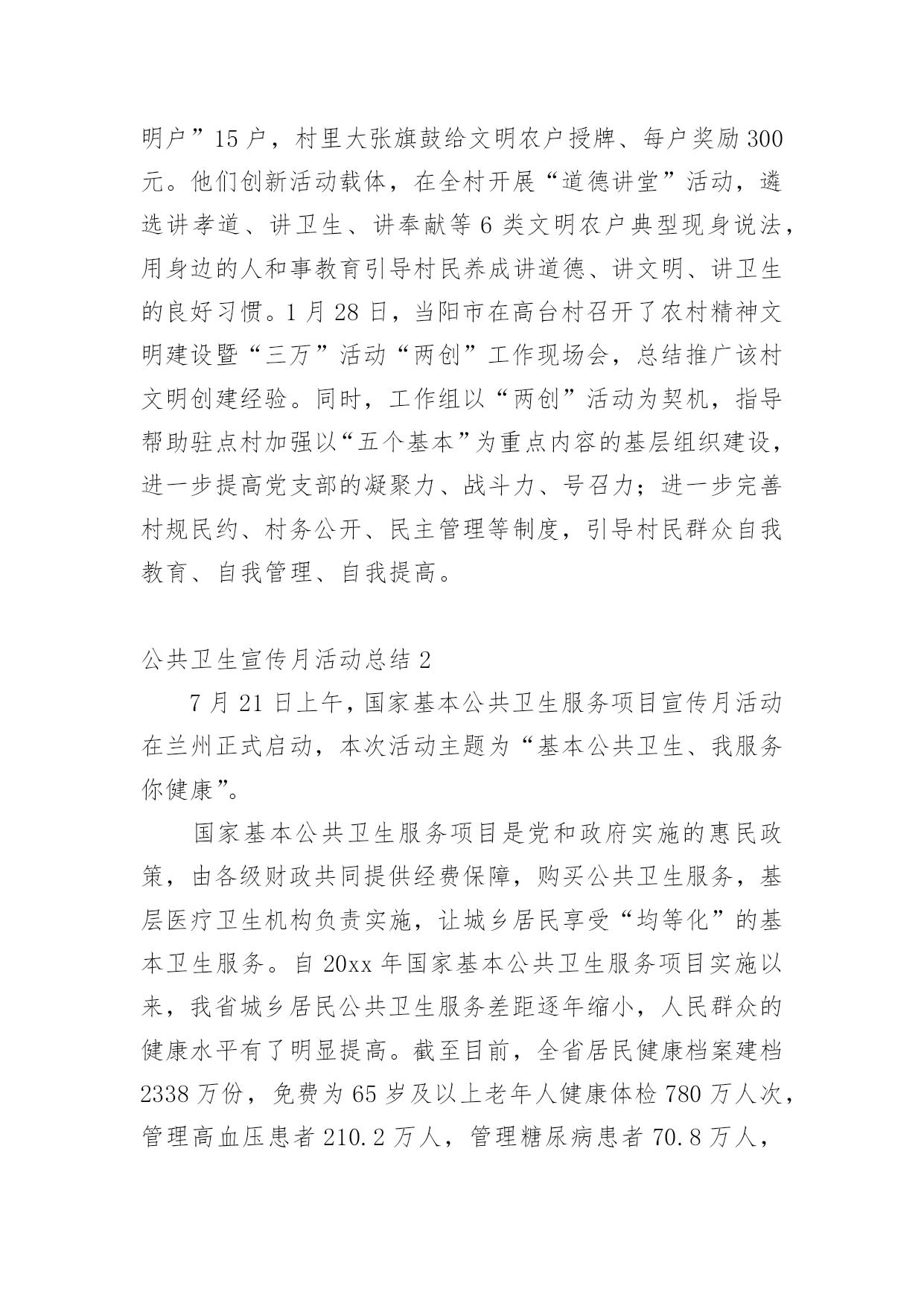 公共卫生宣传月活动总结总结是指对某一阶段的工作、学习或思想中的经验或情况进行分析研究,做出带有规律性结论的书面材料,它能够给人努力工作的动力,因此我们需要回头归纳,写一份总结了。那么总结要注意有什么内容呢?以下是小编整理的公共卫生宣传月活动总结,希望对大家有所帮助。公共卫生宣传月活动总结1根据省和当阳市“三万”活动办公室安排,省农垦局新一轮“三万”活动驻点村为草埠湖农场(镇)高台、台渡队(村),河溶镇郭家场、观基寺等四个村(队)。四个驻点村(队)共有23个村民小组,2538户,9231人,其中村“两委”班子成员22人,中共党员350人。近四个月来,在省委、省政府的正确领导下,在省新一轮“三万”活动办及宜昌片长单位省直机关工委的指导和支持下,省农垦局新一轮“三万”活动工作组紧紧围绕“洁万家”活动目标任务要求,紧紧依靠当地党委、政府和驻点村“两委”,精心组织,认真谋划,迅速行动,整体推进,取得了明显成效。村庄环境面貌明显改观,农村基础设施和环卫设施建设明显加强,农村人居环境明显改善,村民生活习惯得到改进,有力地推进了新农村建设。现将“三万”活动有关工作总结如下:一、以转作风、办实事、惠民生为着眼点,强化组织领导局党组对“三万”活动高度重视,一致认为“三万”活动是转变机关作风、密切党群干群关系、造福百姓惠民生的重要举措。农垦作为农业的国家队,不仅要在发展现代农业方面起示范引领作用,更应在新农村建设上带头示范。在“三万”活动中,我们做到了认识到位、机构到位,人员到位、资金保障到位、活动组织到位、检查督导到位。比如,省“三万”活动动员会后的第二天,局党组召开了专题会议,研究部署新一轮“三万”工作,成立了由阮英梓局长为组长,副局长胡超、李寿垓和纪检组长经建新为副组长,5个相关职能处室负责人为成员的活动领导小组,抽选6名骨干组成工作组。再比如,为推动“三万”活动掀高潮,20xx年12月25日,局领导带领机关干部到台渡村组织了以参加一次植树劳动、一次政策宣传、一次走访慰问、一次“双联双促”结对户家访、撰写一篇民情日记为主要内容的“五个一”活动。主要作法是建立“六制”,强力推动。一是建立局领导专题研究督导机制。局党组经常研究“三万”工作,局长阮英梓经常听取工作组工作情况汇报,并就做好“三万”工作出点子提要求。1月15日,阮英梓同志到驻点村调研、指导“三万”工作,在高台村与两个镇党委书记、四个驻点村的书记进行座谈,对扎实做好“三万”活动提出了明确要求,并走访慰问了贫困户和老党员、老干部和返乡农民工。副局长胡超作为局带队领导,不顾手术后的伤痛,出院第五天便带着工作队员到驻点村,对“三万”活动亲自谋划亲自抓,坚持每月两周时间到驻点村走访调研、督导协调有关工作。二是建立工作队员分工负责和联系会商机制。工作组成立了临时党支部,并明确工作任务和职责分工。去年12月4日,工作队员分别进驻4个驻点村开展工作。坚持每周召开一次碰头会,总结分析本周“三万”工作,查找不足,安排下阶段有关工作,并每天记录工作台账。三是建立沟通协调机制。积极做好与省“三万”活动办、片长单位和当地党委政府及驻点村的沟通协调工作。四是建立经费保障机制。在保证帮扶驻点村环境整治资金50万元到位同时,局里还安排了“三万”活动专项经费,确保工作正常运转。五是建立纪律约束机制。工作组在省里“六不准”工作纪律的基础上又增加了两条“不准”(不准在网络、微博上发表不利于农村发展稳定的文章和图片;不准擅离职守,随意外出),建立了“八不准”制度。四个月来,队员坚持按照“八不准”要求办事,与处室工作脱钩,保证长驻驻点村工作,并吃住在村组,与当地农民群众同劳动。六是工作公开机制。将工作组工作目标任工作职责、整治项目、工作纪律、联系电话上墙上栏,向社会公布,接受群众监督。二、以发挥群众主体作用为着力点,广泛宣传发动工作组坚持把宣传政策、发动群众贯穿整个“三万”活动始终,通过多形式多途径宣传引导,广泛动员农民群众发挥主体作用,积极参与到“整治村庄环境,建设美丽家园,促进生态文明”主题实践活动中来。一是通过召开镇村干部、老党员、老干部、老模范、致富能人座谈会和村民代表动员大会,广征民意,宣传发动。二是走访农户,共走访72户农家,春节前,还走访慰问了四个驻点村40家贫困户和困难老党员、老干部,发放慰问资金和物资2万多元。三是印发“三万”活动和“两创”工作有关政策知识宣传单5200份。工作组还向驻点村农家书屋赠送《十八大报告学习辅导百问》、湖北省小麦主推品种“鄂麦596”栽培技术等图书和宣传资料250册。四是各驻点村分别举办“三万”和“两创”活动宣传栏,在公路沿线和村民集中居住点悬挂宣传标语21条,利用村广播站广播等多种形式营造氛围,形成声势,使党的十八大精神以及新一轮“三万”活动的重要意义、主要任务和总体要求家喻户