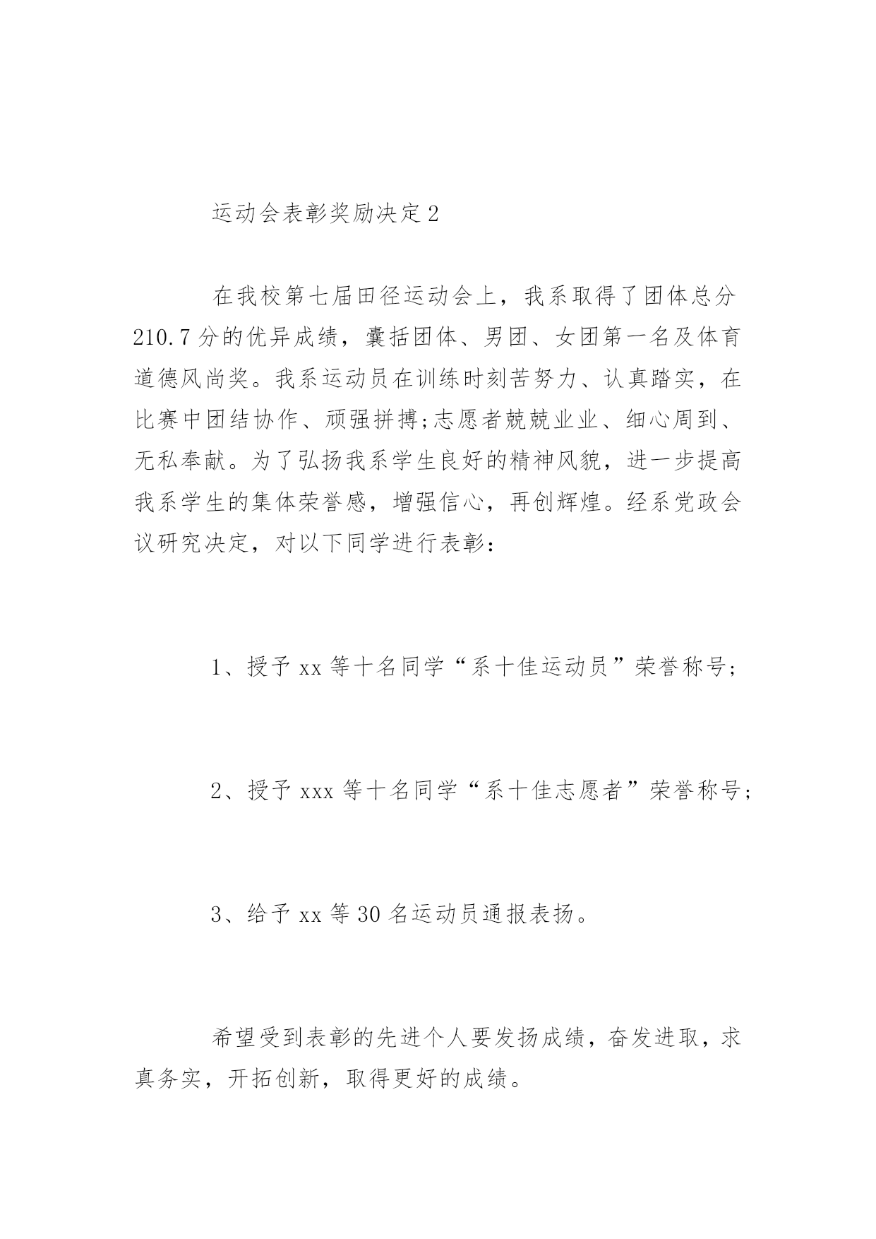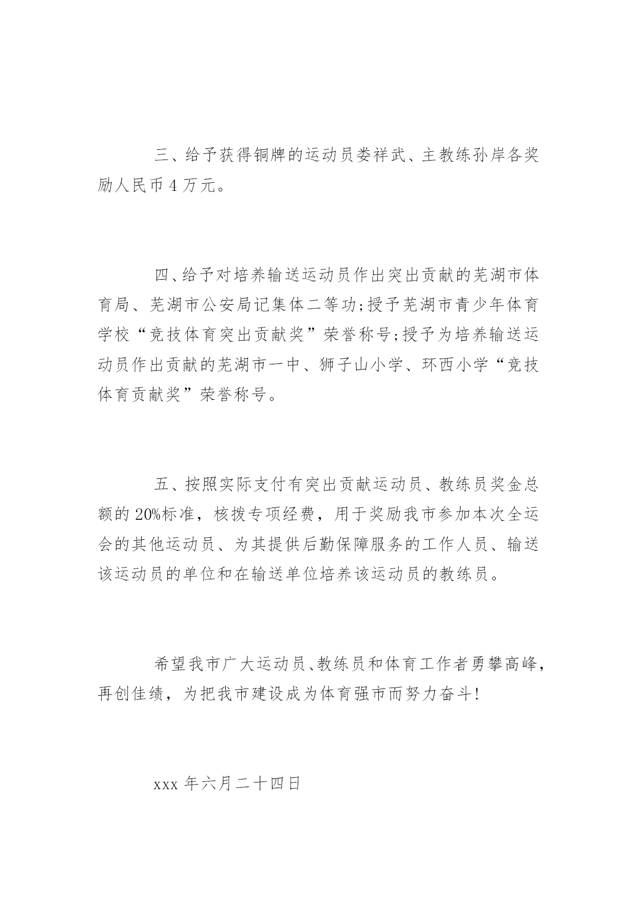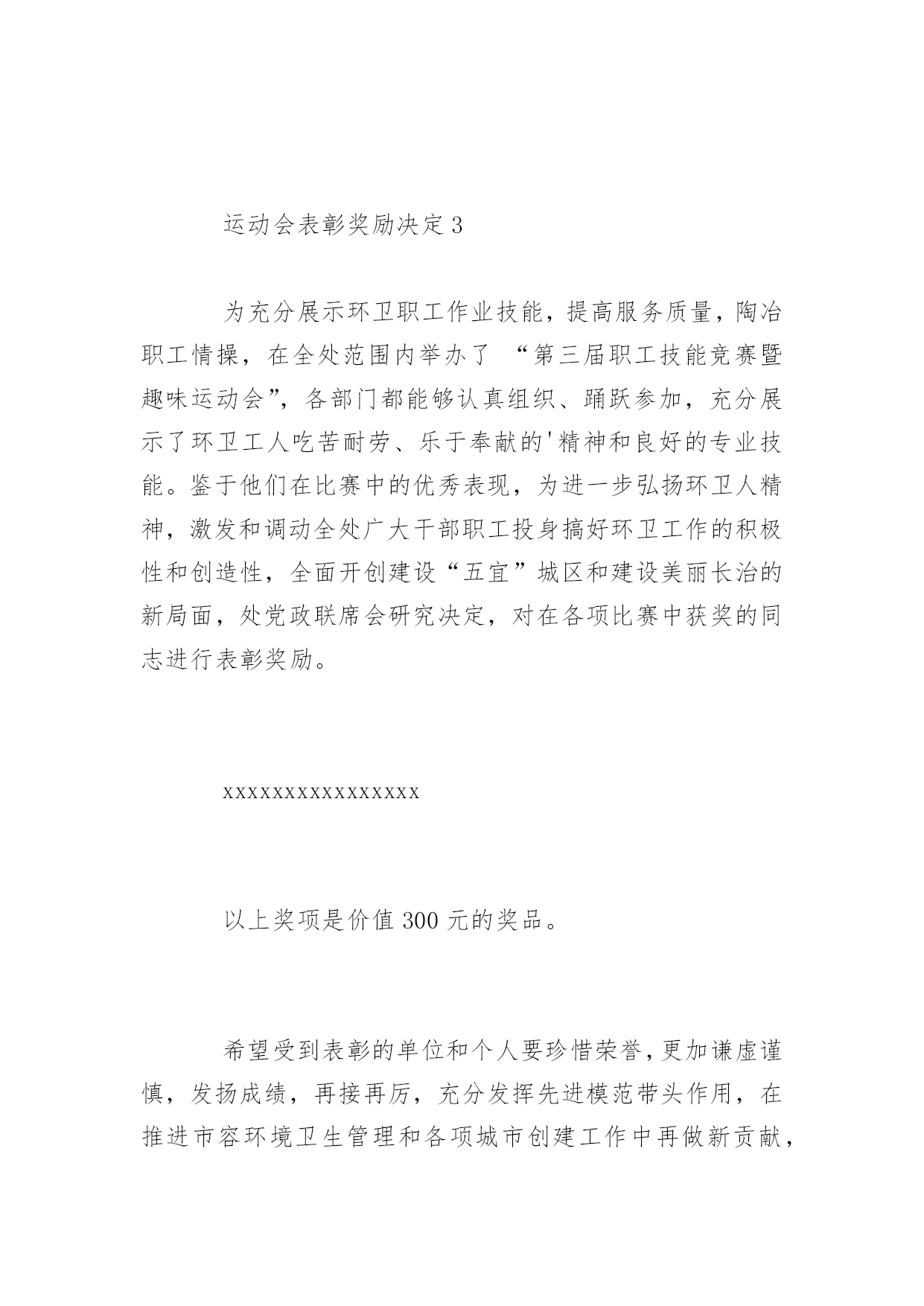 运动会表彰奖励决定运动会表彰奖励决定1各县、区人民政府,经济技术开发区、长江大桥开发区管委会,市政府各部门、各直属单位,驻芜各单位:在第十一届全国运动会上,我市娄祥武等13名运动员代表安徽省参赛,取得了3金1银1铜共5枚奖牌,位列全省第一,为安徽省取得全运会历史最好成绩作出了重要贡献,为我市赢得了荣誉。为此,市政府决定,对我市在第十一届全国运动会上有突出贡献的运动员、教练员及有功单位、人员给予表彰奖励。一、授予获得金牌的运动员娄祥武“芜湖市先进工作者”荣誉称号,授予获得金牌的运动员周吕鑫、吴莎和娄祥武主教练孙岸“芜湖市劳动模范”荣誉称号,并对以上人员每人奖励人民币25万元。二、给予获得银牌的运动员周吕鑫奖励人民币8万元。三、给予获得铜牌的运动员娄祥武、主教练孙岸各奖励人民币4万元。四、给予对培养输送运动员作出突出贡献的芜湖市体育局、芜湖市公安局记集体二等功;授予芜湖市青少年体育学校“竞技体育突出贡献奖”荣誉称号;授予为培养输送运动员作出贡献的芜湖市一中、狮子山小学、环西小学“竞技体育贡献奖”荣誉称号。五、按照实际支付有突出贡献运动员、教练员奖金总额的20%标准,核拨专项经费,用于奖励我市参加本次全运会的其他运动员、为其提供后勤保障服务的工作人员、输送该运动员的单位和在输送单位培养该运动员的教练员。希望我市广大运动员、教练员和体育工作者勇攀高峰,再创佳绩,为把我市建设成为体育强市而努力奋斗!xxx年六月二十四日运动会表彰奖励决定2在我校第七届田径运动会上,我系取得了团体总分210.7分的优异成绩,囊括团体、男团、女团第一名及体育道德风尚奖。我系运动员在训练时刻苦努力、认真踏实,在比赛中团结协作、顽强拼搏;志愿者兢兢业业、细心周到、无私奉献。为了弘扬我系学生良好的精神风貌,进一步提高我系学生的集体荣誉感,增强信心,再创辉煌。经系党政会议研究决定,对以下同学进行表彰:1、授予xx等十名同学“系十佳运动员”荣誉称号;2、授予xxx等十名同学“系十佳志愿者”荣誉称号;3、给予xx等30名运动员通报表扬。希望受到表彰的先进个人要发扬成绩,奋发进取,求真务实,开拓创新,取得更好的成绩。运动会表彰奖励决定3为充分展示环卫职工作业技能,提高服务质量,陶冶职工情操,在全处范围内举办了“第三届职工技能竞赛暨趣味运动会”,各部门都能够认真组织、踊跃参加,充分展示了环卫工人吃苦耐劳、乐于奉献的'精神和良好的专业技能。鉴于他们在比赛中的优秀表现,为进一步弘扬环卫人精神,激发和调动全处广大干部职工投身搞好环卫工作的积极性和创造性,全面开创建设“五宜”城区和建设美丽长治的新局面,处党政联席会研究决定,对在各项比赛中获奖的同志进行表彰奖励。xxxxxxxxxxxxxxxx以上奖项是价值300元的奖品。希望受到表彰的单位和个人要珍惜荣誉,更加谦虚谨慎,发扬成绩,再接再厉,充分发挥先进模范带头作用,在推进市容环境卫生管理和各项城市创建工作中再做新贡献,再立新功勋。处党组号召,全体党员干部职工要以受表彰的先进个人为榜样,紧紧围绕区委、区政府工作部署,以“环卫人不能一时不用心、环卫事不能一事不努力”为工作理念,全面提升“三清一管”服务质量,并以此次表彰为新起点,求真务实,开拓进取,不断创新,为推进市容环境卫生管理事业科学发展,建设“五宜”城区努力奋斗。xxxx年4月27日