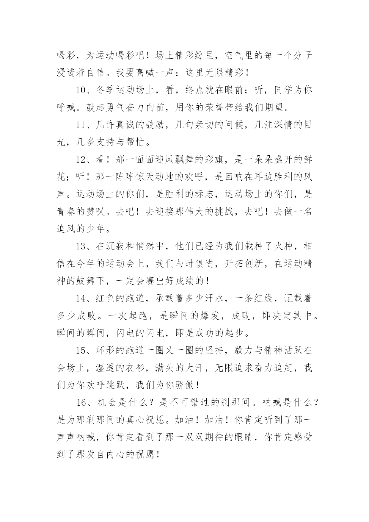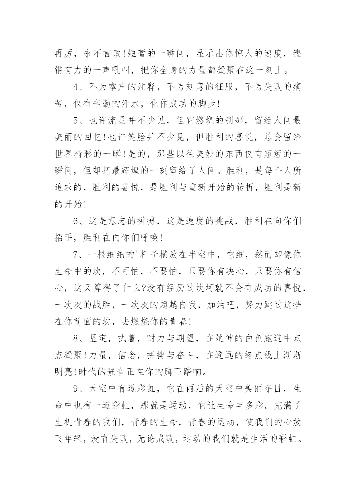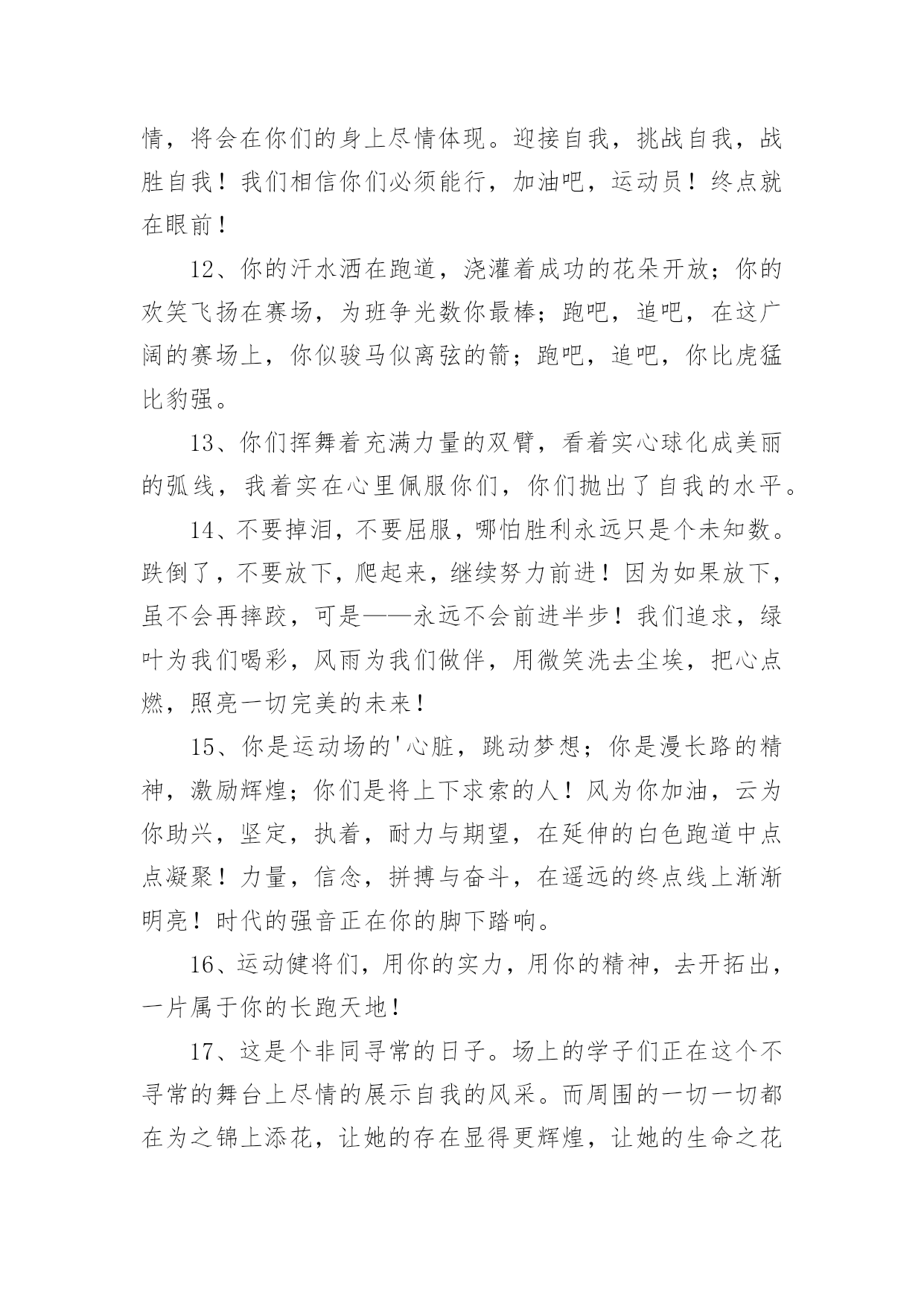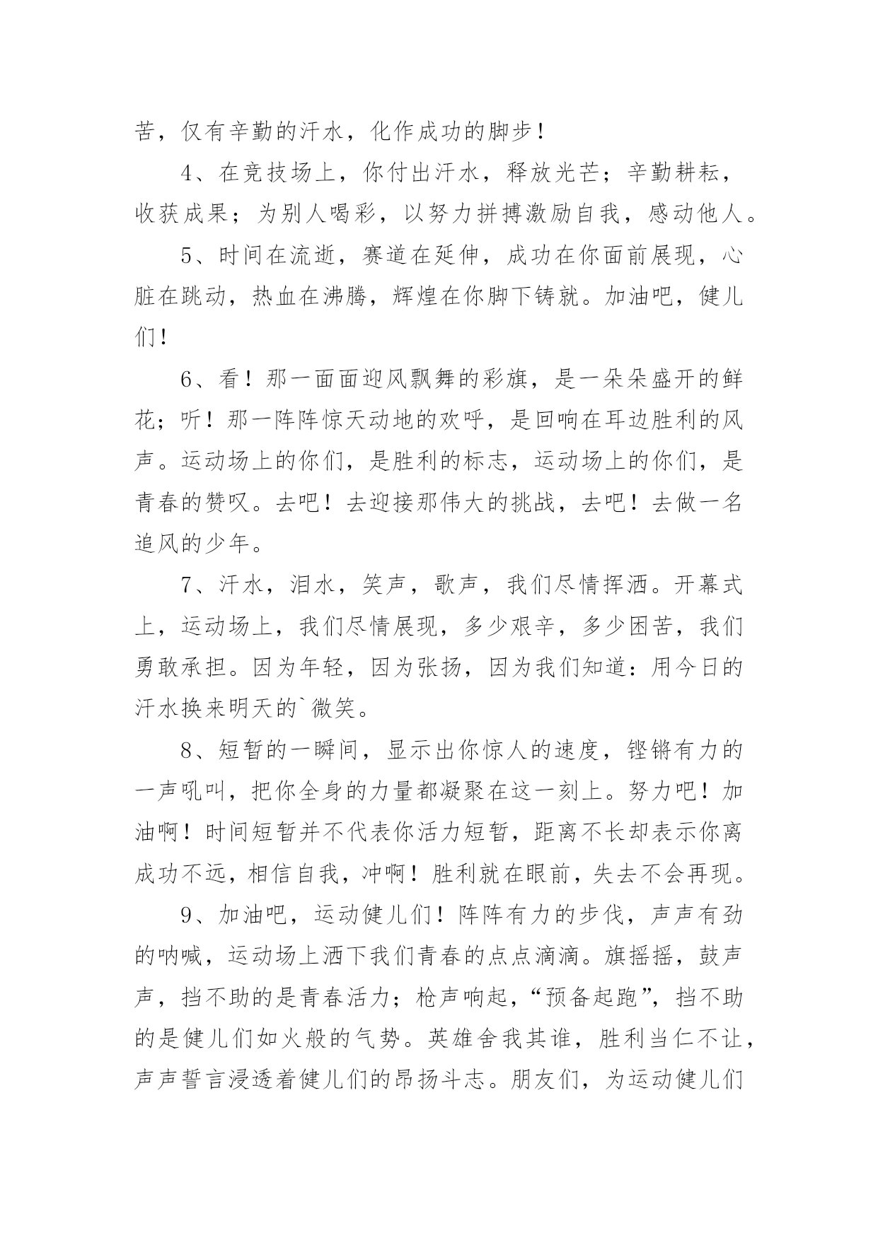 运动会加油稿运动会加油稿(实用6篇)在生活中,能够利用到加油稿的场合越来越多,加油稿可以起到活跃气氛的作用。相信很多朋友都对写加油稿感到非常苦恼吧,下面是小编为大家整理的运动会加油稿,仅供参考,希望能够帮助到大家。运动会加油稿11、你没有忘记,把闪亮的青春飞扬,你没有忘记,把身姿驰向胜利的方向,风一样的驰骋,风一样的纵横,不要轻言放下,因为我们已为青春宣誓——风行天下!2、踏着春天的气息,迈着轻盈的脚步,我们迎来了心仪已久的运动会。那里就是展示自我的舞台。我们向往高山的坚忍不拔,我们渴望大海的博大精深,还有,我们更痴迷于你们的速度激情。来吧,尽情释放你的活力。你的每一次冲刺,都叩动着我们的心弦;你的每一次跨越,都吸引着我们的视线;你的每一次起跳,都绷紧我们的神经。我们为你呐喊,我们为你自豪,我们为你疯狂。3、泰戈尔在诗中说,天空没有翅膀的影子,但我已飞过;艾青对朋友说,也许有人到达不了彼岸,但我们共同拥有大海。也许你们没有显赫的成绩,但运动场上留下了你们的足迹。也许你们没有奖品,但我们心中留下了你们拼搏的身影。所有的努力都是为了迎接这一刹那,所有的拼搏都是为了这一声令下。4、九年级男子xx米预赛来临了,九年级的男同胞们,是否都准备好了?看那xx米,不长也不短,却充满着活力。在满怀竞争的今日,相信你们都已信心满满。那还怕什么,加油冲刺吧!相信自我,你们都是勇敢的Number1!5、超越对手,更要超越自我,追求卓越是我们的目标,是我们的信念,在清爽的秋季,在喧嚣的赛场,你们点燃了似火的热情,无论成败,你们永远是我们的骄傲,我们都为你们感到自豪!6、不为鲜花的围绕,不为刹那的荣耀,仅有执着的信念,化作不停的奔跑,心中燃烧着梦想,脚下不停的步伐!7、坚定,执着,耐力与期望,在延伸的白色跑道中点点凝聚!力量,信念,拼搏与奋斗,在遥远的终点线上渐渐明亮!时代的强音正在你的脚下踏响。8、人生的路,有坦途,也有坎坷;走过的岁月,有欢笑,也有苦涩,泪水告诉我一个跌倒的故事,汗水使我多了一份沉重,几多成熟。9、你们挥舞着充满力量的双臂,看着实心球化成美丽的身影,我着实在心里佩服你们,你们抛出了自我的水平。10、大地属于你,蓝天属于你,在你一跃的瞬间,同时跃出了我们的期望。草儿欣赏你,白云欢迎你,身轻如燕,飞跃蓝天,奥林匹克精神在你身上体现,跳吧,跳出你的自信,跳出你的顶尖,跳出你的胜利山巅。11、青春的脚步,青春的速度,青春的活力,青春的激情,将会在你们的身上尽情体现。迎接自我,挑战自我,战胜自我!我们相信你们必须能行,加油吧,运动员!终点就在眼前!12、你的汗水洒在跑道,浇灌着成功的花朵开放;你的欢笑飞扬在赛场,为班争光数你最棒;跑吧,追吧,在这广阔的赛场上,你似骏马似离弦的箭;跑吧,追吧,你比虎猛比豹强。13、你们挥舞着充满力量的双臂,看着实心球化成美丽的弧线,我着实在心里佩服你们,你们抛出了自我的水平。14、不要掉泪,不要屈服,哪怕胜利永远只是个未知数。跌倒了,不要放下,爬起来,继续努力前进!因为如果放下,虽不会再摔跤,可是——永远不会前进半步!我们追求,绿叶为我们喝彩,风雨为我们做伴,用微笑洗去尘埃,把心点燃,照亮一切完美的未来!15、你是运动场的'心脏,跳动梦想;你是漫长路的精神,激励辉煌;你们是将上下求索的人!风为你加油,云为你助兴,坚定,执着,耐力与期望,在延伸的白色跑道中点点凝聚!力量,信念,拼搏与奋斗,在遥远的终点线上渐渐明亮!时代的强音正在你的脚下踏响。16、运动健将们,用你的实力,用你的精神,去开拓出,一片属于你的长跑天地!17、这是个非同寻常的日子。场上的学子们正在这个不寻常的舞台上尽情的展示自我的风采。而周围的一切一切都在为之锦上添花,让她的存在显得更辉煌,让她的生命之花绽放得更加灿烂,这是完美的一切,值得庆祝,就让我们为之喝彩吧。18、梦想毕竟不一样于现实,失败是生活的一部分,谁也无法选择,无法拒绝。人生要自我去拼搏,去奋斗,在风雨中百折不挠勇往前进,在人生的每个驿站上都留下一段不悔的回忆。流泪不是失落,徘徊不是迷惑,成功属于那些战胜失败,坚持不懈勇于追求梦想的人。加油吧,运动健儿们!19、你是运动场的心脏,跳动梦想;你是漫长路的精神,激励辉煌;你们是将上下求索的人!风为你加油,云为你助兴,坚定,执着,耐力与期望,在延伸的白色跑道中点点凝聚!力量,信念,拼搏与奋斗,在遥远的终点线上渐渐明亮!时代的强音正在你的脚下踏响。20、一年一度的运动会如期而至。“沙场秋点兵”的壮阔,想必给了我们难以言喻的活力。于是,我放下手中的笔,去感受脉搏与心跳的激烈。运动会加油稿21、也许流星并不少见,但它燃烧的刹那,留给人间最美丽的回忆!也许笑脸并不少见,但胜利的喜悦,总会留给世界精彩的一瞬!是的,那些以前美妙的东西只有短短的一瞬间,但