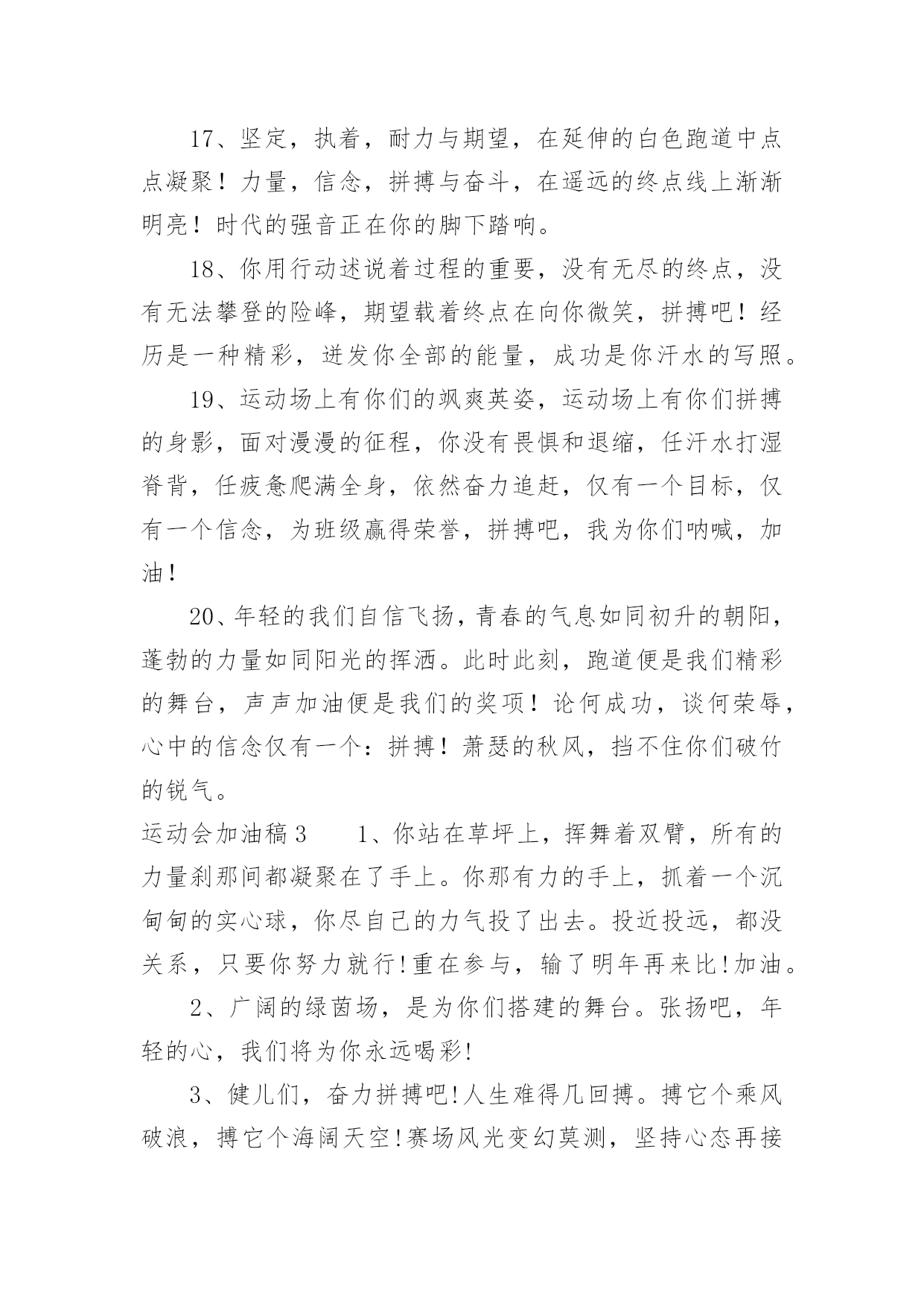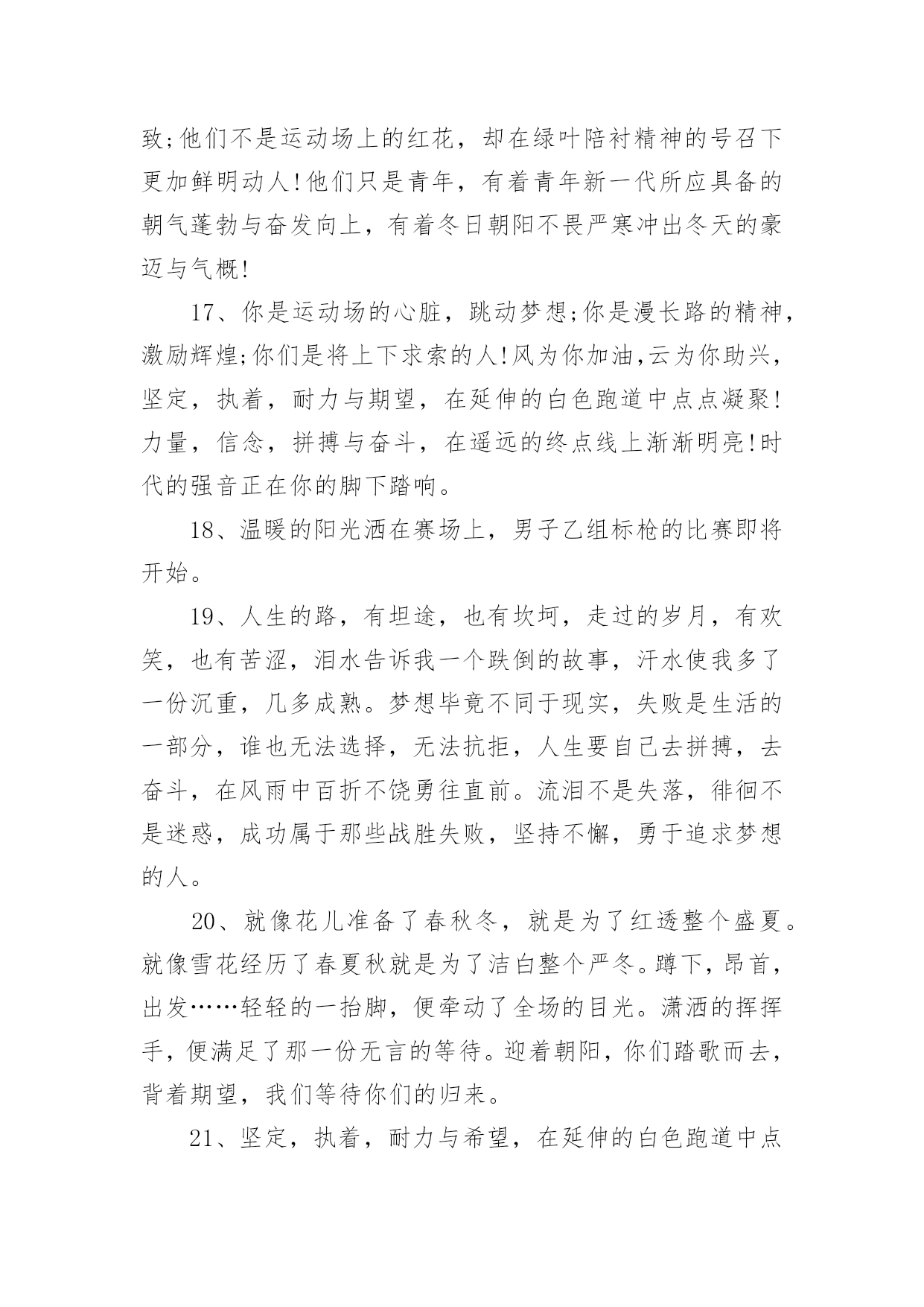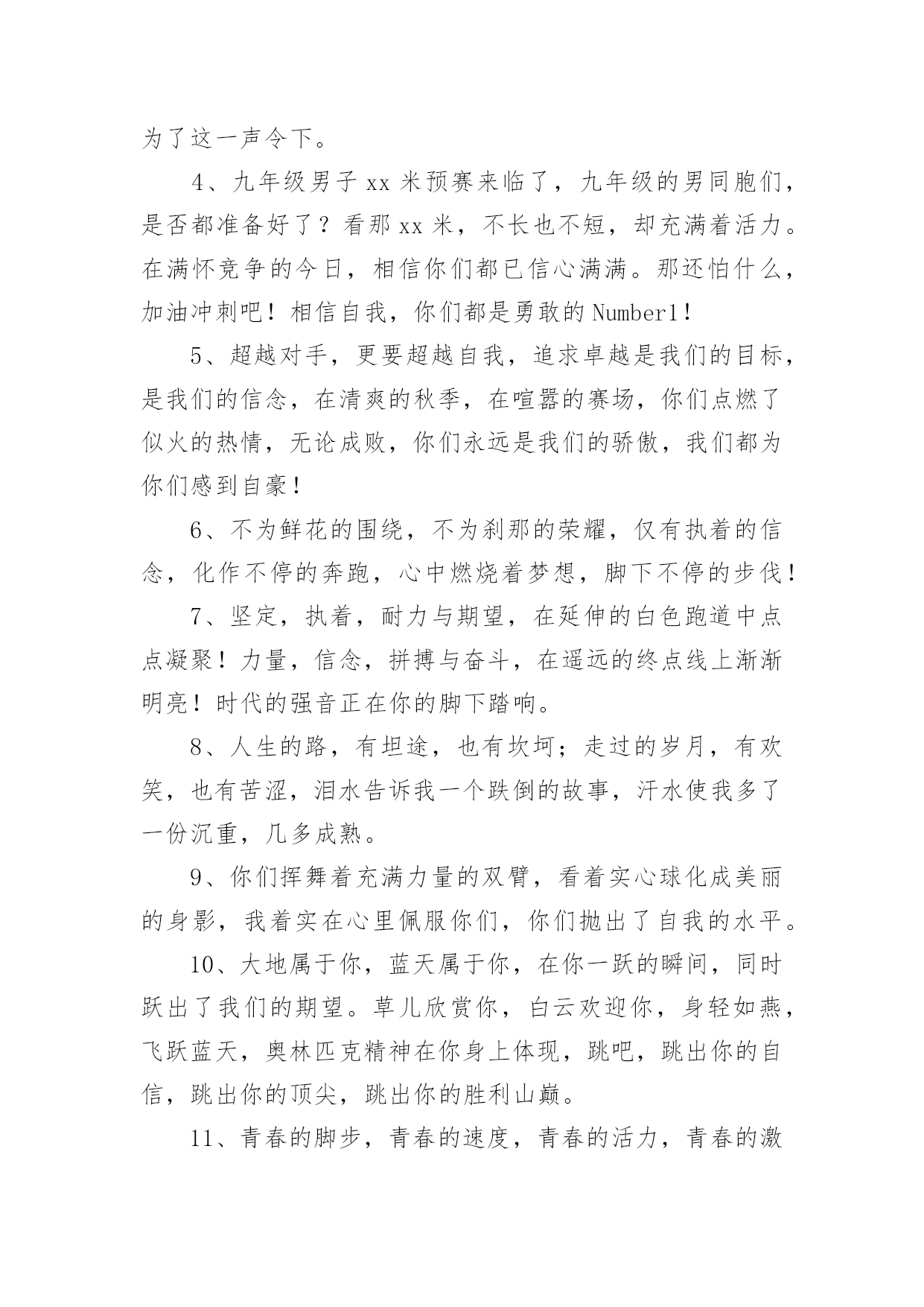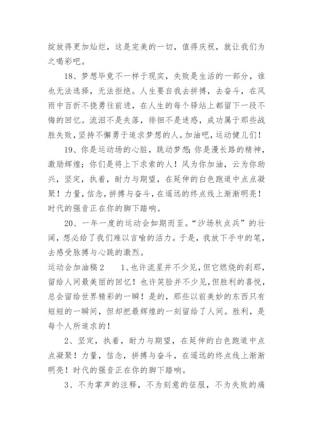 运动会加油稿运动会加油稿(实用6篇)在生活中,能够利用到加油稿的场合越来越多,加油稿可以起到活跃气氛的作用。相信很多朋友都对写加油稿感到非常苦恼吧,下面是小编为大家整理的运动会加油稿,仅供参考,希望能够帮助到大家。运动会加油稿11、你没有忘记,把闪亮的青春飞扬,你没有忘记,把身姿驰向胜利的方向,风一样的驰骋,风一样的纵横,不要轻言放下,因为我们已为青春宣誓——风行天下!2、踏着春天的气息,迈着轻盈的脚步,我们迎来了心仪已久的运动会。那里就是展示自我的舞台。我们向往高山的坚忍不拔,我们渴望大海的博大精深,还有,我们更痴迷于你们的速度激情。来吧,尽情释放你的活力。你的每一次冲刺,都叩动着我们的心弦;你的每一次跨越,都吸引着我们的视线;你的每一次起跳,都绷紧我们的神经。我们为你呐喊,我们为你自豪,我们为你疯狂。3、泰戈尔在诗中说,天空没有翅膀的影子,但我已飞过;艾青对朋友说,也许有人到达不了彼岸,但我们共同拥有大海。也许你们没有显赫的成绩,但运动场上留下了你们的足迹。也许你们没有奖品,但我们心中留下了你们拼搏的身影。所有的努力都是为了迎接这一刹那,所有的拼搏都是为了这一声令下。4、九年级男子xx米预赛来临了,九年级的男同胞们,是否都准备好了?看那xx米,不长也不短,却充满着活力。在满怀竞争的今日,相信你们都已信心满满。那还怕什么,加油冲刺吧!相信自我,你们都是勇敢的Number1!5、超越对手,更要超越自我,追求卓越是我们的目标,是我们的信念,在清爽的秋季,在喧嚣的赛场,你们点燃了似火的热情,无论成败,你们永远是我们的骄傲,我们都为你们感到自豪!6、不为鲜花的围绕,不为刹那的荣耀,仅有执着的信念,化作不停的奔跑,心中燃烧着梦想,脚下不停的步伐!7、坚定,执着,耐力与期望,在延伸的白色跑道中点点凝聚!力量,信念,拼搏与奋斗,在遥远的终点线上渐渐明亮!时代的强音正在你的脚下踏响。8、人生的路,有坦途,也有坎坷;走过的岁月,有欢笑,也有苦涩,泪水告诉我一个跌倒的故事,汗水使我多了一份沉重,几多成熟。9、你们挥舞着充满力量的双臂,看着实心球化成美丽的身影,我着实在心里佩服你们,你们抛出了自我的水平。10、大地属于你,蓝天属于你,在你一跃的瞬间,同时跃出了我们的期望。草儿欣赏你,白云欢迎你,身轻如燕,飞跃蓝天,奥林匹克精神在你身上体现,跳吧,跳出你的自信,跳出你的顶尖,跳出你的胜利山巅。11、青春的脚步,青春的速度,青春的活力,青春的激情,将会在你们的身上尽情体现。迎接自我,挑战自我,战胜自我!我们相信你们必须能行,加油吧,运动员!终点就在眼前!12、你的汗水洒在跑道,浇灌着成功的花朵开放;你的欢笑飞扬在赛场,为班争光数你最棒;跑吧,追吧,在这广阔的赛场上,你似骏马似离弦的箭;跑吧,追吧,你比虎猛比豹强。13、你们挥舞着充满力量的双臂,看着实心球化成美丽的弧线,我着实在心里佩服你们,你们抛出了自我的水平。14、不要掉泪,不要屈服,哪怕胜利永远只是个未知数。跌倒了,不要放下,爬起来,继续努力前进!因为如果放下,虽不会再摔跤,可是——永远不会前进半步!我们追求,绿叶为我们喝彩,风雨为我们做伴,用微笑洗去尘埃,把心点燃,照亮一切完美的未来!15、你是运动场的'心脏,跳动梦想;你是漫长路的精神,激励辉煌;你们是将上下求索的人!风为你加油,云为你助兴,坚定,执着,耐力与期望,在延伸的白色跑道中点点凝聚!力量,信念,拼搏与奋斗,在遥远的终点线上渐渐明亮!时代的强音正在你的脚下踏响。16、运动健将们,用你的实力,用你的精神,去开拓出,一片属于你的长跑天地!17、这是个非同寻常的日子。场上的学子们正在这个不寻常的舞台上尽情的展示自我的风采。而周围的一切一切都在为之锦上添花,让她的存在显得更辉煌,让她的生命之花绽放得更加灿烂,这是完美的一切,值得庆祝,就让我们为之喝彩吧。18、梦想毕竟不一样于现实,失败是生活的一部分,谁也无法选择,无法拒绝。人生要自我去拼搏,去奋斗,在风雨中百折不挠勇往前进,在人生的每个驿站上都留下一段不悔的回忆。流泪不是失落,徘徊不是迷惑,成功属于那些战胜失败,坚持不懈勇于追求梦想的人。加油吧,运动健儿们!19、你是运动场的心脏,跳动梦想;你是漫长路的精神,激励辉煌;你们是将上下求索的人!风为你加油,云为你助兴,坚定,执着,耐力与期望,在延伸的白色跑道中点点凝聚!力量,信念,拼搏与奋斗,在遥远的终点线上渐渐明亮!时代的强音正在你的脚下踏响。20、一年一度的运动会如期而至。“沙场秋点兵”的壮阔,想必给了我们难以言喻的活力。于是,我放下手中的笔,去感受脉搏与心跳的激烈。运动会加油稿21、也许流星并不少见,但它燃烧的刹那,留给人间最美丽的回忆!也许笑脸并不少见,但胜利的喜悦,总会留给世界精彩的一瞬!是的,那些以前美妙的东西只有短短的一瞬间,但