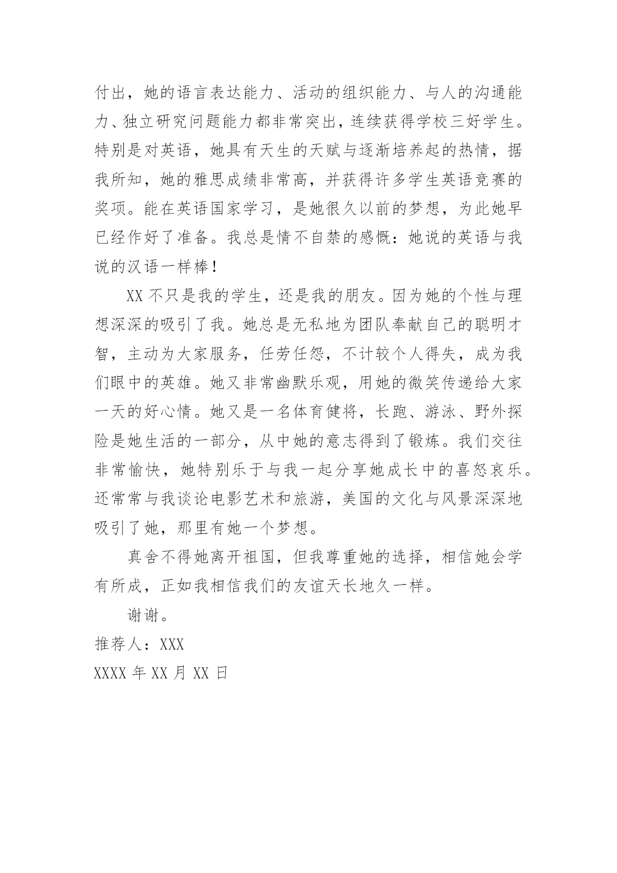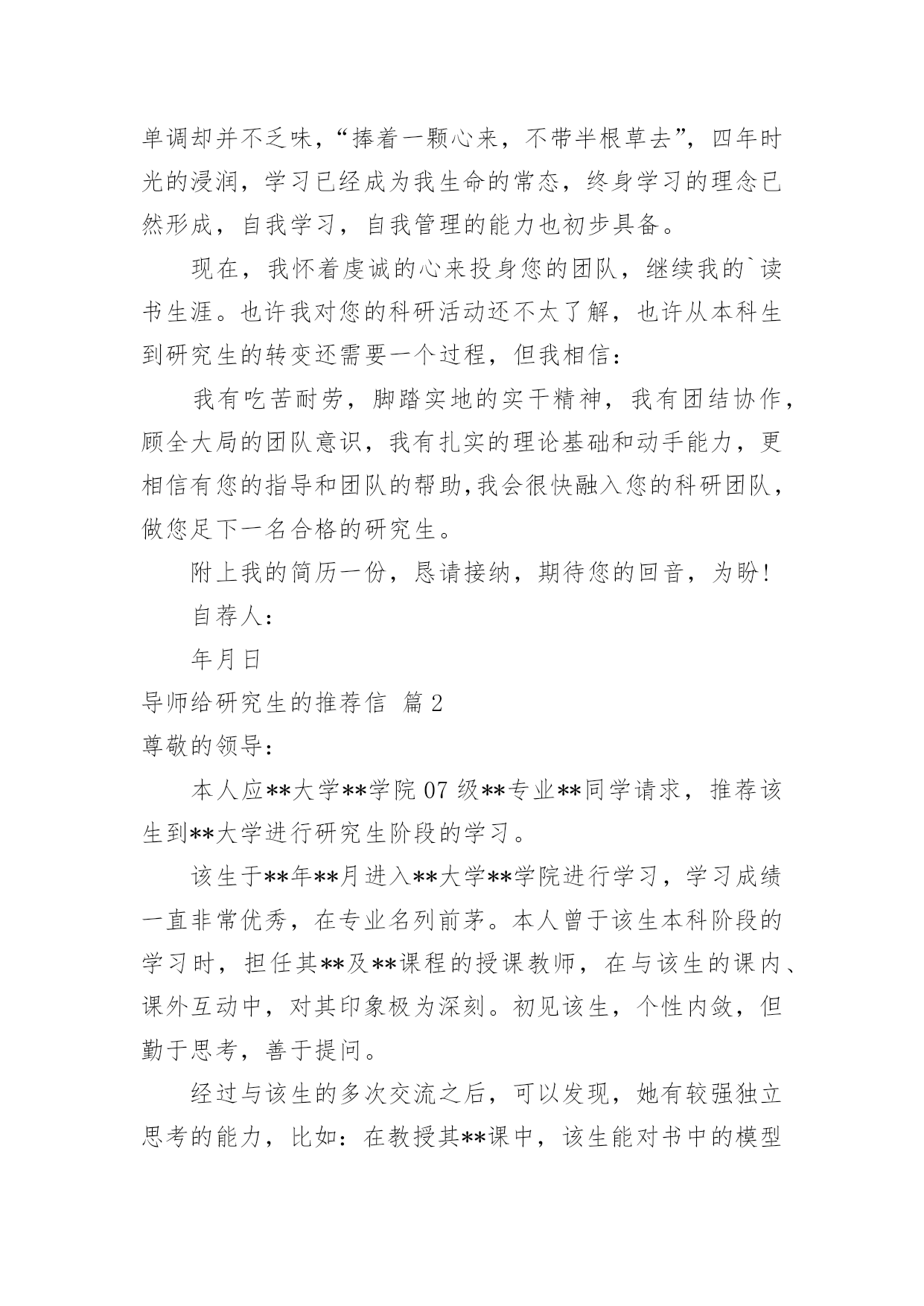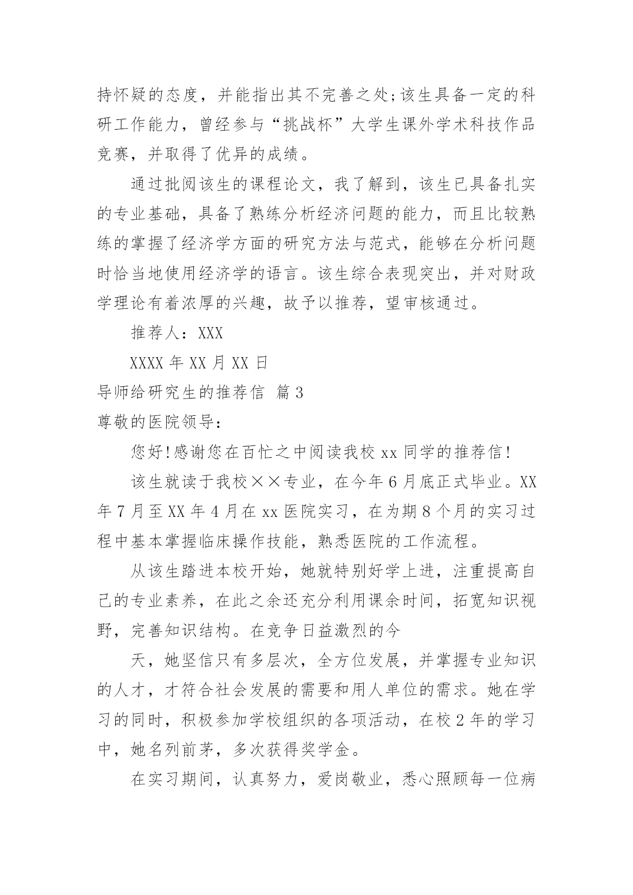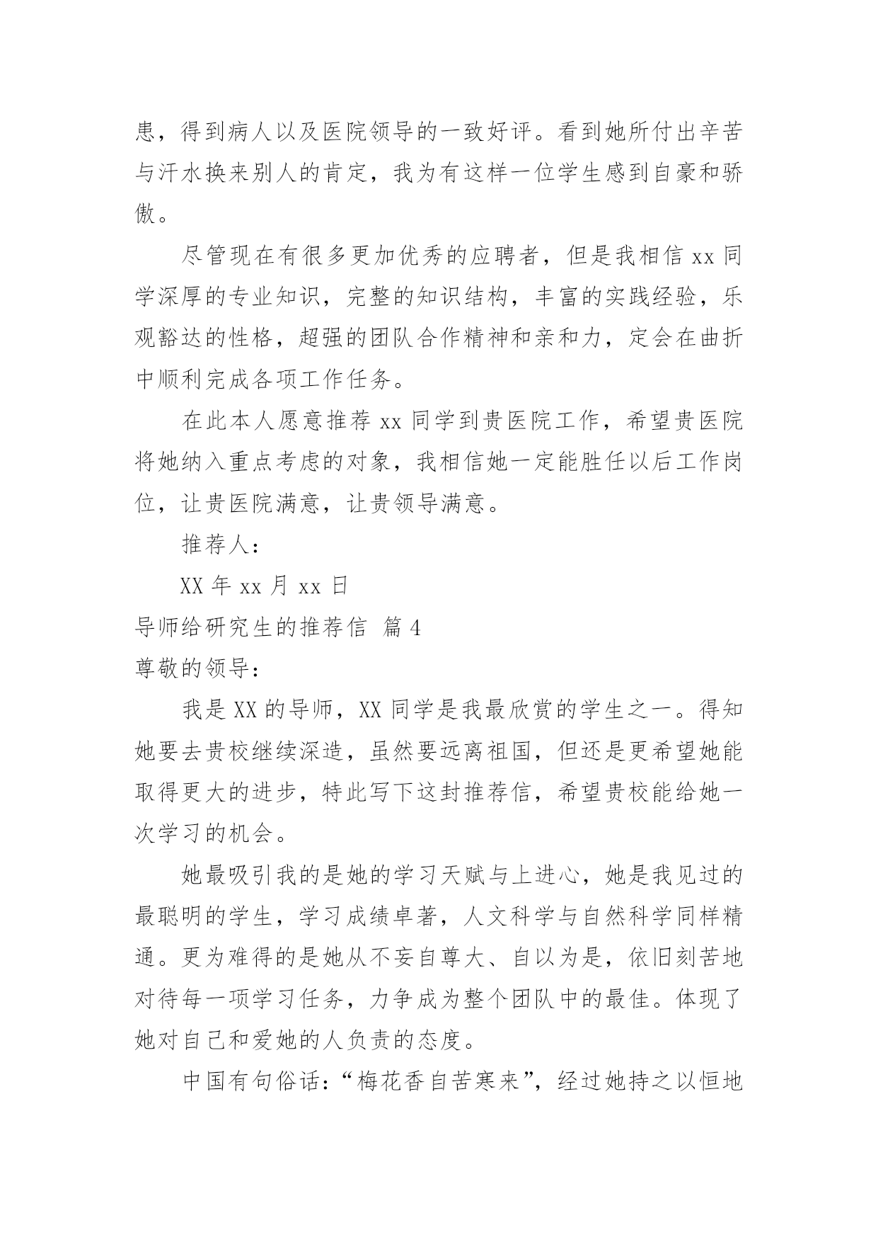导师给研究生的推荐信关于导师给研究生的推荐信4篇在现在社会,愈来愈多的推荐情况都可以使用推荐信了,推荐信可以展示出申请人的才干和优势。怎么写推荐信才能避免踩雷呢?以下是小编精心整理的导师给研究生的推荐信4篇,希望对大家有所帮助。导师给研究生的推荐信篇1尊敬的张教授:您好!学生此刻冒昧的打扰您,感谢您在百忙之中翻阅学生的来信。首先祝您及家人身体健康,阖家幸福,吉祥如意!学生张良军,系安徽工业大学20xx届自动化系本科毕业生,于20xx年参加全国硕士研究生招生考试,考研成绩如下:政治:74,英语:66,数学一:124,自动控制原理:143,总分:407。四年的大学生活即将结束,学生在此刻选择继续读书,志愿报考您的研究方向,拜于您的足下,希望您能给我一个机会。我是一位来自皖西的农村学生,二十三个春华秋实,二十三载漫漫求学路,历经坎坎坷坷,风风雨雨,跌跌撞撞于20xx年来到安徽工业大学。我十分珍视这来之不易的读书机会,四年里我抓紧一切时间和机遇充实自我,锻炼自己。一份耕耘,一份收获,回想即将过去的四年生活,忙碌而充实,单调却并不乏味,“捧着一颗心来,不带半根草去”,四年时光的浸润,学习已经成为我生命的常态,终身学习的理念已然形成,自我学习,自我管理的能力也初步具备。现在,我怀着虔诚的心来投身您的团队,继续我的`读书生涯。也许我对您的科研活动还不太了解,也许从本科生到研究生的转变还需要一个过程,但我相信:我有吃苦耐劳,脚踏实地的实干精神,我有团结协作,顾全大局的团队意识,我有扎实的理论基础和动手能力,更相信有您的指导和团队的帮助,我会很快融入您的科研团队,做您足下一名合格的研究生。附上我的简历一份,恳请接纳,期待您的回音,为盼!自荐人:年月日导师给研究生的推荐信篇2尊敬的领导:本人应**大学**学院07级**专业**同学请求,推荐该生到**大学进行研究生阶段的学习。该生于**年**月进入**大学**学院进行学习,学习成绩一直非常优秀,在专业名列前茅。本人曾于该生本科阶段的学习时,担任其**及**课程的授课教师,在与该生的课内、课外互动中,对其印象极为深刻。初见该生,个性内敛,但勤于思考,善于提问。经过与该生的多次交流之后,可以发现,她有较强独立思考的能力,比如:在教授其**课中,该生能对书中的模型持怀疑的态度,并能指出其不完善之处;该生具备一定的科研工作能力,曾经参与“挑战杯”大学生课外学术科技作品竞赛,并取得了优异的成绩。通过批阅该生的课程论文,我了解到,该生已具备扎实的专业基础,具备了熟练分析经济问题的能力,而且比较熟练的掌握了经济学方面的研究方法与范式,能够在分析问题时恰当地使用经济学的语言。该生综合表现突出,并对财政学理论有着浓厚的兴趣,故予以推荐,望审核通过。推荐人:XXXXXXX年XX月XX日导师给研究生的推荐信篇3尊敬的医院领导:您好!感谢您在百忙之中阅读我校xx同学的推荐信!该生就读于我校××专业,在今年6月底正式毕业。XX年7月至XX年4月在xx医院实习,在为期8个月的实习过程中基本掌握临床操作技能,熟悉医院的工作流程。从该生踏进本校开始,她就特别好学上进,注重提高自己的专业素养,在此之余还充分利用课余时间,拓宽知识视野,完善知识结构。在竞争日益激烈的今天,她坚信只有多层次,全方位发展,并掌握专业知识的人才,才符合社会发展的需要和用人单位的需求。她在学习的同时,积极参加学校组织的各项活动,在校2年的学习中,她名列前茅,多次获得奖学金。在实习期间,认真努力,爱岗敬业,悉心照顾每一位病患,得到病人以及医院领导的一致好评。看到她所付出辛苦与汗水换来别人的肯定,我为有这样一位学生感到自豪和骄傲。尽管现在有很多更加优秀的应聘者,但是我相信xx同学深厚的专业知识,完整的知识结构,丰富的实践经验,乐观豁达的性格,超强的团队合作精神和亲和力,定会在曲折中顺利完成各项工作任务。在此本人愿意推荐xx同学到贵医院工作,希望贵医院将她纳入重点考虑的对象,我相信她一定能胜任以后工作岗位,让贵医院满意,让贵领导满意。推荐人:XX年xx月xx日导师给研究生的推荐信篇4尊敬的领导:我是XX的导师,XX同学是我最欣赏的学生之一。得知她要去贵校继续深造,虽然要远离祖国,但还是更希望她能取得更大的进步,特此写下这封推荐信,希望贵校能给她一次学习的机会。她最吸引我的是她的学习天赋与上进心,她是我见过的最聪明的学生,学习成绩卓著,人文科学与自然科学同样精通。更为难得的是她从不妄自尊大、自以为是,依旧刻苦地对待每一项学习任务,力争成为整个团队中的最佳。体现了她对自己和爱她的人负责的态度。中国有句俗话:“梅花香自苦寒来”,经过她持之以恒地付出,她的语言表达能力、活动的组织能力、与人的沟通能力、独立研究问题能力都非常突出,连续获得学校三好学生。特别是对英语,她具