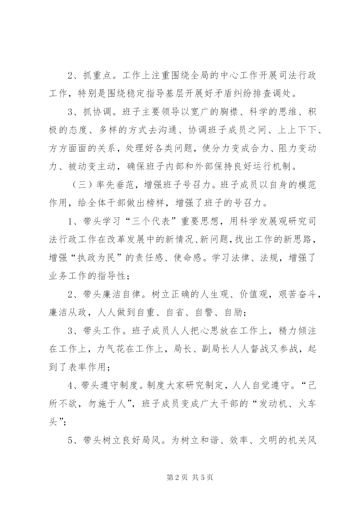 第PAGE\*Arabic\*MERGEFORMAT5页共NUMPAGES\*MERGEFORMAT5页司法局领导班子述职报告___年区司法局领导班子在区委、区政府的正确领导下,在上级司法行政机关的业务指导下,紧紧围绕区委、区政府的中心工作,坚持高起点、高标准,出色地完成了司法行政各项工作任务。___年,XX县区司法行政工作被市评为先进单位,名列第一,普法、法律援助、人民调解、安置帮教等业务工作分别被部、省、市评为先进。现将___年司法局领导班子建设及其工作实绩述职如下:一、争创和谐民主高素质的领导班子司法局领导班子建设上我们注重抓了以下工作:(一)加强团结,增强班子凝聚力。我们从讲政治、讲正气、维护党性原则出发,切实搞好一班人的团结。规范、完善、贯彻民主集中制的各项制度,保证各项决策的民主化、科学化。“班长”不搞“一言堂”,成员自觉维护和支持“班长”工作,着眼全局,树立一盘棋思想,做到思想上合、职能上分,目标上合、工作上分,重大决策上合、落实责任上分,相互支持、相互配合,分工不分家,确保班子整体优势得到充分发挥。(二)统揽全局,增强班子战斗力。坚持以科学发展观统揽司法行政工作全局。1、抓大事。司法行政工作千头万绪,我们注重找准影响大局、有决定意义的关键问题,集中精力去抓好、抓出成效;2、抓重点。工作上注重围绕全局的中心工作开展司法行政工作,特别是围绕稳定指导基层开展好矛盾纠纷排查调处。3、抓协调。班子主要领导以宽广的胸襟、科学的思维、积极的态度、多样的方式去沟通、协调班子成员之间、上上下下、方方面面的关系,处理好各类问题,使分力变成合力、阻力变动力、被动变主动,确保班子内部和外部保持良好运行机制。(三)率先垂范,增强班子号召力。班子成员以自身的模范作用,给全体干部做出榜样,增强了班子的号召力。1、带头学习“三个代表”重要思想,用科学发展观研究司法行政工作在改革发展中的新情况、新问题,找出工作的新思路,增强“执政为民”的责任感、使命感。学习法律、法规,增强了业务工作的指导性;2、带头廉洁自律。树立正确的人生观、价值观,艰苦奋斗,廉洁从政,人人做到自重、自省、自警、自励;3、带头工作。班子成员人人把心思放在工作上,精力倾注在工作上,力气花在工作上,局长、副局长人人督战又参战,起到了表率作用;4、带头遵守制度。制度大家研究制定,人人自觉遵守。“己所不欲,勿施于人”,班子成员变成广大干部的“发动机、火车头”;5、带头树立良好局风。为树立和谐、效率、文明的机关风尚,班子成员以身作则,严于律己,谦和为人,体恤下属,发挥了率先垂范作用。二、以科学发展观为统领,全面完成司法行政各项工作任务(一)“四五”普法和依法治理工作上新台阶开展形式多样的法律宣传活动。全年有组织的开展法律宣传活动60场次,出动宣传车10台次,文艺演出30场次,发放宣传品3万余份,制作宣传(栏)板120块,宣传横幅50条,受教育面达10万人以上。做好“法律进社区”工作。举办培训班,为街道社区的专职人员讲授了“法律进社区”的有关知识;召开法律进社区研讨会,总结推广了“法律进社区”先进经验。搞好青少年普法教育。结合青少年思想道德教育为同学们送上了生动的法制教育课。05年我局4名机关干部共为中小学校讲法制课60余课时,受教育学生达6000余人次。(二)维护稳定,做好人民调解和安置帮教工作做好全区人民调解工作。有组织的开展矛盾纠纷大排查56次,专项治理2次,调解各类矛盾纠纷534件,防止群体性上访22件。做好安置帮教工作,预防重新犯罪。05年全区共接收两劳释解人员46名,过渡安置率100;加强对刑释解教人员的衔接管理工作,列帮率达到100。做好指导基层法律服务工作。各基层法律服务所为各级政府、企事业单位和个体工商户担当法律顾问52家;代理诉讼54件;代理非诉讼12件;代写法律文书62件;协办公证44件;开展见证126件;解答法律咨询823人次。(三)卓有成效,搞好法律援助和“148”法律咨询服务认真办理援助案件。区法律援助中心降低门槛,拓宽工作领域,以优质服务为弱势群体进行法律援助。全年共办理法律援助案件45件。“148”法律服务中心共受理来电咨询5326人次,接待来访600余人次。坚持律师接访值班制度。参加区长信访接待日,律师定期到信访办值班,解答群众法律咨询1000余人次,处理涉法信访案件100余件。积极争创市级“优秀青少年维权岗”。司法局成立了创建活动领导小组,制定了工作计划。自五月份创建活动开展以来,开展送法入校活动21场次,解答青少年法律咨询200余人次,办理未成年人援助案件15件,有效维护了未成年人合法权益。(四)提高质量,做好律师代理和公证服务加强律师监管,提高律师办案质量。05年光华、盛达律师所开展了司法局领导班子述职报告集中教育整顿活动
