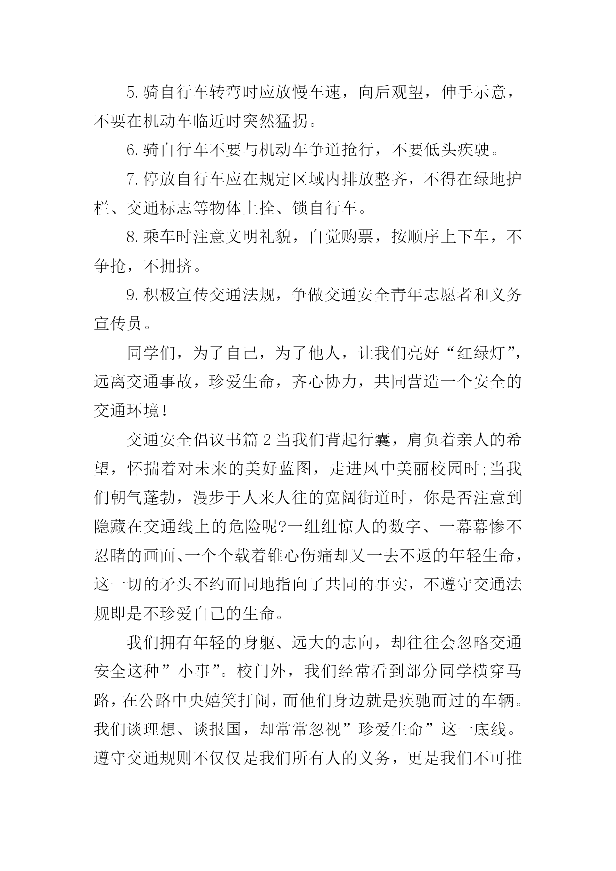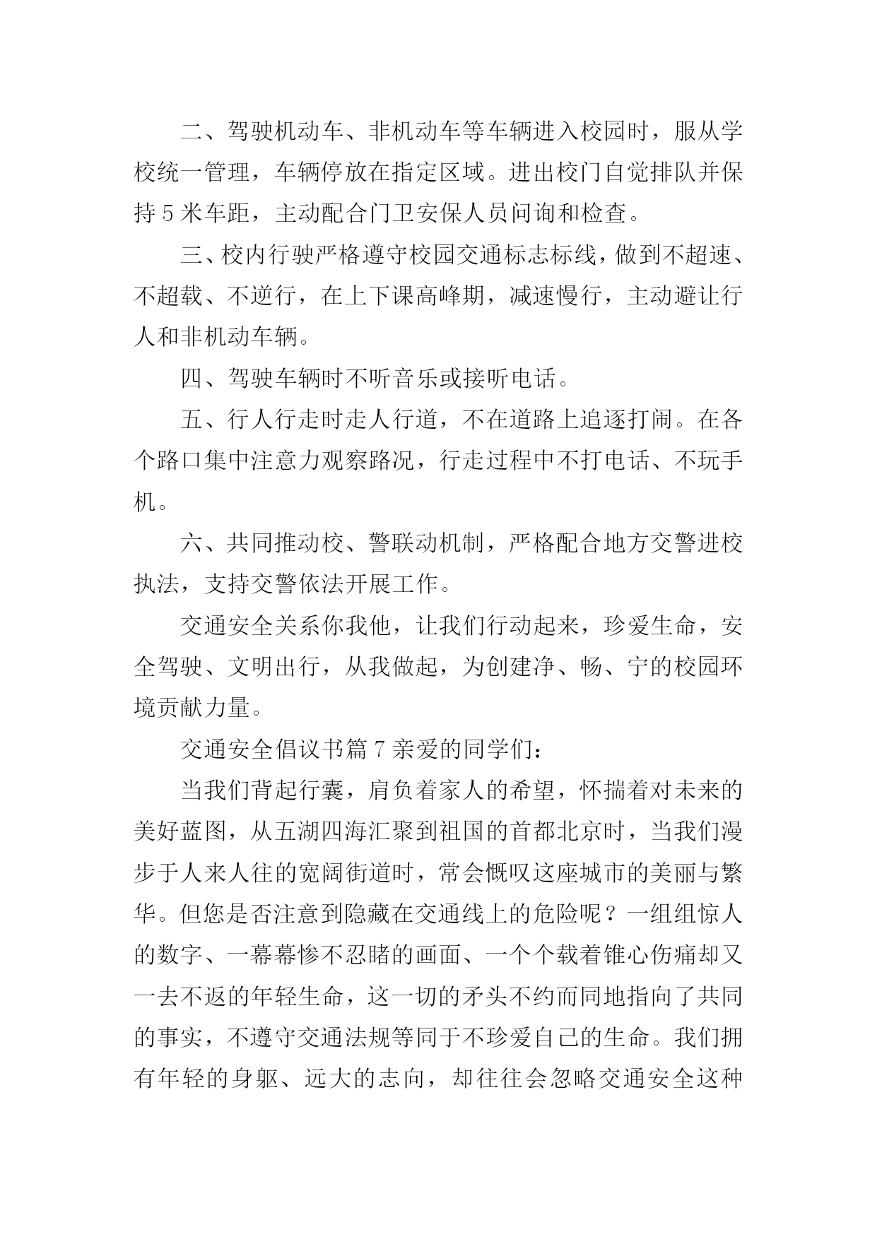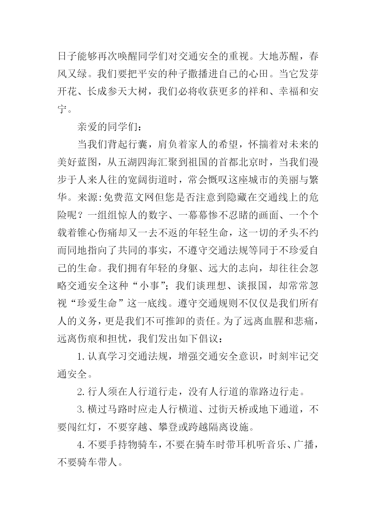 交通安全倡议书交通安全倡议书篇1随着经济的日益发展,平湖已变得越来越美丽,马路上车辆川流不息的景象随处可见。然而由于有些人交通安全意识的淡薄,在车水马龙的马路上演了一幕幕不可挽回的悲剧。当你看到一个个鲜活的生命消失于车轮之下,当你发现一阵阵欢声笑语湮没在尖锐的汽笛声中,当你面对那些触目惊心的场景时,能不感到痛心疾首吗?道路交通安全事故依然是各种事故领域的“头号杀手”。而导致悲剧发生的一个重要原因,就是我们欠缺安全防卫知识,自我保护能力差,因此对少年儿童进行安全教育的形势相当紧迫。有专家指出,通过安全教育,提高我们小学生的自我保护能力,80%的意外伤害事故是可以避免的。为加强对中小学生的安全教育,1996年2月,国家教委、公安部等六部委联合发出通知,把每年3月最后一周的星期一定为全国中小学生安全教育日,建立全国中小学生安全教育制度,敦促安全教育工作的开展。红灯短暂而生命长久,为了更好地宣传交通安全法规,增强学生交通安全意识,教育部将今年3月28日中小学生安全教育日主题定为“增强交通安全意识,提高自我保护能力”。为了更好地宣传交通安全知识,更好地珍视我们生命,在此,学校向全体师生发出倡议:1、我们要认真学习交通安全的法律法规,遵守交通规则,加强安全意识,树立交通安全文明公德;2、当我们徒步行走于人来车往的马路时,请时刻保持清醒的头脑,不在马路上嬉戏打闹;3、当我们时马路时,多一份谦让与耐心,不闯红灯,走人行横道,绝不能为贪一时之快,横穿马路;4、严禁12周岁以下的学生骑自行车。放学回家一定要排好路队。记得有一个故事。几个学者与一个老者同船共渡。学者们问老者是否懂得什么是哲学,老者连连摇头。学者们纷纷叹息:那你已经失去了一半的生命。这时一个巨浪打来,小船被掀翻了,老者问:“你们会不会游泳啊?”学者们异口同声地说不会。老者叹口气说:“那你们就失去了全部的生命。”虽然这只是一个故事,但其中蕴含的哲理却耐人寻味。灾难的发生对每个人来说,不分贫富贵贱,不论性别年龄。孩子、学子、工人、知识分子,人民公仆……无论咿呀学语,还是学富五车,无论幼小纤弱,还是身强力壮,如果缺少应有的警惕,不懂起码的安全常识,那么,危险一旦降临,本可能逃离的厄运,却都会在意料之外、客观之中发生了。遵章守纪,就是尊重生命,尊重自我。当我们能做到这一切的时候,我们的社会便向文明的彼岸又靠近了一步。重视交通安全,是我们每个人的义务,更是我们每个人的责任。让我们携起手来呵护这文明之花,让我们远离伤痛,珍爱彼此的生命吧。今天是第十个全国中小学生安全教育日,我们希望这个日子能够再次唤醒同学们对交通安全的重视。大地苏醒,春风又绿。我们要把平安的种子撒播进自己的心田。当它发芽开花、长成参天大树,我们必将收获更多的祥和、幸福和安宁。亲爱的同学们:当我们背起行囊,肩负着家人的希望,怀揣着对未来的美好蓝图,从五湖四海汇聚到祖国的首都北京时,当我们漫步于人来人往的宽阔街道时,常会慨叹这座城市的美丽与繁华。来源:免费范文网但您是否注意到隐藏在交通线上的危险呢?一组组惊人的数字、一幕幕惨不忍睹的画面、一个个载着锥心伤痛却又一去不返的年轻生命,这一切的矛头不约而同地指向了共同的事实,不遵守交通法规等同于不珍爱自己的生命。我们拥有年轻的身躯、远大的志向,却往往会忽略交通安全这种“小事”;我们谈理想、谈报国,却常常忽视“珍爱生命”这一底线。遵守交通规则不仅仅是我们所有人的义务,更是我们不可推卸的责任。为了远离血腥和悲痛,远离伤痕和担忧,我们发出如下倡议:1.认真学习交通法规,增强交通安全意识,时刻牢记交通安全。2.行人须在人行道行走,没有人行道的靠路边行走。3.横过马路时应走人行横道、过街天桥或地下通道,不要闯红灯,不要穿越、攀登或跨越隔离设施。4.不要手持物骑车,不要在骑车时带耳机听音乐、广播,不要骑车带人。5.骑自行车转弯时应放慢车速,向后观望,伸手示意,不要在机动车临近时突然猛拐。6.骑自行车不要与机动车争道抢行,不要低头疾驶。7.停放自行车应在规定区域内排放整齐,不得在绿地护栏、交通标志等物体上拴、锁自行车。8.乘车时注意文明礼貌,自觉购票,按顺序上下车,不争抢,不拥挤。9.积极宣传交通法规,争做交通安全青年志愿者和义务宣传员。同学们,为了自己,为了他人,让我们亮好“红绿灯”,远离交通事故,珍爱生命,齐心协力,共同营造一个安全的交通环境!交通安全倡议书篇2当我们背起行囊,肩负着亲人的希望,怀揣着对未来的美好蓝图,走进凤中美丽校园时;当我们朝气蓬勃,漫步于人来人往的宽阔街道时,你是否注意到隐藏在交通线上的危险呢?一组组惊人的数字、一幕幕惨不忍睹的画面、一个个载着锥心伤痛却又一去不返的年轻生命,这一切的矛头不约而同地指向了共同的事实,不遵守交通法规即