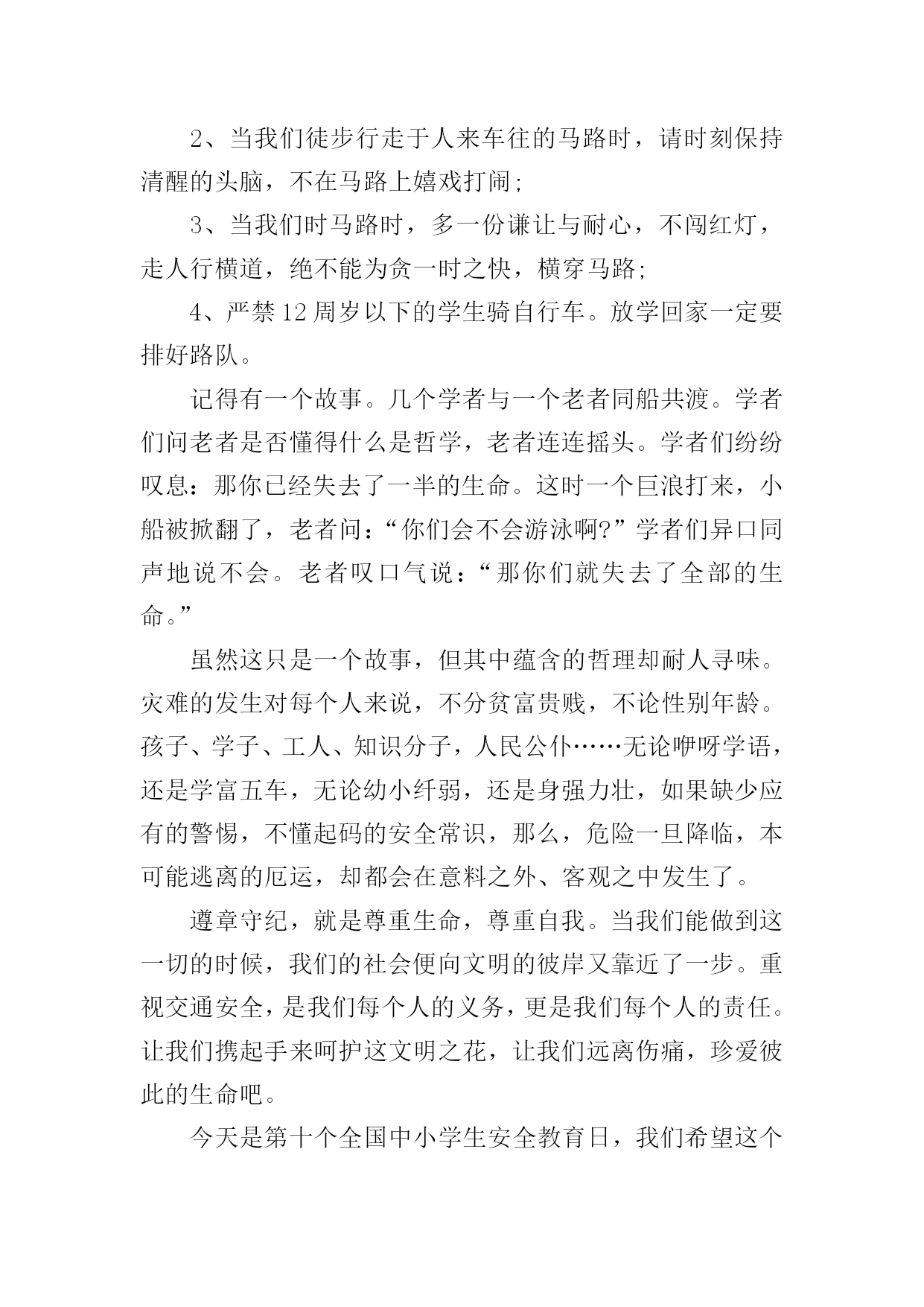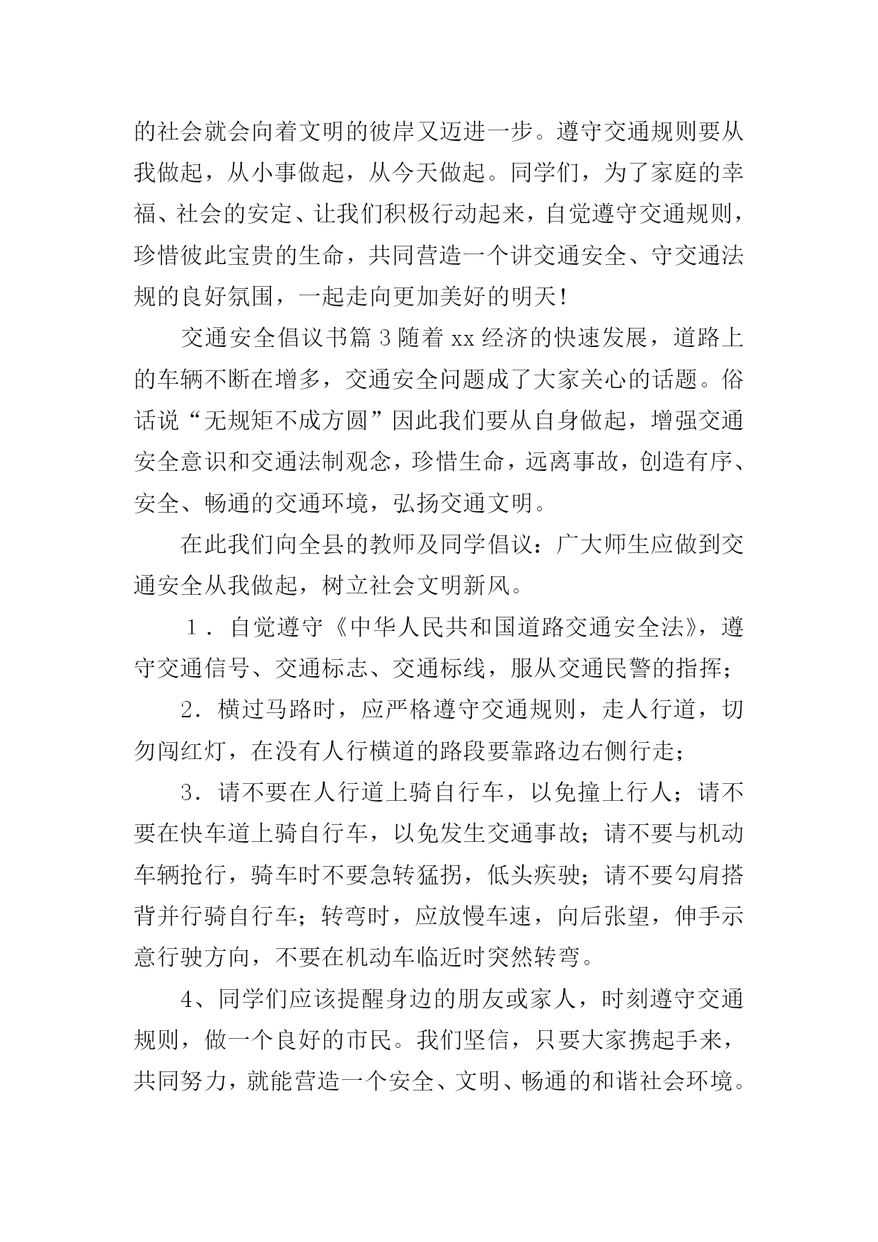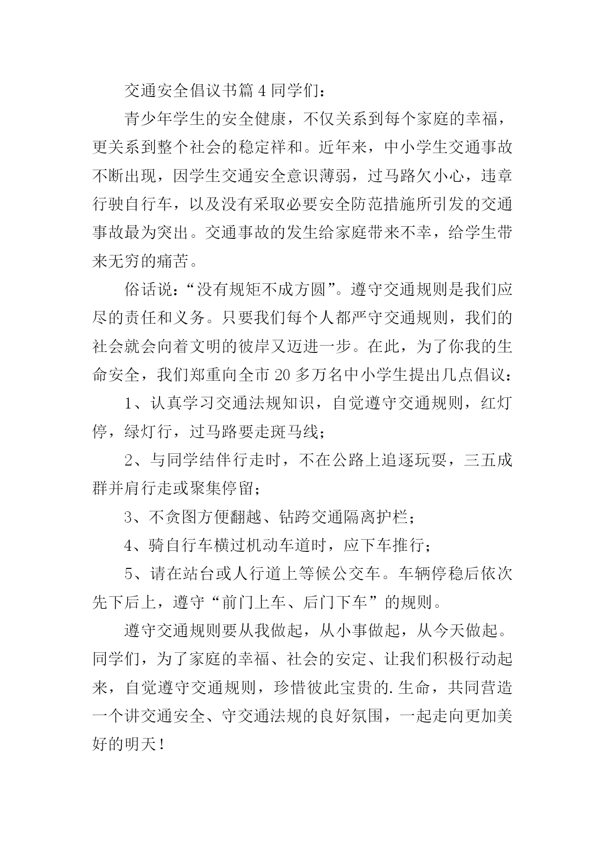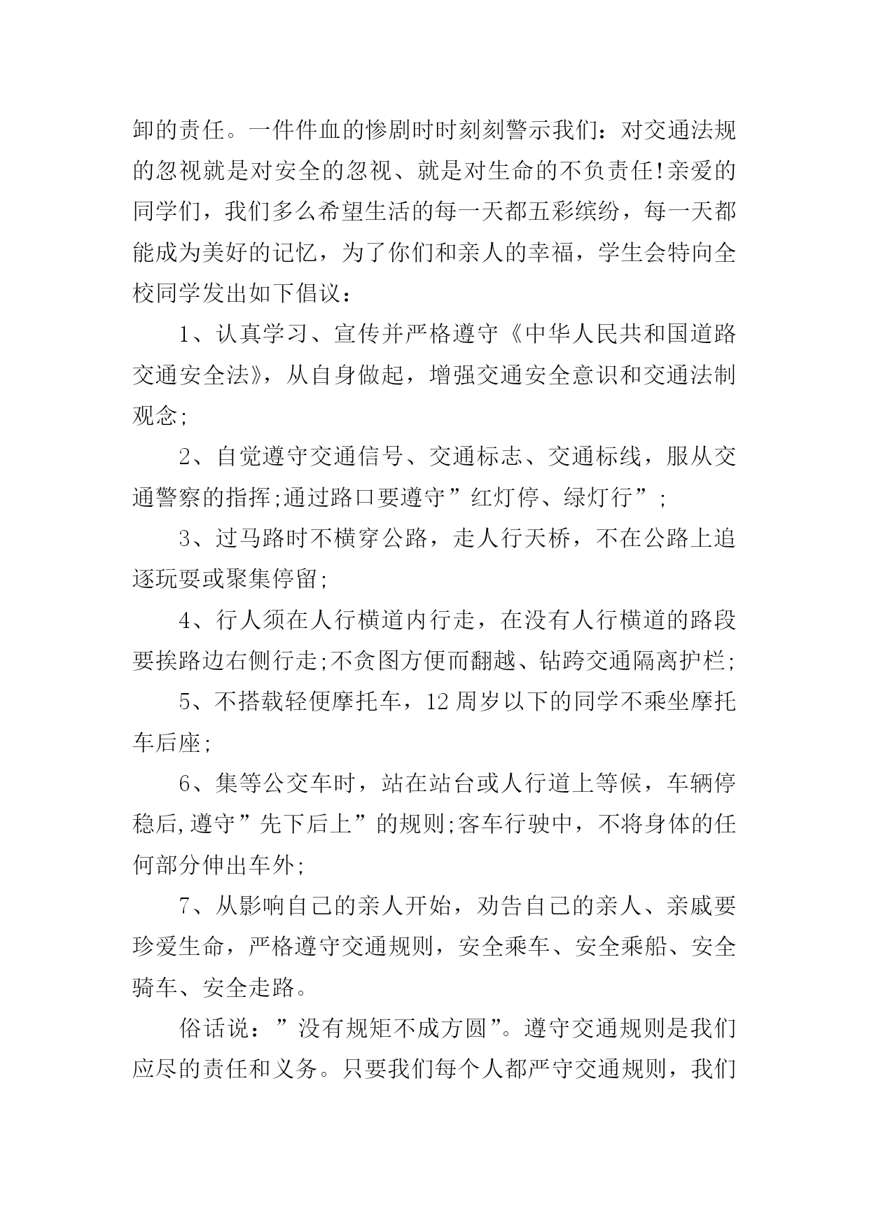 交通安全倡议书交通安全倡议书篇1随着经济的日益发展,平湖已变得越来越美丽,马路上车辆川流不息的景象随处可见。然而由于有些人交通安全意识的淡薄,在车水马龙的马路上演了一幕幕不可挽回的悲剧。当你看到一个个鲜活的生命消失于车轮之下,当你发现一阵阵欢声笑语湮没在尖锐的汽笛声中,当你面对那些触目惊心的场景时,能不感到痛心疾首吗?道路交通安全事故依然是各种事故领域的“头号杀手”。而导致悲剧发生的一个重要原因,就是我们欠缺安全防卫知识,自我保护能力差,因此对少年儿童进行安全教育的形势相当紧迫。有专家指出,通过安全教育,提高我们小学生的自我保护能力,80%的意外伤害事故是可以避免的。为加强对中小学生的安全教育,1996年2月,国家教委、公安部等六部委联合发出通知,把每年3月最后一周的星期一定为全国中小学生安全教育日,建立全国中小学生安全教育制度,敦促安全教育工作的开展。红灯短暂而生命长久,为了更好地宣传交通安全法规,增强学生交通安全意识,教育部将今年3月28日中小学生安全教育日主题定为“增强交通安全意识,提高自我保护能力”。为了更好地宣传交通安全知识,更好地珍视我们生命,在此,学校向全体师生发出倡议:1、我们要认真学习交通安全的法律法规,遵守交通规则,加强安全意识,树立交通安全文明公德;2、当我们徒步行走于人来车往的马路时,请时刻保持清醒的头脑,不在马路上嬉戏打闹;3、当我们时马路时,多一份谦让与耐心,不闯红灯,走人行横道,绝不能为贪一时之快,横穿马路;4、严禁12周岁以下的学生骑自行车。放学回家一定要排好路队。记得有一个故事。几个学者与一个老者同船共渡。学者们问老者是否懂得什么是哲学,老者连连摇头。学者们纷纷叹息:那你已经失去了一半的生命。这时一个巨浪打来,小船被掀翻了,老者问:“你们会不会游泳啊?”学者们异口同声地说不会。老者叹口气说:“那你们就失去了全部的生命。”虽然这只是一个故事,但其中蕴含的哲理却耐人寻味。灾难的发生对每个人来说,不分贫富贵贱,不论性别年龄。孩子、学子、工人、知识分子,人民公仆……无论咿呀学语,还是学富五车,无论幼小纤弱,还是身强力壮,如果缺少应有的警惕,不懂起码的安全常识,那么,危险一旦降临,本可能逃离的厄运,却都会在意料之外、客观之中发生了。遵章守纪,就是尊重生命,尊重自我。当我们能做到这一切的时候,我们的社会便向文明的彼岸又靠近了一步。重视交通安全,是我们每个人的义务,更是我们每个人的责任。让我们携起手来呵护这文明之花,让我们远离伤痛,珍爱彼此的生命吧。今天是第十个全国中小学生安全教育日,我们希望这个日子能够再次唤醒同学们对交通安全的重视。大地苏醒,春风又绿。我们要把平安的种子撒播进自己的心田。当它发芽开花、长成参天大树,我们必将收获更多的祥和、幸福和安宁。亲爱的同学们:当我们背起行囊,肩负着家人的希望,怀揣着对未来的美好蓝图,从五湖四海汇聚到祖国的首都北京时,当我们漫步于人来人往的宽阔街道时,常会慨叹这座城市的美丽与繁华。来源:免费范文网但您是否注意到隐藏在交通线上的危险呢?一组组惊人的数字、一幕幕惨不忍睹的画面、一个个载着锥心伤痛却又一去不返的年轻生命,这一切的矛头不约而同地指向了共同的事实,不遵守交通法规等同于不珍爱自己的生命。我们拥有年轻的身躯、远大的志向,却往往会忽略交通安全这种“小事”;我们谈理想、谈报国,却常常忽视“珍爱生命”这一底线。遵守交通规则不仅仅是我们所有人的义务,更是我们不可推卸的责任。为了远离血腥和悲痛,远离伤痕和担忧,我们发出如下倡议:1.认真学习交通法规,增强交通安全意识,时刻牢记交通安全。2.行人须在人行道行走,没有人行道的靠路边行走。3.横过马路时应走人行横道、过街天桥或地下通道,不要闯红灯,不要穿越、攀登或跨越隔离设施。4.不要手持物骑车,不要在骑车时带耳机听音乐、广播,不要骑车带人。5.骑自行车转弯时应放慢车速,向后观望,伸手示意,不要在机动车临近时突然猛拐。6.骑自行车不要与机动车争道抢行,不要低头疾驶。7.停放自行车应在规定区域内排放整齐,不得在绿地护栏、交通标志等物体上拴、锁自行车。8.乘车时注意文明礼貌,自觉购票,按顺序上下车,不争抢,不拥挤。9.积极宣传交通法规,争做交通安全青年志愿者和义务宣传员。同学们,为了自己,为了他人,让我们亮好“红绿灯”,远离交通事故,珍爱生命,齐心协力,共同营造一个安全的交通环境!交通安全倡议书篇2当我们背起行囊,肩负着亲人的希望,怀揣着对未来的美好蓝图,走进凤中美丽校园时;当我们朝气蓬勃,漫步于人来人往的宽阔街道时,你是否注意到隐藏在交通线上的危险呢?一组组惊人的数字、一幕幕惨不忍睹的画面、一个个载着锥心伤痛却又一去不返的年轻生命,这一切的矛头不约而同地指向了共同的事实,不遵守交通法规即