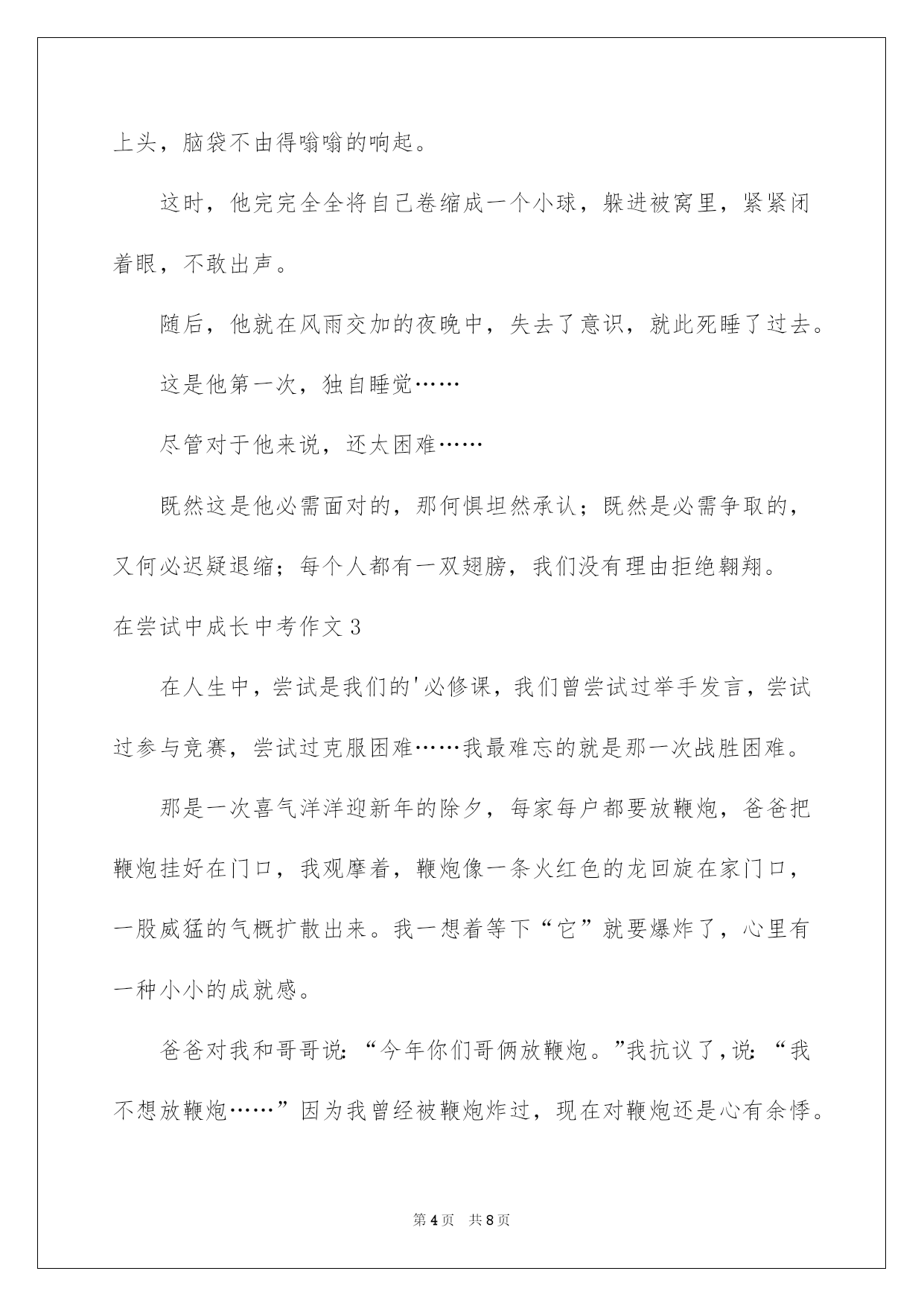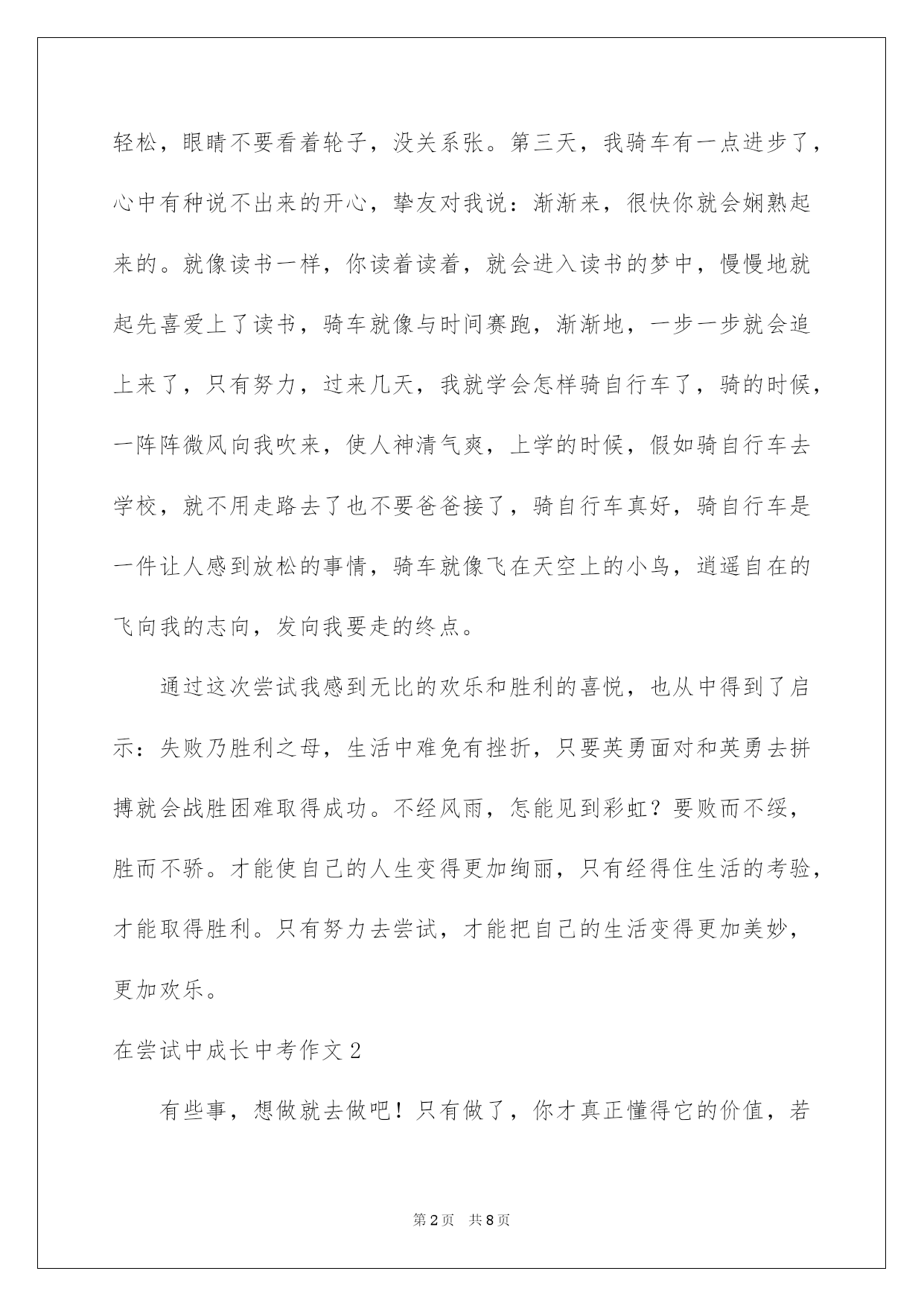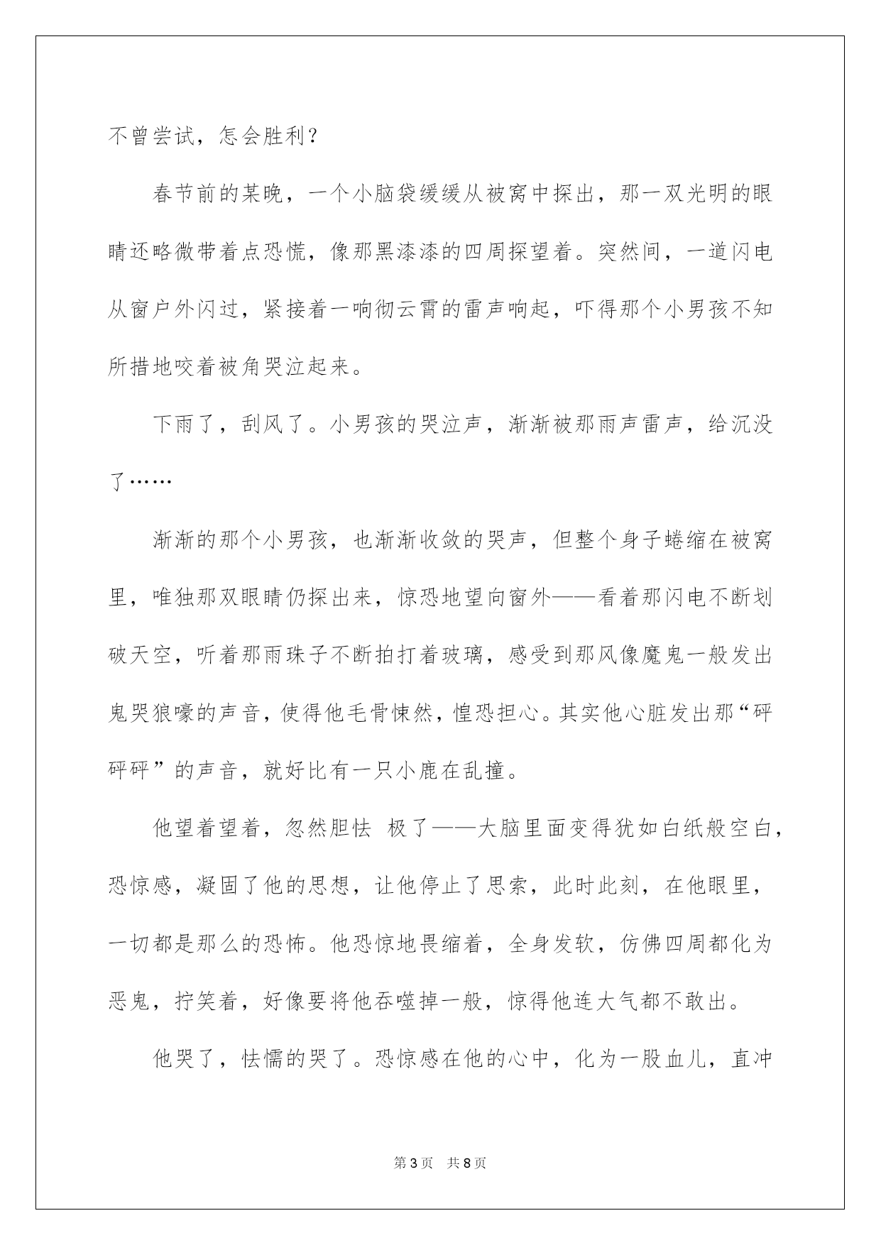 第PAGE\*Arabic\*MERGEFORMAT8页共NUMPAGES\*Arabic\*MERGEFORMAT8页第PAGE\*MERGEFORMAT8页共NUMPAGES\*MERGEFORMAT8页第PAGE\*MERGEFORMAT8页共NUMPAGES\*MERGEFORMAT8页第PAGE\*MERGEFORMAT8页共NUMPAGES\*MERGEFORMAT8页第PAGE\*MERGEFORMAT8页共NUMPAGES\*MERGEFORMAT8页第PAGE\*MERGEFORMAT8页共NUMPAGES\*MERGEFORMAT8页第PAGE\*MERGEFORMAT8页共NUMPAGES\*MERGEFORMAT8页第PAGE\*MERGEFORMAT8页共NUMPAGES\*MERGEFORMAT8页第PAGE\*MERGEFORMAT8页共NUMPAGES\*MERGEFORMAT8页第PAGE\*MERGEFORMAT8页共NUMPAGES\*MERGEFORMAT8页第PAGE\*MERGEFORMAT8页共NUMPAGES\*MERGEFORMAT8页2022在尝试中成长中考作文在尝试中成长中考作文在学习、工作乃至生活中,大家或多或少都会接触过作文吧,作文要求篇章结构完整,肯定要避开无结尾作文的出现。为了让您在写作文时更加简洁便利,以下是我为大家收集的在尝试中成长中考作文,欢迎大家借鉴与参考,希望对大家有所帮助。在尝试中成长中考作文1我经验过很多的尝试,也有很多风风雨雨。我的童年生活有胜利,有失败,有欢乐,有苦痛,也有酸甜苦辣,但是最令我难忘的是那一次尝试。记得有一次我要一辆自行车,爸爸二话没说,就帮我买了,其次天,我从房间里走出来时,望见一辆自行车。我心想我是不是在做梦啊,我就自己捏了自己一下,好疼啊,我原来不是在做梦啊,我太兴奋了,我推着一辆自行车就出去了,去让我的那些挚友教我,我的挚友笑着对我说:你真的想学骑车?我点了点头,挚友告知我说:骑车的时候,两只手抓着自行车的两边,头不许看下面,要看前面,要放轻松,眼睛不要看着轮子,没关系张。第三天,我骑车有一点进步了,心中有种说不出来的开心,挚友对我说:渐渐来,很快你就会娴熟起来的。就像读书一样,你读着读着,就会进入读书的梦中,慢慢地就起先喜爱上了读书,骑车就像与时间赛跑,渐渐地,一步一步就会追上来了,只有努力,过来几天,我就学会怎样骑自行车了,骑的时候,一阵阵微风向我吹来,使人神清气爽,上学的时候,假如骑自行车去学校,就不用走路去了也不要爸爸接了,骑自行车真好,骑自行车是一件让人感到放松的事情,骑车就像飞在天空上的小鸟,逍遥自在的飞向我的志向,发向我要走的终点。通过这次尝试我感到无比的欢乐和胜利的喜悦,也从中得到了启示:失败乃胜利之母,生活中难免有挫折,只要英勇面对和英勇去拼搏就会战胜困难取得成功。不经风雨,怎能见到彩虹?要败而不绥,胜而不骄。才能使自己的人生变得更加绚丽,只有经得住生活的考验,才能取得胜利。只有努力去尝试,才能把自己的生活变得更加美妙,更加欢乐。在尝试中成长中考作文2有些事,想做就去做吧!只有做了,你才真正懂得它的价值,若不曾尝试,怎会胜利?春节前的某晚,一个小脑袋缓缓从被窝中探出,那一双光明的眼睛还略微带着点恐慌,像那黑漆漆的四周探望着。突然间,一道闪电从窗户外闪过,紧接着一响彻云霄的雷声响起,吓得那个小男孩不知所措地咬着被角哭泣起来。下雨了,刮风了。小男孩的哭泣声,渐渐被那雨声雷声,给沉没了……渐渐的那个小男孩,也渐渐收敛的哭声,但整个身子蜷缩在被窝里,唯独那双眼睛仍探出来,惊恐地望向窗外——看着那闪电不断划破天空,听着那雨珠子不断拍打着玻璃,感受到那风像魔鬼一般发出鬼哭狼嚎的声音,使得他毛骨悚然,惶恐担心。其实他心脏发出那“砰砰砰”的声音,就好比有一只小鹿在乱撞。他望着望着,忽然胆怯极了——大脑里面变得犹如白纸般空白,恐惊感,凝固了他的思想,让他停止了思索,此时此刻,在他眼里,一切都是那么的恐怖。他恐惊地畏缩着,全身发软,仿佛四周都化为恶鬼,拧笑着,好像要将他吞噬掉一般,惊得他连大气都不敢出。他哭了,怯懦的哭了。恐惊感在他的心中,化为一股血儿,直冲上头,脑袋不由得嗡嗡的响起。这时,他完完全全将自己卷缩成一个小球,躲进被窝里,紧紧闭着眼,不敢出声。随后,他就在风雨交加的夜晚中,失去了意识,就此死睡了过去。这是他第一次,独自睡觉……尽管对于他来说,还太困难……既然这是他必需面对的,那何惧坦然承认;既然是必需争取的,又何必迟疑退缩;每个人都有一双翅膀,我们没有理由拒绝