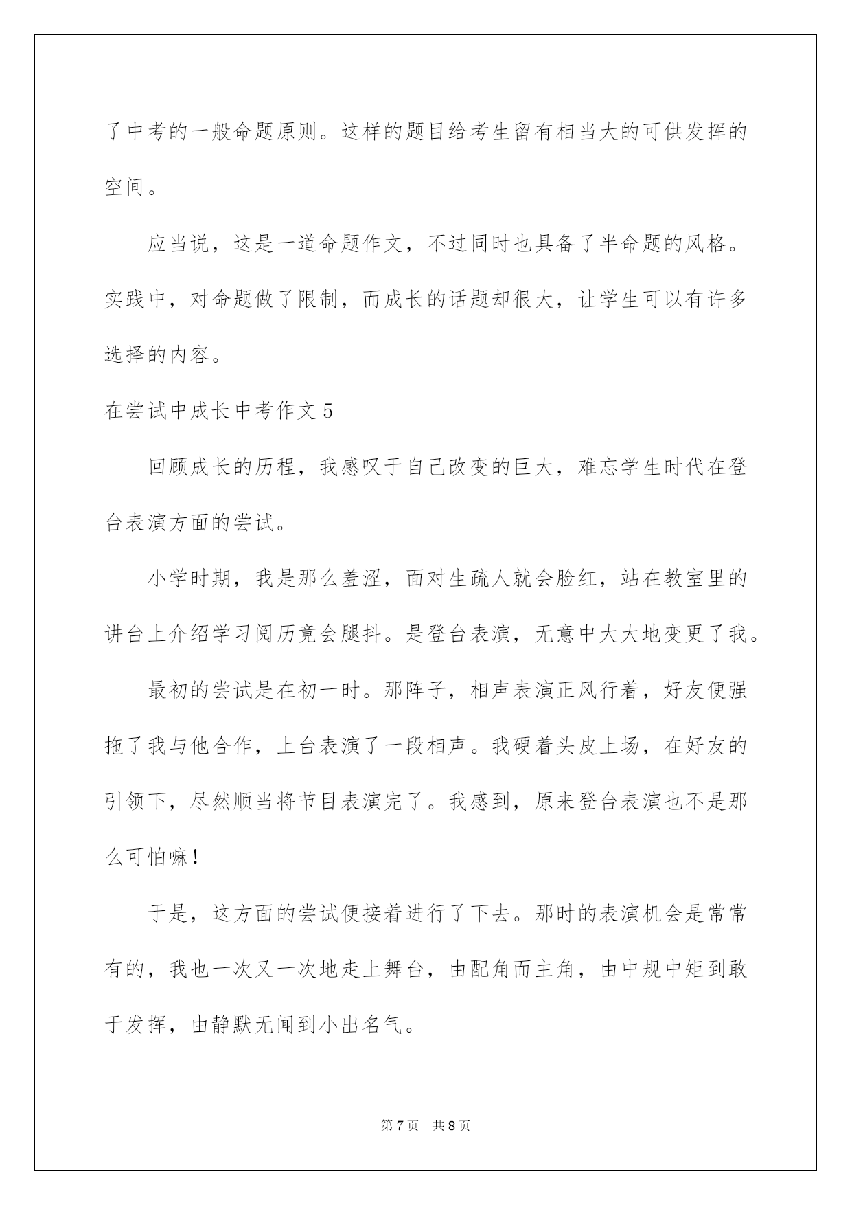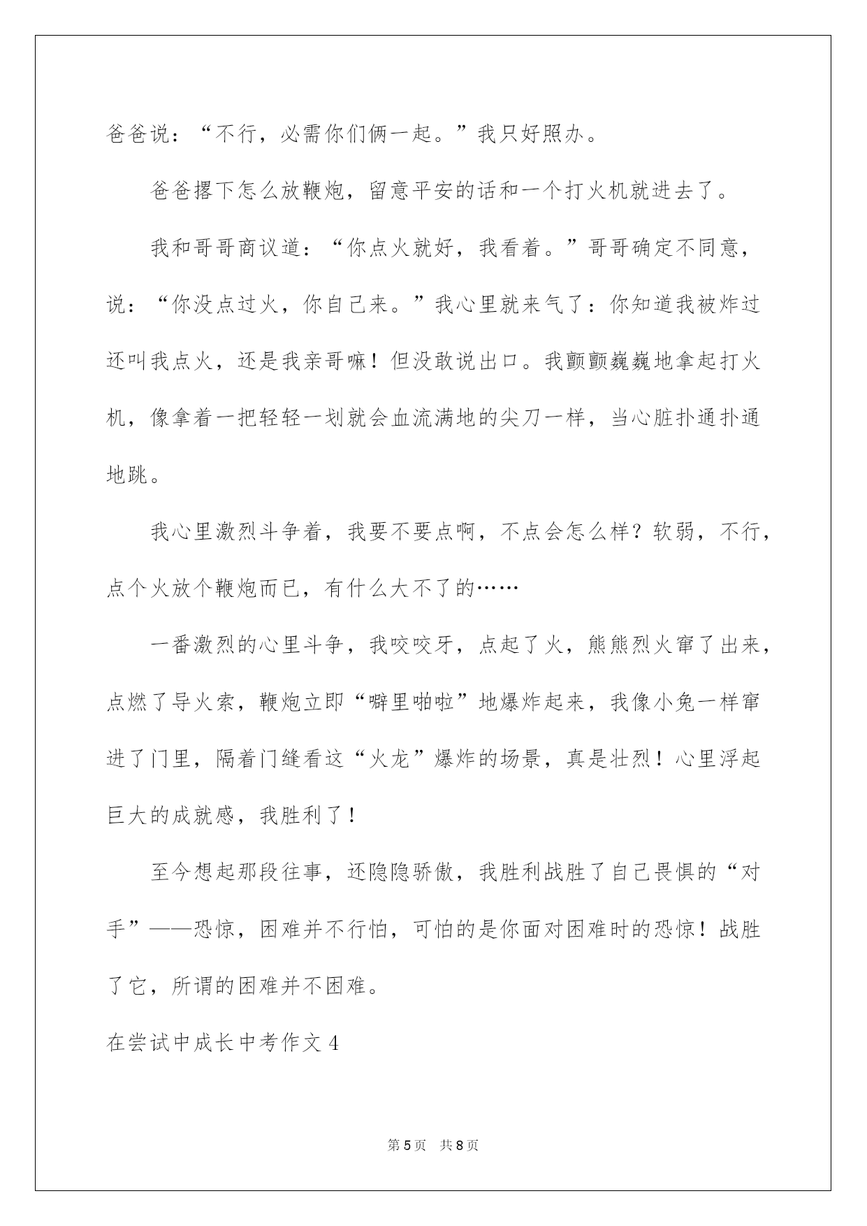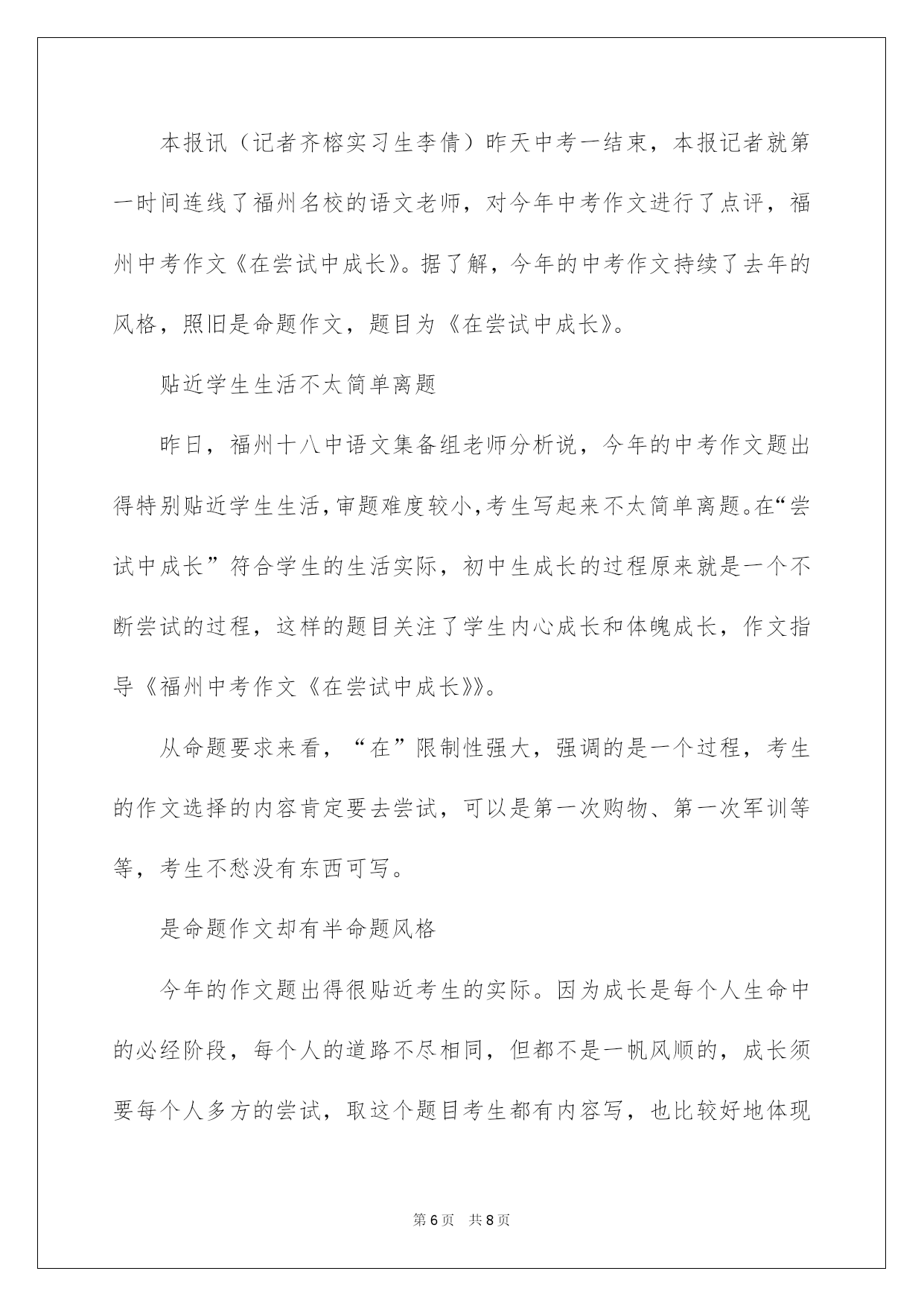 第PAGE\*Arabic\*MERGEFORMAT8页共NUMPAGES\*Arabic\*MERGEFORMAT8页第PAGE\*MERGEFORMAT8页共NUMPAGES\*MERGEFORMAT8页第PAGE\*MERGEFORMAT8页共NUMPAGES\*MERGEFORMAT8页第PAGE\*MERGEFORMAT8页共NUMPAGES\*MERGEFORMAT8页第PAGE\*MERGEFORMAT8页共NUMPAGES\*MERGEFORMAT8页第PAGE\*MERGEFORMAT8页共NUMPAGES\*MERGEFORMAT8页第PAGE\*MERGEFORMAT8页共NUMPAGES\*MERGEFORMAT8页第PAGE\*MERGEFORMAT8页共NUMPAGES\*MERGEFORMAT8页第PAGE\*MERGEFORMAT8页共NUMPAGES\*MERGEFORMAT8页第PAGE\*MERGEFORMAT8页共NUMPAGES\*MERGEFORMAT8页第PAGE\*MERGEFORMAT8页共NUMPAGES\*MERGEFORMAT8页2022在尝试中成长中考作文在尝试中成长中考作文在学习、工作乃至生活中,大家或多或少都会接触过作文吧,作文要求篇章结构完整,肯定要避开无结尾作文的出现。为了让您在写作文时更加简洁便利,以下是我为大家收集的在尝试中成长中考作文,欢迎大家借鉴与参考,希望对大家有所帮助。在尝试中成长中考作文1我经验过很多的尝试,也有很多风风雨雨。我的童年生活有胜利,有失败,有欢乐,有苦痛,也有酸甜苦辣,但是最令我难忘的是那一次尝试。记得有一次我要一辆自行车,爸爸二话没说,就帮我买了,其次天,我从房间里走出来时,望见一辆自行车。我心想我是不是在做梦啊,我就自己捏了自己一下,好疼啊,我原来不是在做梦啊,我太兴奋了,我推着一辆自行车就出去了,去让我的那些挚友教我,我的挚友笑着对我说:你真的想学骑车?我点了点头,挚友告知我说:骑车的时候,两只手抓着自行车的两边,头不许看下面,要看前面,要放轻松,眼睛不要看着轮子,没关系张。第三天,我骑车有一点进步了,心中有种说不出来的开心,挚友对我说:渐渐来,很快你就会娴熟起来的。就像读书一样,你读着读着,就会进入读书的梦中,慢慢地就起先喜爱上了读书,骑车就像与时间赛跑,渐渐地,一步一步就会追上来了,只有努力,过来几天,我就学会怎样骑自行车了,骑的时候,一阵阵微风向我吹来,使人神清气爽,上学的时候,假如骑自行车去学校,就不用走路去了也不要爸爸接了,骑自行车真好,骑自行车是一件让人感到放松的事情,骑车就像飞在天空上的小鸟,逍遥自在的飞向我的志向,发向我要走的终点。通过这次尝试我感到无比的欢乐和胜利的喜悦,也从中得到了启示:失败乃胜利之母,生活中难免有挫折,只要英勇面对和英勇去拼搏就会战胜困难取得成功。不经风雨,怎能见到彩虹?要败而不绥,胜而不骄。才能使自己的人生变得更加绚丽,只有经得住生活的考验,才能取得胜利。只有努力去尝试,才能把自己的生活变得更加美妙,更加欢乐。在尝试中成长中考作文2有些事,想做就去做吧!只有做了,你才真正懂得它的价值,若不曾尝试,怎会胜利?春节前的某晚,一个小脑袋缓缓从被窝中探出,那一双光明的眼睛还略微带着点恐慌,像那黑漆漆的四周探望着。突然间,一道闪电从窗户外闪过,紧接着一响彻云霄的雷声响起,吓得那个小男孩不知所措地咬着被角哭泣起来。下雨了,刮风了。小男孩的哭泣声,渐渐被那雨声雷声,给沉没了……渐渐的那个小男孩,也渐渐收敛的哭声,但整个身子蜷缩在被窝里,唯独那双眼睛仍探出来,惊恐地望向窗外——看着那闪电不断划破天空,听着那雨珠子不断拍打着玻璃,感受到那风像魔鬼一般发出鬼哭狼嚎的声音,使得他毛骨悚然,惶恐担心。其实他心脏发出那“砰砰砰”的声音,就好比有一只小鹿在乱撞。他望着望着,忽然胆怯极了——大脑里面变得犹如白纸般空白,恐惊感,凝固了他的思想,让他停止了思索,此时此刻,在他眼里,一切都是那么的恐怖。他恐惊地畏缩着,全身发软,仿佛四周都化为恶鬼,拧笑着,好像要将他吞噬掉一般,惊得他连大气都不敢出。他哭了,怯懦的哭了。恐惊感在他的心中,化为一股血儿,直冲上头,脑袋不由得嗡嗡的响起。这时,他完完全全将自己卷缩成一个小球,躲进被窝里,紧紧闭着眼,不敢出声。随后,他就在风雨交加的夜晚中,失去了意识,就此死睡了过去。这是他第一次,独自睡觉……尽管对于他来说,还太困难……既然这是他必需面对的,那何惧坦然承认;既然是必需争取的,又何必迟疑退缩;每个人都有一双翅膀,我们没有理由拒绝