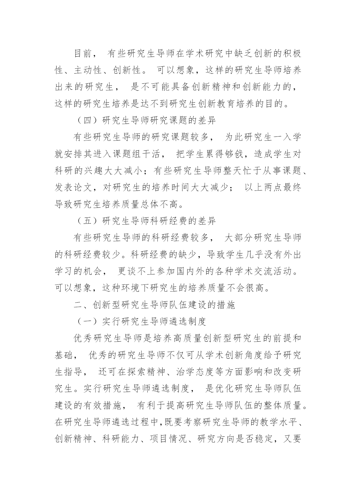创新型研究生导师队伍建设方案研究生教育处于高等教育的最高层次,承担着培养富有创新精神和创业能力的高层次人才的重任。如何培养研究生的创新意识,如何开发研究生的创新思维,如何激发研究生的创新潜力,如何提升研究生的创新能力,是当代创新型研究生教育的根本任务,也是研究生导师队伍所面临的一道难题。因此,需采取有效措施,充分挖掘研究生导师的创新潜力,全面提升研究生导师的创新能力,促进研究生导师的创新性发展,提高整体研究生的科研能力。一、影响创新型导师队伍建设的因素(一)研究生导师队伍的综合素质参差不齐目前,绝大多数研究生导师是由具有副教授以上职称的教师担任,整体水平较好。但也存在部分研究生导师的研究方向较窄、学术水平较低、科研能力较弱,且极少参加国内外的学术研讨会,对本学科的前沿知识知之甚少,创新能力有待进一步提高。(二)研究生导师与学生的交流不够由于从事教学活动及行政事务,导致部分研究生导师与其所带学生间的交流较少,且现在学生的主动学习、自我约束的自觉性较差。如不实施有效的管理和适当的指导,则会让部分研究生感到整天没事可做,从而影响研究生队伍整体素质的`提高。(三)研究生导师的创新意识薄弱和创新能力不强目前,有些研究生导师在学术研究中缺乏创新的积极性、主动性、创新性。可以想象,这样的研究生导师培养出来的研究生,是不可能具备创新精神和创新能力的,这样的研究生培养是达不到研究生创新教育培养的目的。(四)研究生导师研究课题的差异有些研究生导师的研究课题较多,为此研究生一入学就安排其进入课题组干活,把学生累得够戗,造成学生对科研的兴趣大大减小;有些研究生导师整天忙于从事课题、发表论文,对研究生的培养时间大大减少;以上两点最终导致研究生培养质量总体不高。(五)研究生导师科研经费的差异有些研究生导师的科研经费较多,大部分研究生导师的科研经费较少。科研经费的缺少,导致学生几乎没有外出学习的机会,更谈不上参加国内外的各种学术交流活动。可以想象,这种环境下研究生的培养质量不会很高。二、创新型研究生导师队伍建设的措施(一)实行研究生导师遴选制度优秀研究生导师是培养高质量创新型研究生的前提和基础,优秀的研究生导师不仅可从学术创新角度给予研究生指导,还可在探索精神、治学态度等方面影响和改变研究生。实行研究生导师遴选制度,是优化研究生导师队伍建设的有效措施,有利于提高研究生导师队伍的整体质量。在研究生导师遴选过程中,既要考察研究生导师的教学水平、创新精神、科研能力、项目情况、研究方向是否稳定,又要重视研究生导师的学术道德及个人修为,以确保整体研究生导师队伍的高素质。(二)加强研究生导师与学生的交流要达到这一目标,学校须规定每位导师所带研究生数量的上限,从而有效增加导师和研究生之间交流的次数和时间,提高创新型研究生培养的质量。通过建立一整套公平、公正、公开的研究生导师考核、评价机制,建设和完善一支富有创新精神和创新能力的研究生导师队伍,以期保证研究生导师在指导研究生期间的时间和精力的投入,实现创新型研究生培养的任务。(三)提高研究生导师的创新素质研究生导师的创新能力是创新型研究生培养质量的关键,研究生导师的创新意识直接影响着研究生创新能力的发展,因此,提高研究生导师的科研创新素质是培养学生创新能力的基础。所以,创新型研究生的培养应与导师的科研课题相结合,从而有助于促进创新型人才的培养,全面提高研究生科研创新能力和整体综合素质。(四)加强研究生导师的培训与交流重视新任研究生导师的岗前培训,在方式和内容上要有所创新,能够满足研究生导师们的需要,充分调动他们的积极性和主动性;实行多种形式的在岗培训,主要通过不定期的学术报告、出国访问、进修、留学等多形式、多渠道的方法提高研究生导师的学术水平;以期通过以上两种方式,营造良好的研究氛围,提高研究生导师的学术水平,确保研究生导师永远站在学术前沿,更好地完成创新型研究生的培养任务。(五)进一步引进和培养学科带头人学科带头人是研究生导师队伍的骨干和核心,代表着研究生导师队伍中的最高水平,所以,学科带头人的引进,有助于提升学校整体的科研水平和教学实力;在引进优秀人才的同时,要坚持“培养为主、引进为辅”的原则,充分发挥现有人才的作用,要注重中青年导师的培养,造就一批过硬的学科带头人,促进研究生导师队伍的后备力量。研究生导师在培养具有创新意识和创新能力的研究生中起着举足轻重的作用,只有努力提高研究生导师队伍的整体素质,才能培养出高质量的研究生队伍。研究生导师队伍的管理与建设是一项艰巨而重要的任务,随着学科建设的发展和师资队伍的完善,研究生导师队伍的建设与管理也将取得显著成效。参考文献:[1]王正平.高等学校研究生导师队伍建设探讨[J].中国成人教育,2008(12).[2]吕向前.研究生导师队伍建设探析———基于研究生培养机制改革视