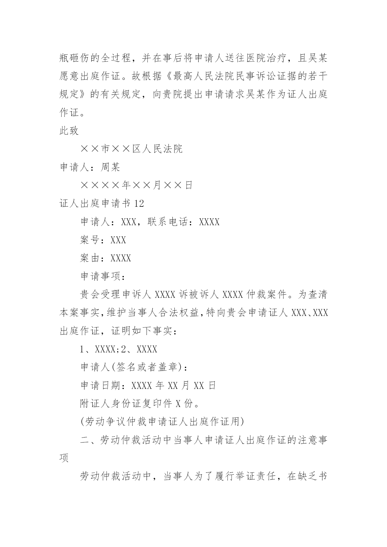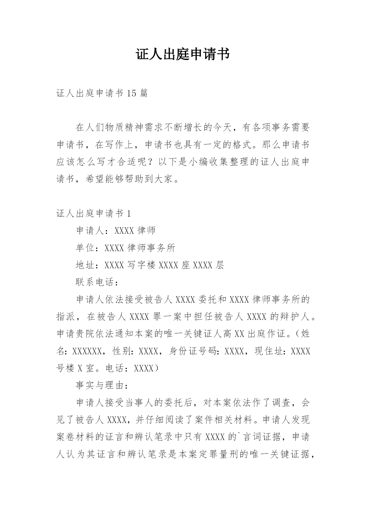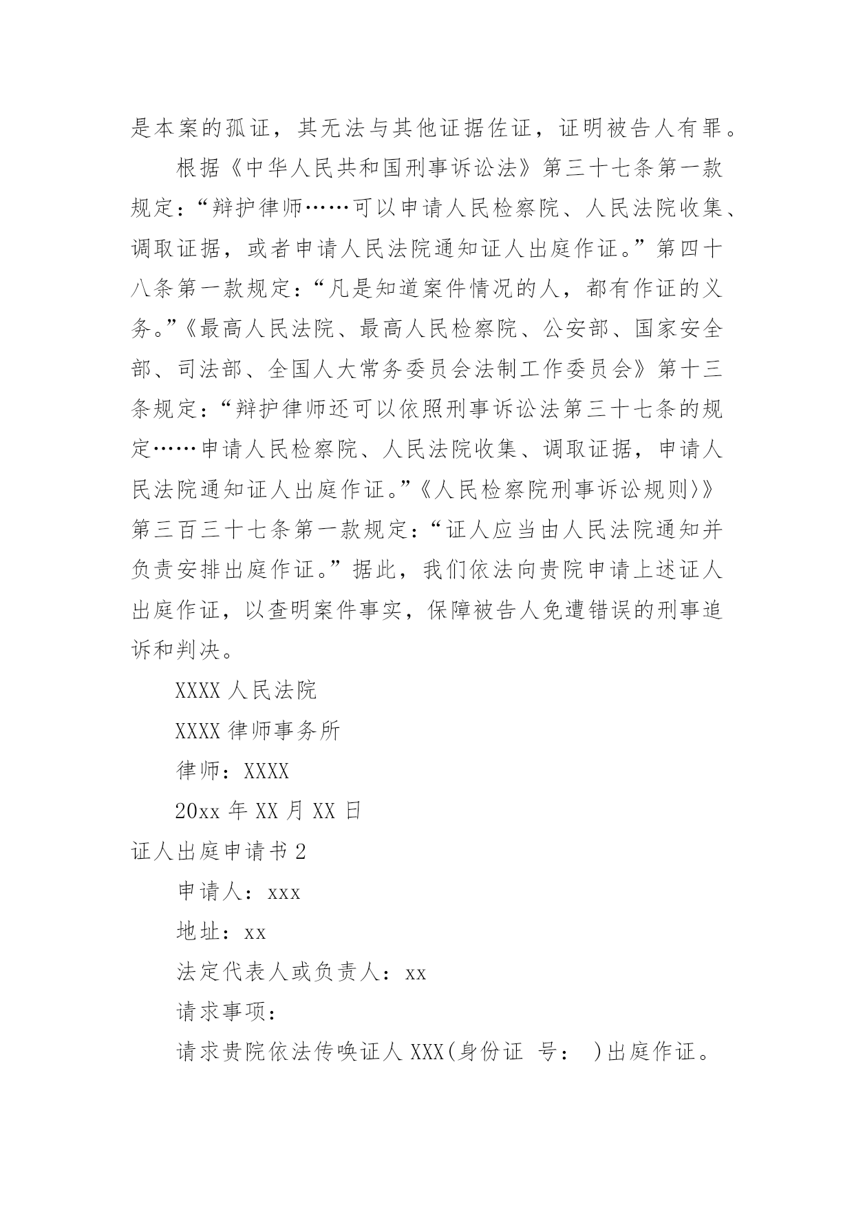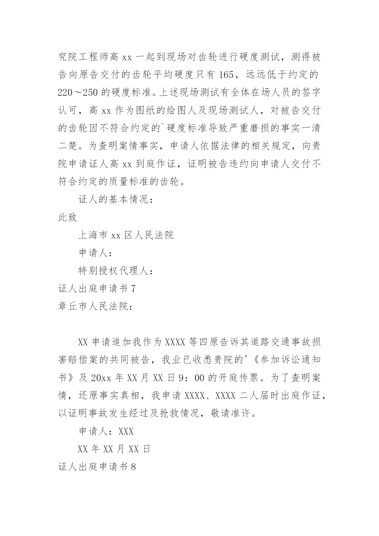 证人出庭申请书证人出庭申请书15篇在人们物质精神需求不断增长的今天,有各项事务需要申请书,在写作上,申请书也具有一定的格式。那么申请书应该怎么写才合适呢?以下是小编收集整理的证人出庭申请书,希望能够帮助到大家。证人出庭申请书1申请人:XXXX律师单位:XXXX律师事务所地址:XXXX写字楼XXXX座XXXX层联系电话:申请人依法接受被告人XXXX委托和XXXX律师事务所的指派,在被告人XXXX罪一案中担任被告人XXXX的辩护人。申请贵院依法通知本案的唯一关键证人高XX出庭作证。(姓名:XXXXXX,性别:XXXX,身份证号码:XXXX,现住址:XXXX号楼X室。电话:XXXX)事实与理由:申请人接受当事人的委托后,对本案依法作了调查,会见了被告人XXXX,并仔细阅读了案件相关材料。申请人发现案卷材料的证言和辨认笔录中只有XXXX的`言词证据,申请人认为其证言和辨认笔录是本案定罪量刑的唯一关键证据,是本案的孤证,其无法与其他证据佐证,证明被告人有罪。根据《中华人民共和国刑事诉讼法》第三十七条第一款规定:“辩护律师……可以申请人民检察院、人民法院收集、调取证据,或者申请人民法院通知证人出庭作证。”第四十八条第一款规定:“凡是知道案件情况的人,都有作证的义务。”《最高人民法院、最高人民检察院、公安部、国家安全部、司法部、全国人大常务委员会法制工作委员会》第十三条规定:“辩护律师还可以依照刑事诉讼法第三十七条的规定……申请人民检察院、人民法院收集、调取证据,申请人民法院通知证人出庭作证。”《人民检察院刑事诉讼规则〉》第三百三十七条第一款规定:“证人应当由人民法院通知并负责安排出庭作证。”据此,我们依法向贵院申请上述证人出庭作证,以查明案件事实,保障被告人免遭错误的刑事追诉和判决。XXXX人民法院XXXX律师事务所律师:XXXX20xx年XX月XX日证人出庭申请书2申请人:xxx地址:xx法定代表人或负责人:xx请求事项:请求贵院依法传唤证人XXX(身份证号:)出庭作证。事实与理由:申请人诉XXX纠纷案件,贵院已经以(XXX)XXX法民X初字第XX号案件予以立案。证人XXX系参与涉案XXX人员,了解涉案XXX情况,为查明案件事实,申请人根据《最高人民法院关于民事诉讼证据的若干规定》第五十四条的规定,申请XXX出庭作证,证明涉案XXX情况,请予以准许。此致XXX人民法院申请人:时间:证人出庭申请书3申请人:xxx,女,汉族,xxx年x月x日出生,住xx省xx市庐阳区xxx路xxx号x幢xxx室。请求事项:请求贵院依法传唤证人xxx(身份证号:xxx)出庭作证。事实与理由:申请人与xxx买卖合同纠纷案件,贵院已经以(20xx)x民一初字第xxx号案件予以立案。证人xxx了解涉案情况,为查明案件事实,申请人根据《最高人民法院关于民事诉讼证据的若干规定》第五十四条的规定,申请xxx出庭作证,请予以准许。此致xx市庐阳区人民法院申请人:年月日证人出庭申请书4申请人:_____________住所:______________法定代表人:_________职务:______________请求事项:____________________请求跟贵院准许申请人聘请的专家对司法鉴定所出具《司法鉴定意见书》提出专业意见。事实与理由:_________________________在诉我公司纠纷一案中,申请人根据《中华人民共和国民事诉讼法》之规定,聘请该方面专家出庭就司法鉴定人作出的鉴定意见及专业问题提出专业意见,请求准许。此致人民法院申请人:______年____月____日附专家名单:___________________工作单位:______________________身份证号________________________联系电话:_______________________住址:____________________________证人出庭申请书5申请人:____________住所:______________法定代表人:____________职务:_________________电话:_________________请求事项:_________________请求跟贵院准许申请人聘请的专家对事实与理由在诉一案中,申请人根据《中华人民共和国民事诉讼法》第七十九条之规定,拟聘请该方面专家出庭就鉴定人作出的鉴定意见或专业问题提出意见,请求准许。此致人民法院申请人:________________________年___月____日证人出庭申请书6申请人:江苏xxxxx有限公司,地址江苏省xxx县xxxx工业园区8号。法定代表人:xxx,董事长。申请事项:申请证人高xx出庭作证。证明对象:证明被告上海xxxxx齿轮有限公司向申请人