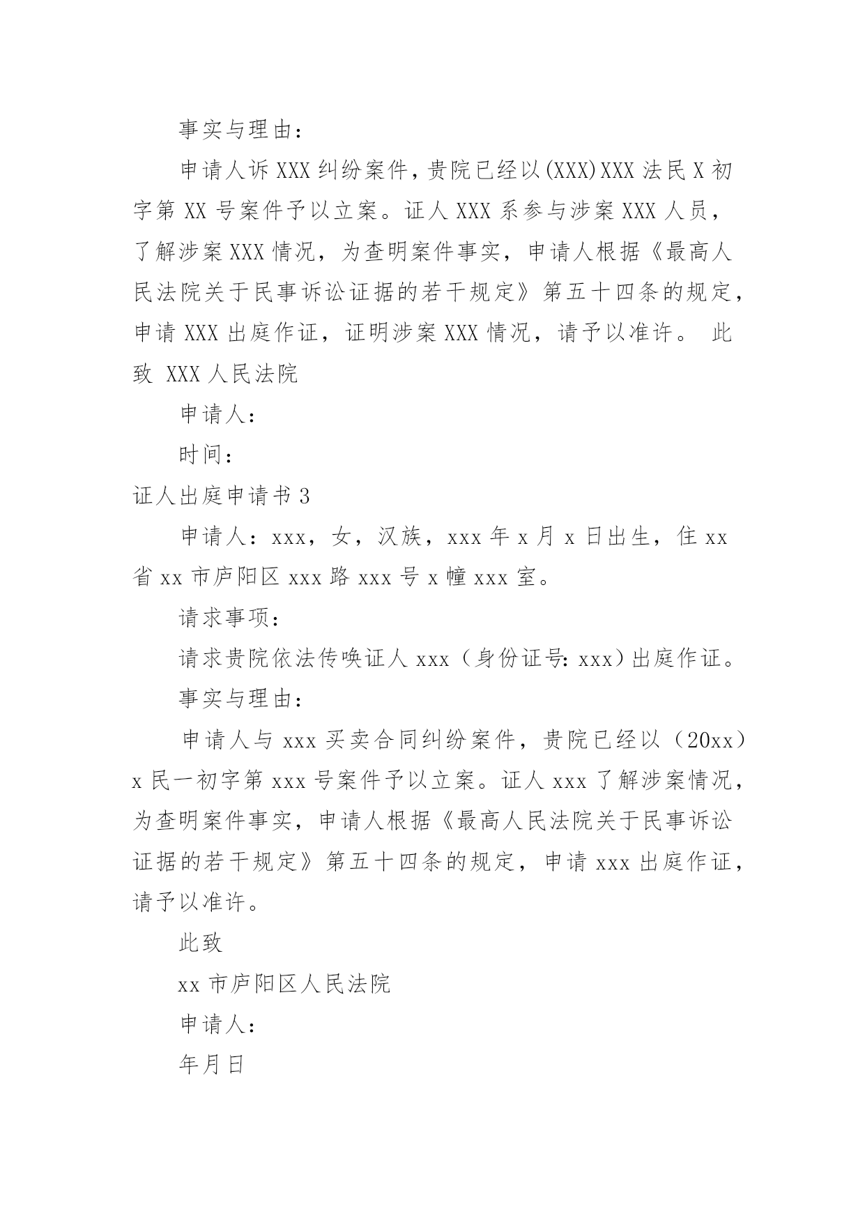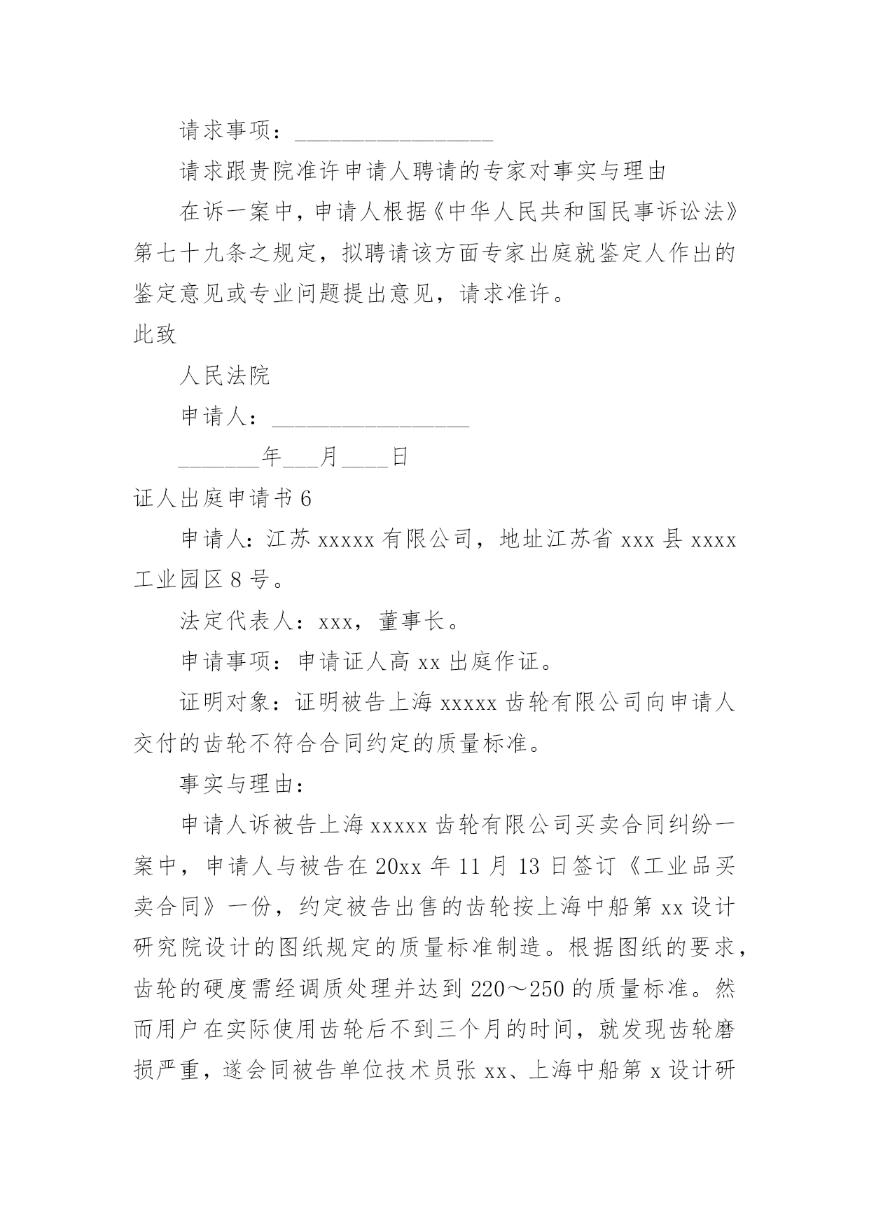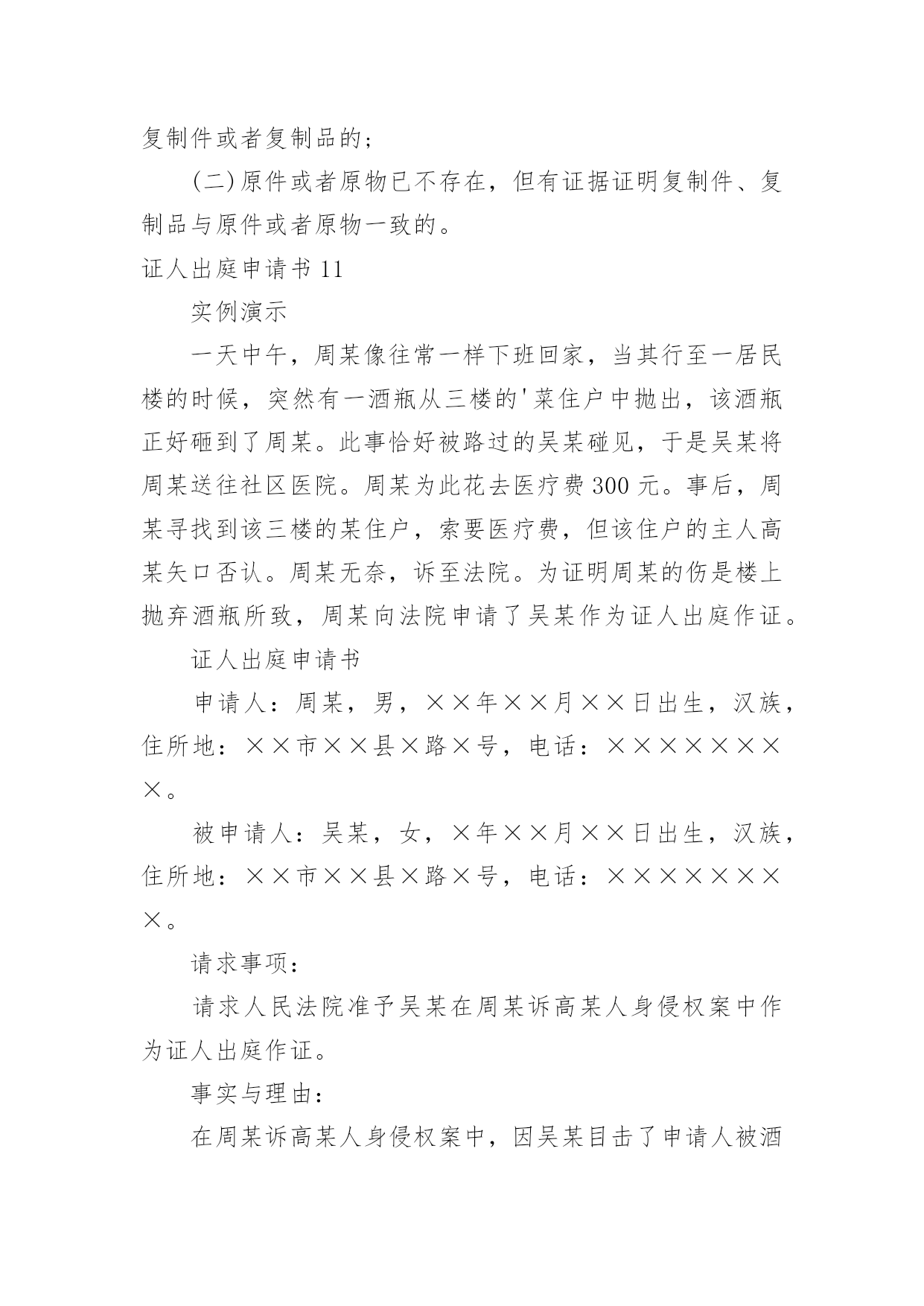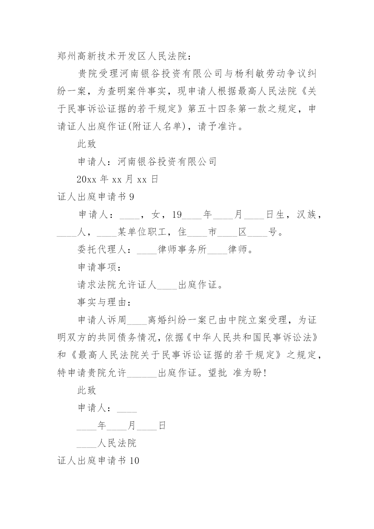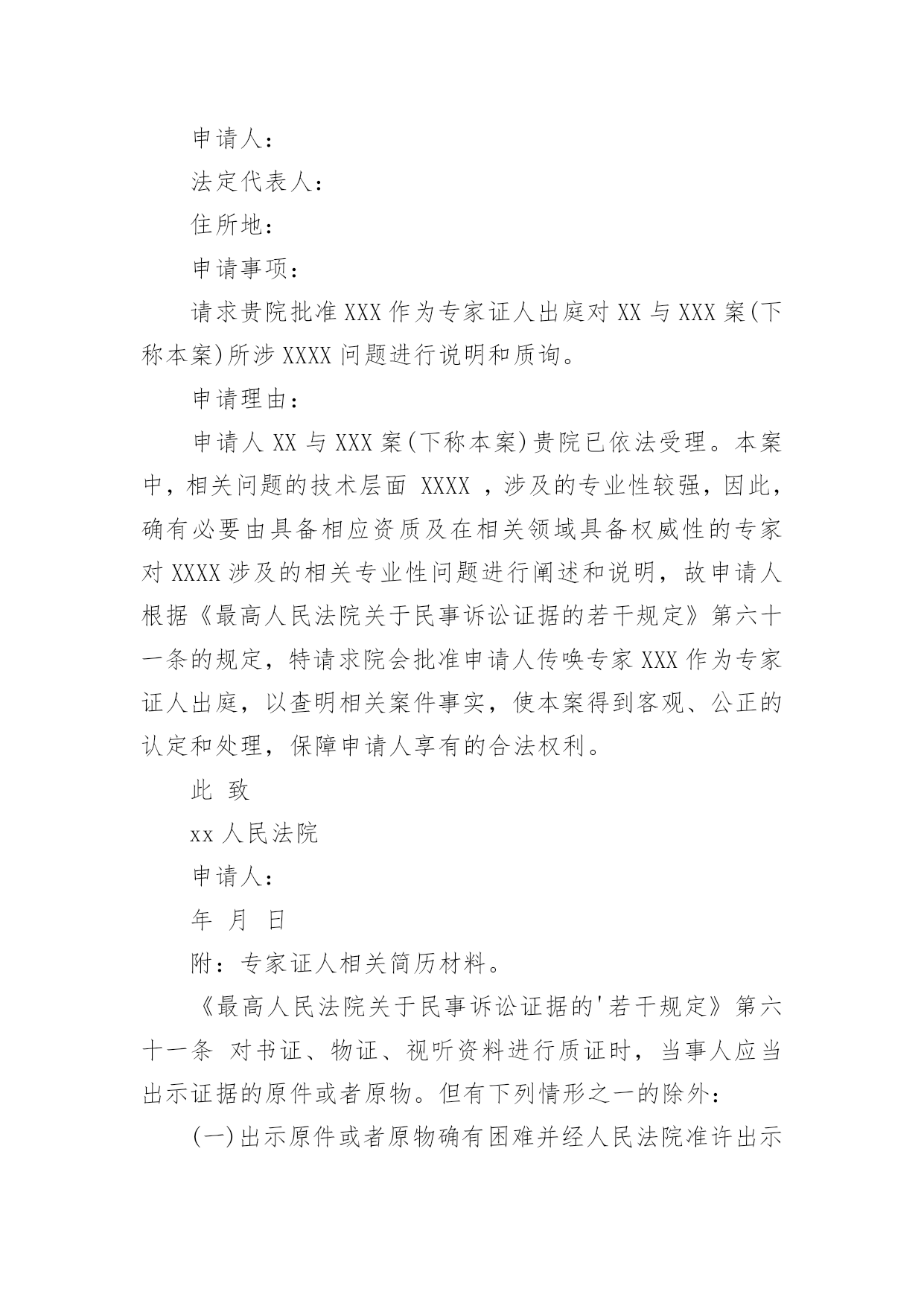 证人出庭申请书证人出庭申请书15篇在人们物质精神需求不断增长的今天,有各项事务需要申请书,在写作上,申请书也具有一定的格式。那么申请书应该怎么写才合适呢?以下是小编收集整理的证人出庭申请书,希望能够帮助到大家。证人出庭申请书1申请人:XXXX律师单位:XXXX律师事务所地址:XXXX写字楼XXXX座XXXX层联系电话:申请人依法接受被告人XXXX委托和XXXX律师事务所的指派,在被告人XXXX罪一案中担任被告人XXXX的辩护人。申请贵院依法通知本案的唯一关键证人高XX出庭作证。(姓名:XXXXXX,性别:XXXX,身份证号码:XXXX,现住址:XXXX号楼X室。电话:XXXX)事实与理由:申请人接受当事人的委托后,对本案依法作了调查,会见了被告人XXXX,并仔细阅读了案件相关材料。申请人发现案卷材料的证言和辨认笔录中只有XXXX的`言词证据,申请人认为其证言和辨认笔录是本案定罪量刑的唯一关键证据,是本案的孤证,其无法与其他证据佐证,证明被告人有罪。根据《中华人民共和国刑事诉讼法》第三十七条第一款规定:“辩护律师……可以申请人民检察院、人民法院收集、调取证据,或者申请人民法院通知证人出庭作证。”第四十八条第一款规定:“凡是知道案件情况的人,都有作证的义务。”《最高人民法院、最高人民检察院、公安部、国家安全部、司法部、全国人大常务委员会法制工作委员会》第十三条规定:“辩护律师还可以依照刑事诉讼法第三十七条的规定……申请人民检察院、人民法院收集、调取证据,申请人民法院通知证人出庭作证。”《人民检察院刑事诉讼规则〉》第三百三十七条第一款规定:“证人应当由人民法院通知并负责安排出庭作证。”据此,我们依法向贵院申请上述证人出庭作证,以查明案件事实,保障被告人免遭错误的刑事追诉和判决。XXXX人民法院XXXX律师事务所律师:XXXX20xx年XX月XX日证人出庭申请书2申请人:xxx地址:xx法定代表人或负责人:xx请求事项:请求贵院依法传唤证人XXX(身份证号:)出庭作证。事实与理由:申请人诉XXX纠纷案件,贵院已经以(XXX)XXX法民X初字第XX号案件予以立案。证人XXX系参与涉案XXX人员,了解涉案XXX情况,为查明案件事实,申请人根据《最高人民法院关于民事诉讼证据的若干规定》第五十四条的规定,申请XXX出庭作证,证明涉案XXX情况,请予以准许。此致XXX人民法院申请人:时间:证人出庭申请书3申请人:xxx,女,汉族,xxx年x月x日出生,住xx省xx市庐阳区xxx路xxx号x幢xxx室。请求事项:请求贵院依法传唤证人xxx(身份证号:xxx)出庭作证。事实与理由:申请人与xxx买卖合同纠纷案件,贵院已经以(20xx)x民一初字第xxx号案件予以立案。证人xxx了解涉案情况,为查明案件事实,申请人根据《最高人民法院关于民事诉讼证据的若干规定》第五十四条的规定,申请xxx出庭作证,请予以准许。此致xx市庐阳区人民法院申请人:年月日证人出庭申请书4申请人:_____________住所:______________法定代表人:_________职务:______________请求事项:____________________请求跟贵院准许申请人聘请的专家对司法鉴定所出具《司法鉴定意见书》提出专业意见。事实与理由:_________________________在诉我公司纠纷一案中,申请人根据《中华人民共和国民事诉讼法》之规定,聘请该方面专家出庭就司法鉴定人作出的鉴定意见及专业问题提出专业意见,请求准许。此致人民法院申请人:______年____月____日附专家名单:___________________工作单位:______________________身份证号________________________联系电话:_______________________住址:____________________________证人出庭申请书5申请人:____________住所:______________法定代表人:____________职务:_________________电话:_________________请求事项:_________________请求跟贵院准许申请人聘请的专家对事实与理由在诉一案中,申请人根据《中华人民共和国民事诉讼法》第七十九条之规定,拟聘请该方面专家出庭就鉴定人作出的鉴定意见或专业问题提出意见,请求准许。此致人民法院申请人:________________________年___月____日证人出庭申请书6申请人:江苏xxxxx有限公司,地址江苏省xxx县xxxx工业园区8号。法定代表人:xxx,董事长。申请事项:申请证人高xx出庭作证。证明对象:证明被告上海xxxxx齿轮有限公司向申请人