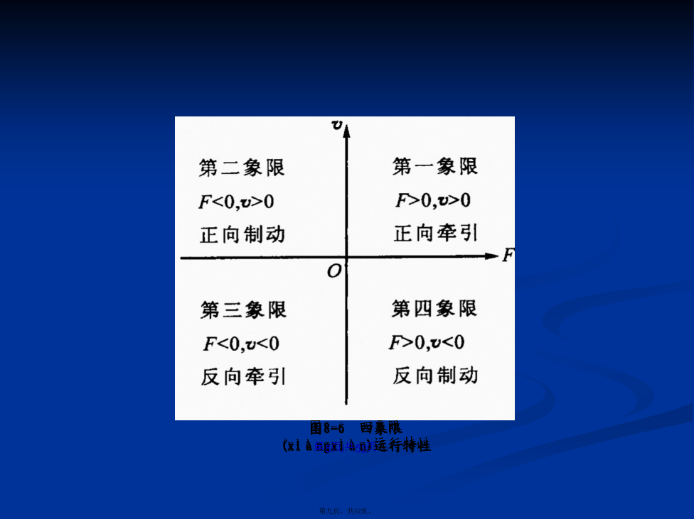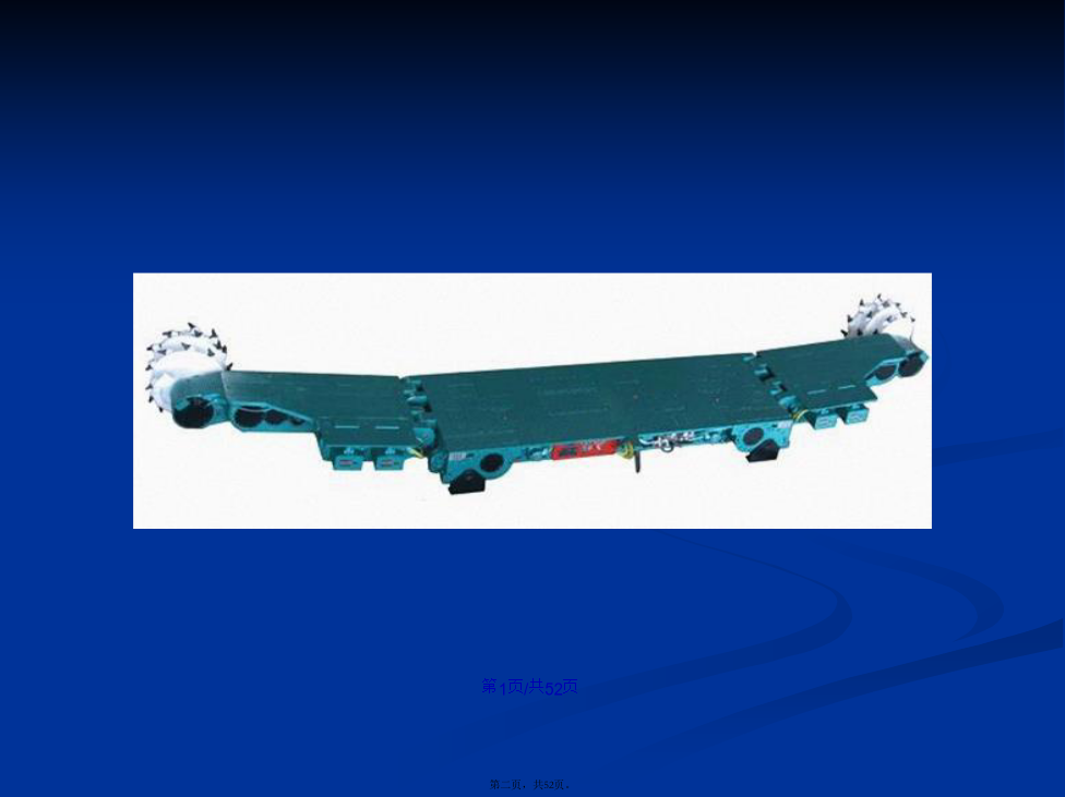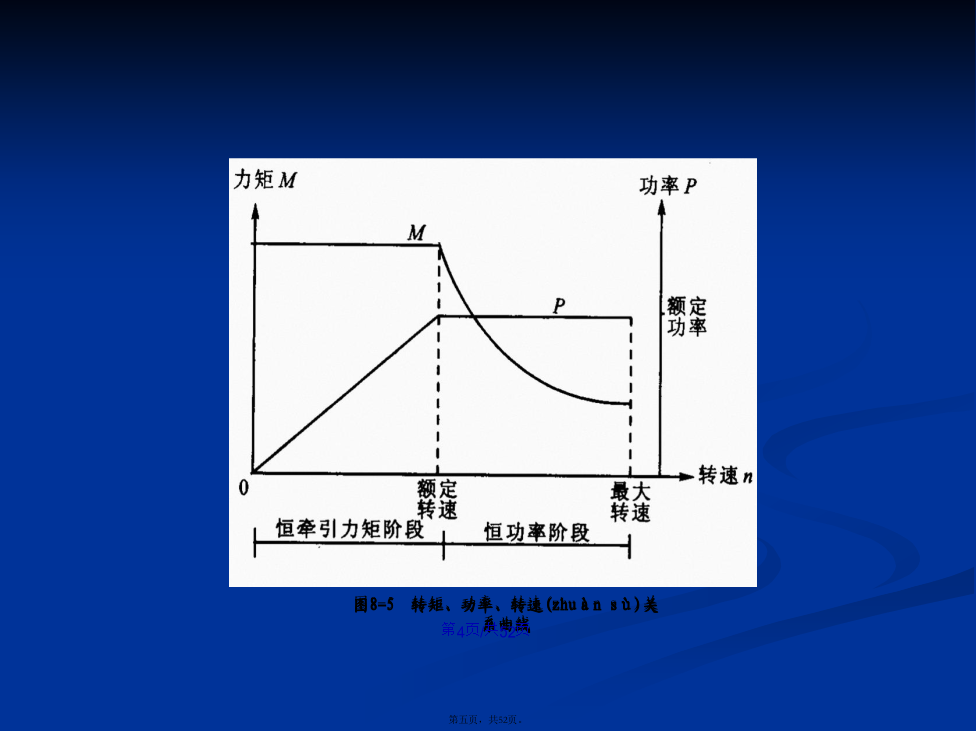 会计学/1)恒牵引力矩阶段采煤机在割煤阶段,滚筒与煤壁接触,阻力较大,牵引电动机的转速n从零到额定转速ne。为充分发挥采煤机的牵引力但又不致损坏,要求采煤机恒定(héngdìng)在允许的最大牵引力矩M下工作,故称为恒牵引力矩阶段。电动机的力矩M与功率P的关系为:M=9550P/n牵引力矩M一定时,功率P与转速n成正比,为一条斜线,如图8-5所示。图8-5转矩、功率、转速(zhuànsù)关系曲线2)恒功率阶段在调动阶段,滚筒与煤壁不接触,此时没有切割阻力,所需牵引力较小,要求牵引速度较高,牵引电动机的转速从ne至最大转速nm(调动转速)。为了充分利用电动机的功率,采煤机恒定(héngdìng)在允许的最大输出功率Pm下工作,故称为恒功率阶段。由公式M=9550P/n可知,功率Pm一定时,牵引力矩M与电动机转速n成反比,为一条双曲线,如图8-5所示。图8-6四象限(xiàngxiàn)运行特性7.具有完善的控制、检测、诊断、显示系统。能实现(shíxiàn)对采煤机的各种人工控制、遥控及自动控制;能对运行中的各种参数如电流、电压、速度、温度、水压和负载等情况实时检测,并控制采煤机做出相应的处理;当某些参量超过允许值时能发出相应的报警信号,并进行必要的保护;能对采煤机的部件进行自检和故障诊断;能显示运行中各种参量的图形和数据,并可向地面控制中心传输,从而为实现(shíxiàn)工作面的自动化、无人化控制奠定了基础。///三、电气系统的作用采煤机的电气控制系统主回路连接如图8-8所示,用于实现对电动机的电源控制。从图中可看出,来自工作面平巷馈电开关中的1140v三相交流电源经动力电缆接至采煤机主断路器的线路侧,线路侧接有可编程控制器控制的三相氖灯R、S、T(在线电源指示),还接有一台单相控制变压器作为控制线路的电源。主断路器的负载侧有两路出线,一路直接(zhíjiē)供给左、右截割电动机,另一路分别供给液压泵电动机、破碎机电动机、牵引主变压器。牵引主变压器将1140v变为460v,经牵引系统变为直流供给牵引电动机。图8-8Electral000系列采煤机电气控制系统(kònɡzhìxìtǒnɡ)主回路控制变压器二次侧引出的辅助回路电源配电系统(xìtǒng)如图8-9所示,用来向各辅助回路供电。该变压器有A、B、C三路输出。A路为交流230v向1#~4#直流电源供电,B路是交流230v向5#、6#直流电源及本安电源供电,C路是交流15v向漏电保护电路供电。图8-9Electral000系列电牵引采煤机辅助回路电源(diànyuán)配电系统图8-10采煤机的先导(xiāndǎo)控制回路/图8-11牵引系统电气(diànqì)原理框图1)牵引(qiānyǐn)系统的控制/能力体现一、采煤机的操作1.采煤机电源(diànyuán)的合闸与分闸采煤机电源(diànyuán)的合闸与分闸是通过采煤机上的主回路断路器手柄完成的。断路器手柄以下有三个位置:1)试验位置断路器手柄处于试验位置时,采煤机不能运行,但可以通过监视单元模拟采煤机的运行,各种模拟运行状态可以在显示单元上显示。一般在采煤机首次运行前或发生故障修复后,都应将断路器手柄置于试验位置,进行采煤机运行状况的试验和检查。2)运行位置断路器手柄处于运行位置时,先导回路中的辅助接点1QF闭合,按下采煤机的启动按钮,接通工作面平巷开关上的先导回路,接通采煤机电源,可编程控制器单元(dānyuán)上的三相电源指示灯点亮,采煤机上的所有交流电动机、牵引部和各种液压功能均处于待工作状态,此时操作人员可选择操作控制方式,然后进行运行操作。3)断开位置停止采煤机时,如果采煤机正在牵引运行,应先将牵引速度减小到零,然后(ránhòu)按停止或紧急停止按钮,再将主断路器手柄扳到断开位置,并将手柄拿走,最后把平巷开关断开并锁定,使采煤机固定在断电状态,防止未经批准的人员在机器有故障时或机器正在检修时随意合闸。2.采煤机的控制方式(fāngshì)及运行操作1)控制方式(fāngshì)2)运行(yùnxíng)操作//二、采煤机的状态(zhuàngtài)显示/////////