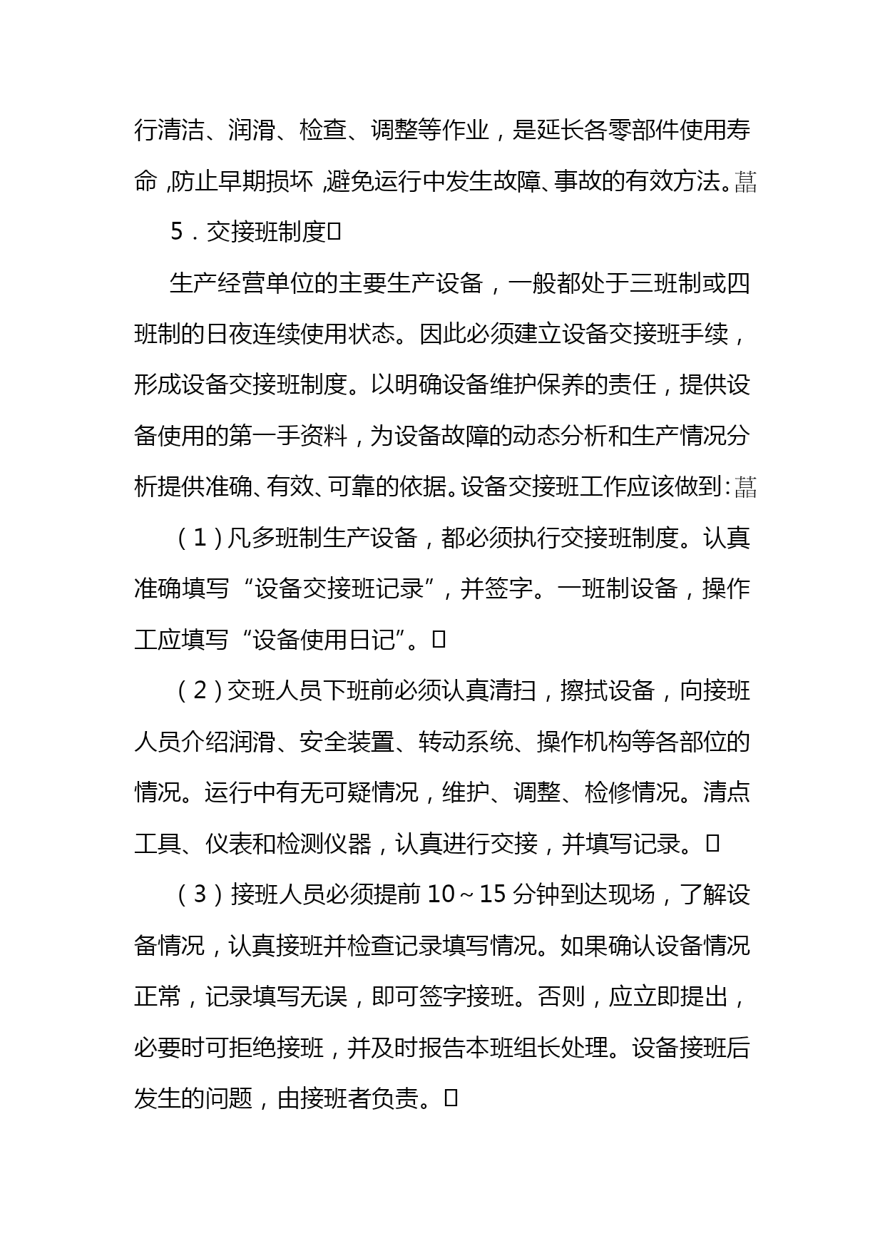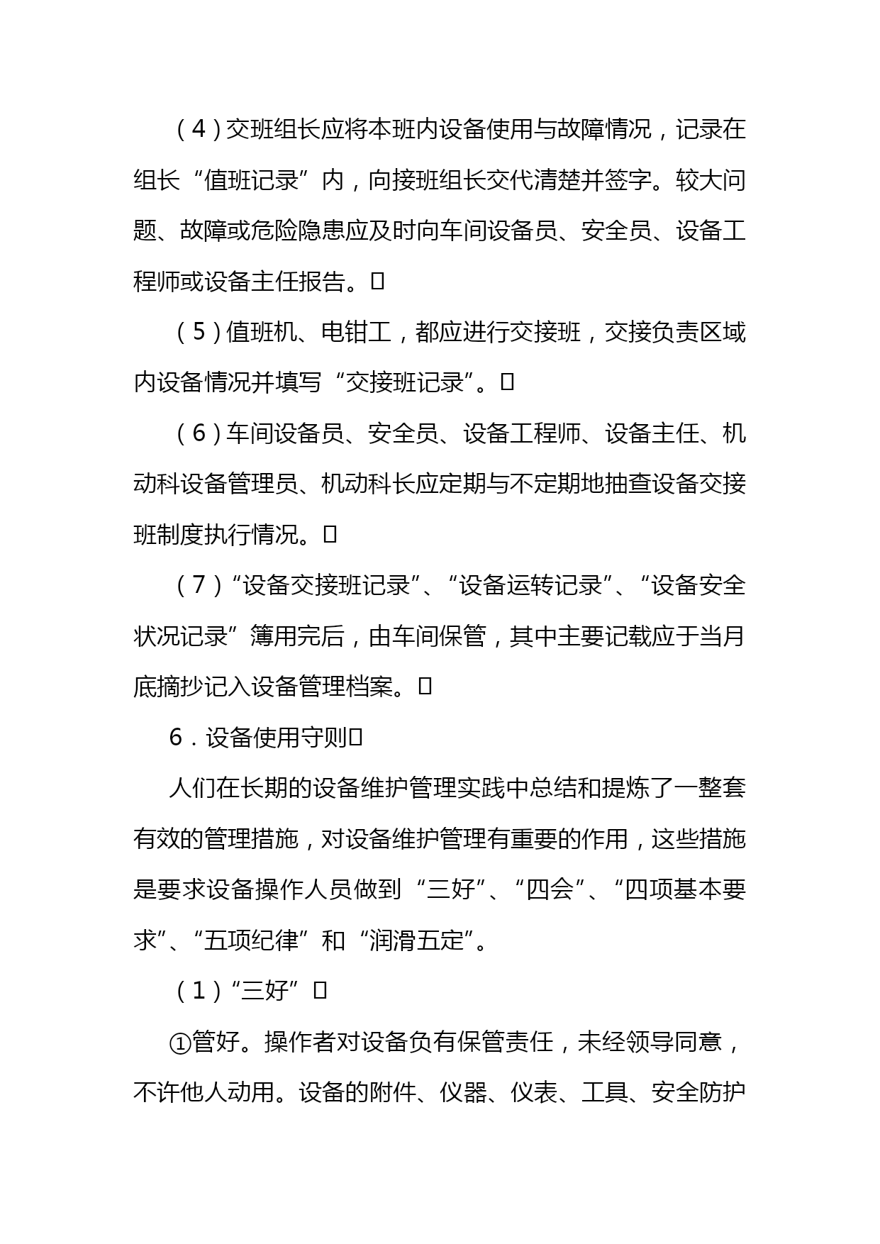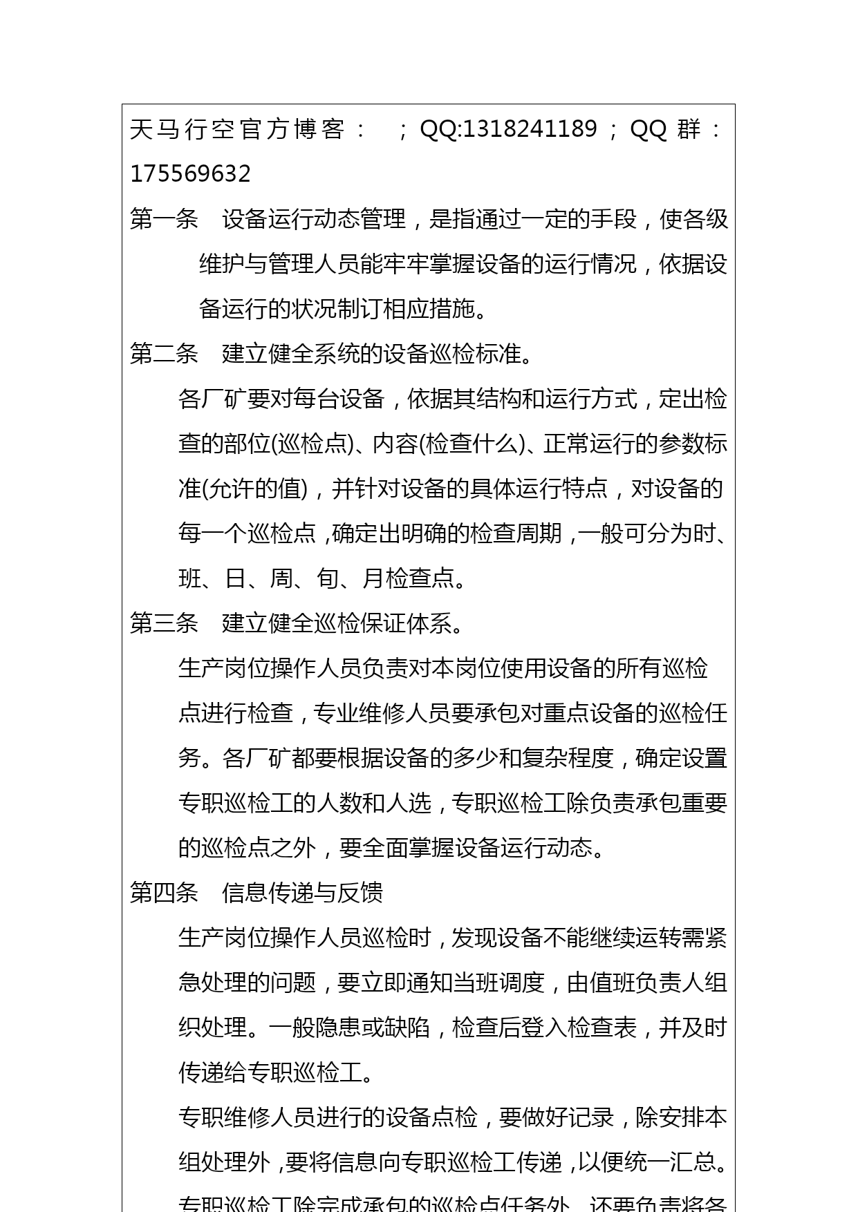 设备使用安全制度汇编(完整版)资料(可以直接使用,可编辑优秀版资料,欢迎下载)天马行空官方博客:;QQ:1318241189;QQ群:175569632设备使用安全管理制度要使设备安全运行,发挥最佳效益,须建立并严格执行设备使用、操作的有关制度。1.岗位责任制岗位责任制是生产经营单位安全管理的一项基础制度,生产经营单位的各项规章制度都是以岗位责任制为中心建立,各项活动都必须纳入岗位责任制中得以落实,设备使用维护的各项工作都是岗位责任制的组成部分,必须在岗位责任制中得到落实。所以,设备使用维护工作必须体现在操作工人的岗位责任制中,严格贯彻岗位责任制可保证设备使用维护的各项规章制度的贯彻,从而保证设备处于良好状态,为生产经营单位生产经营创造有利的条件。2.操作证制度生产经营单位主要生产设备的操作工人,由车间提出定人定机名单,经机动科备案审批后执行,重点设备或精、大、稀设备定人定机名单,还需报主管副厂长批准后执行,并执行交接班制度。定人定机还需凭设备操作证才能上岗。主要生产设备的操作工人,包括学徙、实习生等均应经过培训,考试合格,取得操作证后,才能独立操作设备。每个工人原则上只允许操作一种型号设备。熟练技工,经过一专多能专业培训,考试合格后,允许其操作取得操作证型号的设备。操作工人必须经技术培训,熟练掌握技术操作规程和安全操作规程后方可取得操作证。操作证由生产经营单位专门管理部门统一发放,禁止转借。特殊工种操作工须经培训取得特殊工种操作证后方能上岗。应不断提高设备操作人员的技术水平,加强技术培训,并进行考试,考试合格可以升级。在特殊情况下,例如事故后重新培训的工人,考试不合格,可取消操作证,调离操作岗位。3.安全检查、检验制度设备运行安全检查是设备安全管理的重要措施,是防止设备故障和事故的有效方法。通过检查可全面掌握设备的技术状况和安全状况的变化及磨损情况,及时查明和消除设备隐患,根据检查发现的问题,开展整改,以确保设备的安全运行。安全检验是按一定的方法与检测技术对设备的安全性能进行预防性试验,以确定设备维修计划或安全运行年限。4.维修保养制度设备长期使用,必然造成各种零部件的松动、磨损,从而使设备状况变坏,导致动力性能下降,经济性能恶化,安全可靠性降低,甚至发生事故。因此,建立维修保养制度,根据零部件磨损规律制定出切实可行的计划,定期对设备进行清洁、润滑、检查、调整等作业,是延长各零部件使用寿命,防止早期损坏,避免运行中发生故障、事故的有效方法。5.交接班制度生产经营单位的主要生产设备,一般都处于三班制或四班制的日夜连续使用状态。因此必须建立设备交接班手续,形成设备交接班制度。以明确设备维护保养的责任,提供设备使用的第一手资料,为设备故障的动态分析和生产情况分析提供准确、有效、可靠的依据。设备交接班工作应该做到:(1)凡多班制生产设备,都必须执行交接班制度。认真准确填写“设备交接班记录”,并签字。一班制设备,操作工应填写“设备使用日记”。(2)交班人员下班前必须认真清扫,擦拭设备,向接班人员介绍润滑、安全装置、转动系统、操作机构等各部位的情况。运行中有无可疑情况,维护、调整、检修情况。清点工具、仪表和检测仪器,认真进行交接,并填写记录。(3)接班人员必须提前10~15分钟到达现场,了解设备情况,认真接班并检查记录填写情况。如果确认设备情况正常,记录填写无误,即可签字接班。否则,应立即提出,必要时可拒绝接班,并及时报告本班组长处理。设备接班后发生的问题,由接班者负责。(4)交班组长应将本班内设备使用与故障情况,记录在组长“值班记录”内,向接班组长交代清楚并签字。较大问题、故障或危险隐患应及时向车间设备员、安全员、设备工程师或设备主任报告。(5)值班机、电钳工,都应进行交接班,交接负责区域内设备情况并填写“交接班记录”。(6)车间设备员、安全员、设备工程师、设备主任、机动科设备管理员、机动科长应定期与不定期地抽查设备交接班制度执行情况。(7)“设备交接班记录”、“设备运转记录”、“设备安全状况记录”簿用完后,由车间保管,其中主要记载应于当月底摘抄记入设备管理档案。6.设备使用守则人们在长期的设备维护管理实践中总结和提炼了一整套有效的管理措施,对设备维护管理有重要的作用,这些措施是要求设备操作人员做到“三好”、“四会”、“四项基本要求”、“五项纪律”和“润滑五定”。(1)“三好”①管好。操作者对设备负有保管责任,未经领导同意,不许他人动用。设备的附件、仪器、仪表、工具、安全防护装置必须保持完整无损。设备运转不得离开岗位,离开时必须停车断电,设备发生事故,立即停车断电,保护现场,及时、真实地上报事故情况。②用好。严格执行操作规程,精心爱护设