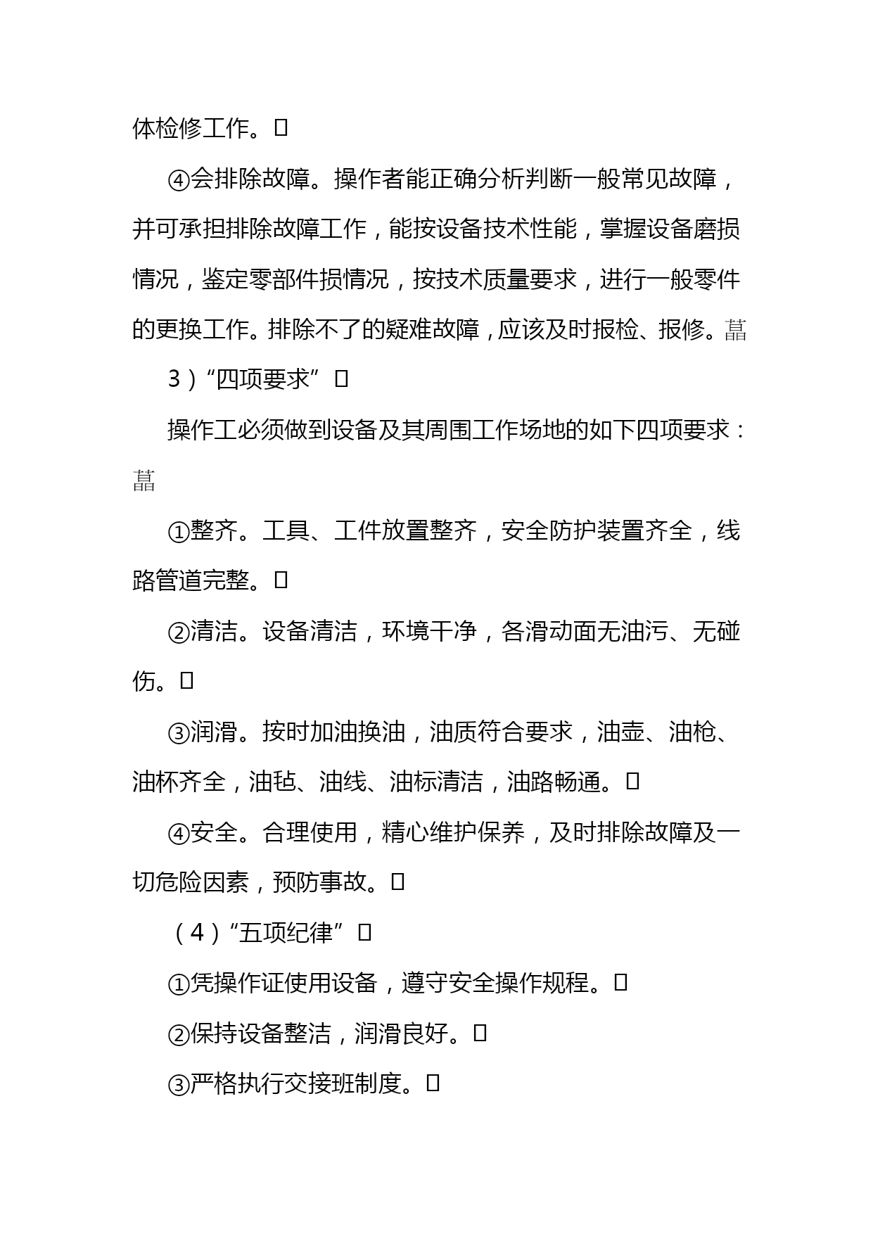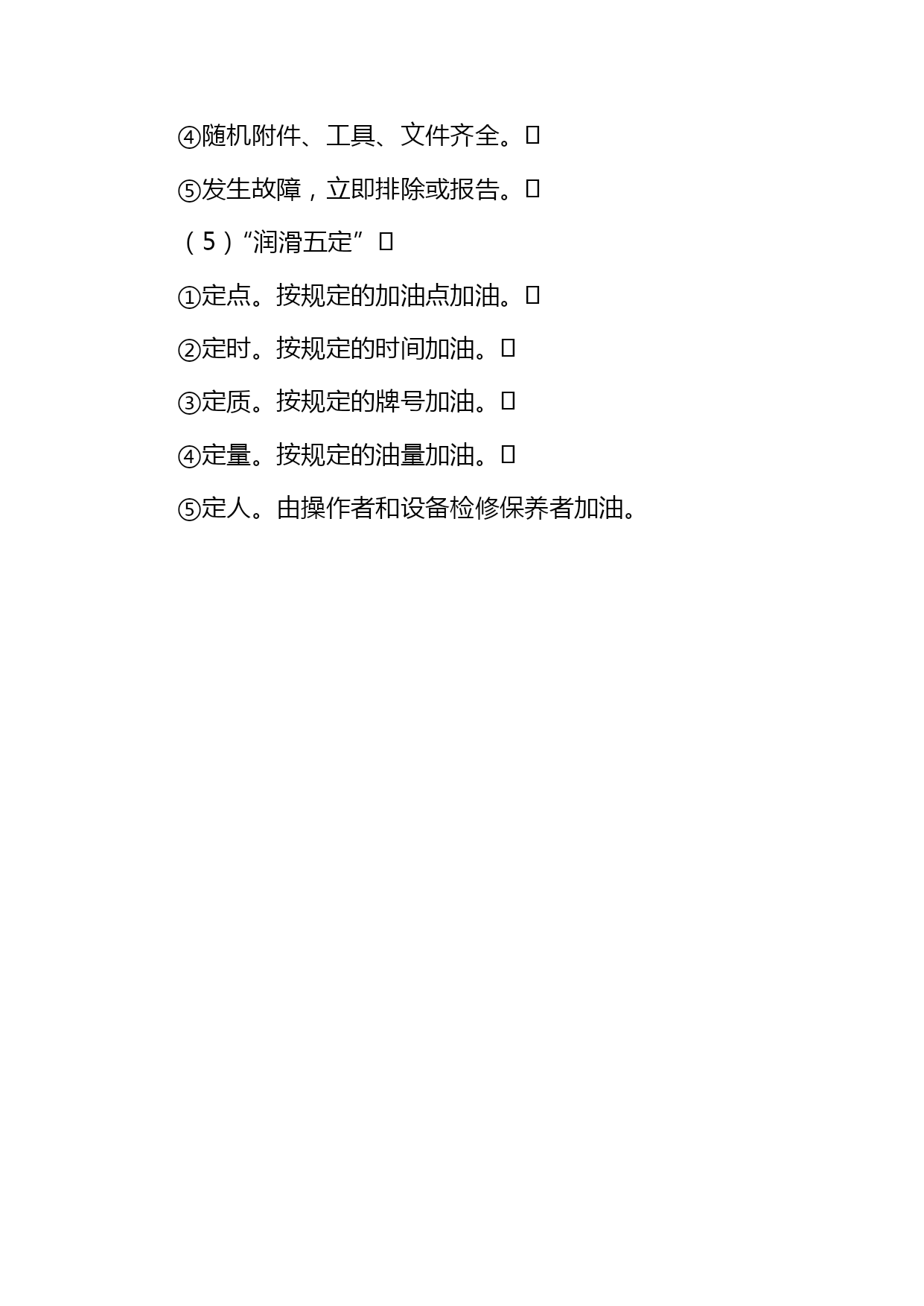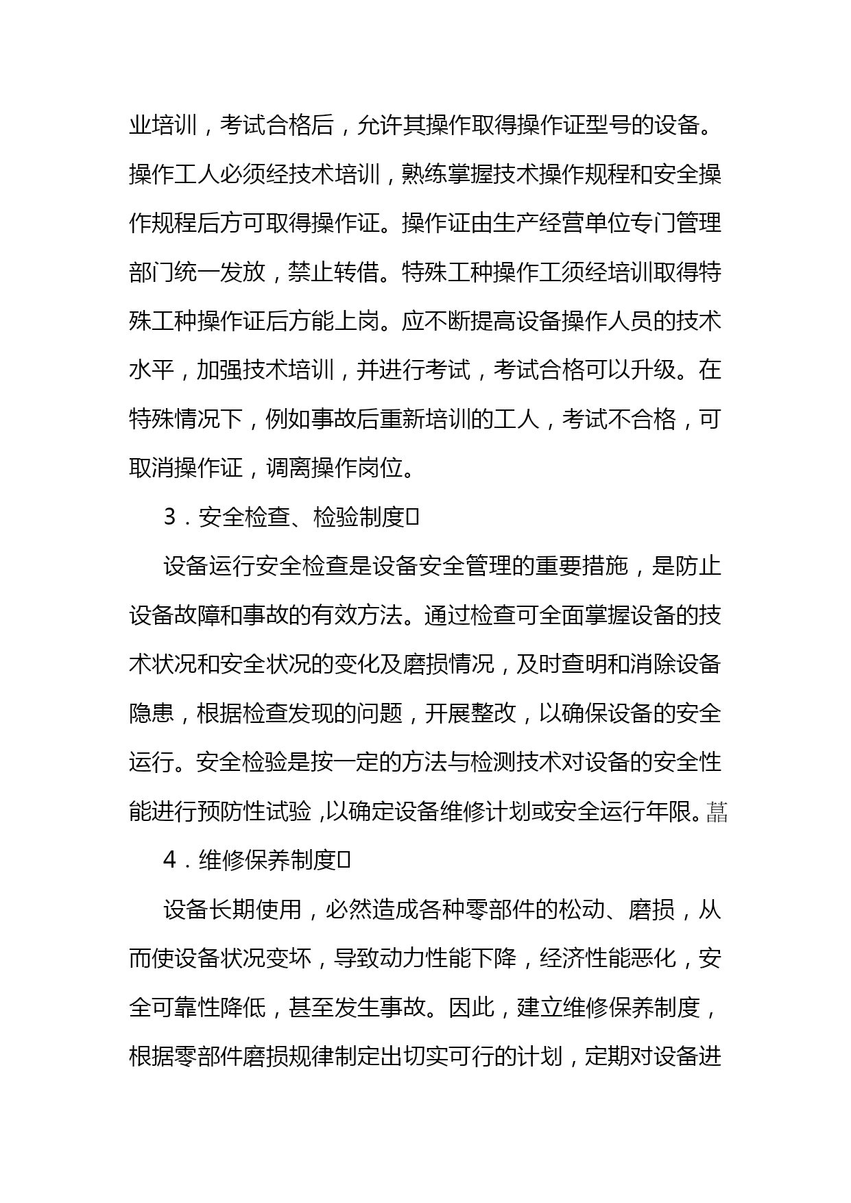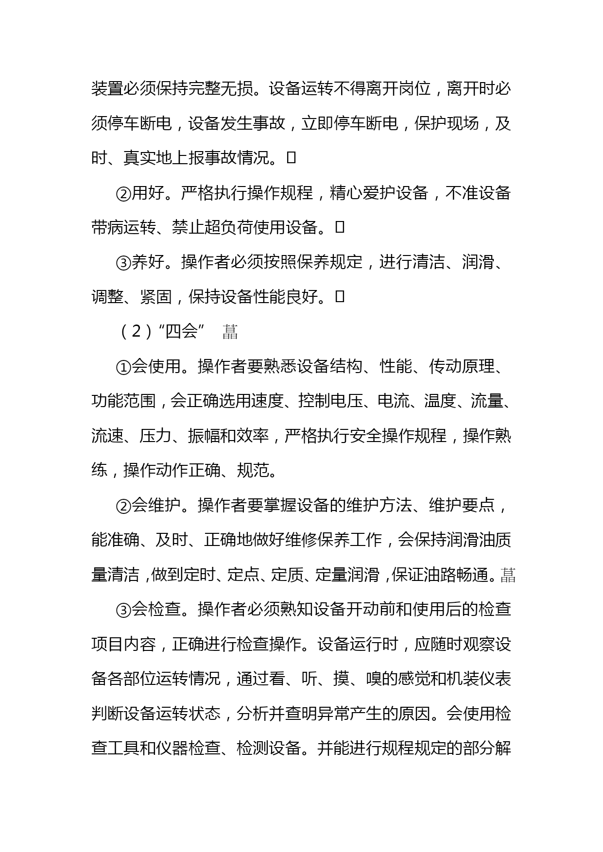 设备使用安全制度汇编(完整版)资料(可以直接使用,可编辑优秀版资料,欢迎下载)天马行空官方博客:;QQ:1318241189;QQ群:175569632设备使用安全管理制度要使设备安全运行,发挥最佳效益,须建立并严格执行设备使用、操作的有关制度。1.岗位责任制岗位责任制是生产经营单位安全管理的一项基础制度,生产经营单位的各项规章制度都是以岗位责任制为中心建立,各项活动都必须纳入岗位责任制中得以落实,设备使用维护的各项工作都是岗位责任制的组成部分,必须在岗位责任制中得到落实。所以,设备使用维护工作必须体现在操作工人的岗位责任制中,严格贯彻岗位责任制可保证设备使用维护的各项规章制度的贯彻,从而保证设备处于良好状态,为生产经营单位生产经营创造有利的条件。2.操作证制度生产经营单位主要生产设备的操作工人,由车间提出定人定机名单,经机动科备案审批后执行,重点设备或精、大、稀设备定人定机名单,还需报主管副厂长批准后执行,并执行交接班制度。定人定机还需凭设备操作证才能上岗。主要生产设备的操作工人,包括学徙、实习生等均应经过培训,考试合格,取得操作证后,才能独立操作设备。每个工人原则上只允许操作一种型号设备。熟练技工,经过一专多能专业培训,考试合格后,允许其操作取得操作证型号的设备。操作工人必须经技术培训,熟练掌握技术操作规程和安全操作规程后方可取得操作证。操作证由生产经营单位专门管理部门统一发放,禁止转借。特殊工种操作工须经培训取得特殊工种操作证后方能上岗。应不断提高设备操作人员的技术水平,加强技术培训,并进行考试,考试合格可以升级。在特殊情况下,例如事故后重新培训的工人,考试不合格,可取消操作证,调离操作岗位。3.安全检查、检验制度设备运行安全检查是设备安全管理的重要措施,是防止设备故障和事故的有效方法。通过检查可全面掌握设备的技术状况和安全状况的变化及磨损情况,及时查明和消除设备隐患,根据检查发现的问题,开展整改,以确保设备的安全运行。安全检验是按一定的方法与检测技术对设备的安全性能进行预防性试验,以确定设备维修计划或安全运行年限。4.维修保养制度设备长期使用,必然造成各种零部件的松动、磨损,从而使设备状况变坏,导致动力性能下降,经济性能恶化,安全可靠性降低,甚至发生事故。因此,建立维修保养制度,根据零部件磨损规律制定出切实可行的计划,定期对设备进行清洁、润滑、检查、调整等作业,是延长各零部件使用寿命,防止早期损坏,避免运行中发生故障、事故的有效方法。5.交接班制度生产经营单位的主要生产设备,一般都处于三班制或四班制的日夜连续使用状态。因此必须建立设备交接班手续,形成设备交接班制度。以明确设备维护保养的责任,提供设备使用的第一手资料,为设备故障的动态分析和生产情况分析提供准确、有效、可靠的依据。设备交接班工作应该做到:(1)凡多班制生产设备,都必须执行交接班制度。认真准确填写“设备交接班记录”,并签字。一班制设备,操作工应填写“设备使用日记”。(2)交班人员下班前必须认真清扫,擦拭设备,向接班人员介绍润滑、安全装置、转动系统、操作机构等各部位的情况。运行中有无可疑情况,维护、调整、检修情况。清点工具、仪表和检测仪器,认真进行交接,并填写记录。(3)接班人员必须提前10~15分钟到达现场,了解设备情况,认真接班并检查记录填写情况。如果确认设备情况正常,记录填写无误,即可签字接班。否则,应立即提出,必要时可拒绝接班,并及时报告本班组长处理。设备接班后发生的问题,由接班者负责。(4)交班组长应将本班内设备使用与故障情况,记录在组长“值班记录”内,向接班组长交代清楚并签字。较大问题、故障或危险隐患应及时向车间设备员、安全员、设备工程师或设备主任报告。(5)值班机、电钳工,都应进行交接班,交接负责区域内设备情况并填写“交接班记录”。(6)车间设备员、安全员、设备工程师、设备主任、机动科设备管理员、机动科长应定期与不定期地抽查设备交接班制度执行情况。(7)“设备交接班记录”、“设备运转记录”、“设备安全状况记录”簿用完后,由车间保管,其中主要记载应于当月底摘抄记入设备管理档案。6.设备使用守则人们在长期的设备维护管理实践中总结和提炼了一整套有效的管理措施,对设备维护管理有重要的作用,这些措施是要求设备操作人员做到“三好”、“四会”、“四项基本要求”、“五项纪律”和“润滑五定”。(1)“三好”①管好。操作者对设备负有保管责任,未经领导同意,不许他人动用。设备的附件、仪器、仪表、工具、安全防护装置必须保持完整无损。设备运转不得离开岗位,离开时必须停车断电,设备发生事故,立即停车断电,保护现场,及时、真实地上报事故情况。②用好。严格执行操作规程,精心爱护设