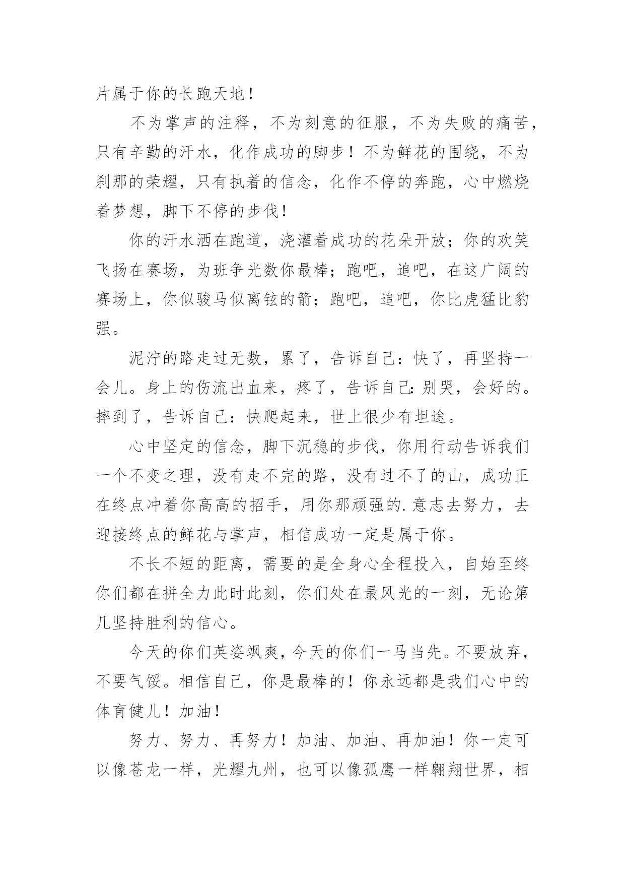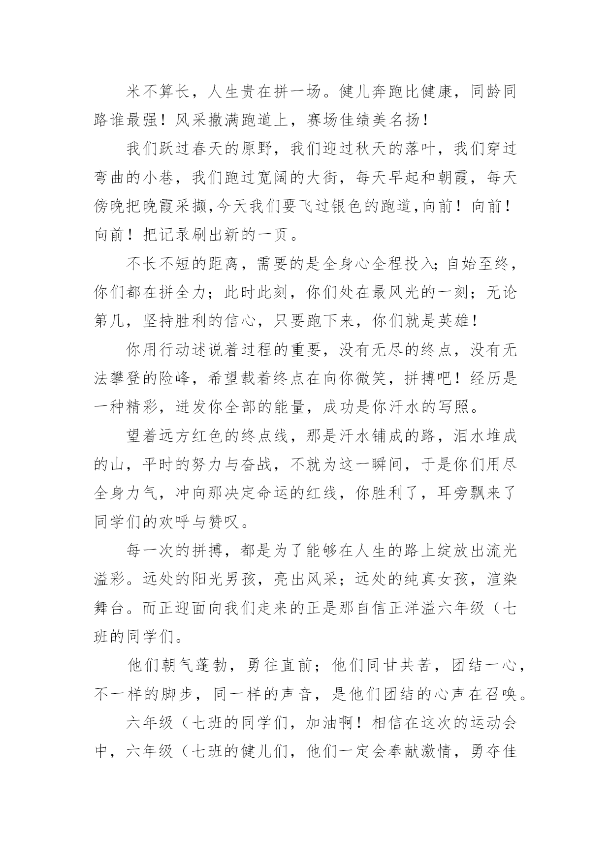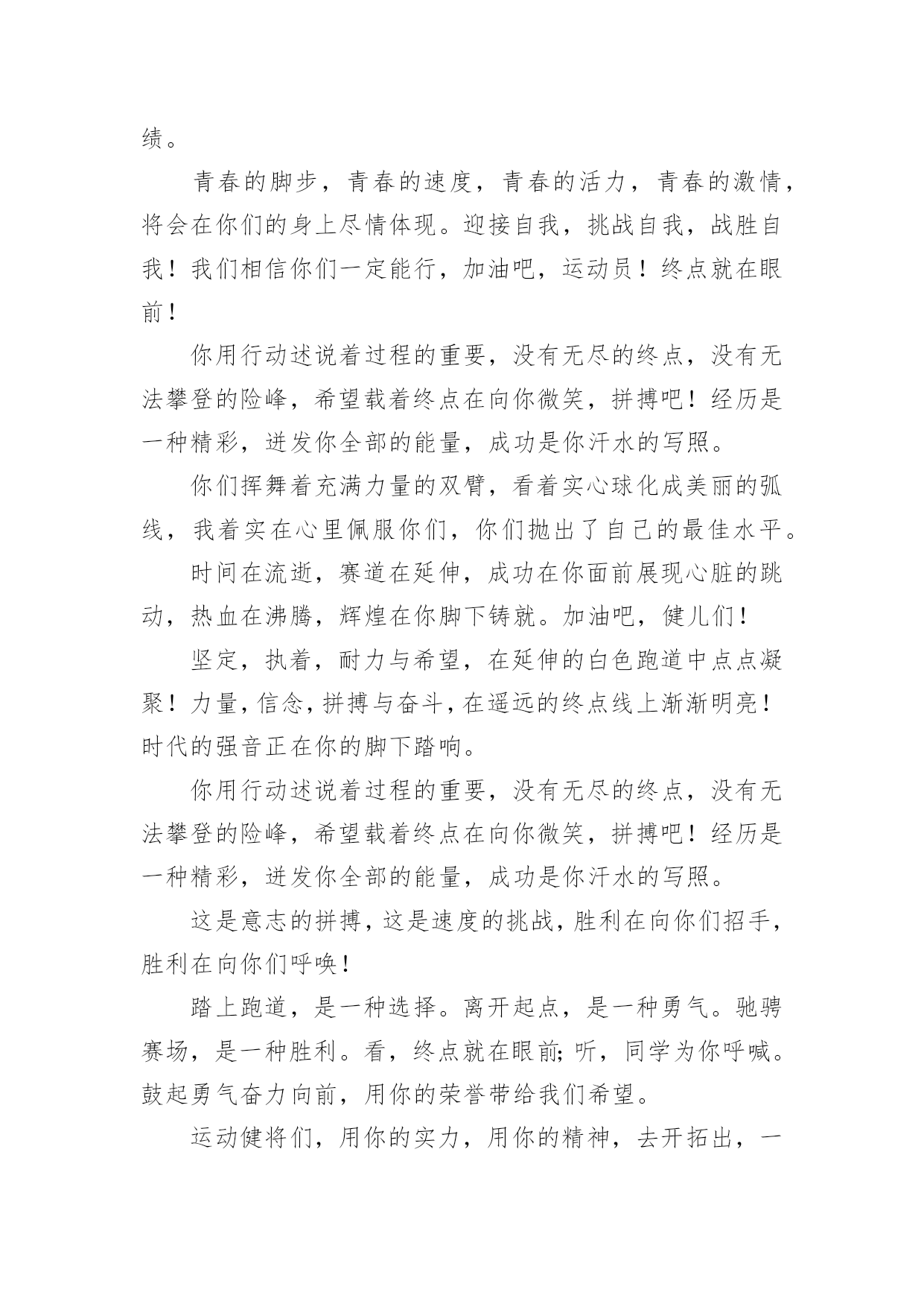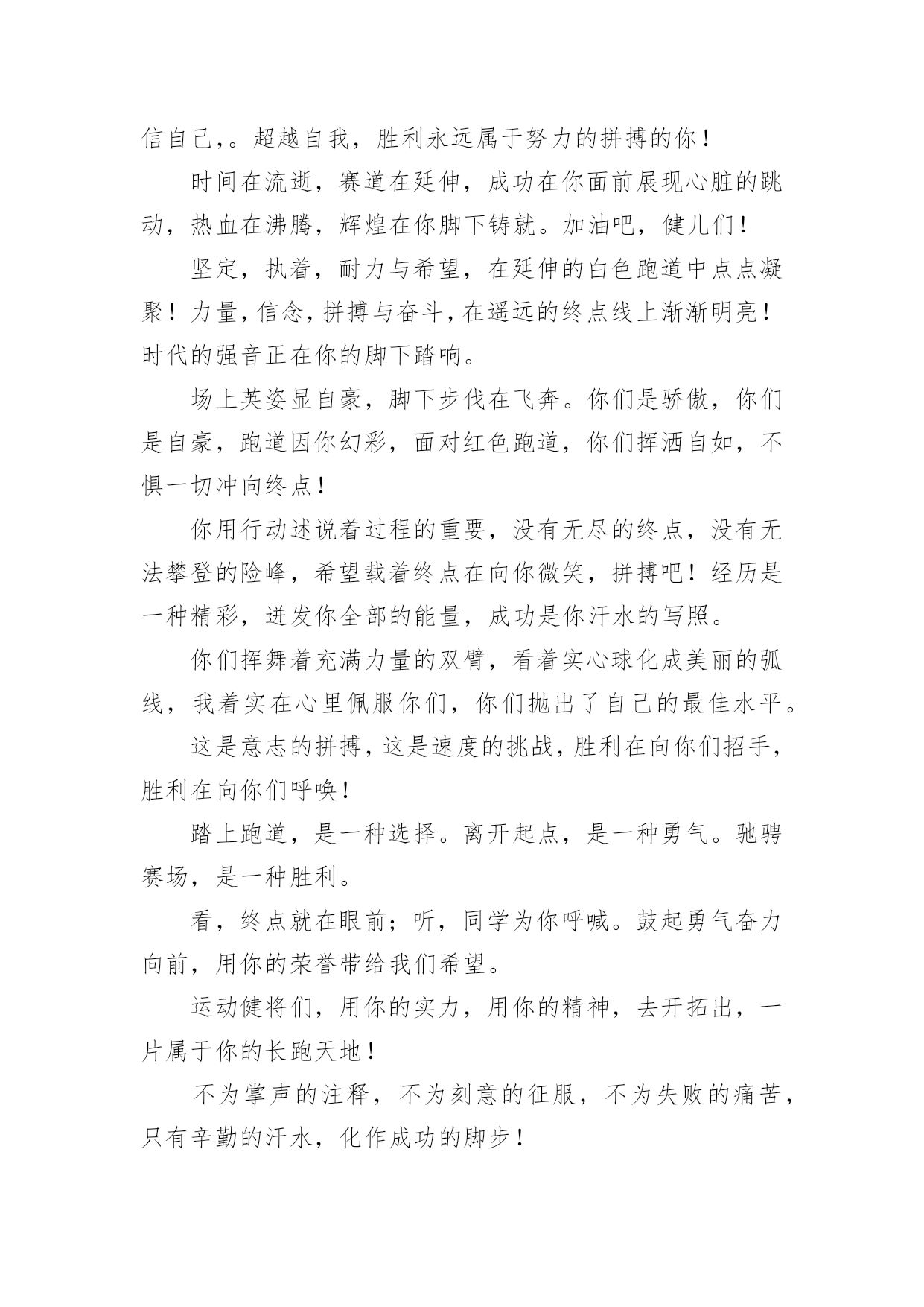 运动会加油稿运动会加油稿范例15篇在现实社会中,我们很多时候都不得不用到加油稿,加油稿是用于给别人加油鼓气,提升别人气势的文稿。大家知道加油稿怎么写才正确吗?以下是小编为大家收集的运动会加油稿,欢迎大家分享。运动会加油稿1我只愿——致观看者,我只愿做一片落叶,去点缀金黄的秋天;我只愿做一颗恒星,去装饰耀眼的星河,我只愿做一棵小草,去充实五彩的世界,我只愿坐在场边,同你们分享喜悦,努力吧,拼搏吧,无论何时何地,都会有我在你的身边,观众席上掌声雷动,热热烈烈划破长空,他们的灵魂在叫,血在烧,都是渴望有无限的希望,掌声响起来为新的力量喝彩,掌声响起来,每一棵都精彩,你和红色的地面有个约定,那上面,总有你奔跑的身影;你与绿色的草坪有个约定,那上面,浸着你辛劳的汗渍。你与我们有个约定,说你一定要赢,也一定会赢。枪声响了,四百米,九秒却又相几个世纪,你喊着跑着,迈开大步,跨过世纪,我们不喜欢无云的天空,我们不喜欢无泪的人生,因为,云朵也是一道风景,眼泪也是一种晶莹,不要总是遗憾,生命的美丽,常常在于过程,不要总是哀叹,一点点挫折,只会让人,越战越勇。运动者赞,没有虎一样的'强壮,却有夸父追日般的执着;没有豹一样的速度,却有愚公移山般的坚定;没有鹰一样的迅捷,却有泰山崩于前的沉着。怀有必胜的信念,一次又一次向自我发出挑战。胜不骄,败不馁,直面一切困难与挫折。年青的岁月,我们追求卓越;年青的我们,拥抱成功;年青的赛场,洒下泪与汗……为你喝彩,心中的英雄。运动会加油稿2有些运动员,就只是来充充数的,就像我,在这些比赛当中,一般不太会进入决赛;而有些运动员,则是那些有实力的运动员,总是可以得名次。总而言之,我们应该养成平时爱锻炼身体的好习惯:早上锻炼身体是为了健身,中午锻炼身体是为了消化,晚上锻炼身体是为了放松心情。让我们都变成爱运动、健康的好孩子吧!心中坚定的信念,脚下沉稳的步伐,你用行动告诉我们一个不变之理,没有走不完的路,没有过不了的山,成功正在终点冲着你高高的招手,用你那顽强的意志去努力,去迎接终点的鲜花与掌声,相信成功一定是属于你。在秋高气爽的季节,校园今日特别热闹。一圈圈跑道,米米诉说着自豪。健儿在“年轮”上赛跑,催促学子抓紧一分一秒。只要拼尽全力,理想的目标定会来到。流泪不是失落,徘徊不是迷惑,成功属于那些战胜失败,坚持不懈、勇于追求梦想的人。加油吧,运动健儿们!米不算长,人生贵在拼一场。健儿奔跑比健康,同龄同路谁最强!风采撒满跑道上,赛场佳绩美名扬!我们跃过春天的原野,我们迎过秋天的落叶,我们穿过弯曲的小巷,我们跑过宽阔的大街,每天早起和朝霞,每天傍晚把晚霞采撷,今天我们要飞过银色的跑道,向前!向前!向前!把记录刷出新的一页。不长不短的距离,需要的是全身心全程投入;自始至终,你们都在拼全力;此时此刻,你们处在最风光的一刻;无论第几,坚持胜利的信心,只要跑下来,你们就是英雄!你用行动述说着过程的重要,没有无尽的终点,没有无法攀登的险峰,希望载着终点在向你微笑,拼搏吧!经历是一种精彩,迸发你全部的能量,成功是你汗水的写照。望着远方红色的终点线,那是汗水铺成的路,泪水堆成的山,平时的努力与奋战,不就为这一瞬间,于是你们用尽全身力气,冲向那决定命运的红线,你胜利了,耳旁飘来了同学们的欢呼与赞叹。每一次的拼搏,都是为了能够在人生的路上绽放出流光溢彩。远处的阳光男孩,亮出风采;远处的纯真女孩,渲染舞台。而正迎面向我们走来的正是那自信正洋溢六年级(七班的同学们。他们朝气蓬勃,勇往直前;他们同甘共苦,团结一心,不一样的脚步,同一样的声音,是他们团结的心声在召唤。六年级(七班的同学们,加油啊!相信在这次的运动会中,六年级(七班的健儿们,他们一定会奉献激情,勇夺佳绩。青春的脚步,青春的速度,青春的活力,青春的激情,将会在你们的身上尽情体现。迎接自我,挑战自我,战胜自我!我们相信你们一定能行,加油吧,运动员!终点就在眼前!你用行动述说着过程的重要,没有无尽的终点,没有无法攀登的险峰,希望载着终点在向你微笑,拼搏吧!经历是一种精彩,迸发你全部的能量,成功是你汗水的写照。你们挥舞着充满力量的双臂,看着实心球化成美丽的弧线,我着实在心里佩服你们,你们抛出了自己的最佳水平。时间在流逝,赛道在延伸,成功在你面前展现心脏的跳动,热血在沸腾,辉煌在你脚下铸就。加油吧,健儿们!坚定,执着,耐力与希望,在延伸的白色跑道中点点凝聚!力量,信念,拼搏与奋斗,在遥远的终点线上渐渐明亮!时代的强音正在你的脚下踏响。你用行动述说着过程的重要,没有无尽的终点,没有无法攀登的险峰,希望载着终点在向你微笑,拼搏吧!经历是一种精彩,迸发你全部的能量,成功是你汗水的写照。这是意志的拼搏,这是速度的挑战,胜利在向你们招手,胜利在向你们呼唤!踏上跑道,是一种选择。离开起点,是一种勇气。驰骋