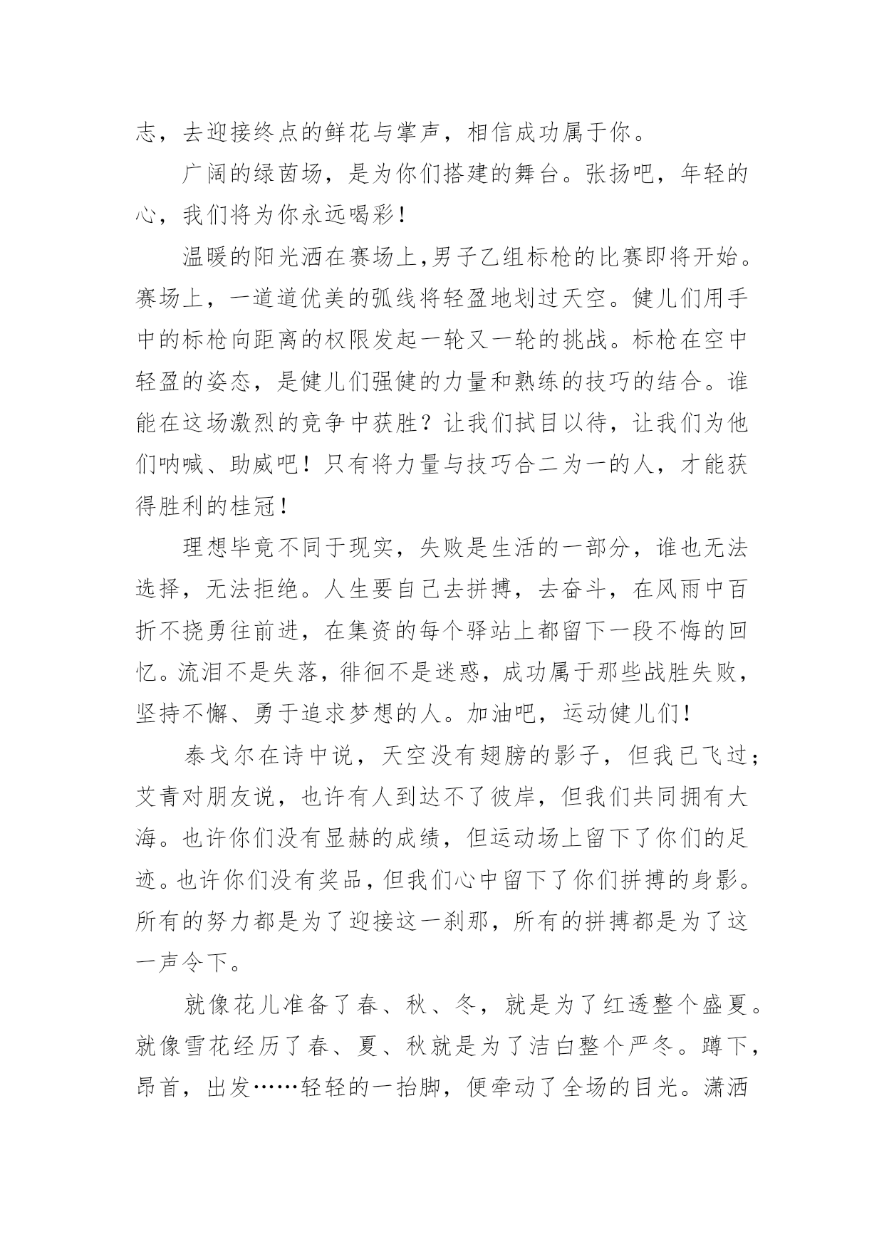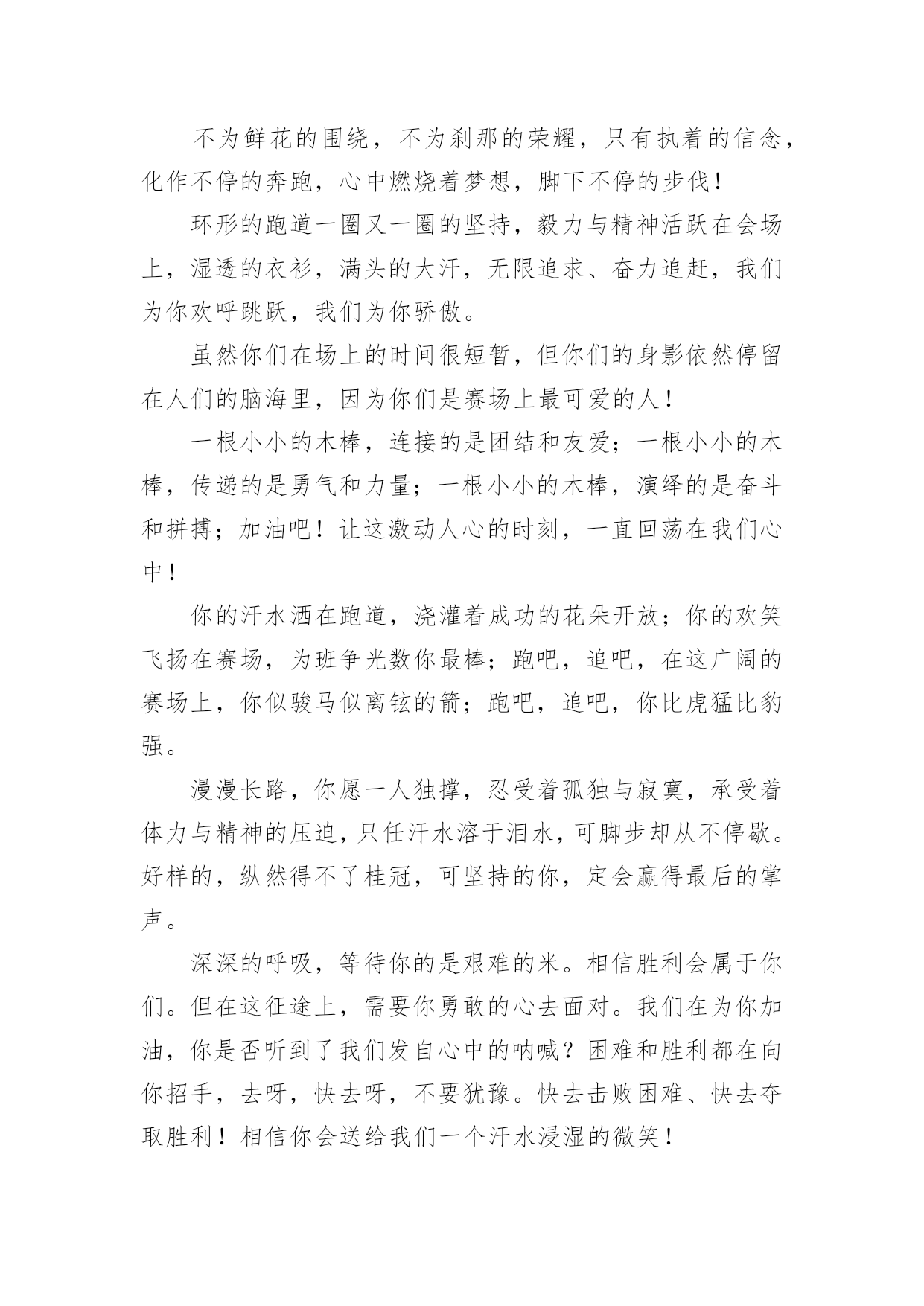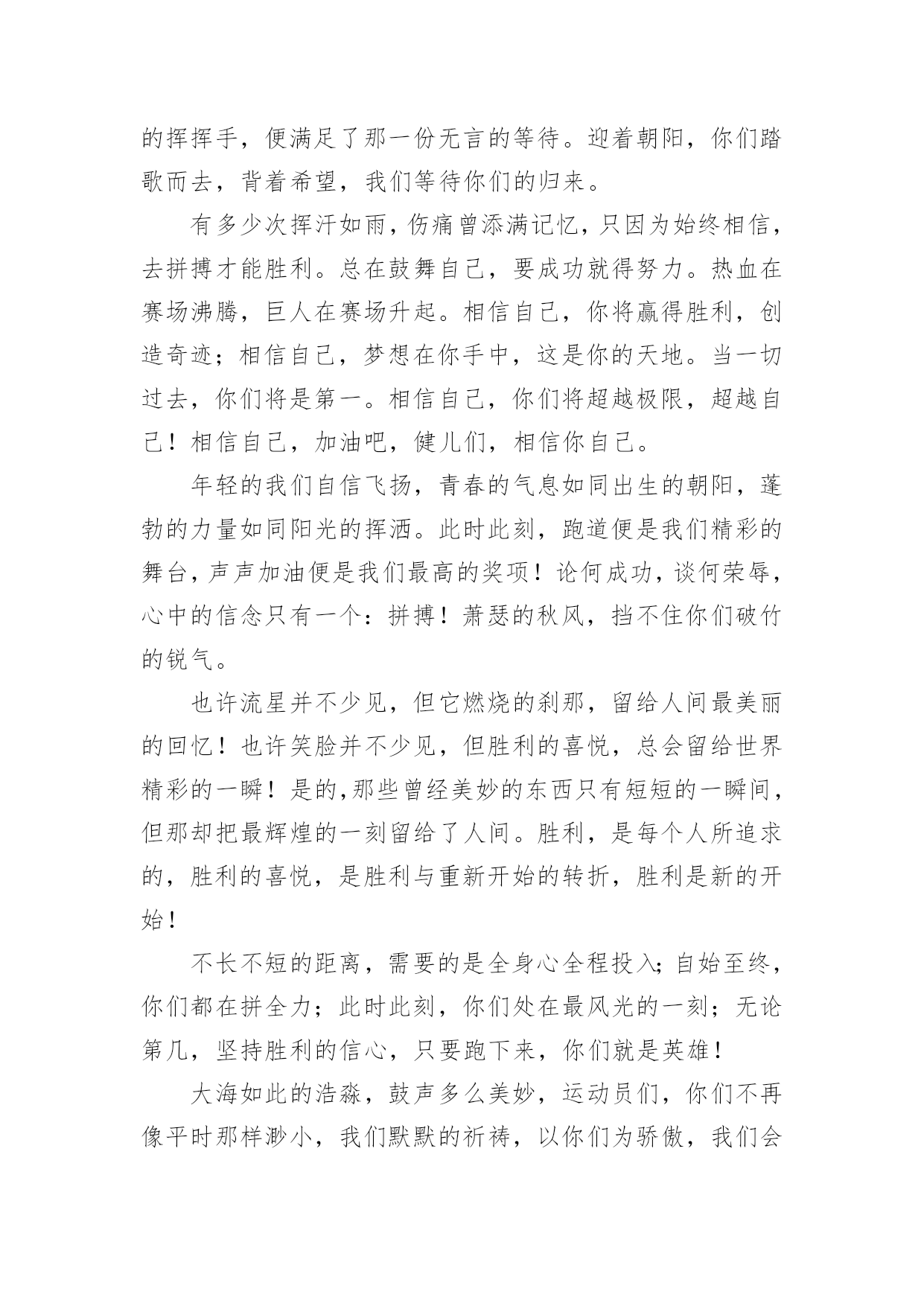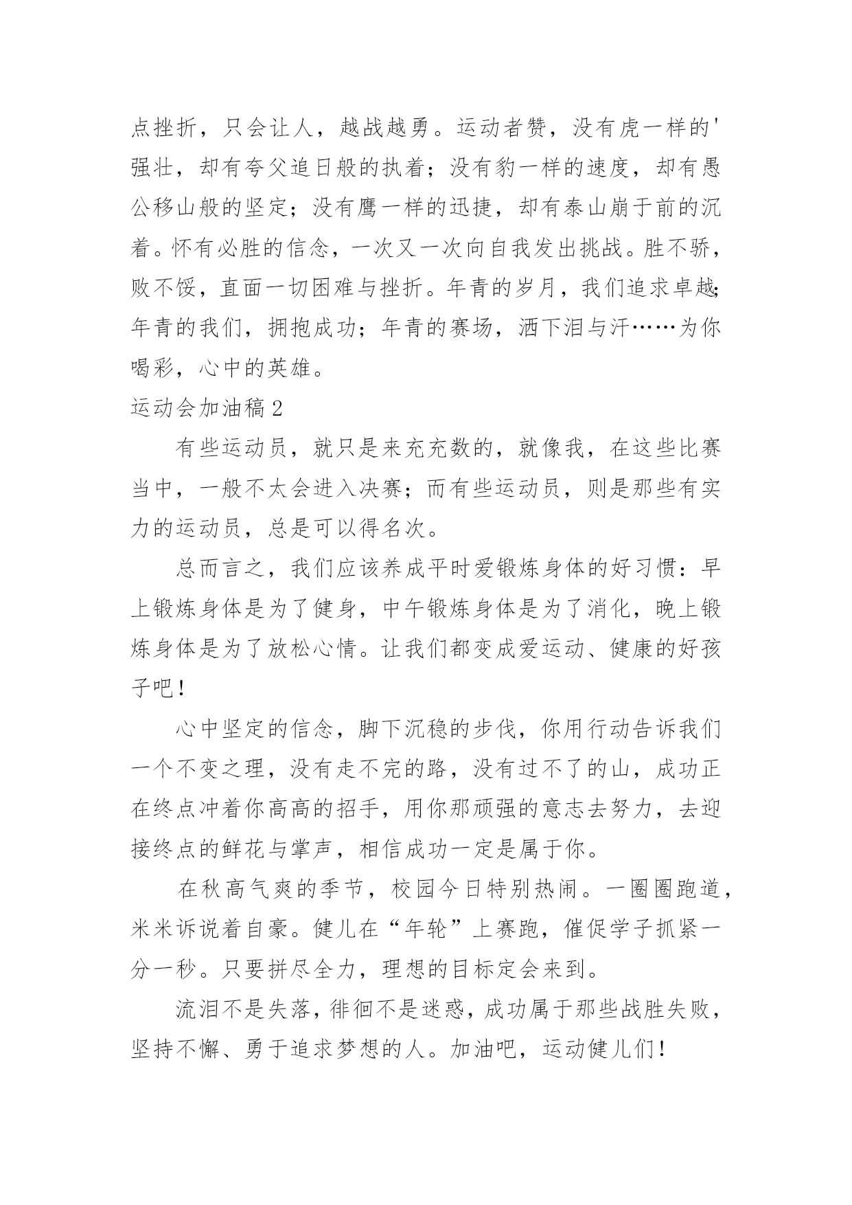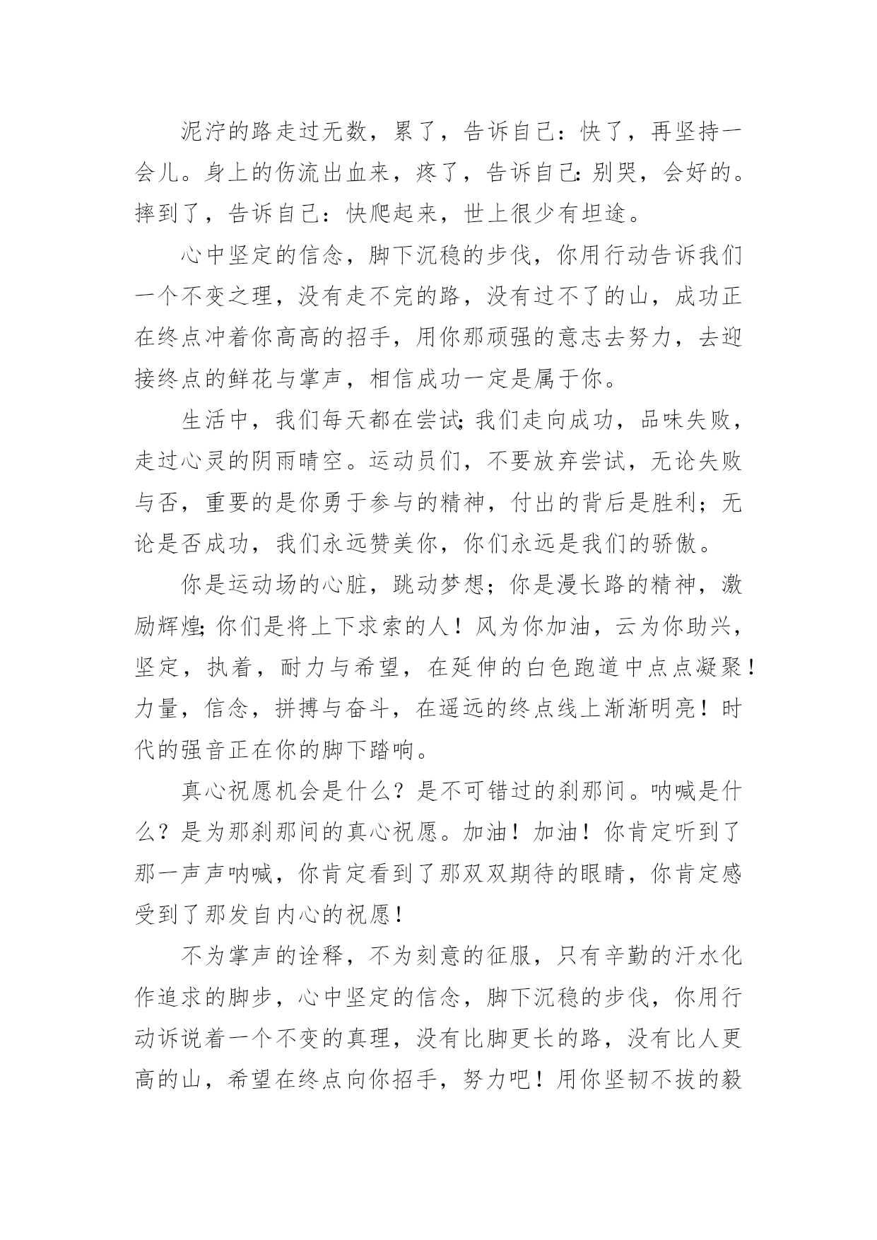 运动会加油稿运动会加油稿范例15篇在现实社会中,我们很多时候都不得不用到加油稿,加油稿是用于给别人加油鼓气,提升别人气势的文稿。大家知道加油稿怎么写才正确吗?以下是小编为大家收集的运动会加油稿,欢迎大家分享。运动会加油稿1我只愿——致观看者,我只愿做一片落叶,去点缀金黄的秋天;我只愿做一颗恒星,去装饰耀眼的星河,我只愿做一棵小草,去充实五彩的世界,我只愿坐在场边,同你们分享喜悦,努力吧,拼搏吧,无论何时何地,都会有我在你的身边,观众席上掌声雷动,热热烈烈划破长空,他们的灵魂在叫,血在烧,都是渴望有无限的希望,掌声响起来为新的力量喝彩,掌声响起来,每一棵都精彩,你和红色的地面有个约定,那上面,总有你奔跑的身影;你与绿色的草坪有个约定,那上面,浸着你辛劳的汗渍。你与我们有个约定,说你一定要赢,也一定会赢。枪声响了,四百米,九秒却又相几个世纪,你喊着跑着,迈开大步,跨过世纪,我们不喜欢无云的天空,我们不喜欢无泪的人生,因为,云朵也是一道风景,眼泪也是一种晶莹,不要总是遗憾,生命的美丽,常常在于过程,不要总是哀叹,一点点挫折,只会让人,越战越勇。运动者赞,没有虎一样的'强壮,却有夸父追日般的执着;没有豹一样的速度,却有愚公移山般的坚定;没有鹰一样的迅捷,却有泰山崩于前的沉着。怀有必胜的信念,一次又一次向自我发出挑战。胜不骄,败不馁,直面一切困难与挫折。年青的岁月,我们追求卓越;年青的我们,拥抱成功;年青的赛场,洒下泪与汗……为你喝彩,心中的英雄。运动会加油稿2有些运动员,就只是来充充数的,就像我,在这些比赛当中,一般不太会进入决赛;而有些运动员,则是那些有实力的运动员,总是可以得名次。总而言之,我们应该养成平时爱锻炼身体的好习惯:早上锻炼身体是为了健身,中午锻炼身体是为了消化,晚上锻炼身体是为了放松心情。让我们都变成爱运动、健康的好孩子吧!心中坚定的信念,脚下沉稳的步伐,你用行动告诉我们一个不变之理,没有走不完的路,没有过不了的山,成功正在终点冲着你高高的招手,用你那顽强的意志去努力,去迎接终点的鲜花与掌声,相信成功一定是属于你。在秋高气爽的季节,校园今日特别热闹。一圈圈跑道,米米诉说着自豪。健儿在“年轮”上赛跑,催促学子抓紧一分一秒。只要拼尽全力,理想的目标定会来到。流泪不是失落,徘徊不是迷惑,成功属于那些战胜失败,坚持不懈、勇于追求梦想的人。加油吧,运动健儿们!米不算长,人生贵在拼一场。健儿奔跑比健康,同龄同路谁最强!风采撒满跑道上,赛场佳绩美名扬!我们跃过春天的原野,我们迎过秋天的落叶,我们穿过弯曲的小巷,我们跑过宽阔的大街,每天早起和朝霞,每天傍晚把晚霞采撷,今天我们要飞过银色的跑道,向前!向前!向前!把记录刷出新的一页。不长不短的距离,需要的是全身心全程投入;自始至终,你们都在拼全力;此时此刻,你们处在最风光的一刻;无论第几,坚持胜利的信心,只要跑下来,你们就是英雄!你用行动述说着过程的重要,没有无尽的终点,没有无法攀登的险峰,希望载着终点在向你微笑,拼搏吧!经历是一种精彩,迸发你全部的能量,成功是你汗水的写照。望着远方红色的终点线,那是汗水铺成的路,泪水堆成的山,平时的努力与奋战,不就为这一瞬间,于是你们用尽全身力气,冲向那决定命运的红线,你胜利了,耳旁飘来了同学们的欢呼与赞叹。每一次的拼搏,都是为了能够在人生的路上绽放出流光溢彩。远处的阳光男孩,亮出风采;远处的纯真女孩,渲染舞台。而正迎面向我们走来的正是那自信正洋溢六年级(七班的同学们。他们朝气蓬勃,勇往直前;他们同甘共苦,团结一心,不一样的脚步,同一样的声音,是他们团结的心声在召唤。六年级(七班的同学们,加油啊!相信在这次的运动会中,六年级(七班的健儿们,他们一定会奉献激情,勇夺佳绩。青春的脚步,青春的速度,青春的活力,青春的激情,将会在你们的身上尽情体现。迎接自我,挑战自我,战胜自我!我们相信你们一定能行,加油吧,运动员!终点就在眼前!你用行动述说着过程的重要,没有无尽的终点,没有无法攀登的险峰,希望载着终点在向你微笑,拼搏吧!经历是一种精彩,迸发你全部的能量,成功是你汗水的写照。你们挥舞着充满力量的双臂,看着实心球化成美丽的弧线,我着实在心里佩服你们,你们抛出了自己的最佳水平。时间在流逝,赛道在延伸,成功在你面前展现心脏的跳动,热血在沸腾,辉煌在你脚下铸就。加油吧,健儿们!坚定,执着,耐力与希望,在延伸的白色跑道中点点凝聚!力量,信念,拼搏与奋斗,在遥远的终点线上渐渐明亮!时代的强音正在你的脚下踏响。你用行动述说着过程的重要,没有无尽的终点,没有无法攀登的险峰,希望载着终点在向你微笑,拼搏吧!经历是一种精彩,迸发你全部的能量,成功是你汗水的写照。这是意志的拼搏,这是速度的挑战,胜利在向你们招手,胜利在向你们呼唤!踏上跑道,是一种选择。离开起点,是一种勇气。驰骋