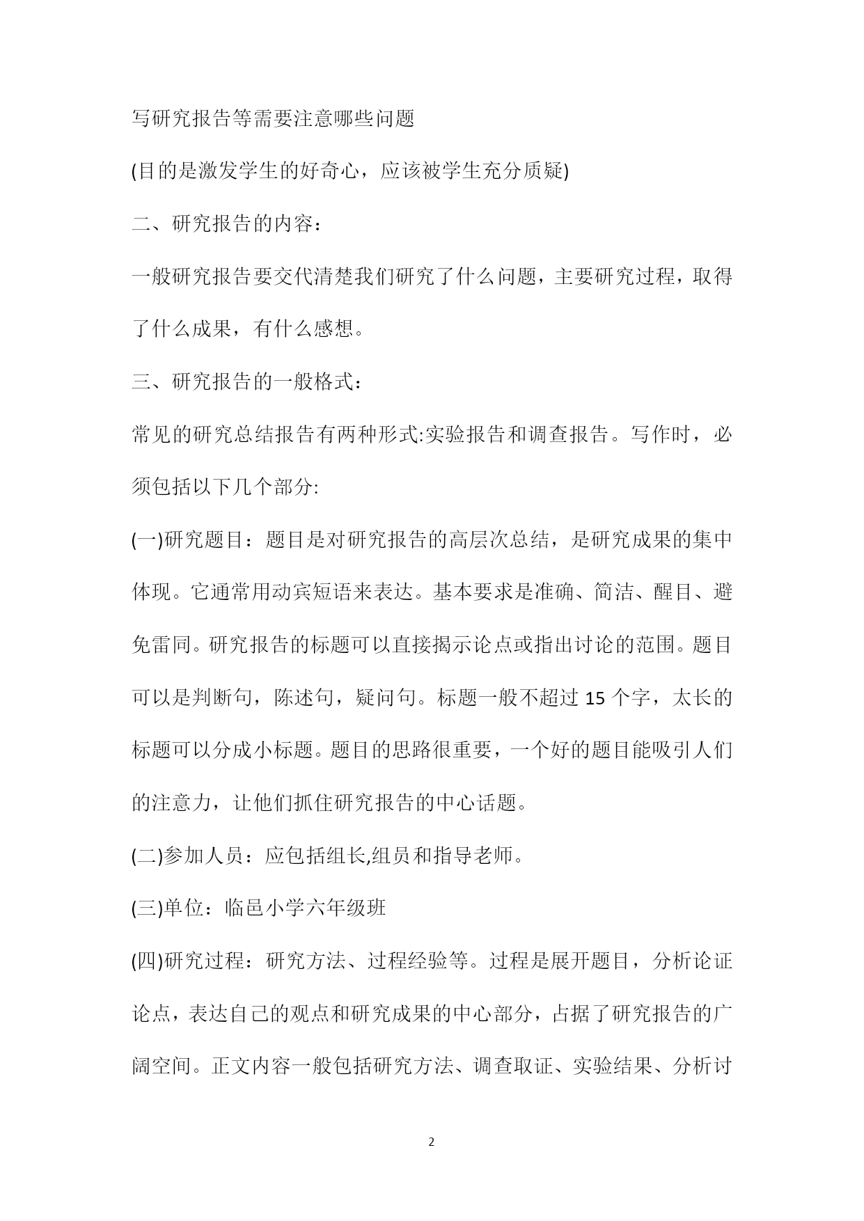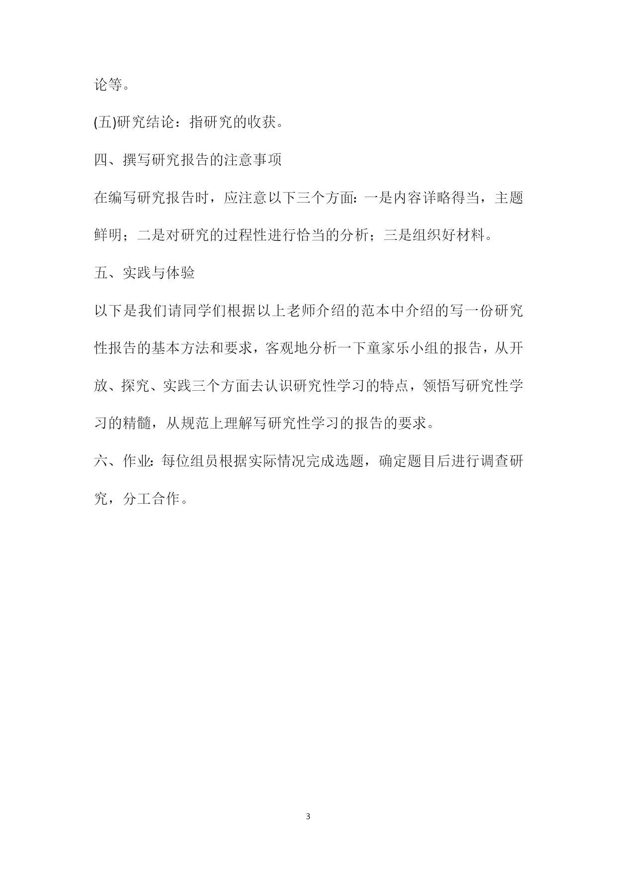 PAGEPAGE3综合活动教学设计《研究报告的撰写》教学设计活动目标:1、使学生了解研究性学习结题报告的重要性;2、使学生了解研究性学习结题报告应具备的基本内容及语言要求。3、结合自己先前指导的研究性学习课题结题报告的体会,让学生明白怎样才能写好一篇优良的研究性学习结题报告。教学方法:采用问卷调查法,查阅文献;社会调查法预习内容:1.查阅研究报告的写作方法和文章。2.观察生活中各种引起人们注意的现象或问题,为撰写研究报告收集相关资料。课程安排:两课时。活动过程:(第一课时)一、问题与思考:1.学生提问:预设研究报告包括哪些部分研究报告的各个部分应该怎么写写研究报告等需要注意哪些问题(目的是激发学生的好奇心,应该被学生充分质疑)二、研究报告的内容:一般研究报告要交代清楚我们研究了什么问题,主要研究过程,取得了什么成果,有什么感想。三、研究报告的一般格式:常见的研究总结报告有两种形式:实验报告和调查报告。写作时,必须包括以下几个部分:(一)研究题目:题目是对研究报告的高层次总结,是研究成果的集中体现。它通常用动宾短语来表达。基本要求是准确、简洁、醒目、避免雷同。研究报告的标题可以直接揭示论点或指出讨论的范围。题目可以是判断句,陈述句,疑问句。标题一般不超过15个字,太长的标题可以分成小标题。题目的思路很重要,一个好的题目能吸引人们的注意力,让他们抓住研究报告的中心话题。(二)参加人员:应包括组长,组员和指导老师。(三)单位:临邑小学六年级班(四)研究过程:研究方法、过程经验等。过程是展开题目,分析论证论点,表达自己的观点和研究成果的中心部分,占据了研究报告的广阔空间。正文内容一般包括研究方法、调查取证、实验结果、分析讨论等。(五)研究结论:指研究的收获。四、撰写研究报告的注意事项在编写研究报告时,应注意以下三个方面:一是内容详略得当,主题鲜明;二是对研究的过程性进行恰当的分析;三是组织好材料。五、实践与体验以下是我们请同学们根据以上老师介绍的范本中介绍的写一份研究性报告的基本方法和要求,客观地分析一下童家乐小组的报告,从开放、探究、实践三个方面去认识研究性学习的特点,领悟写研究性学习的精髓,从规范上理解写研究性学习的报告的要求。六、作业:每位组员根据实际情况完成选题,确定题目后进行调查研究,分工合作。