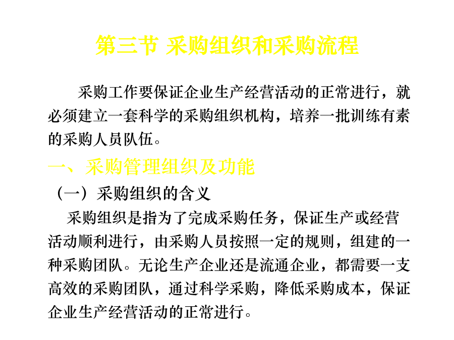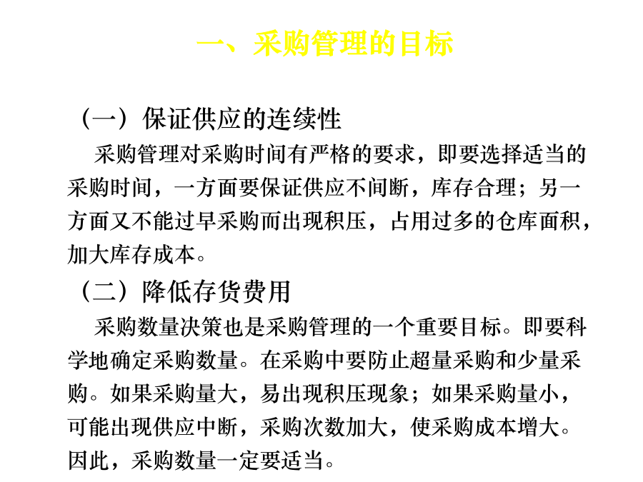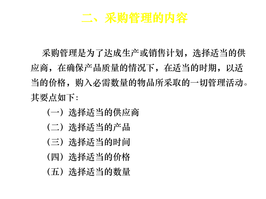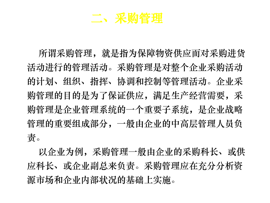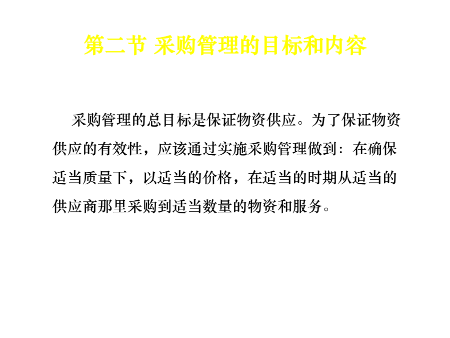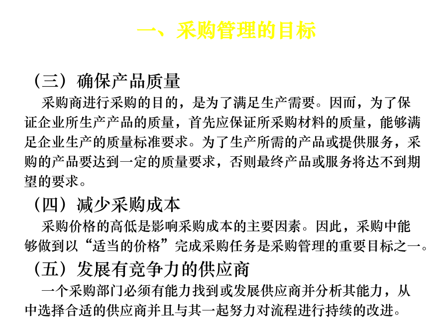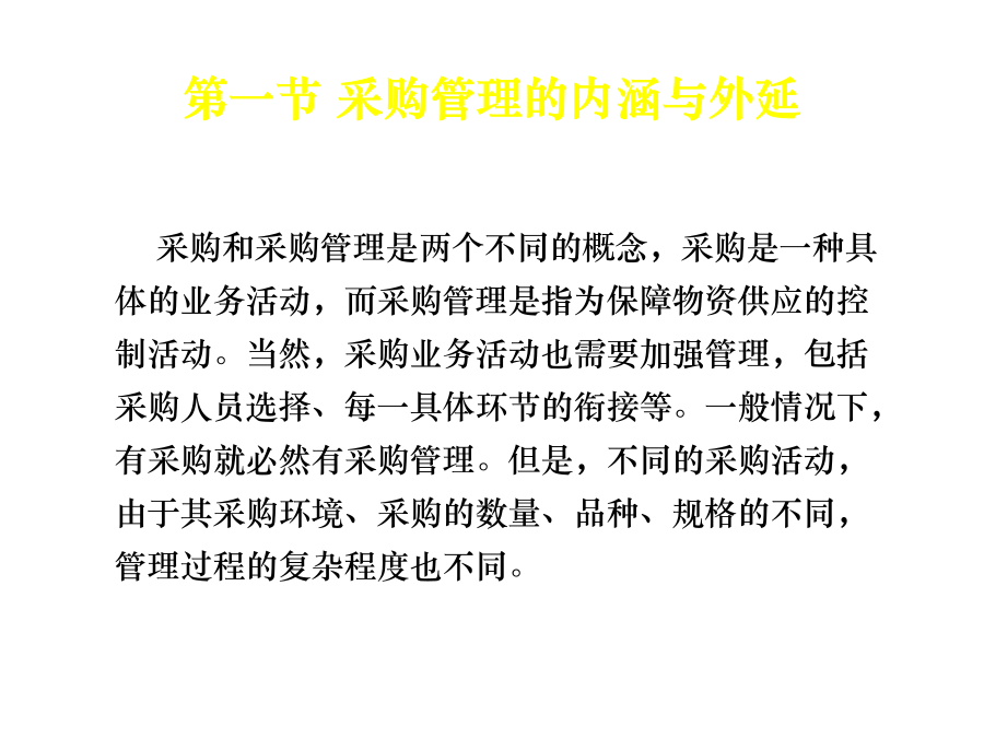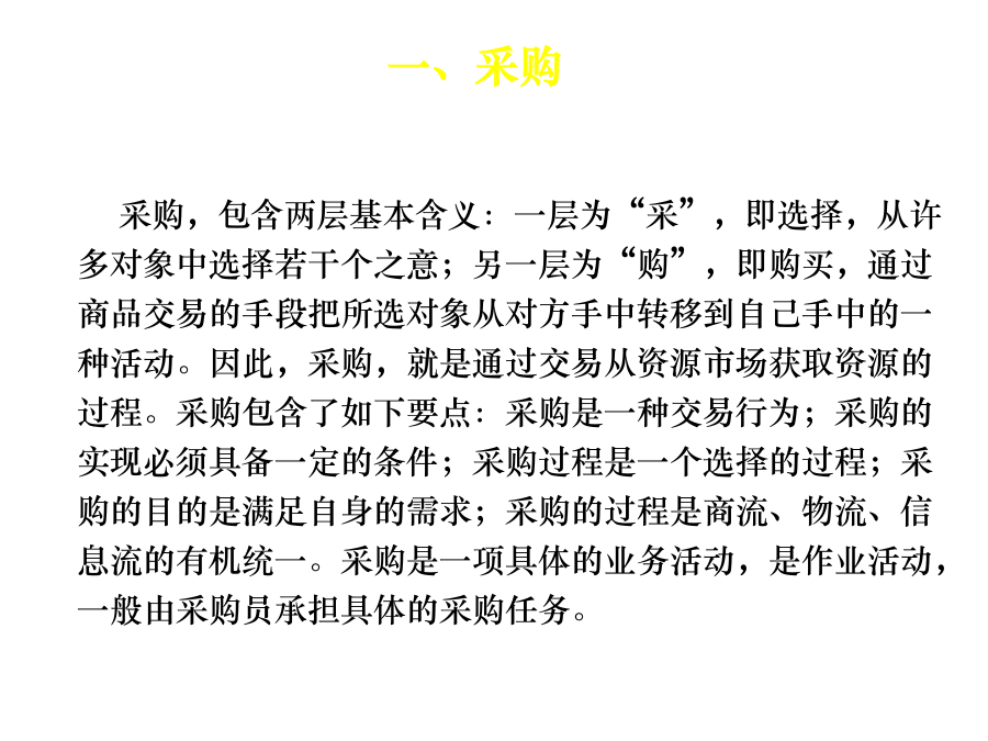 第一章物流采购管理概述第一节采购管理的内涵与外延一、采购二、采购管理三、采购作业流程设计的注意事项第二节采购管理的目标和内容一、采购管理的目标一、采购管理的目标二、采购管理的内容第三节采购组织和采购流程一、采购管理组织及功能二、采购流程第四节采购分类与采购方式一、采购分类一、采购分类二、采购方式二、采购方式二、采购方式二、采购方式三、采购方法三、采购方法第五节现代物流发展趋势及现代采购二、现代采购二、现代采购