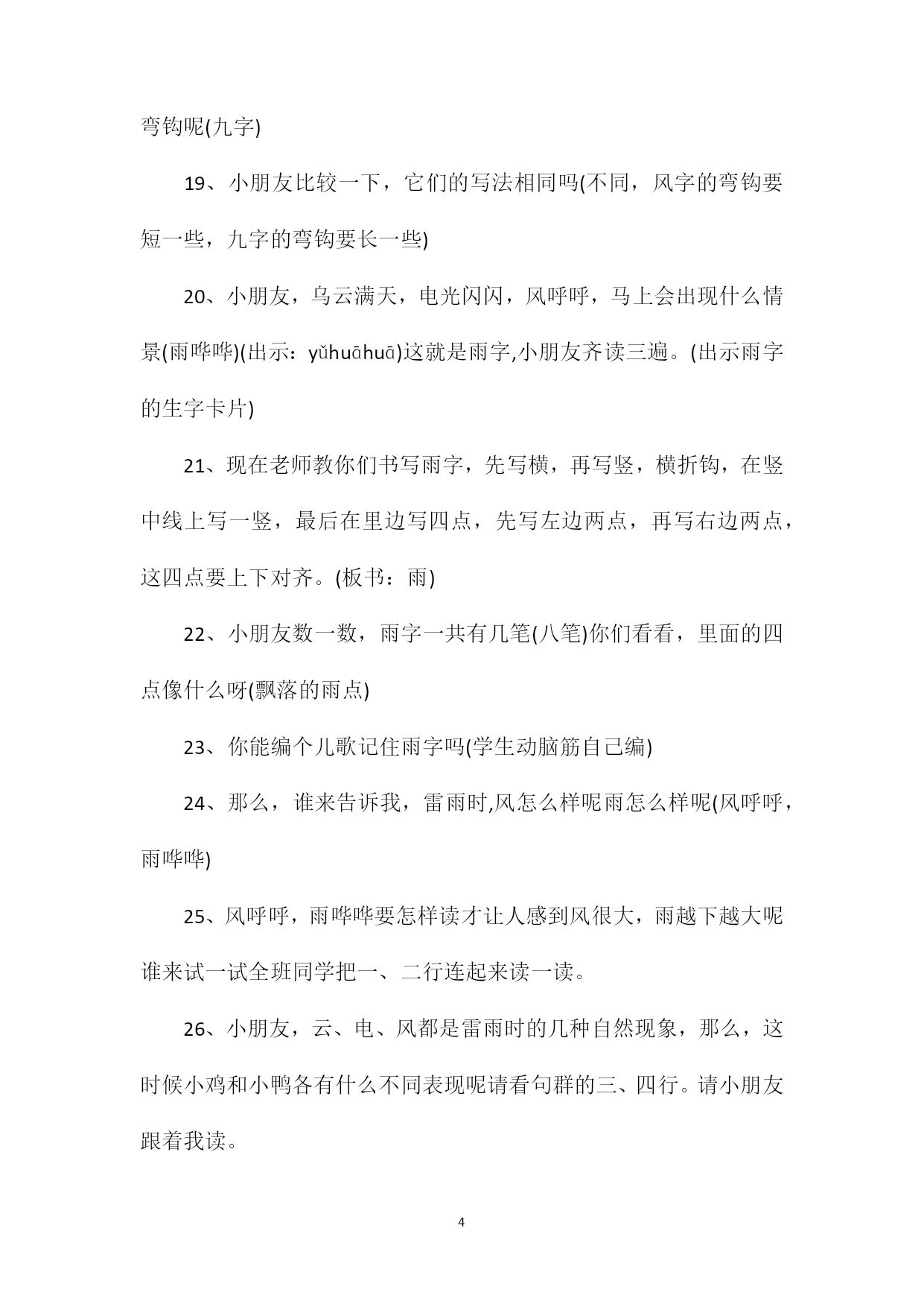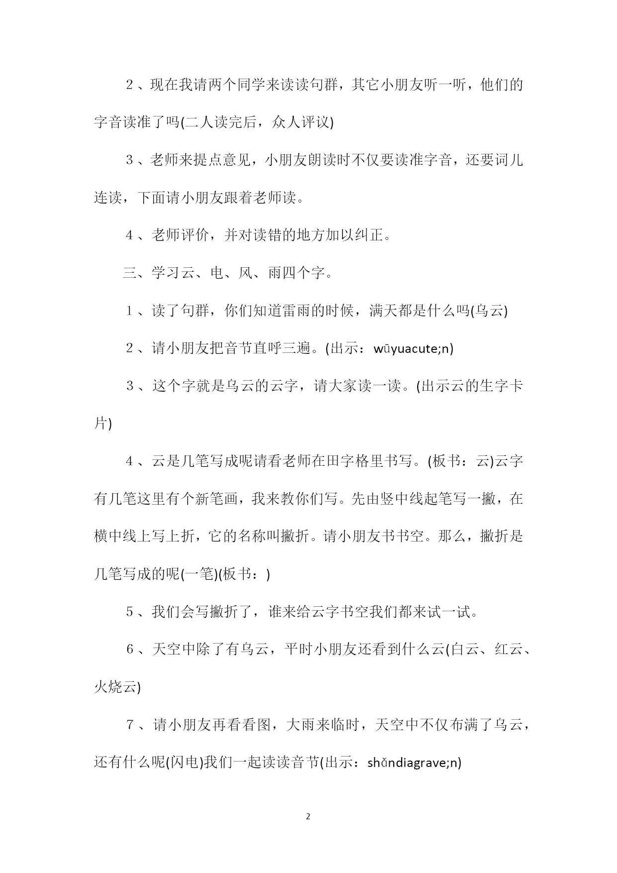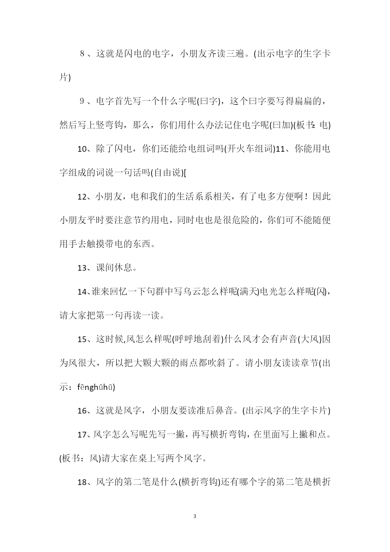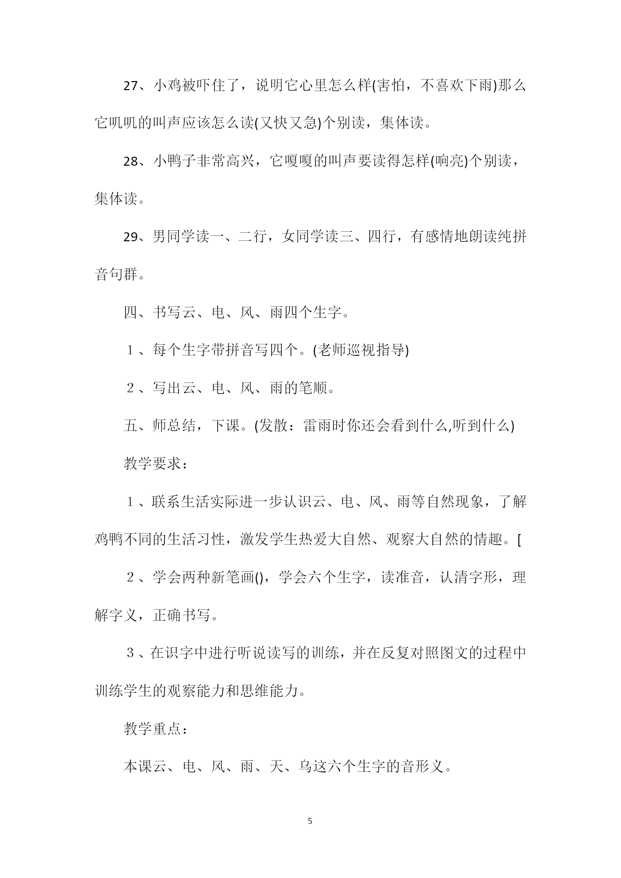 PAGEPAGE6《雷雨》教学设计七教具准备:录音机、彩图、自制的生字卡片。教学时间:两课时教学过程:一、揭示课题,指导看图。1、小朋友,今天我们要学习看图读拼音识字第8课雷雨。2、先请大家看看图,仔细地听一听。(出示彩图,并放录音)3、你看到些什么听到了哪些声音呢(看到了乌云、闪电、雨点、池塘、小鸡、小鸭、荷花)(听到了雷声、雨声、风声)4、小朋友看得很好,听得很认真,这些都是雷雨时的情景。(老师作形象描述)雷雨到来时,黑沉沉的乌云布满了天空,电光闪闪,雷声隆隆,风呼呼地刮着,雨哗哗地下着,小鸡吓得躲在石头旁叽叽叽地叫着,小鸭在池塘里快乐地歌唱,好像在说:下雨了!下雨了!二、学习纯拼音句群。1、小朋友,书上有一首儿歌,生动地写出了雷雨时的情景,你们想不想读一读(想),请小朋友打开书,翻到46页,自己小声地读一读纯拼音句群,要求读准字音,边读还要边想,句群写了什么内容呢(学生自读,老师巡视指导)2、现在我请两个同学来读读句群,其它小朋友听一听,他们的字音读准了吗(二人读完后,众人评议)3、老师来提点意见,小朋友朗读时不仅要读准字音,还要词儿连读,下面请小朋友跟着老师读。4、老师评价,并对读错的地方加以纠正。三、学习云、电、风、雨四个字。1、读了句群,你们知道雷雨的时候,满天都是什么吗(乌云)2、请小朋友把音节直呼三遍。(出示:wūyuacute;n)3、这个字就是乌云的云字,请大家读一读。(出示云的生字卡片)4、云是几笔写成呢请看老师在田字格里书写。(板书:云)云字有几笔这里有个新笔画,我来教你们写。先由竖中线起笔写一撇,在横中线上写上折,它的名称叫撇折。请小朋友书书空。那么,撇折是几笔写成的呢(一笔)(板书:)5、我们会写撇折了,谁来给云字书空我们都来试一试。6、天空中除了有乌云,平时小朋友还看到什么云(白云、红云、火烧云)7、请小朋友再看看图,大雨来临时,天空中不仅布满了乌云,还有什么呢(闪电)我们一起读读音节(出示:shǎndiagrave;n)8、这就是闪电的电字,小朋友齐读三遍。(出示电字的生字卡片)9、电字首先写一个什么字呢(曰字),这个曰字要写得扁扁的,然后写上竖弯钩,那么,你们用什么办法记住电字呢(曰加)(板书:电)10、除了闪电,你们还能给电组词吗(开火车组词)11、你能用电字组成的词说一句话吗(自由说)[12、小朋友,电和我们的生活系系相关,有了电多方便啊!因此小朋友平时要注意节约用电,同时电也是很危险的,你们可不能随便用手去触摸带电的东西。13、课间休息。14、谁来回忆一下句群中写乌云怎么样呢(满天)电光怎么样呢(闪),请大家把第一句再读一读。15、这时候,风怎么样呢(呼呼地刮着)什么风才会有声音(大风)因为风很大,所以把大颗大颗的雨点都吹斜了。请小朋友读读章节(出示:fēnghūhū)16、这就是风字,小朋友要读准后鼻音。(出示风字的生字卡片)17、风字怎么写呢先写一撇,再写横折弯钩,在里面写上撇和点。(板书:风)请大家在桌上写两个风字。18、风字的第二笔是什么(横折弯钩)还有哪个字的第二笔是横折弯钩呢(九字)19、小朋友比较一下,它们的写法相同吗(不同,风字的弯钩要短一些,九字的弯钩要长一些)20、小朋友,乌云满天,电光闪闪,风呼呼,马上会出现什么情景(雨哗哗)(出示:yǔhuāhuā)这就是雨字,小朋友齐读三遍。(出示雨字的生字卡片)21、现在老师教你们书写雨字,先写横,再写竖,横折钩,在竖中线上写一竖,最后在里边写四点,先写左边两点,再写右边两点,这四点要上下对齐。(板书:雨)22、小朋友数一数,雨字一共有几笔(八笔)你们看看,里面的四点像什么呀(飘落的雨点)23、你能编个儿歌记住雨字吗(学生动脑筋自己编)24、那么,谁来告诉我,雷雨时,风怎么样呢雨怎么样呢(风呼呼,雨哗哗)25、风呼呼,雨哗哗要怎样读才让人感到风很大,雨越下越大呢谁来试一试全班同学把一、二行连起来读一读。26、小朋友,云、电、风都是雷雨时的几种自然现象,那么,这时候小鸡和小鸭各有什么不同表现呢请看句群的三、四行。请小朋友跟着我读。27、小鸡被吓住了,说明它心里怎么样(害怕,不喜欢下雨)那么它叽叽的叫声应该怎么读(又快又急)个别读,集体读。28、小鸭子非常高兴,它嗄嗄的叫声要读得怎样(响亮)个别读,集体读。29、男同学读一、二行,女同学读三、四行,有感情地朗读纯拼音句群。四、书写云、电、风、雨四个生字。1、每个生字带拼音写四个。(老师巡视指导)2、写出云、电、风、雨的笔顺。五、师总结,下课。(发散:雷雨时你还会看到什么,听到什么)教学要求:1、联系生活实际进一步认识云、电、风、雨等自然现象,了解鸡鸭不同的生