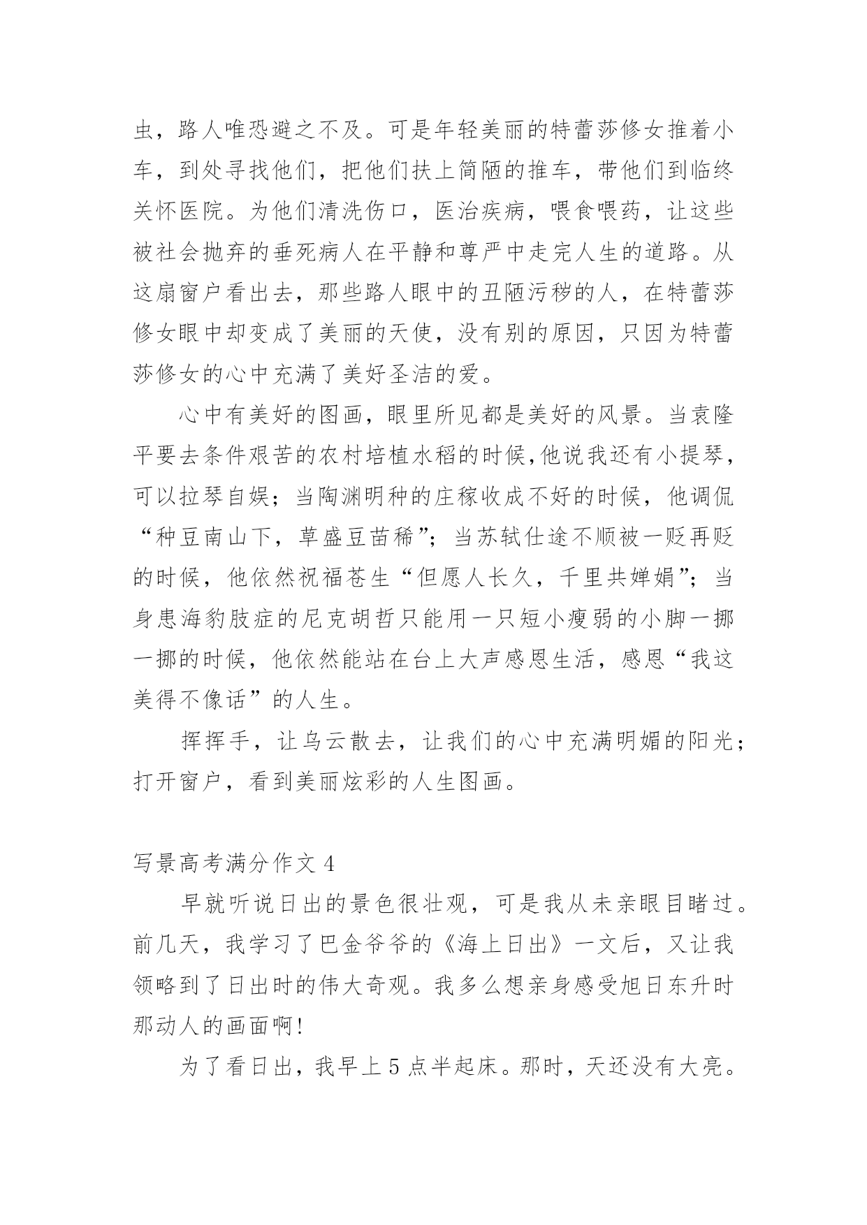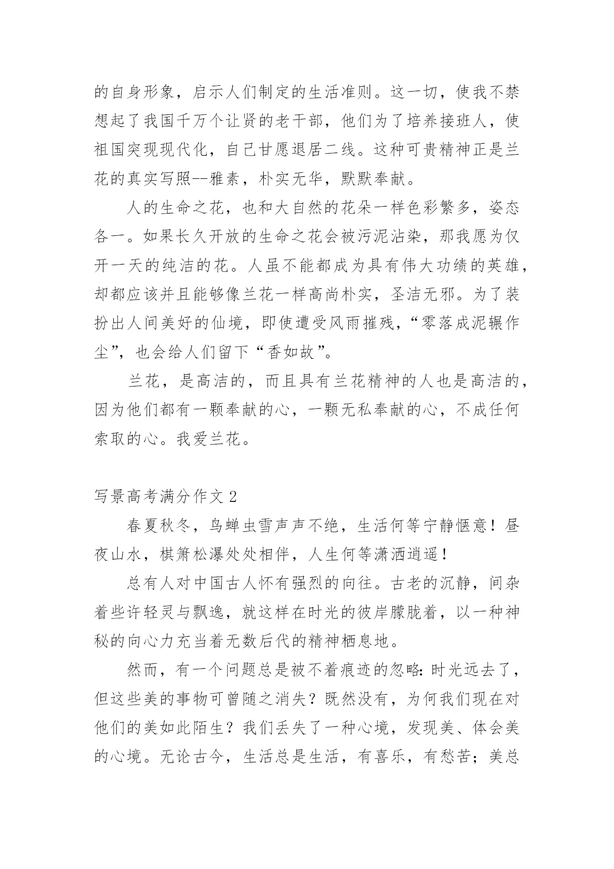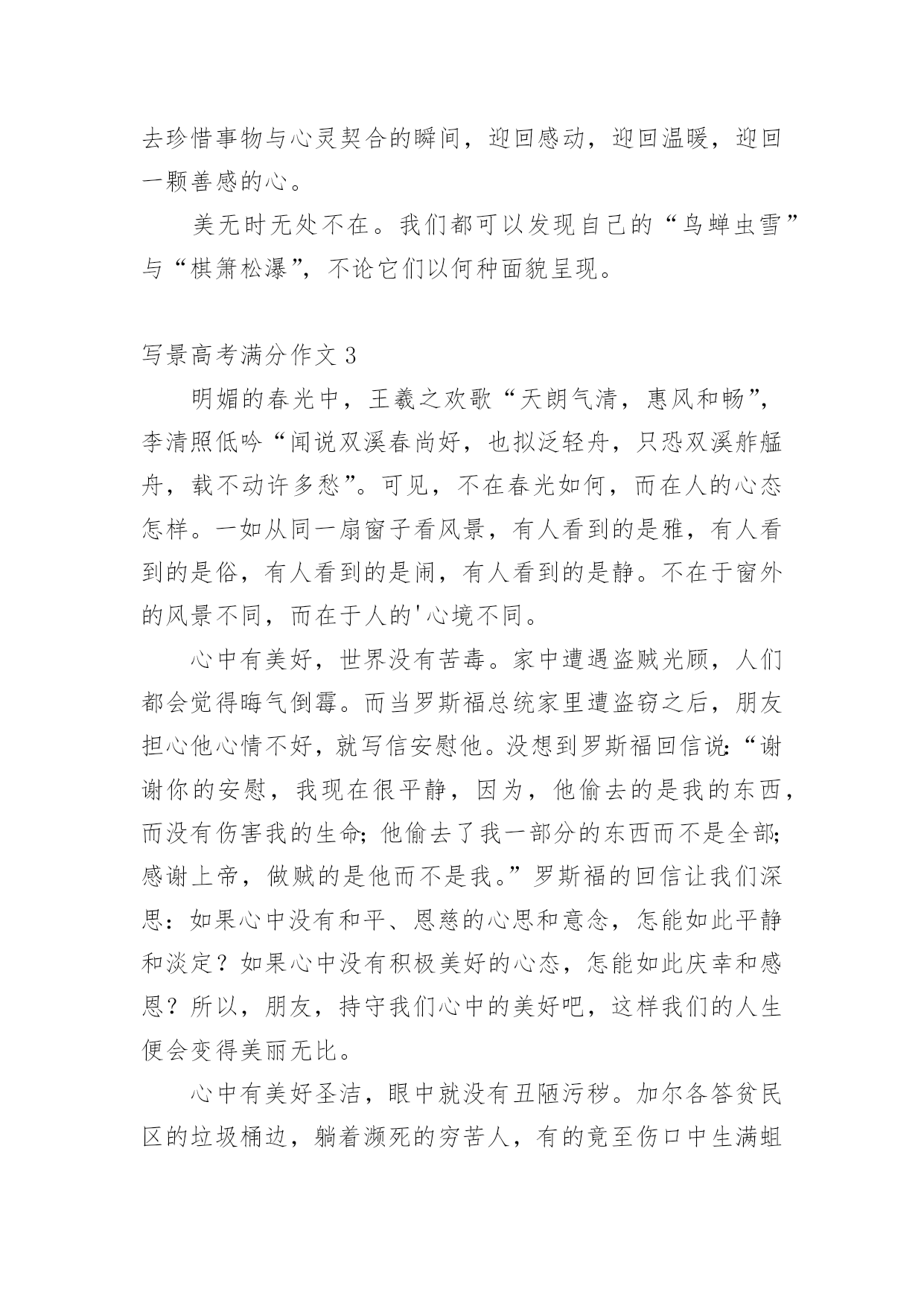 写景高考满分作文写景高考满分作文5篇写景高考满分作文1是雪花缀满枝头,这般晶莹洁白?是白云在此逗留,如此婀娜多姿?不,她比雪花更圣洁,比白云更端庄--她是盛开的兰花,人间的圣洁之花。兰,以其清香淡雅博得了人们青睐,不仅历代丹青妙手为之泼墨挥毫,更是骚人墨客吟咏的对象。如果说水仙是花中的“凌波仙子”,那么兰花一定是“花中的皇后”了。娇柔的花瓣,优美的身型,纯白的纱衣,构成了一朵圣洁的而又美丽的兰花。她和国色天香的牡丹一样奔放,又如凌胶仙子一样飘逸,比荷花更出淤污泥而不染。然而,天意弄人,好景不长。兰花只能给人们仅仅几天的观赏就凋谢了。一霎那的美与香,常引起人们的怜香,而她的神韵依然存在人们的脑海里,更镌刻在人们心间。兰,在冷雨中挺立,在寒风中怒放,不与百花争宠,只是默默地为世界增添一丝丝光彩;兰花之香,清幽淡雅,不会让人感到高不可攀,是沁人的香,亲切的香,叫人怜爱的香。你说,这醉人的花香,怎能不叫人为之倾倒,为之着迷?怎能不叫人去怜爱它,为之赞美一番?兰,无论高缀枝头,还是飘落在地,始终保持一尘不染的品格。即使埋入泥土,也是片芳心,洁白无瑕。她以高尚的自身形象,启示人们制定的生活准则。这一切,使我不禁想起了我国千万个让贤的老干部,他们为了培养接班人,使祖国突现现代化,自己甘愿退居二线。这种可贵精神正是兰花的真实写照--雅素,朴实无华,默默奉献。人的生命之花,也和大自然的花朵一样色彩繁多,姿态各一。如果长久开放的生命之花会被污泥沾染,那我愿为仅开一天的纯洁的花。人虽不能都成为具有伟大功绩的英雄,却都应该并且能够像兰花一样高尚朴实,圣洁无邪。为了装扮出人间美好的仙境,即使遭受风雨摧残,“零落成泥辗作尘”,也会给人们留下“香如故”。兰花,是高洁的,而且具有兰花精神的人也是高洁的,因为他们都有一颗奉献的心,一颗无私奉献的心,不成任何索取的心。我爱兰花。写景高考满分作文2春夏秋冬,鸟蝉虫雪声声不绝,生活何等宁静惬意!昼夜山水,棋箫松瀑处处相伴,人生何等潇洒逍遥!总有人对中国古人怀有强烈的向往。古老的沉静,间杂着些许轻灵与飘逸,就这样在时光的彼岸朦胧着,以一种神秘的向心力充当着无数后代的精神栖息地。然而,有一个问题总是被不着痕迹的忽略:时光远去了,但这些美的事物可曾随之消失?既然没有,为何我们现在对他们的美如此陌生?我们丢失了一种心境,发现美、体会美的心境。无论古今,生活总是生活,有喜乐,有愁苦;美总是美,无论表现形式怎样,它无时无处不在。周国平这样说到:“人类及其产品把我和自然隔离开来了,这是一种寂寞;千古如斯的自然把我和历史隔离开来了,这是又一种寂寞。现代人对两种寂寞都体味甚浅又都急于逃避,旅游业因之兴旺。”现代人很忙,忙着工作,还要忙着悠闲,忙着去匆忙看一眼世人口中的美,然后逢人便侃侃而谈,生怕自己显得不够见多识广。美在变得廉价,美在失去生命力,美不再是个人独一无二的心灵享受,而正在成为文凭式的评价工具。太多人打着自我保护的招牌理直气壮地冷漠,在功利与冷漠面前,美的力量太微弱。“世界上不是缺少美,而是缺少发现美的眼睛。”这句话的普及程度之高反而阻碍了很多人对其含义更深刻的领会及实践。发现美,用眼,用耳,归根结蒂是用心。有了一颗善于感受美的心灵,美的涵义便会无限拓展,超出世俗认可的自然风景与人文遗迹,而涵盖一切有价值的事物。高中作文美是真实的,生动的,可感的!它无时无处不在。如果你能用心培育一株植物,在自家阳台狭小的空间里看它沐浴着阳光散发勃勃生机,这美会胜过林海匆匆三日游;如果你能用心吟咏,品味《滕王阁序》,无论环境如何,它给你带来的美感,比之在人头攒动中瞥一眼那块石碑要珍贵、真实得多。美与道德不同,它不是普世价值,因此,刻意体会美的过程也就是漠视美的过程。我们需要做的,是回归美的本质,去珍惜事物与心灵契合的瞬间,迎回感动,迎回温暖,迎回一颗善感的心。美无时无处不在。我们都可以发现自己的“鸟蝉虫雪”与“棋箫松瀑”,不论它们以何种面貌呈现。写景高考满分作文3明媚的春光中,王羲之欢歌“天朗气清,惠风和畅”,李清照低吟“闻说双溪春尚好,也拟泛轻舟,只恐双溪舴艋舟,载不动许多愁”。可见,不在春光如何,而在人的心态怎样。一如从同一扇窗子看风景,有人看到的是雅,有人看到的是俗,有人看到的是闹,有人看到的是静。不在于窗外的风景不同,而在于人的'心境不同。心中有美好,世界没有苦毒。家中遭遇盗贼光顾,人们都会觉得晦气倒霉。而当罗斯福总统家里遭盗窃之后,朋友担心他心情不好,就写信安慰他。没想到罗斯福回信说:“谢谢你的安慰,我现在很平静,因为,他偷去的是我的东西,而没有伤害我的生命;他偷去了我一部分的东西而不是全部;感谢上帝,做贼的是他而不是我。”罗斯福的回信让我们深思:如果心中没有和平、恩慈的心思和意念,怎能如此平静和淡定?如果心中没有积极美好的心态