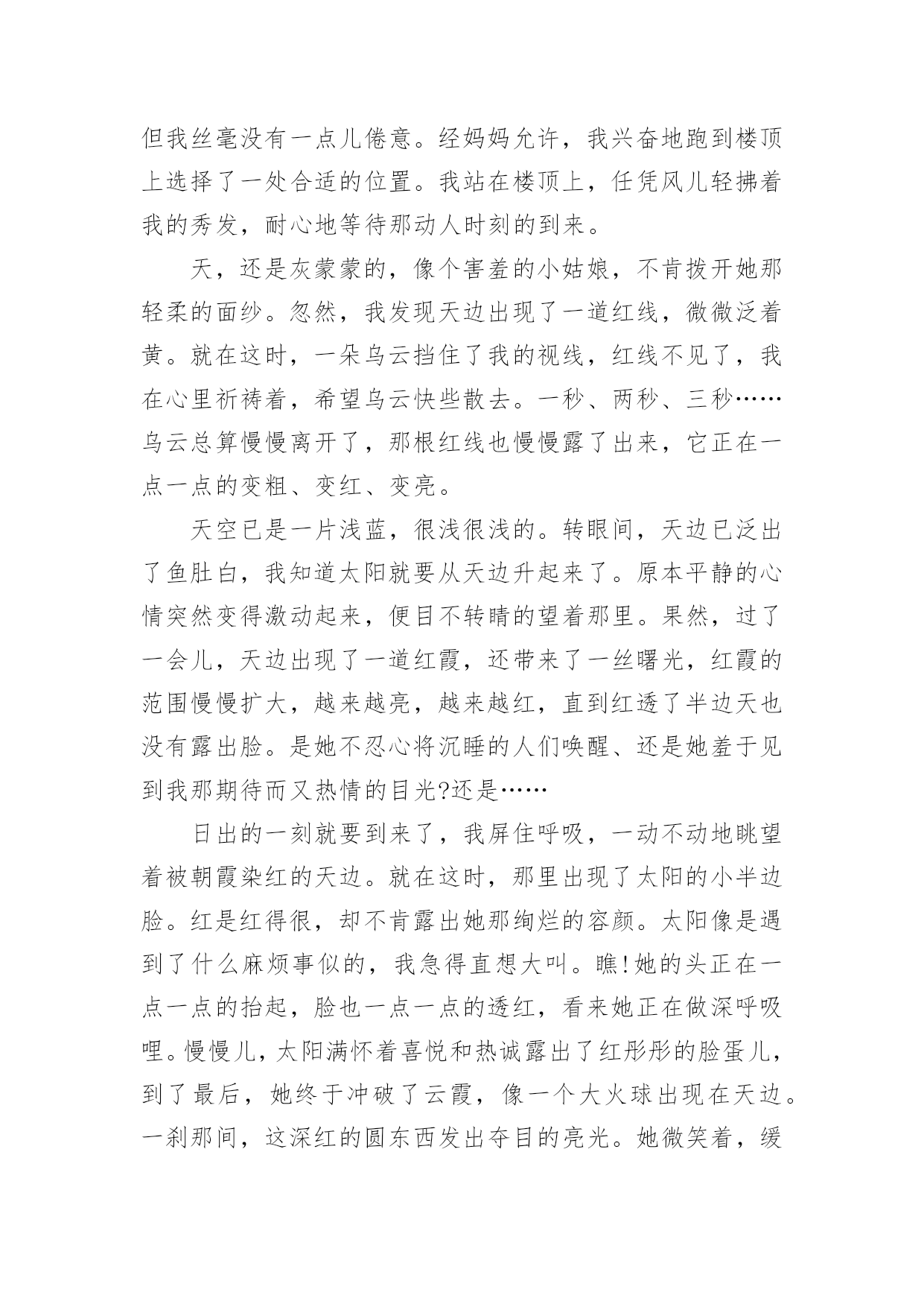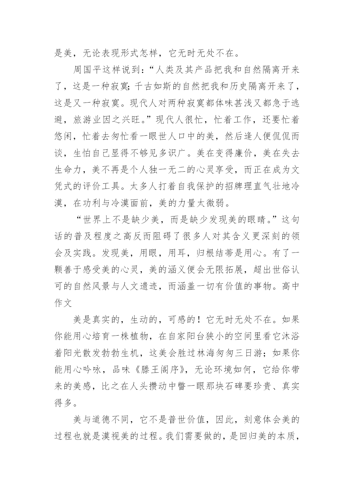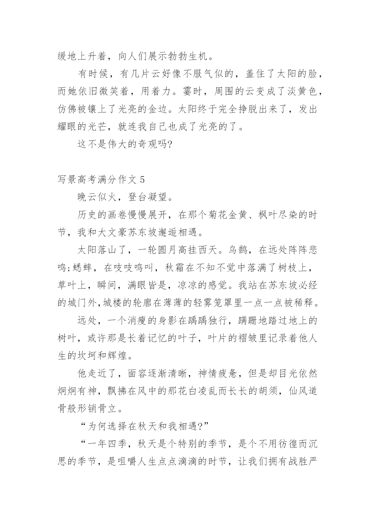 写景高考满分作文写景高考满分作文5篇写景高考满分作文1是雪花缀满枝头,这般晶莹洁白?是白云在此逗留,如此婀娜多姿?不,她比雪花更圣洁,比白云更端庄--她是盛开的兰花,人间的圣洁之花。兰,以其清香淡雅博得了人们青睐,不仅历代丹青妙手为之泼墨挥毫,更是骚人墨客吟咏的对象。如果说水仙是花中的“凌波仙子”,那么兰花一定是“花中的皇后”了。娇柔的花瓣,优美的身型,纯白的纱衣,构成了一朵圣洁的而又美丽的兰花。她和国色天香的牡丹一样奔放,又如凌胶仙子一样飘逸,比荷花更出淤污泥而不染。然而,天意弄人,好景不长。兰花只能给人们仅仅几天的观赏就凋谢了。一霎那的美与香,常引起人们的怜香,而她的神韵依然存在人们的脑海里,更镌刻在人们心间。兰,在冷雨中挺立,在寒风中怒放,不与百花争宠,只是默默地为世界增添一丝丝光彩;兰花之香,清幽淡雅,不会让人感到高不可攀,是沁人的香,亲切的香,叫人怜爱的香。你说,这醉人的花香,怎能不叫人为之倾倒,为之着迷?怎能不叫人去怜爱它,为之赞美一番?兰,无论高缀枝头,还是飘落在地,始终保持一尘不染的品格。即使埋入泥土,也是片芳心,洁白无瑕。她以高尚的自身形象,启示人们制定的生活准则。这一切,使我不禁想起了我国千万个让贤的老干部,他们为了培养接班人,使祖国突现现代化,自己甘愿退居二线。这种可贵精神正是兰花的真实写照--雅素,朴实无华,默默奉献。人的生命之花,也和大自然的花朵一样色彩繁多,姿态各一。如果长久开放的生命之花会被污泥沾染,那我愿为仅开一天的纯洁的花。人虽不能都成为具有伟大功绩的英雄,却都应该并且能够像兰花一样高尚朴实,圣洁无邪。为了装扮出人间美好的仙境,即使遭受风雨摧残,“零落成泥辗作尘”,也会给人们留下“香如故”。兰花,是高洁的,而且具有兰花精神的人也是高洁的,因为他们都有一颗奉献的心,一颗无私奉献的心,不成任何索取的心。我爱兰花。写景高考满分作文2春夏秋冬,鸟蝉虫雪声声不绝,生活何等宁静惬意!昼夜山水,棋箫松瀑处处相伴,人生何等潇洒逍遥!总有人对中国古人怀有强烈的向往。古老的沉静,间杂着些许轻灵与飘逸,就这样在时光的彼岸朦胧着,以一种神秘的向心力充当着无数后代的精神栖息地。然而,有一个问题总是被不着痕迹的忽略:时光远去了,但这些美的事物可曾随之消失?既然没有,为何我们现在对他们的美如此陌生?我们丢失了一种心境,发现美、体会美的心境。无论古今,生活总是生活,有喜乐,有愁苦;美总是美,无论表现形式怎样,它无时无处不在。周国平这样说到:“人类及其产品把我和自然隔离开来了,这是一种寂寞;千古如斯的自然把我和历史隔离开来了,这是又一种寂寞。现代人对两种寂寞都体味甚浅又都急于逃避,旅游业因之兴旺。”现代人很忙,忙着工作,还要忙着悠闲,忙着去匆忙看一眼世人口中的美,然后逢人便侃侃而谈,生怕自己显得不够见多识广。美在变得廉价,美在失去生命力,美不再是个人独一无二的心灵享受,而正在成为文凭式的评价工具。太多人打着自我保护的招牌理直气壮地冷漠,在功利与冷漠面前,美的力量太微弱。“世界上不是缺少美,而是缺少发现美的眼睛。”这句话的普及程度之高反而阻碍了很多人对其含义更深刻的领会及实践。发现美,用眼,用耳,归根结蒂是用心。有了一颗善于感受美的心灵,美的涵义便会无限拓展,超出世俗认可的自然风景与人文遗迹,而涵盖一切有价值的事物。高中作文美是真实的,生动的,可感的!它无时无处不在。如果你能用心培育一株植物,在自家阳台狭小的空间里看它沐浴着阳光散发勃勃生机,这美会胜过林海匆匆三日游;如果你能用心吟咏,品味《滕王阁序》,无论环境如何,它给你带来的美感,比之在人头攒动中瞥一眼那块石碑要珍贵、真实得多。美与道德不同,它不是普世价值,因此,刻意体会美的过程也就是漠视美的过程。我们需要做的,是回归美的本质,去珍惜事物与心灵契合的瞬间,迎回感动,迎回温暖,迎回一颗善感的心。美无时无处不在。我们都可以发现自己的“鸟蝉虫雪”与“棋箫松瀑”,不论它们以何种面貌呈现。写景高考满分作文3明媚的春光中,王羲之欢歌“天朗气清,惠风和畅”,李清照低吟“闻说双溪春尚好,也拟泛轻舟,只恐双溪舴艋舟,载不动许多愁”。可见,不在春光如何,而在人的心态怎样。一如从同一扇窗子看风景,有人看到的是雅,有人看到的是俗,有人看到的是闹,有人看到的是静。不在于窗外的风景不同,而在于人的'心境不同。心中有美好,世界没有苦毒。家中遭遇盗贼光顾,人们都会觉得晦气倒霉。而当罗斯福总统家里遭盗窃之后,朋友担心他心情不好,就写信安慰他。没想到罗斯福回信说:“谢谢你的安慰,我现在很平静,因为,他偷去的是我的东西,而没有伤害我的生命;他偷去了我一部分的东西而不是全部;感谢上帝,做贼的是他而不是我。”罗斯福的回信让我们深思:如果心中没有和平、恩慈的心思和意念,怎能如此平静和淡定?如果心中没有积极美好的心态