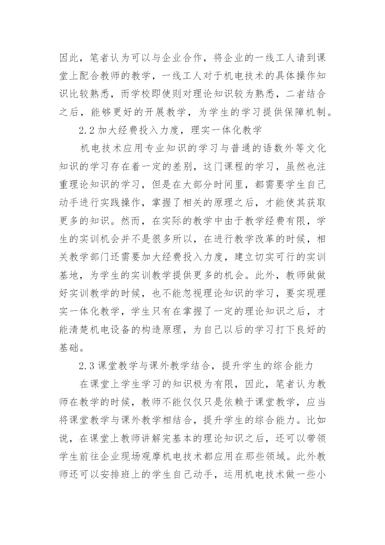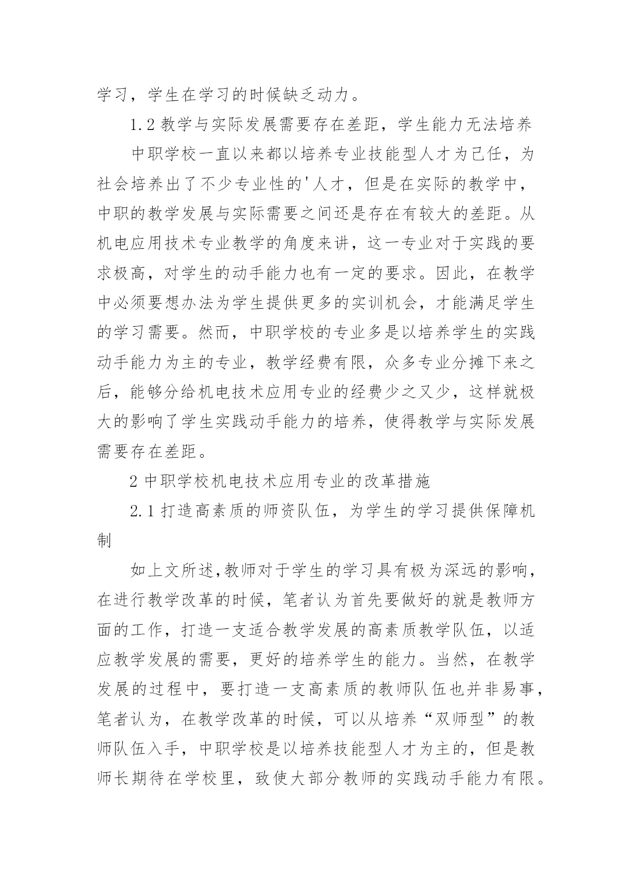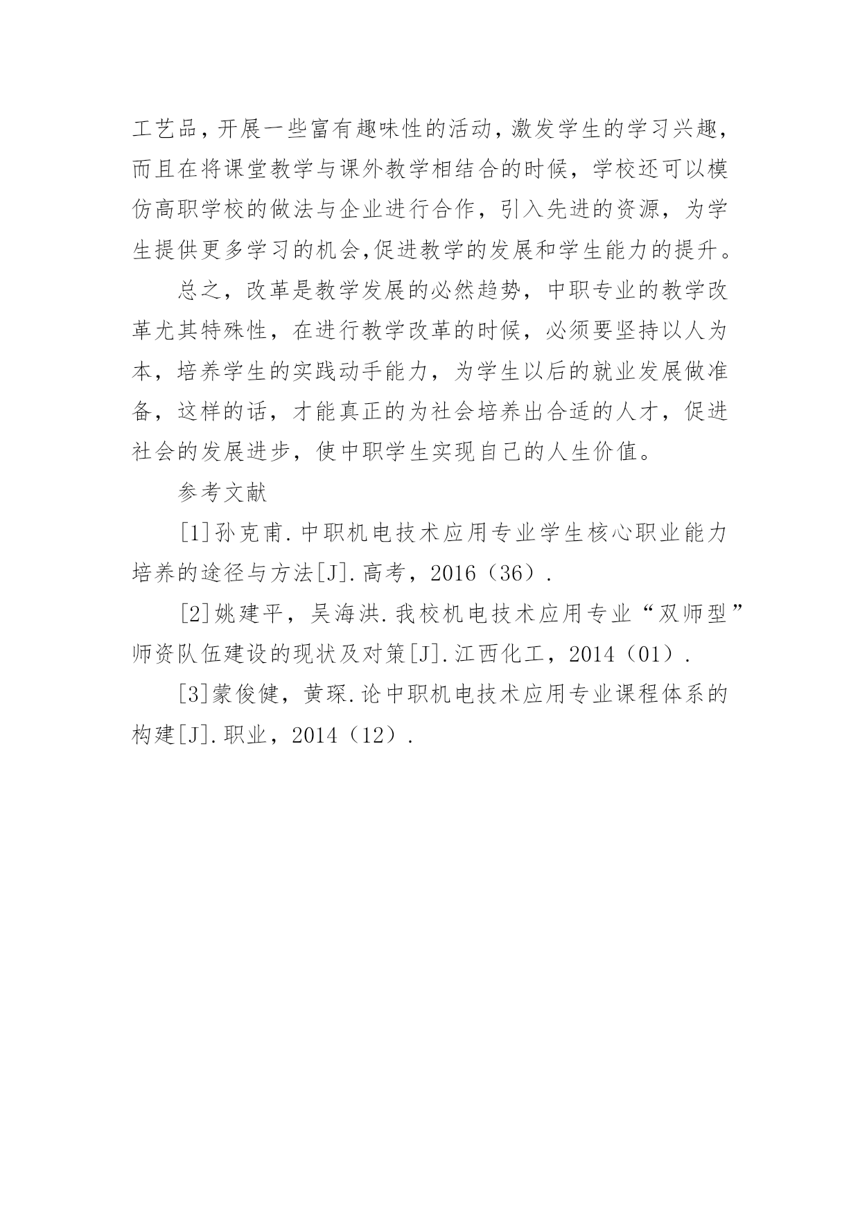 中职学校机电技术教学改革分析论文【摘要】教学改革是近几年来,教学发展的一种趋势,为了更好的适应当前社会的发展变化,培养社会需要的人才,不论是在小学、初中、高中还是大学都刮起了一股教学改革之风,以培养专业技能型人才为主的中职学校也不例外。本文,将以中职学校的机电技术应用专业为例,分析机电专业教学改革的措施。【关键词】中职学校;机电技术应用;专业教学;改革机电技术应用专业一直以来都是中职学校重点发展的一项专业,做好机电技术专业的应用教学,有助于学生以后的就业和发展,但是,在实际的教学中,中职机电技术应用专业教学还存在有一定的问题,亟待做出相应的改革以适应社会发展的需求。1中职学校机电技术应用专业教学的现状1.1师资力量薄弱,学生学习缺乏动力教师是学生学习路上的指路人,对于学生的学习具有重要的引导作用,教师能力的强弱对于学生的学习有着极为重要的影响。目前,大部分中职学校的教学都存在着师资力量薄弱的问题,以中职学校的机电技术应用专业教学为例,师资力量薄弱是一个十分突出的问题,学校在选拨教师的时候,没有普通高中那样严格,致使部分能力一般的教师被选拨任教,而且教师的教学思想大部分都比较落后,实践动手能力比较差,这极大的影响了机电技术应用专业学生的实训知识学习,学生在学习的时候缺乏动力。1.2教学与实际发展需要存在差距,学生能力无法培养中职学校一直以来都以培养专业技能型人才为己任,为社会培养出了不少专业性的'人才,但是在实际的教学中,中职的教学发展与实际需要之间还是存在有较大的差距。从机电应用技术专业教学的角度来讲,这一专业对于实践的要求极高,对学生的动手能力也有一定的要求。因此,在教学中必须要想办法为学生提供更多的实训机会,才能满足学生的学习需要。然而,中职学校的专业多是以培养学生的实践动手能力为主的专业,教学经费有限,众多专业分摊下来之后,能够分给机电技术应用专业的经费少之又少,这样就极大的影响了学生实践动手能力的培养,使得教学与实际发展需要存在差距。2中职学校机电技术应用专业的改革措施2.1打造高素质的师资队伍,为学生的学习提供保障机制如上文所述,教师对于学生的学习具有极为深远的影响,在进行教学改革的时候,笔者认为首先要做好的就是教师方面的工作,打造一支适合教学发展的高素质教学队伍,以适应教学发展的需要,更好的培养学生的能力。当然,在教学发展的过程中,要打造一支高素质的教师队伍也并非易事,笔者认为,在教学改革的时候,可以从培养“双师型”的教师队伍入手,中职学校是以培养技能型人才为主的,但是教师长期待在学校里,致使大部分教师的实践动手能力有限。因此,笔者认为可以与企业合作,将企业的一线工人请到课堂上配合教师的教学,一线工人对于机电技术的具体操作知识比较熟悉,而学校即使则对理论知识较为熟悉,二者结合之后,能够更好的开展教学,为学生的学习提供保障机制。2.2加大经费投入力度,理实一体化教学机电技术应用专业知识的学习与普通的语数外等文化知识的学习存在着一定的差别,这门课程的学习,虽然也注重理论知识的学习,但是在大部分时间里,都需要学生自己动手进行实践操作,掌握了相关的原理之后,才能使其获取更多的知识。然而,在实际的教学中由于教学经费有限,学生的实训机会并不是很多所以,在进行教学改革的时候,相关教学部门还需要加大经费投入力度,建立切实可行的实训基地,为学生的实训教学提供更多的机会。此外,教师做做好实训教学的时候,也不能忽视理论知识的学习,要实现理实一体化教学,学生只有在掌握了一定的理论知识之后,才能清楚机电设备的构造原理,为自己以后的学习打下良好的基础。2.3课堂教学与课外教学结合,提升学生的综合能力在课堂上学生学习的知识极为有限,因此,笔者认为教师在教学的时候,教师不能仅仅只是依赖于课堂教学,应当将课堂教学与课外教学相结合,提升学生的综合能力。比如说,在课堂上教师讲解完基本的理论知识之后,还可以带领学生前往企业现场观摩机电技术都应用在那些领域。此外教师还可以安排班上的学生自己动手,运用机电技术做一些小工艺品,开展一些富有趣味性的活动,激发学生的学习兴趣,而且在将课堂教学与课外教学相结合的时候,学校还可以模仿高职学校的做法与企业进行合作,引入先进的资源,为学生提供更多学习的机会,促进教学的发展和学生能力的提升。总之,改革是教学发展的必然趋势,中职专业的教学改革尤其特殊性,在进行教学改革的时候,必须要坚持以人为本,培养学生的实践动手能力,为学生以后的就业发展做准备,这样的话,才能真正的为社会培养出合适的人才,促进社会的发展进步,使中职学生实现自己的人生价值。参考文献[1]孙克甫.中职机电技术应用专业学生核心职业能力培养的途径与方法[J].高考,2016(36).[2]姚建平,吴海洪.我校机电技术应用专业“双师型”师资队伍建设的现状及对策[J]
